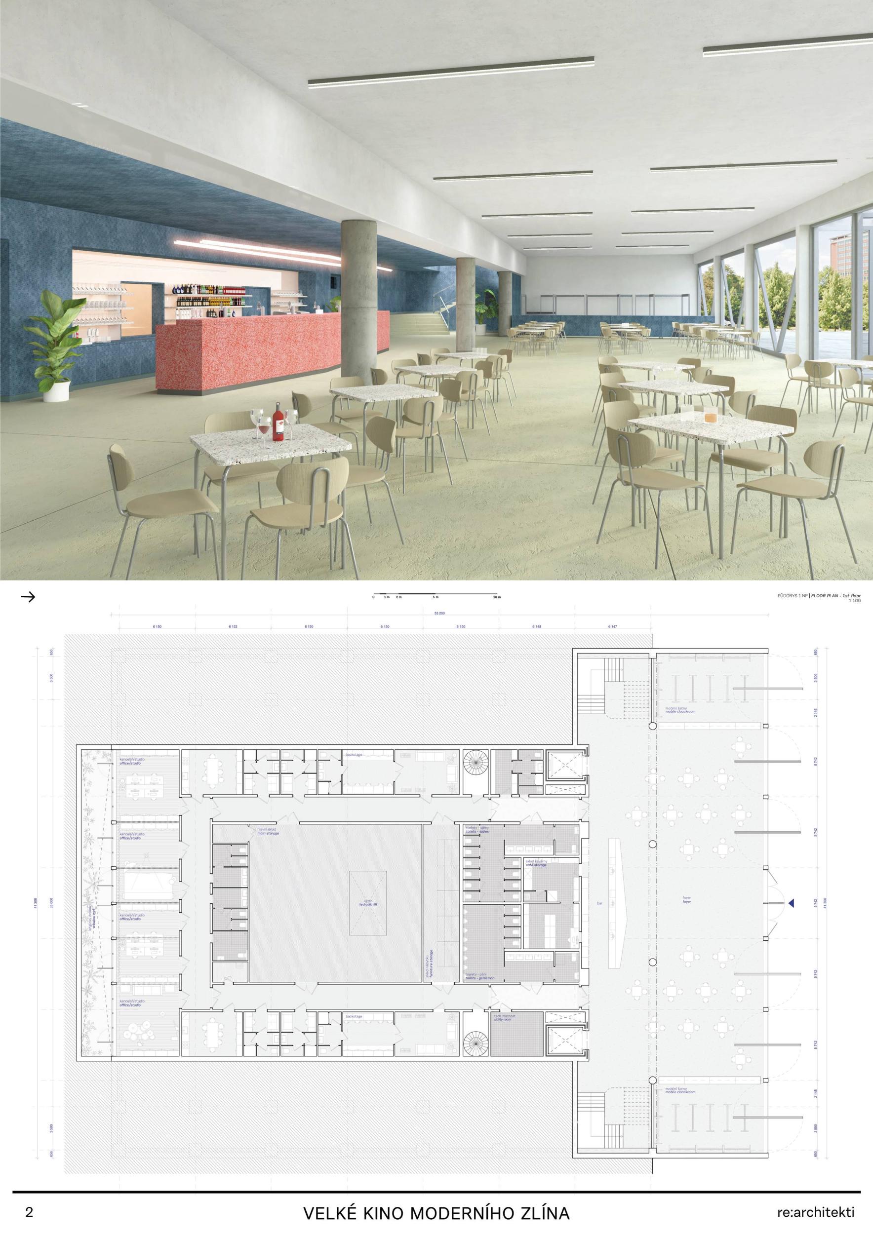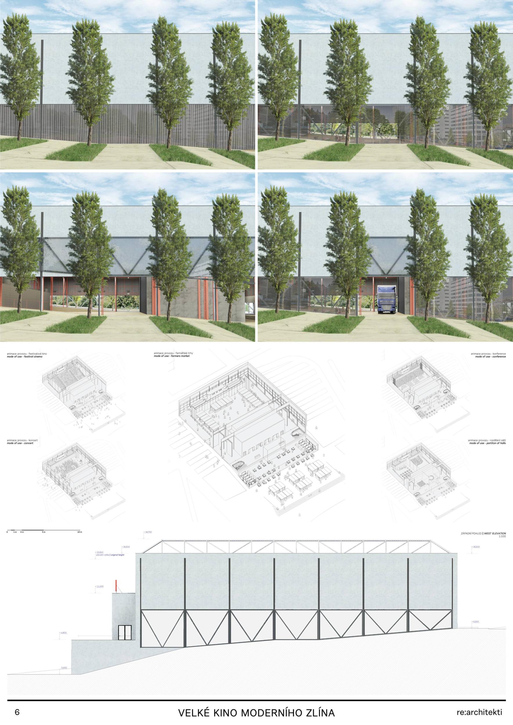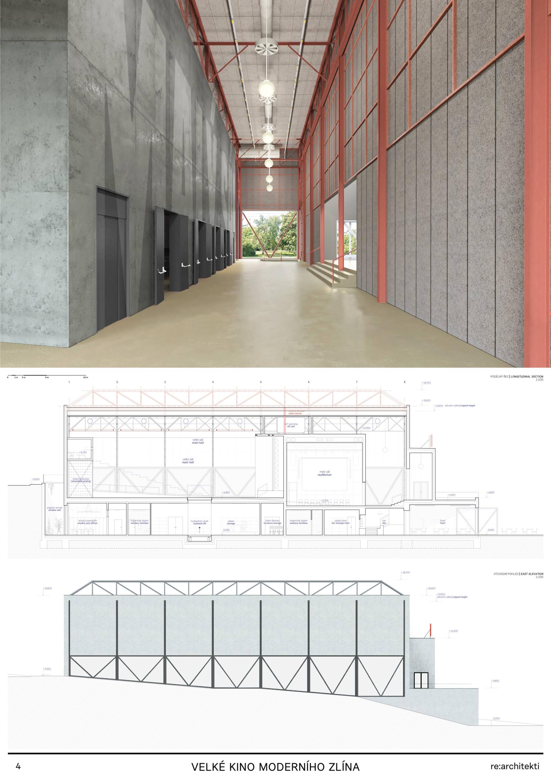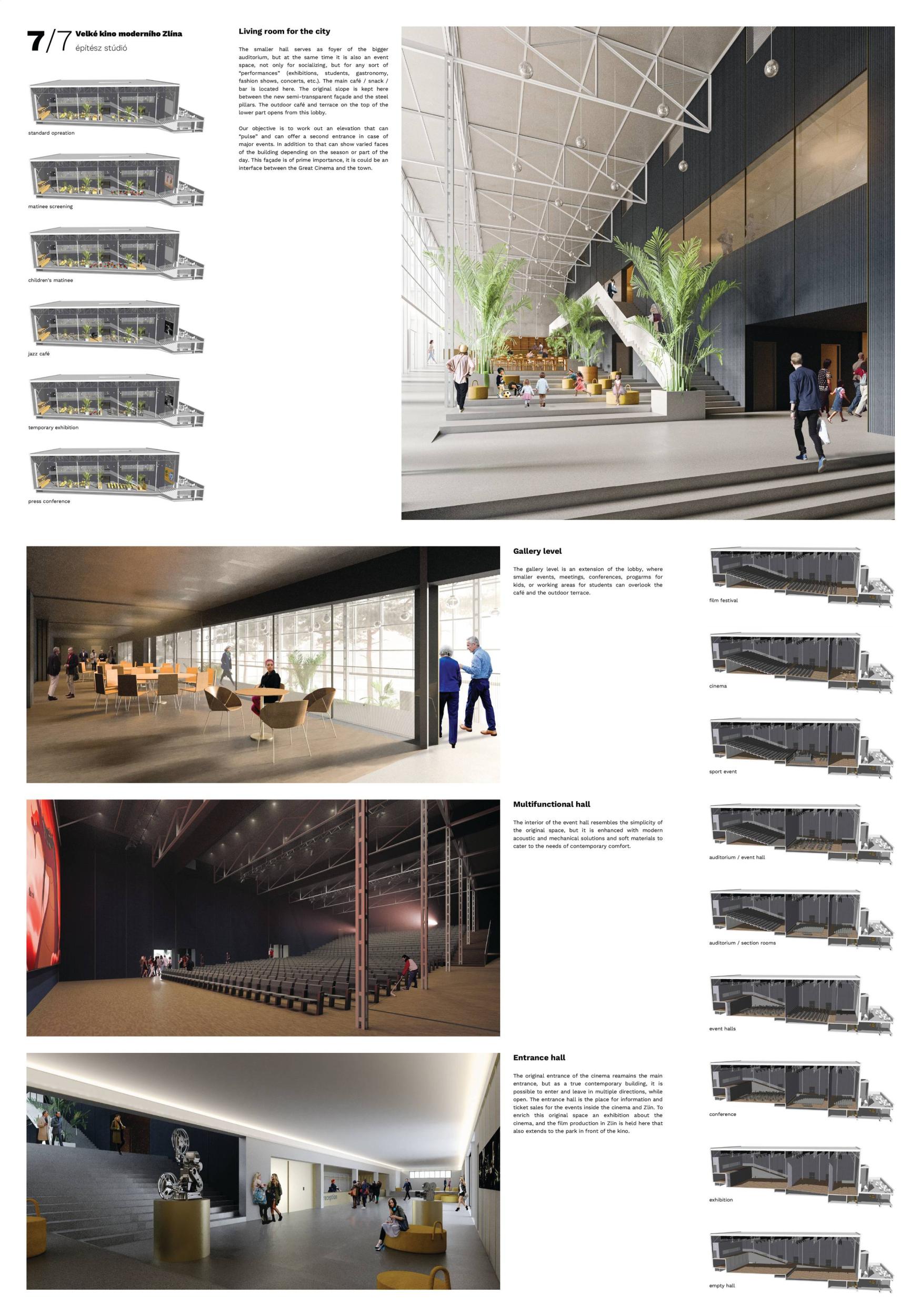 The building in its original form from 1932 was simplest in both its interior and exterior. This simplicity is the most valuable feature we want to preserve and strengthen. We are achieving this by removing all of the latter construction layers and returning to the prime volumetric simplicity as well as recognising the greatness of the original hall. The Great Cinema contains two halls – the large hall accommodates 900 seated spectators within the original volume, and the small hall is designed for 210 spectators. Both halls have levelled floors, are divisible, and have great acoustics and wide usability. The two halls can be used separately or they can be connected to the foyer to create one flowing space of the Great Cinema. We retained the possibility of accessing the large hall with a lorry. The sliding windows are supported by the new construction to not overload the existing building structure. With the respect to their weight, the system of counterweight is added. The manipulation of the windows will be provided by electric motors. We designed a sufficient service programme within the institution. This constellation allows continuous operation, where everyday small events occasionally alternate with large events. Life within the Great Cinema is ensured by a generous café in the foyer, which opens onto the terrace in front of the cinema during the summer months. The Great Cinema also provides several studios for recording, animation, photography, and offices for employees or for rent. The space in front of the cinema encourages movement and life within the square. People are sitting on the edge, looking out at Tomas Bata Avenue. There is a café on the terrace offering a space to play as well as views across the city. This would be a unique space for Zlín. Architects: Michal Kuzemenský, David Pavlišta, Ondřej Synek, Jan Vlach, Jiří Žid, Michaela Hudečková, Vojtěch Ružbatský, Dušan Sabol, Alžběta Widholmová Landscape Architects: Symbio studio (Pavla Drbalová, Marie Gelová, Sandra Chlebovská) Structural Engineer: Excon (Vladimír Janata, Jindřich Syrovátka) Acoustics: Petr Novák Transportation Engineer: Květoslav Syrový Fire Engineer: Jan Trafina Cultural Management: Jiří Sulženko