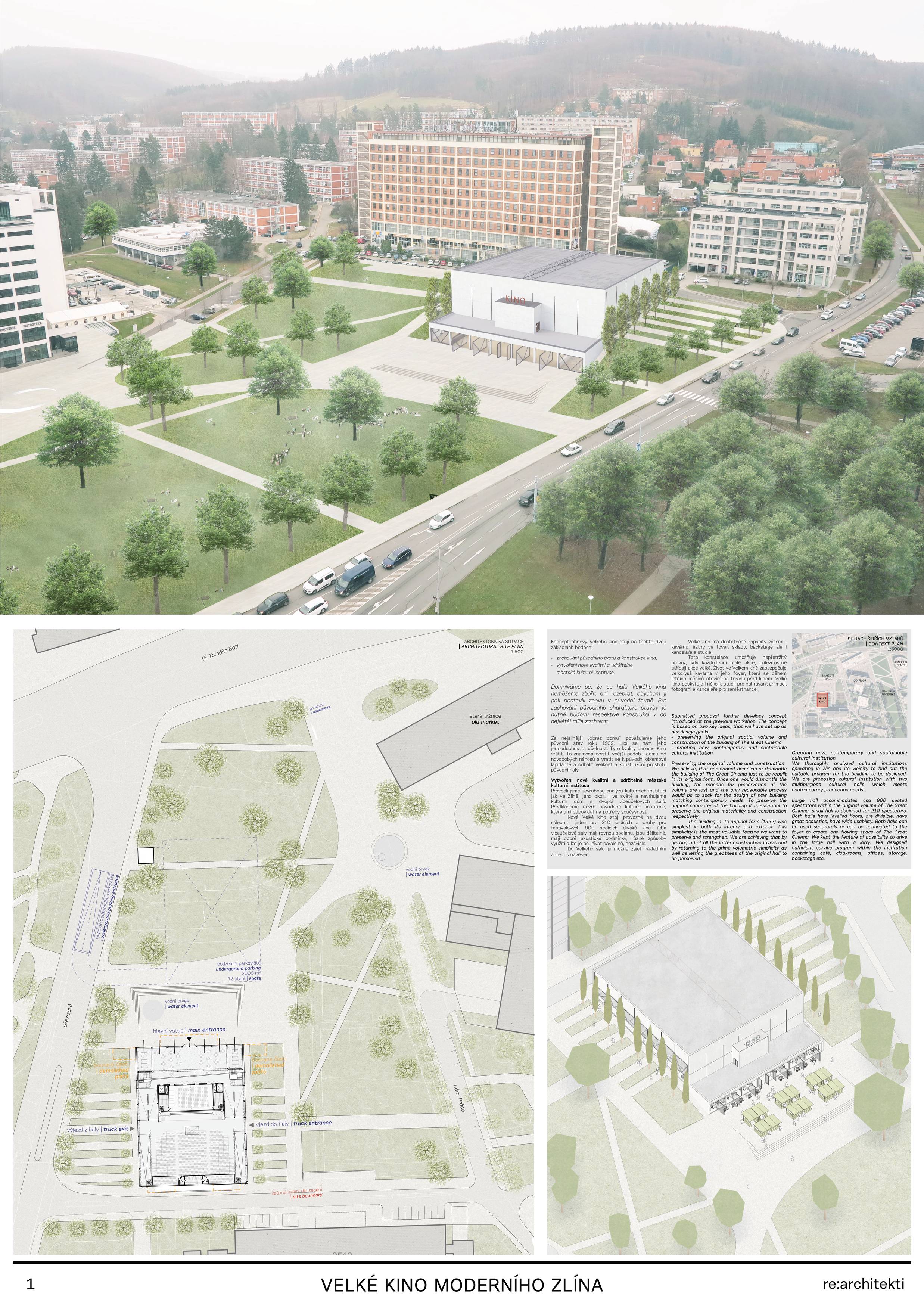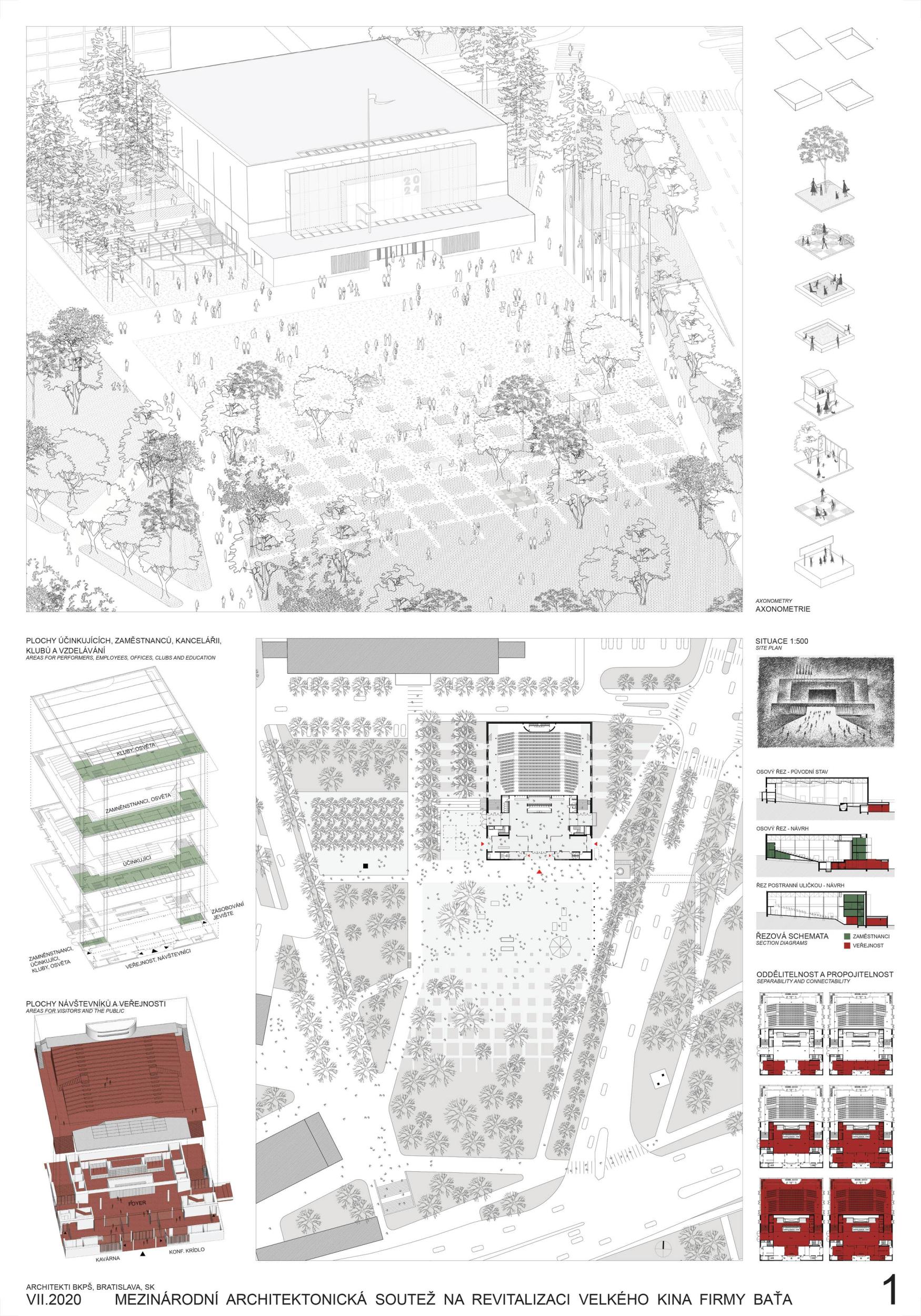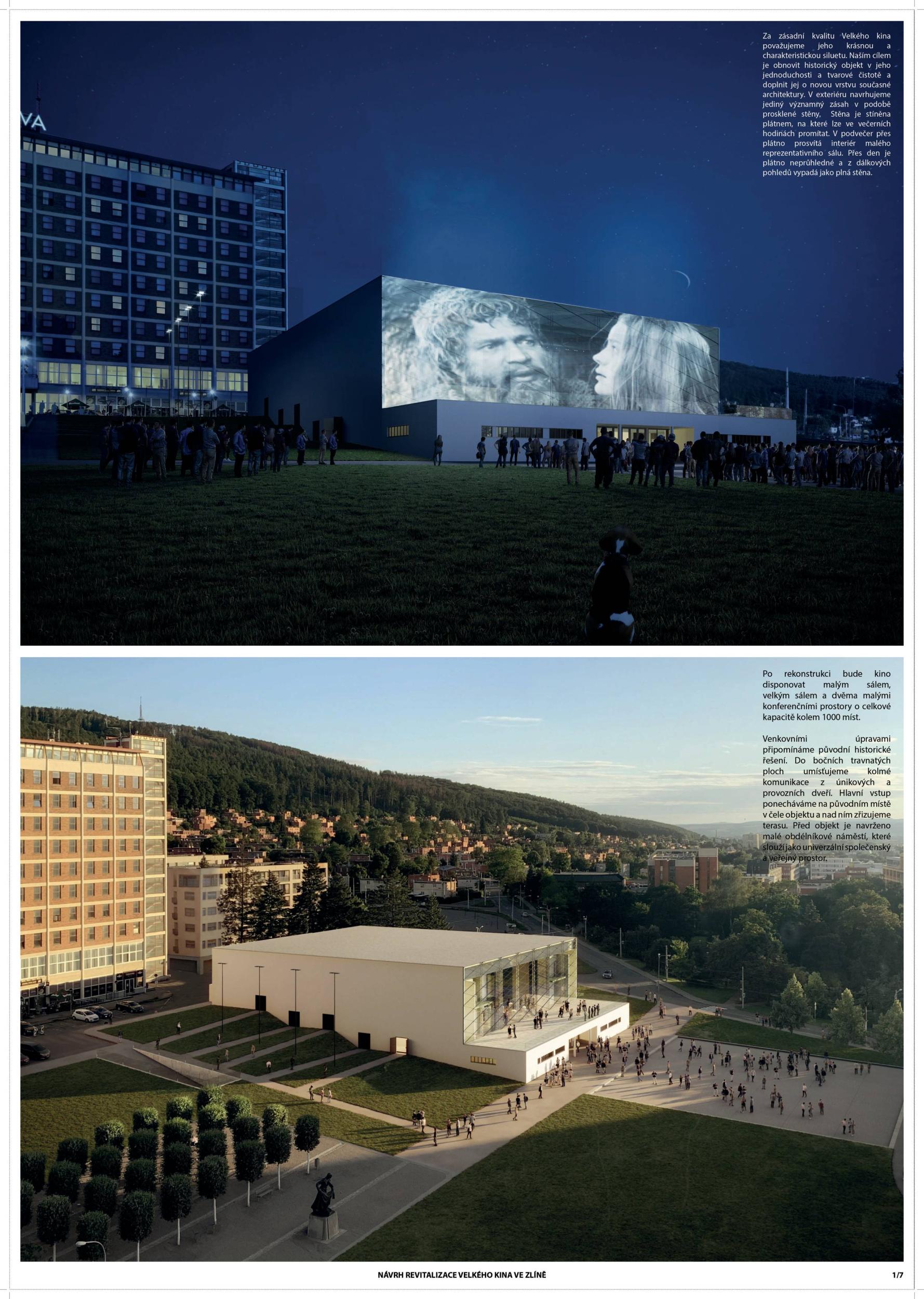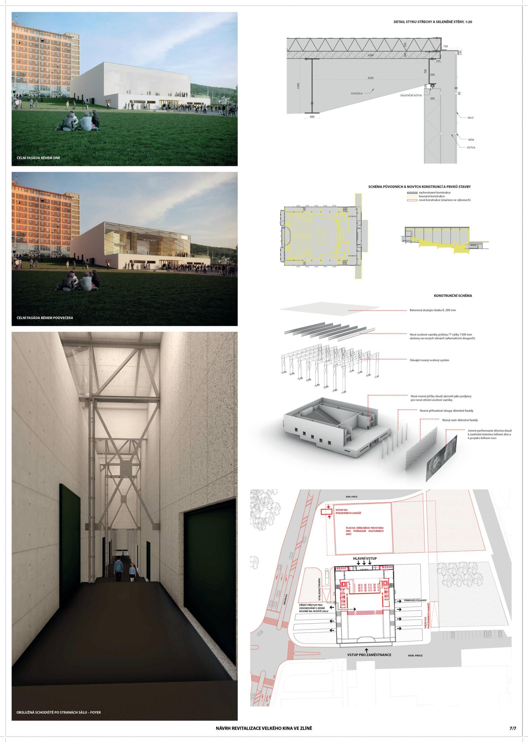 The building in its original form from 1932 was simplest in both its interior and exterior. This simplicity is the most valuable feature we want to preserve and strengthen. We are achieving this by removing all of the latter construction layers and returning to the prime volumetric simplicity as well as recognising the greatness of the original hall. The Great Cinema contains two halls – the large hall accommodates 900 seated spectators within the original volume, and the small hall is designed for 210 spectators. Both halls have levelled floors, are divisible, and have great acoustics and wide usability. The two halls can be used separately or they can be connected to the foyer to create one flowing space of the Great Cinema. We retained the possibility of accessing the large hall with a lorry. The sliding windows are supported by the new construction to not overload the existing building structure. With the respect to their weight, the system of counterweight is added. The manipulation of the windows will be provided by electric motors. We designed a sufficient service programme within the institution. This constellation allows continuous operation, where everyday small events occasionally alternate with large events. Life within the Great Cinema is ensured by a generous café in the foyer, which opens onto the terrace in front of the cinema during the summer months. The Great Cinema also provides several studios for recording, animation, photography, and offices for employees or for rent. The space in front of the cinema encourages movement and life within the square. People are sitting on the edge, looking out at Tomas Bata Avenue. There is a café on the terrace offering a space to play as well as views across the city. This would be a unique space for Zlín. Architects: Michal Kuzemenský, David Pavlišta, Ondřej Synek, Jan Vlach, Jiří Žid, Michaela Hudečková, Vojtěch Ružbatský, Dušan Sabol, Alžběta Widholmová Landscape Architects: Symbio studio (Pavla Drbalová, Marie Gelová, Sandra Chlebovská) Structural Engineer: Excon (Vladimír Janata, Jindřich Syrovátka) Acoustics: Petr Novák Transportation Engineer: Květoslav Syrový Fire Engineer: Jan Trafina Cultural Management: Jiří Sulženko