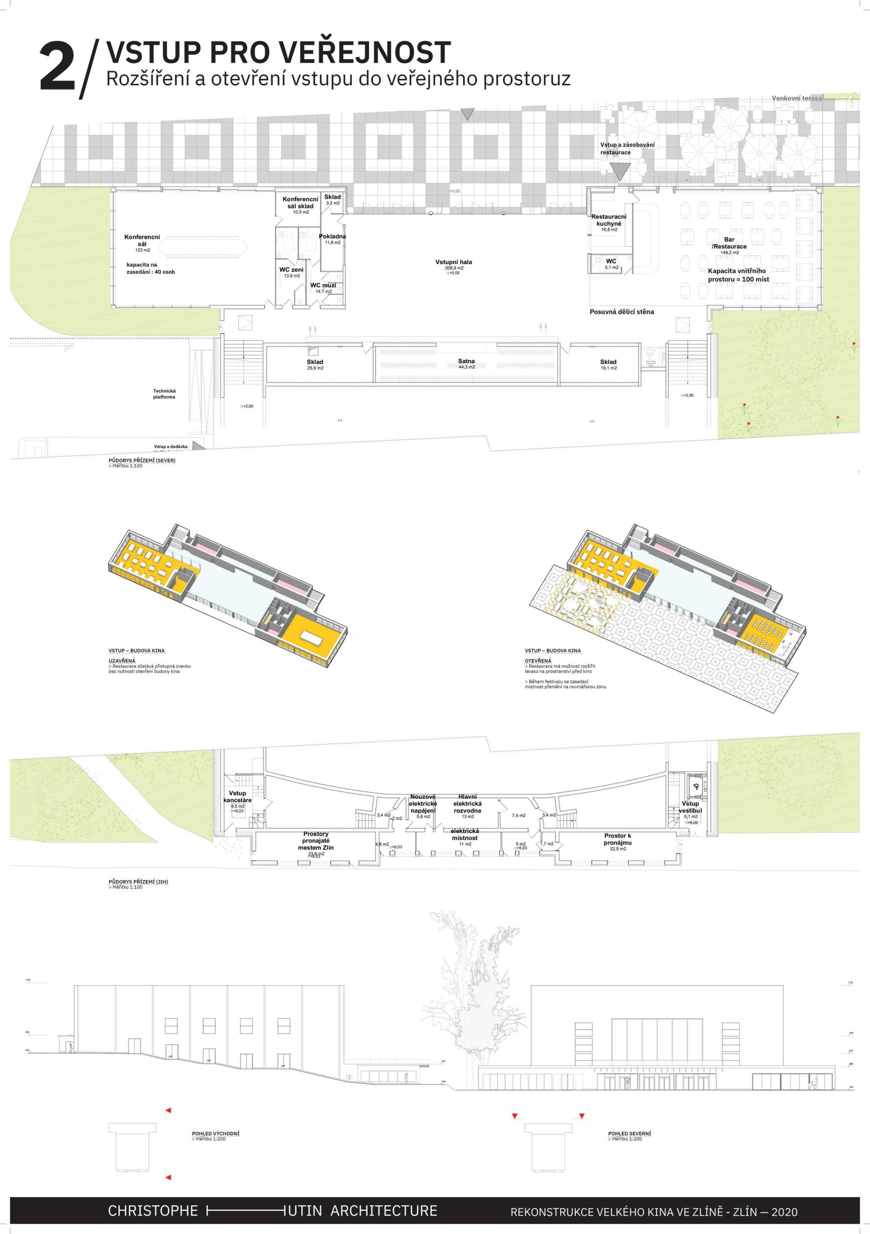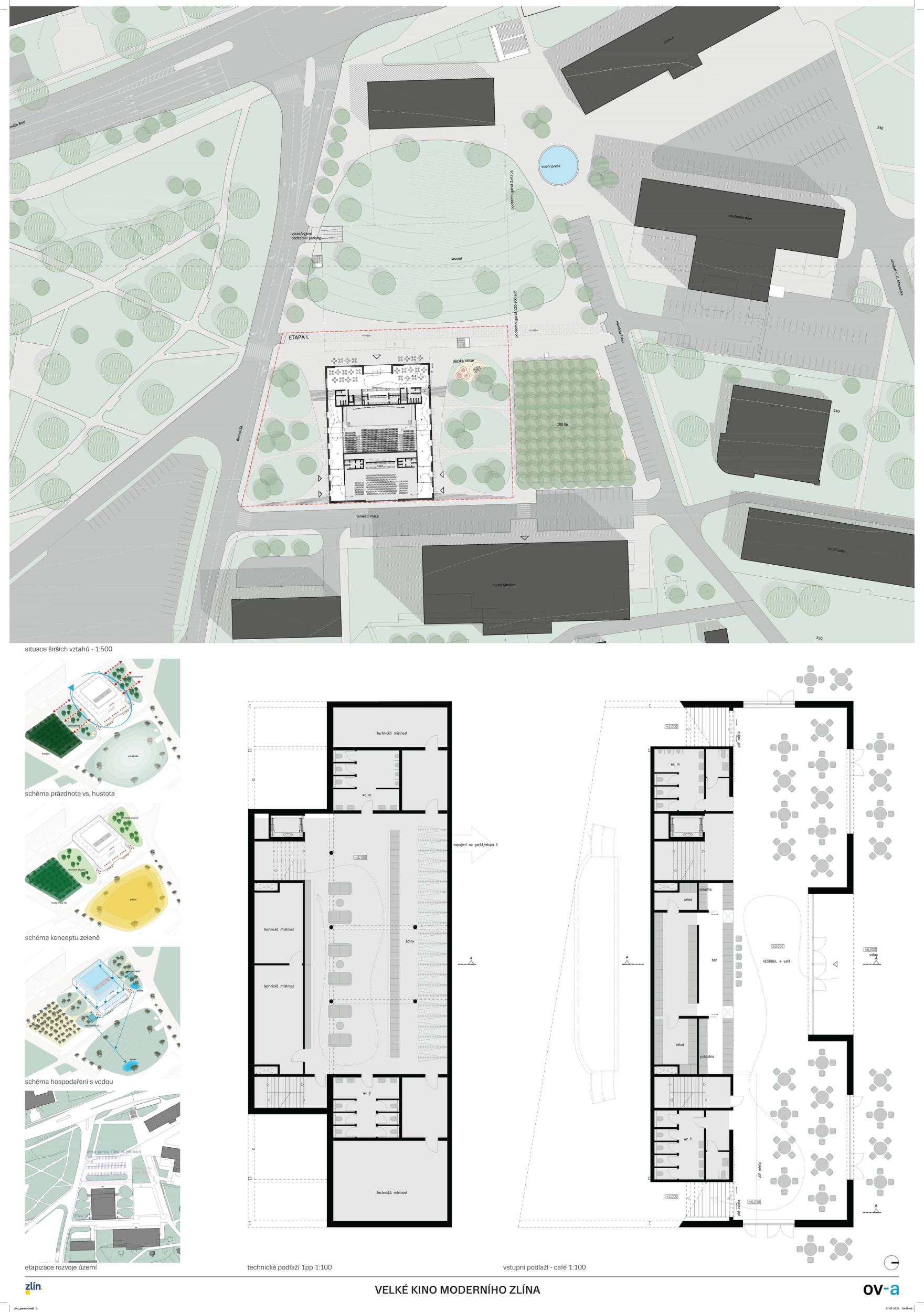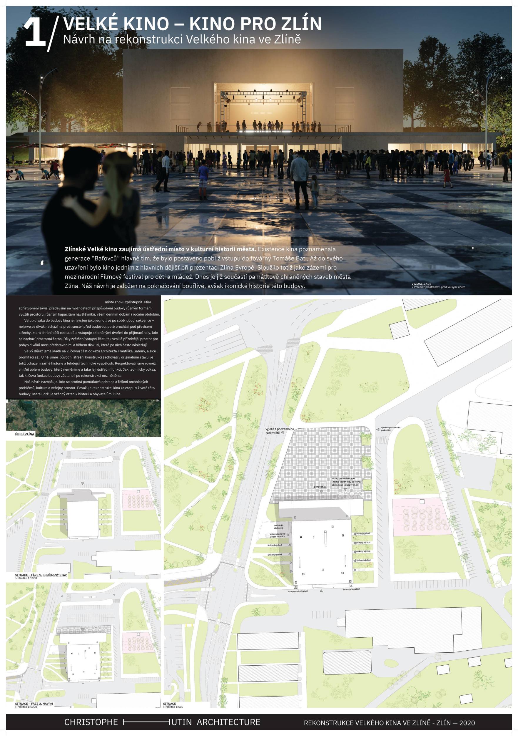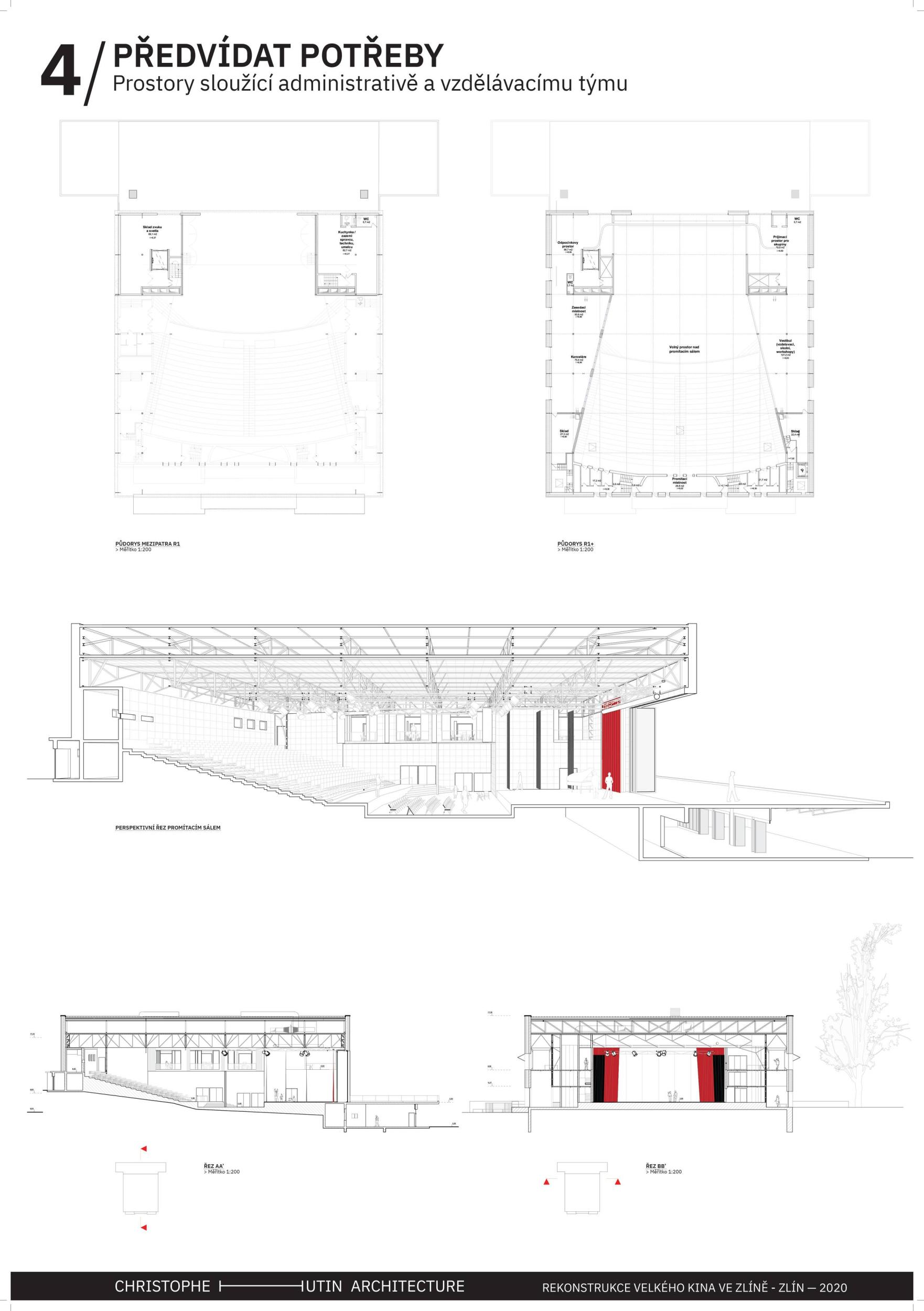 The building in its original form from 1932 was simplest in both its interior and exterior. This simplicity is the most valuable feature we want to preserve and strengthen. We are achieving this by removing all of the latter construction layers and returning to the prime volumetric simplicity as well as recognising the greatness of the original hall. The Great Cinema contains two halls – the large hall accommodates 900 seated spectators within the original volume, and the small hall is designed for 210 spectators. Both halls have levelled floors, are divisible, and have great acoustics and wide usability. The two halls can be used separately or they can be connected to the foyer to create one flowing space of the Great Cinema. We retained the possibility of accessing the large hall with a lorry. The sliding windows are supported by the new construction to not overload the existing building structure. With the respect to their weight, the system of counterweight is added. The manipulation of the windows will be provided by electric motors. We designed a sufficient service programme within the institution. This constellation allows continuous operation, where everyday small events occasionally alternate with large events. Life within the Great Cinema is ensured by a generous café in the foyer, which opens onto the terrace in front of the cinema during the summer months. The Great Cinema also provides several studios for recording, animation, photography, and offices for employees or for rent. The space in front of the cinema encourages movement and life within the square. People are sitting on the edge, looking out at Tomas Bata Avenue. There is a café on the terrace offering a space to play as well as views across the city. This would be a unique space for Zlín. Architects: Michal Kuzemenský, David Pavlišta, Ondřej Synek, Jan Vlach, Jiří Žid, Michaela Hudečková, Vojtěch Ružbatský, Dušan Sabol, Alžběta Widholmová Landscape Architects: Symbio studio (Pavla Drbalová, Marie Gelová, Sandra Chlebovská) Structural Engineer: Excon (Vladimír Janata, Jindřich Syrovátka) Acoustics: Petr Novák Transportation Engineer: Květoslav Syrový Fire Engineer: Jan Trafina Cultural Management: Jiří Sulženko