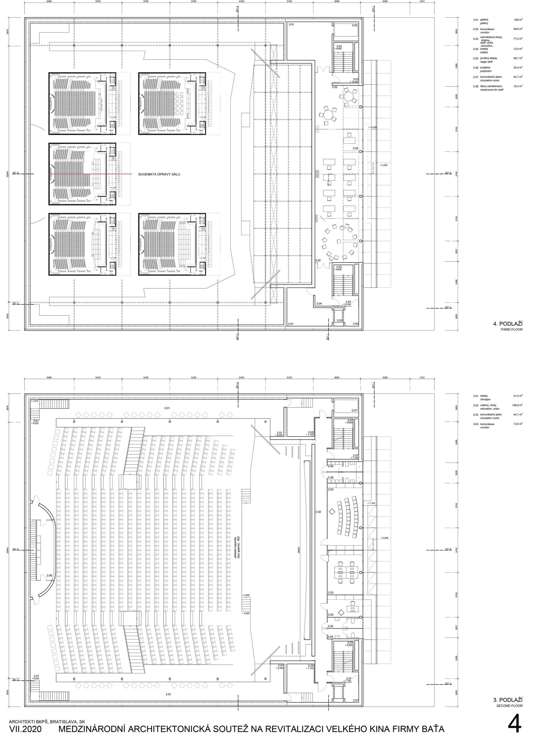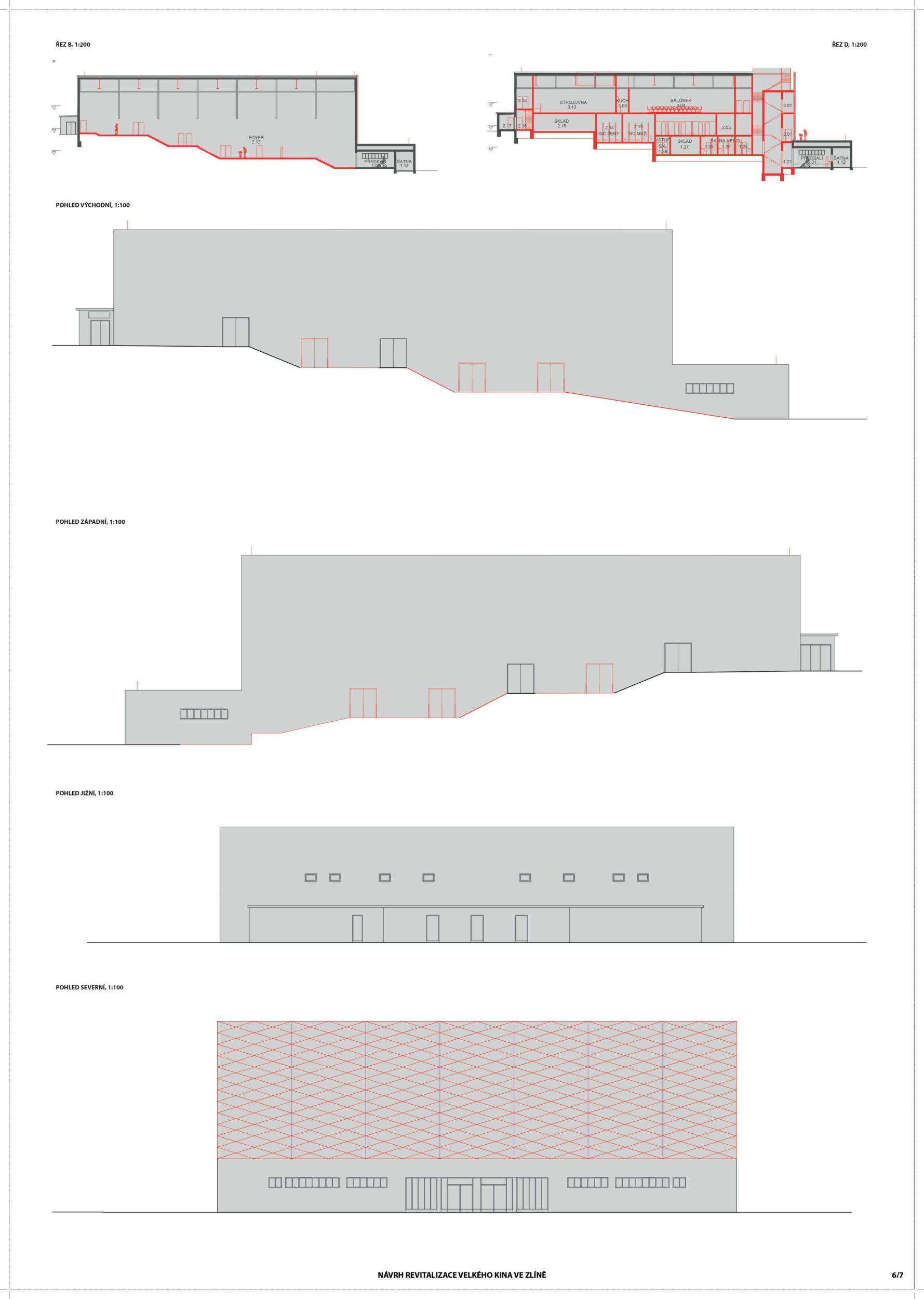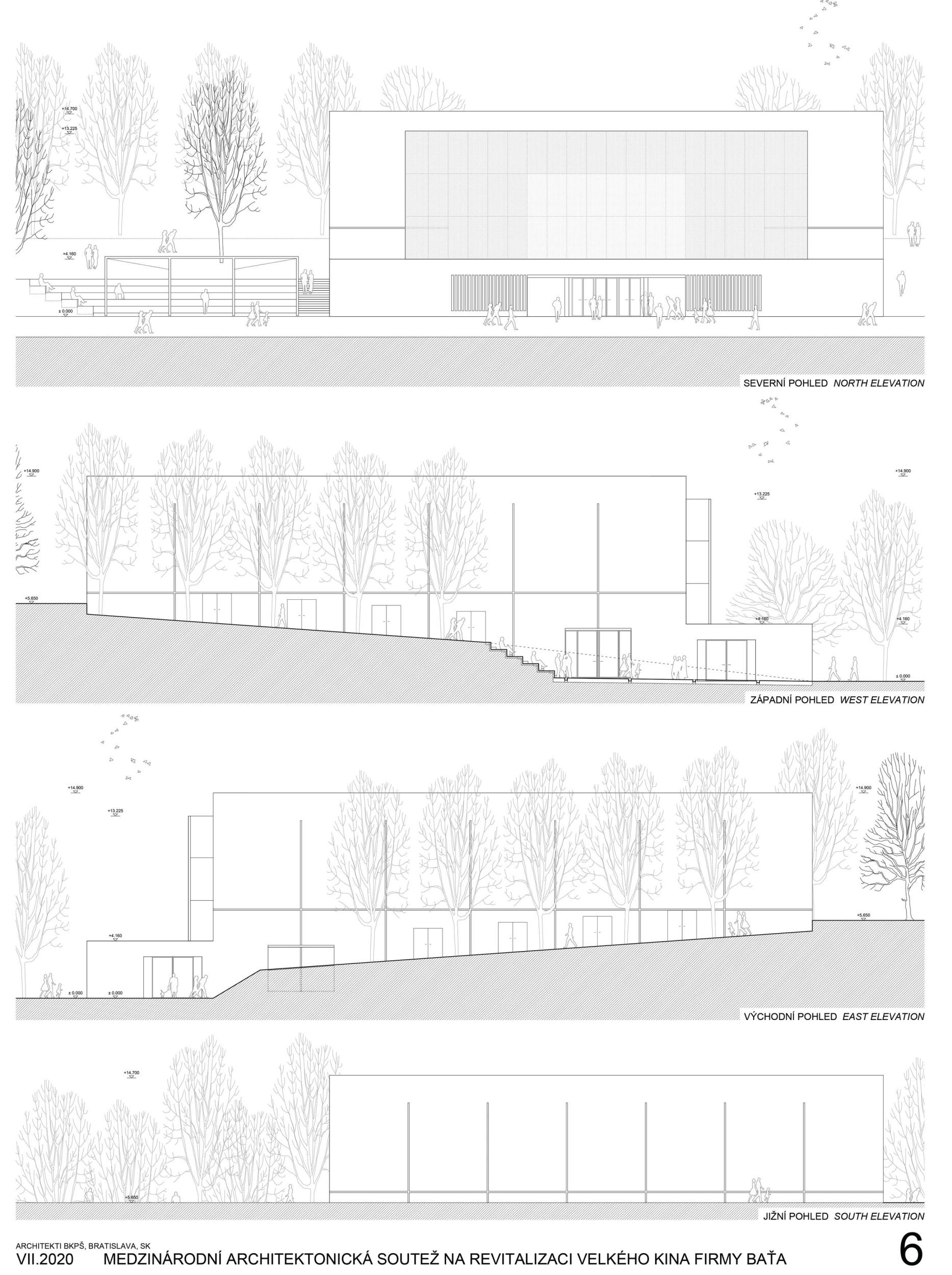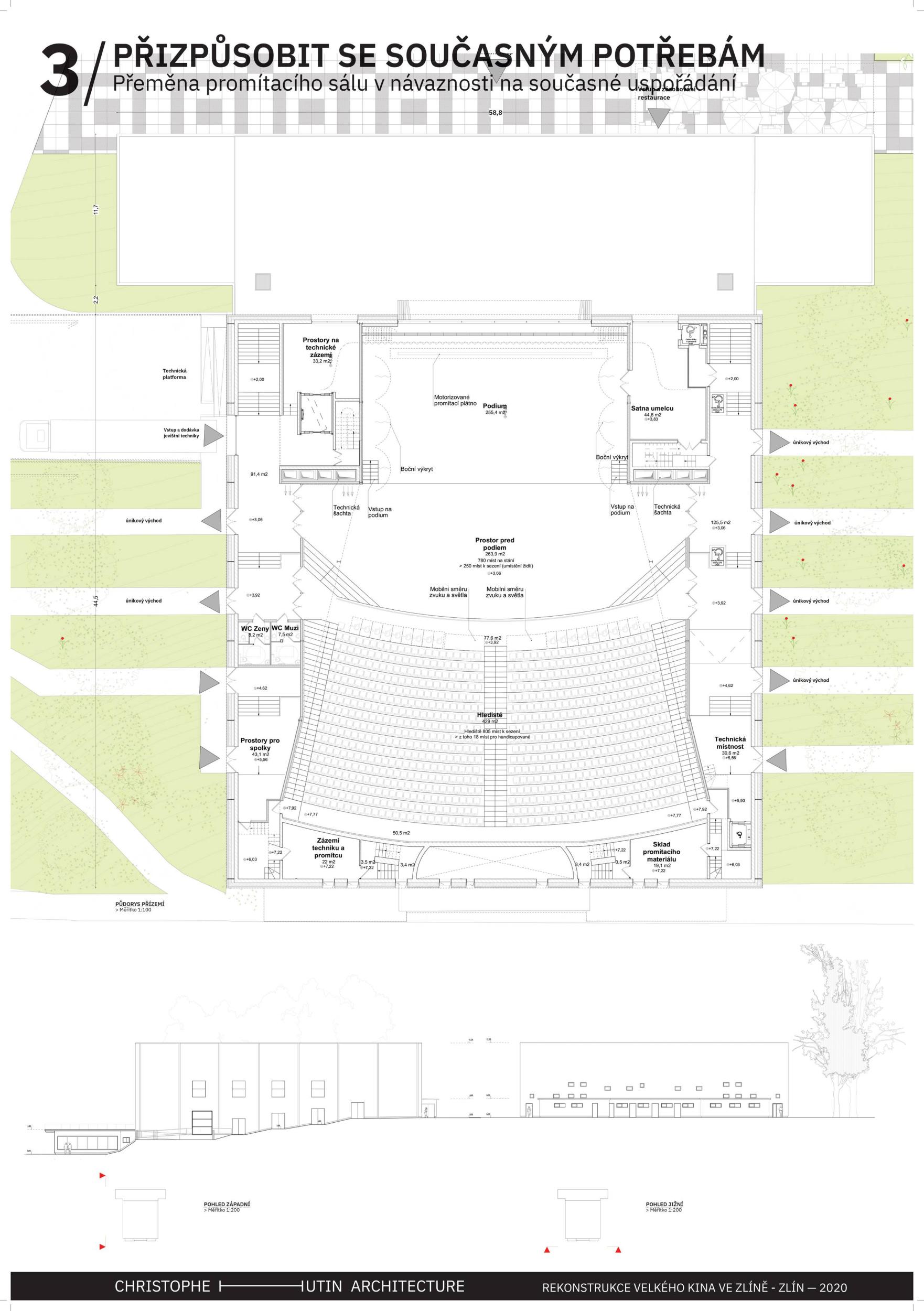 The building in its original form from 1932 was simplest in both its interior and exterior. This simplicity is the most valuable feature we want to preserve and strengthen. We are achieving this by removing all of the latter construction layers and returning to the prime volumetric simplicity as well as recognising the greatness of the original hall. The Great Cinema contains two halls – the large hall accommodates 900 seated spectators within the original volume, and the small hall is designed for 210 spectators. Both halls have levelled floors, are divisible, and have great acoustics and wide usability. The two halls can be used separately or they can be connected to the foyer to create one flowing space of the Great Cinema. We retained the possibility of accessing the large hall with a lorry. The sliding windows are supported by the new construction to not overload the existing building structure. With the respect to their weight, the system of counterweight is added. The manipulation of the windows will be provided by electric motors. We designed a sufficient service programme within the institution. This constellation allows continuous operation, where everyday small events occasionally alternate with large events. Life within the Great Cinema is ensured by a generous café in the foyer, which opens onto the terrace in front of the cinema during the summer months. The Great Cinema also provides several studios for recording, animation, photography, and offices for employees or for rent. The space in front of the cinema encourages movement and life within the square. People are sitting on the edge, looking out at Tomas Bata Avenue. There is a café on the terrace offering a space to play as well as views across the city. This would be a unique space for Zlín. Architects: Michal Kuzemenský, David Pavlišta, Ondřej Synek, Jan Vlach, Jiří Žid, Michaela Hudečková, Vojtěch Ružbatský, Dušan Sabol, Alžběta Widholmová Landscape Architects: Symbio studio (Pavla Drbalová, Marie Gelová, Sandra Chlebovská) Structural Engineer: Excon (Vladimír Janata, Jindřich Syrovátka) Acoustics: Petr Novák Transportation Engineer: Květoslav Syrový Fire Engineer: Jan Trafina Cultural Management: Jiří Sulženko