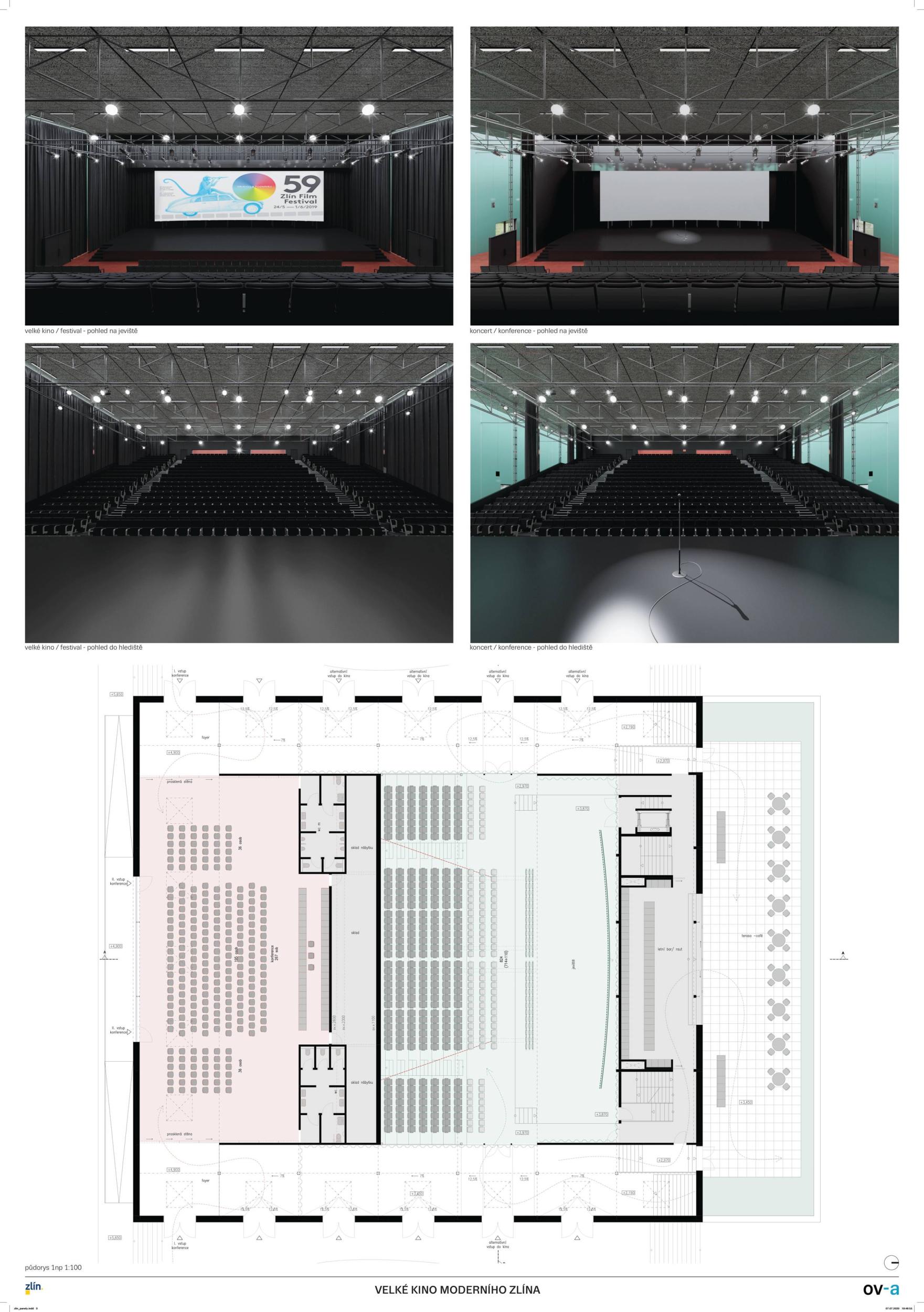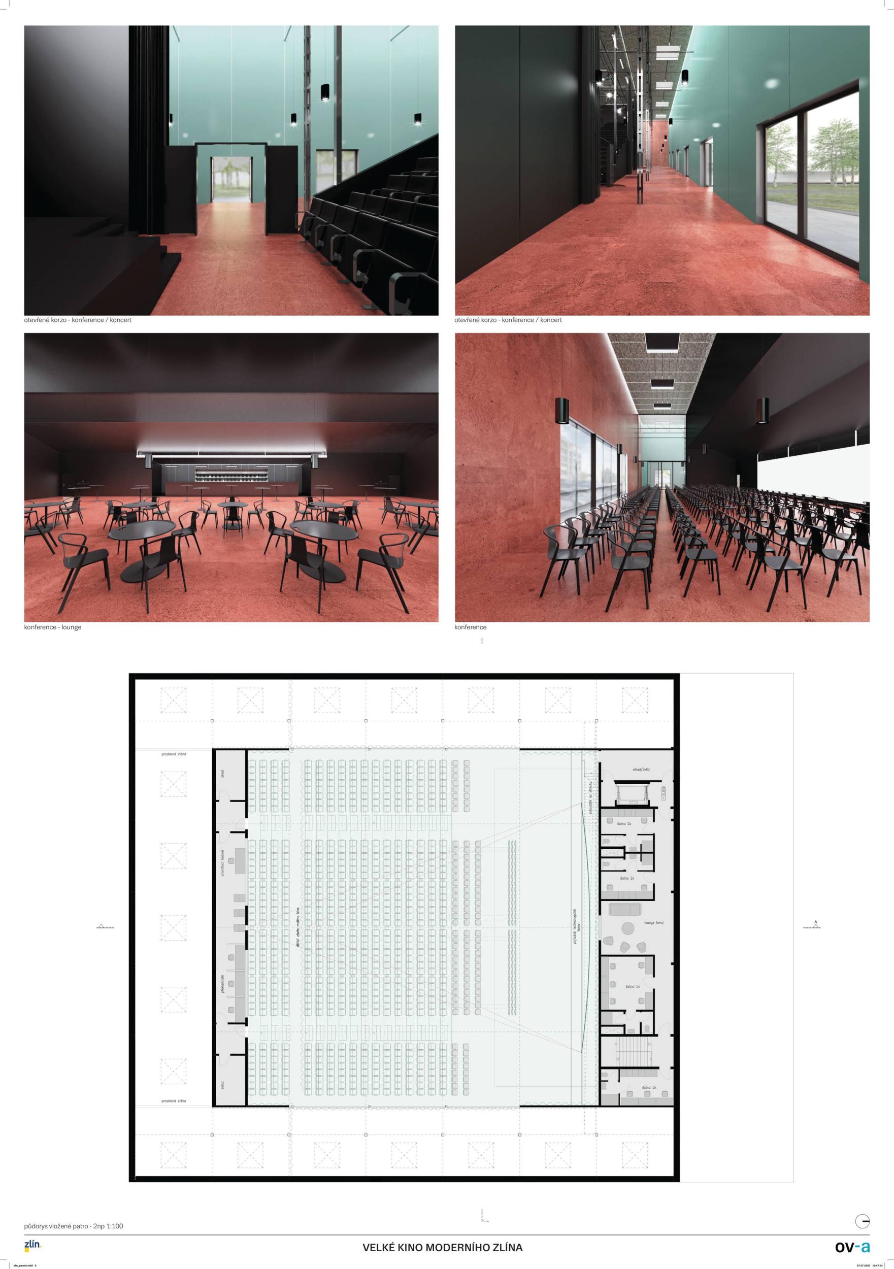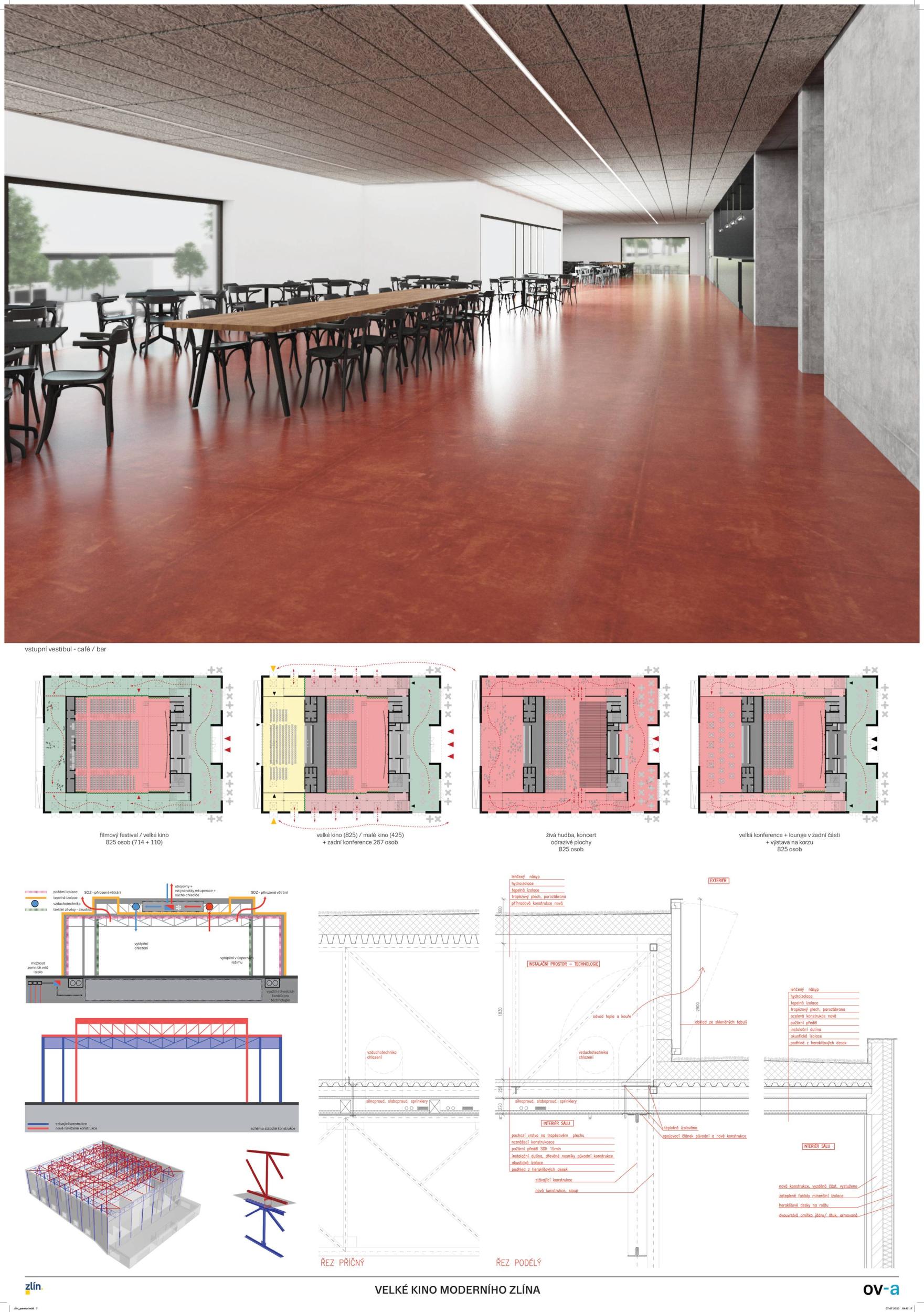 A bold and imaginative contemporary reinterpretation of the legacy of modern Zlín architecture. A consistent universalistic concept with great flexibility of use for cultural and commercial programs. In this sense, it follows the original meaning of Gahura’s construction. The building is a programme-creating machine – it offers two main spaces, a smaller hall for common (everyday) use, and a universal large hall for more space-demanding events. The main mass of the hall is reduced by the inserted mass of the second hall which reduces the overall size of the space but retains its width proportions, including the entire span of the monument-valued structure. The design is well thought out regarding the load-bearing structure and successfully enables variations, while maintaining the load-bearing function of the existing structure. The operation and supply of the building are well designed. The possibility of opening a large hall to the exterior further enhances the original intention of the building as a covered public space. The main hall will therefore be directly involved in the events happening in the square which fundamentally opens up the spectrum of possible uses. The generous opening of the entrance facade appropriately articulates the intention to create an accessible public space for everyday use, and to communicate with the Práce Square. Levelling the terrain in front of the main entrance to the building creates an adequate entrance forecourt, formally defined, but at the same time still part of a typical large area north of the Great Cinema. The design actively approaches monument preservation in the sense of a dialogue between the old and the new: the new layer represents a solution of construction or functional innovation – the lift and opening/glazing of the ground floor of the front and side facades. Such an ambitious project also places demands on the operator, as it requires active participation. From the point of view of stage technology, the design represents a well-thought-out and functional solution for arranging spaces and establishing technology for production. The large hall has an adequate and effective solution to sliding elevation. The small hall is proportionally an ideal space for small theatrical productions of all genres, conferences, etc. The elevation of the small hall is built of Rastra which can be rather time-consuming. The design is realistic in terms of technological equipment and technology cost budget.