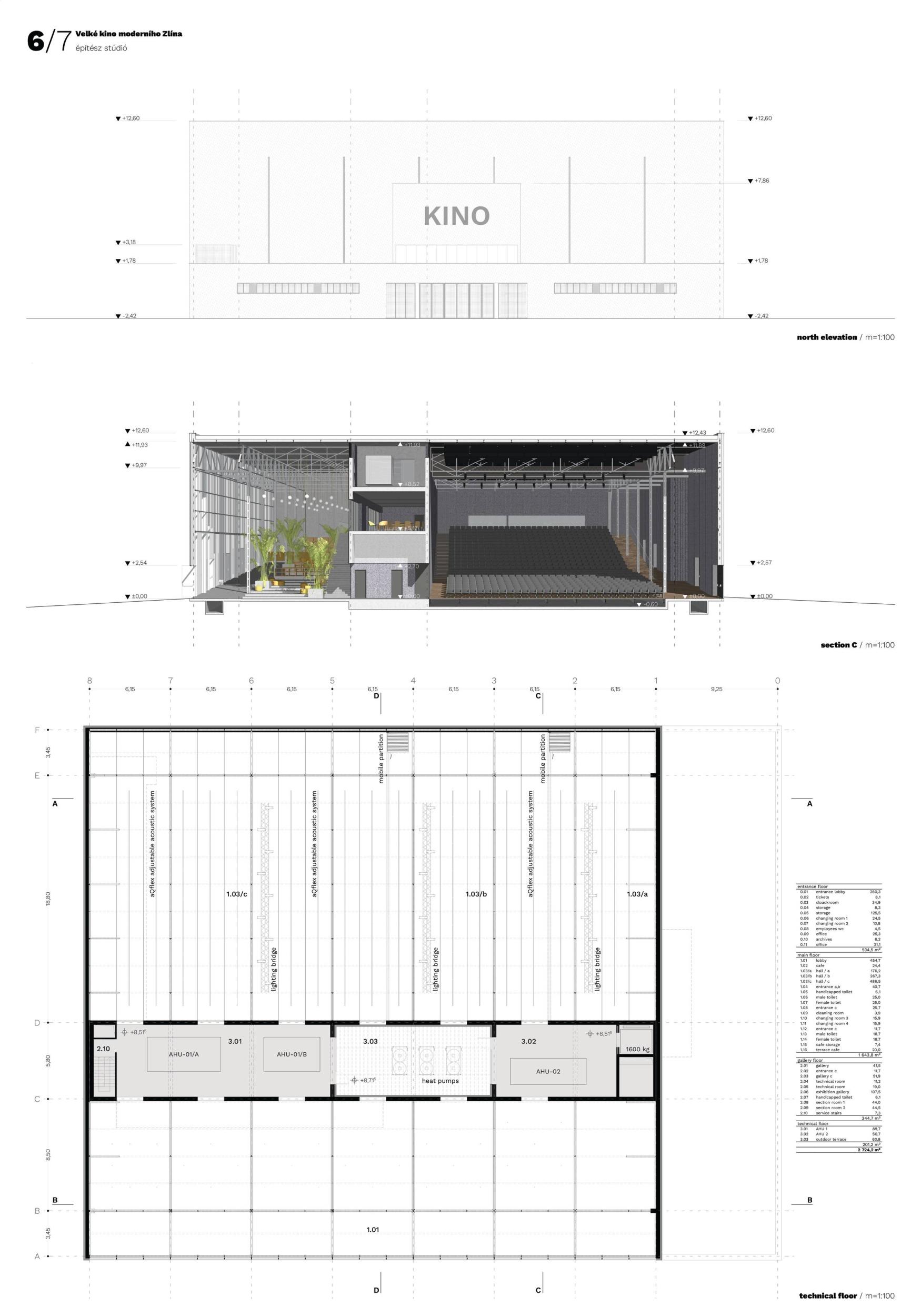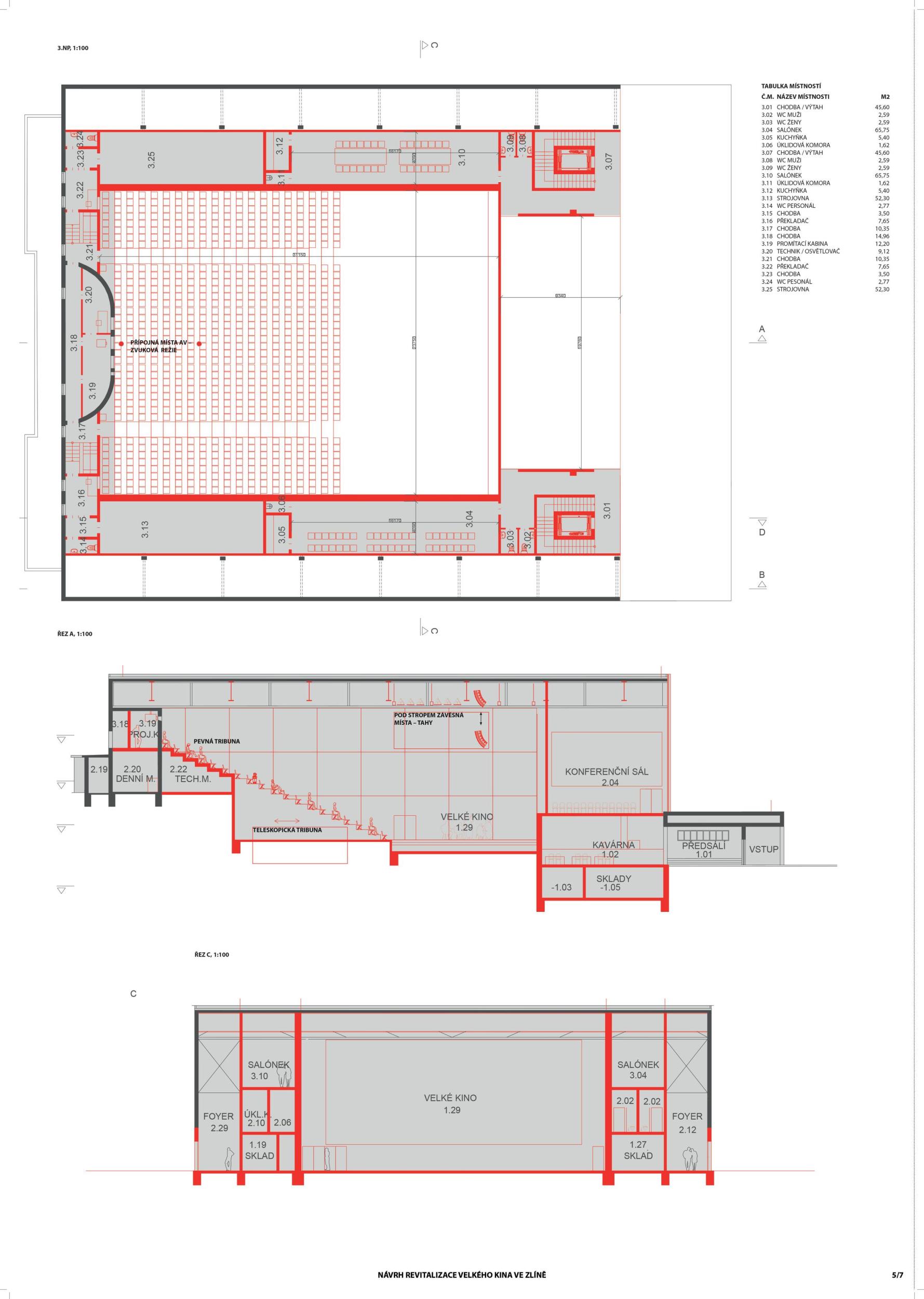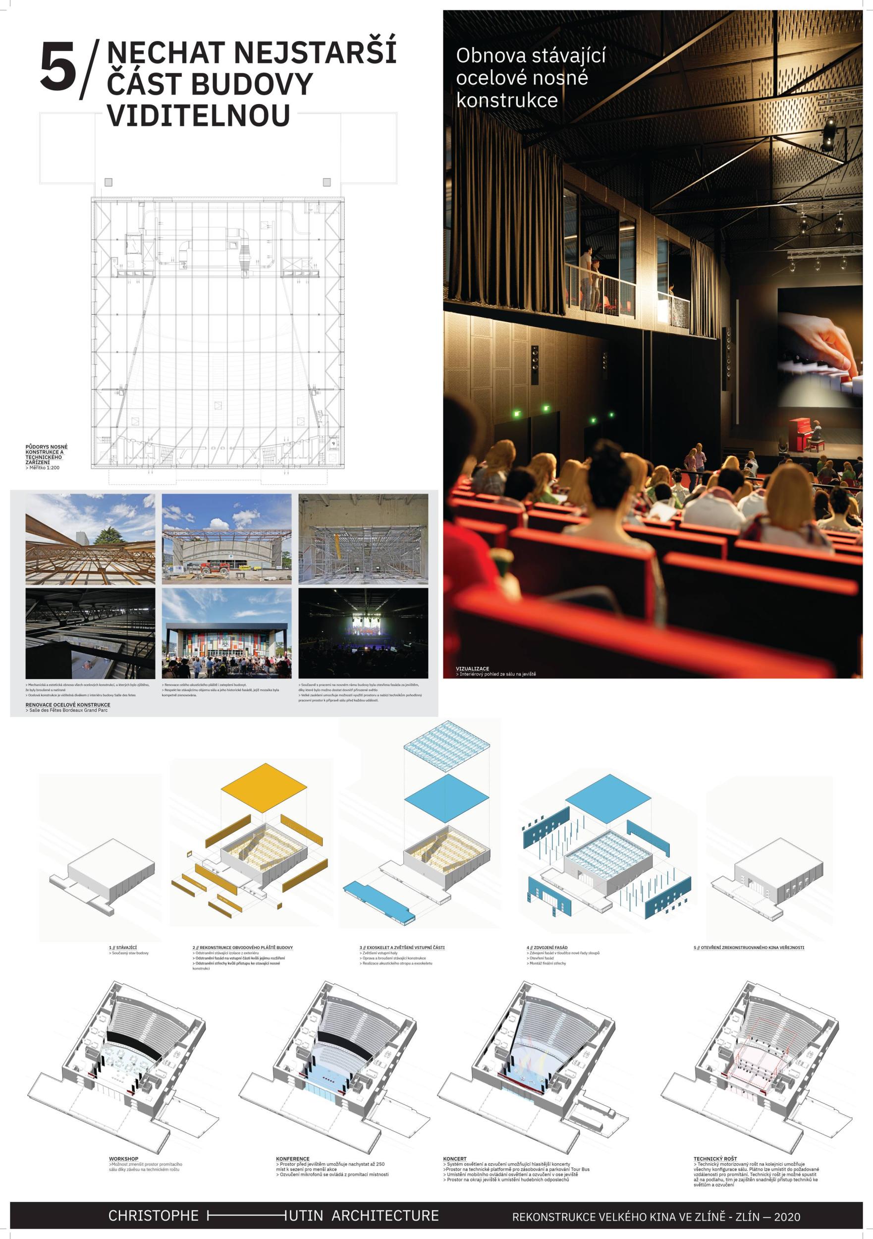 A bold and imaginative contemporary reinterpretation of the legacy of modern Zlín architecture. A consistent universalistic concept with great flexibility of use for cultural and commercial programs. In this sense, it follows the original meaning of Gahura’s construction. The building is a programme-creating machine – it offers two main spaces, a smaller hall for common (everyday) use, and a universal large hall for more space-demanding events. The main mass of the hall is reduced by the inserted mass of the second hall which reduces the overall size of the space but retains its width proportions, including the entire span of the monument-valued structure. The design is well thought out regarding the load-bearing structure and successfully enables variations, while maintaining the load-bearing function of the existing structure. The operation and supply of the building are well designed. The possibility of opening a large hall to the exterior further enhances the original intention of the building as a covered public space. The main hall will therefore be directly involved in the events happening in the square which fundamentally opens up the spectrum of possible uses. The generous opening of the entrance facade appropriately articulates the intention to create an accessible public space for everyday use, and to communicate with the Práce Square. Levelling the terrain in front of the main entrance to the building creates an adequate entrance forecourt, formally defined, but at the same time still part of a typical large area north of the Great Cinema. The design actively approaches monument preservation in the sense of a dialogue between the old and the new: the new layer represents a solution of construction or functional innovation – the lift and opening/glazing of the ground floor of the front and side facades. Such an ambitious project also places demands on the operator, as it requires active participation. From the point of view of stage technology, the design represents a well-thought-out and functional solution for arranging spaces and establishing technology for production. The large hall has an adequate and effective solution to sliding elevation. The small hall is proportionally an ideal space for small theatrical productions of all genres, conferences, etc. The elevation of the small hall is built of Rastra which can be rather time-consuming. The design is realistic in terms of technological equipment and technology cost budget.