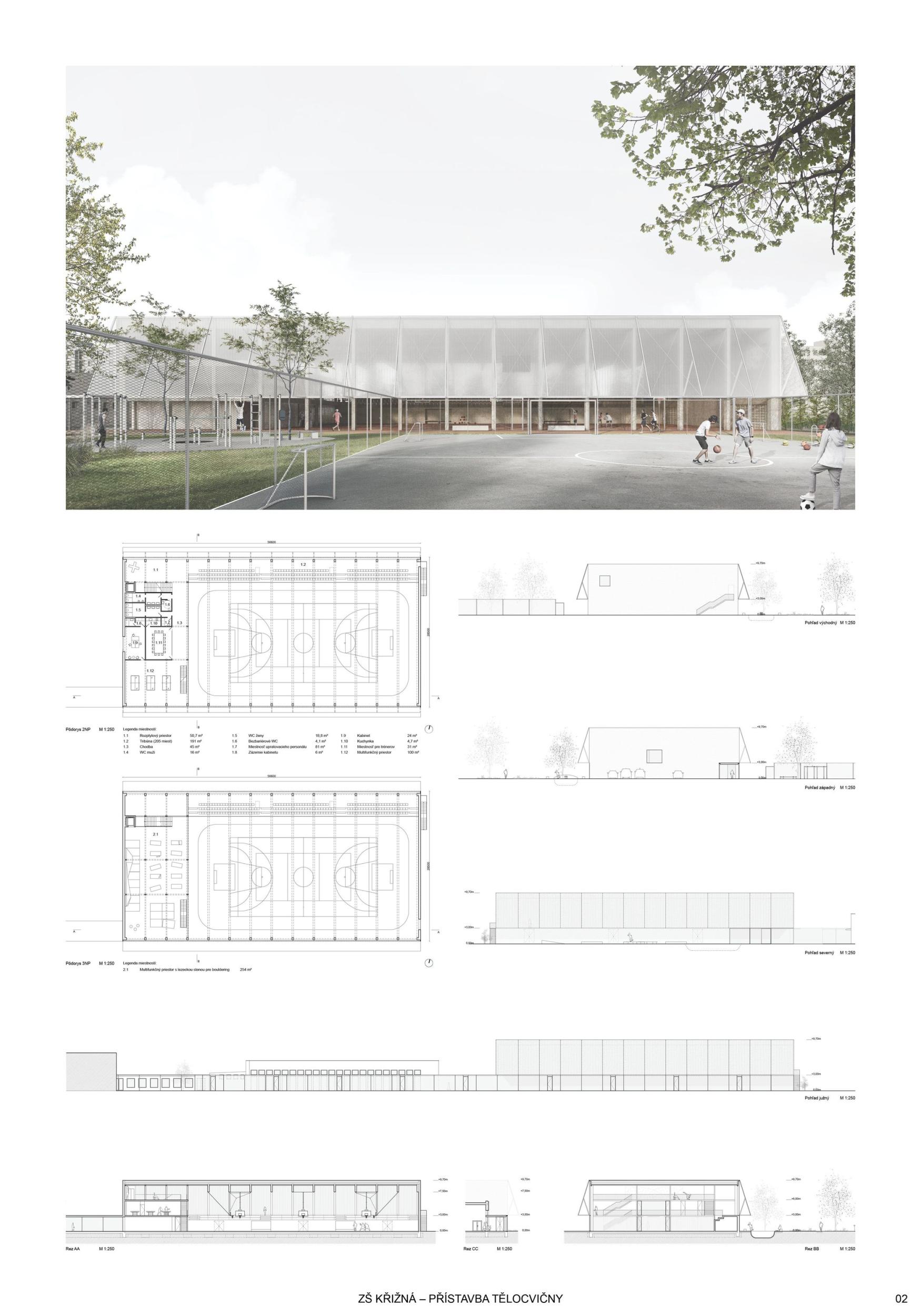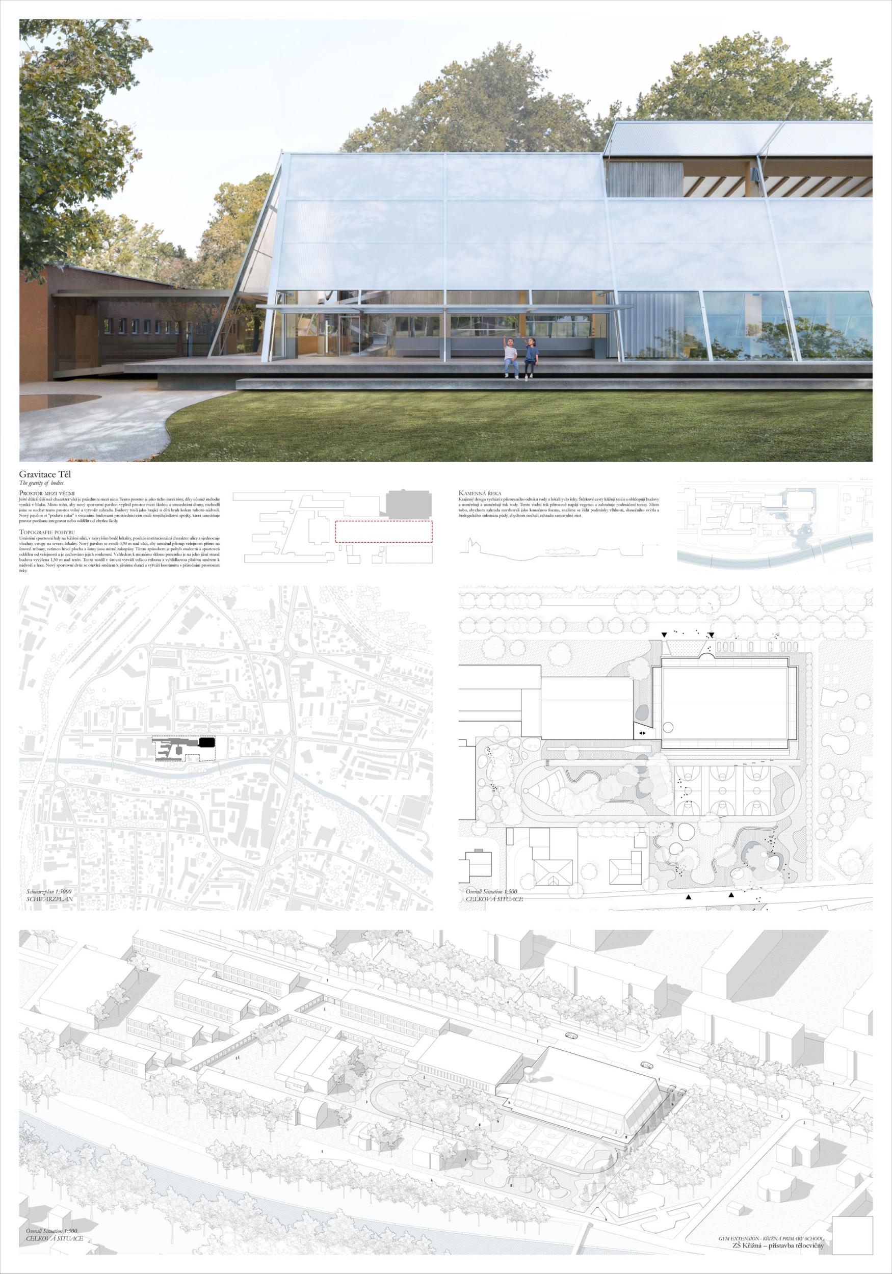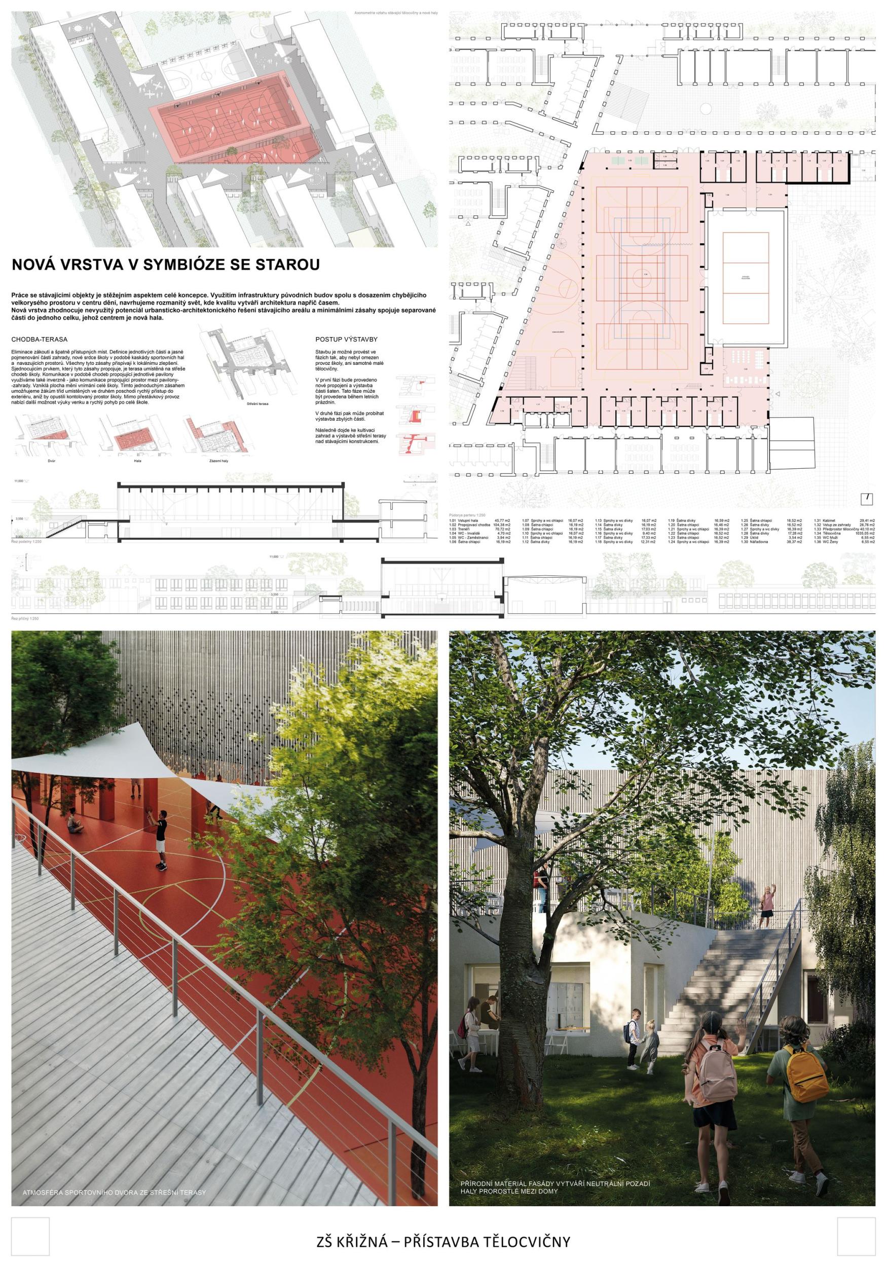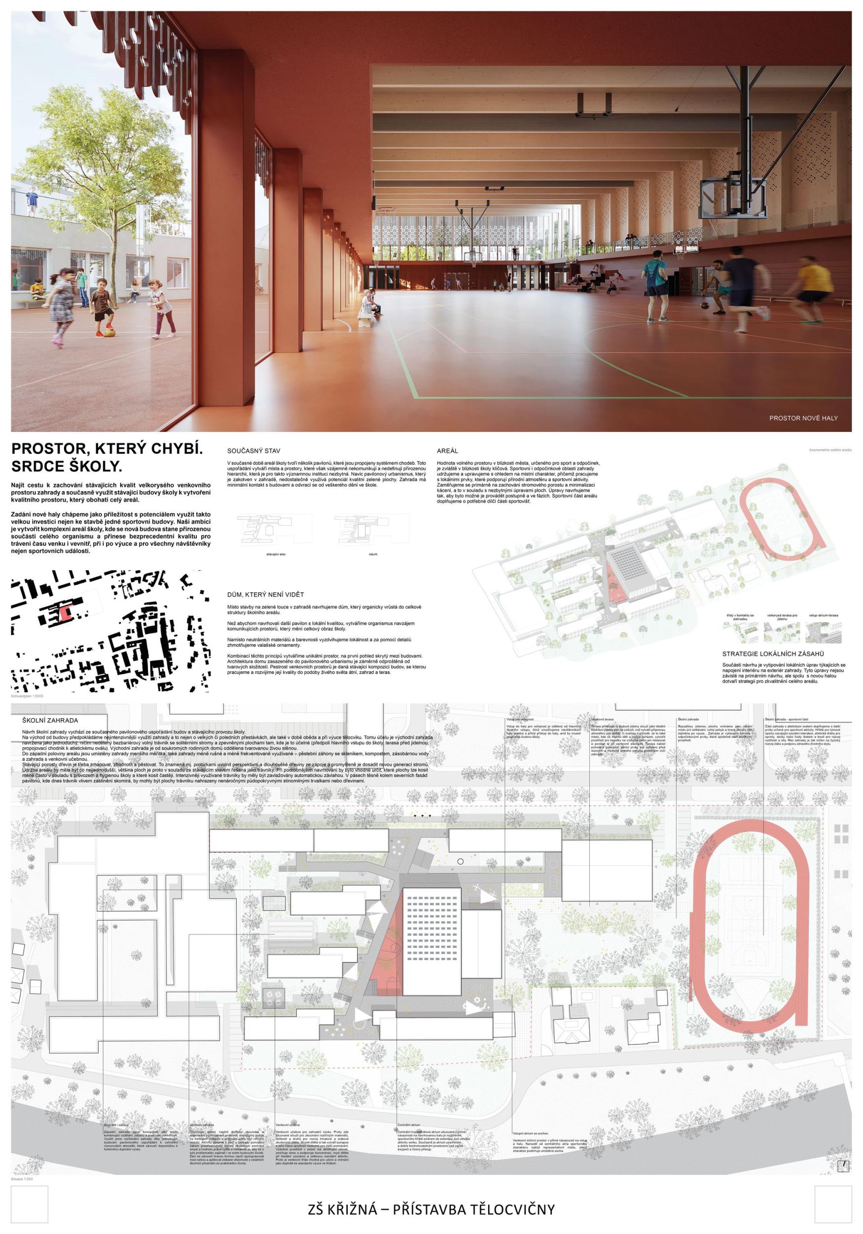 The proposal brings change to the entire Křižná Elementary School campus. The location of the sports hall right in the middle of the layout creates a wide range of opportunities and new potentials to turn a rather outdated building with many unclear corridors into a functional and modern unit. Suddenly you see a different school that stands up to the new buildings. So the main potential of the proposal is change that does not shy away from solving existing problems. This proposal for the extension of the gymnasium is the only one that has managed to preserve the playground and the garden with grown-up trees, and this decision gives a decent scope for a refined landscape solution, which at this stage is only offered in hints, which, however, have their logic. The design also allows for phasing and is sensitive to the existing trees. Access to the roofs is a very important part of the project and a big change for a school with previously predominantly internal pupil movement. Thus, another potential of the proposal is to work with all corridors and to significantly improve the internal environment for pupils who have been moving in unclear corridors. This change to the status quo will logically translate into the changing rooms, the canteen and can also better define the entrance and the school lobby. The placement of features such as the library, computer lab, recreation room should also follow this change and support the overall concept to create the heart of Krizna Elementary School. The proposal thus has a huge added value - to make the most of and improve the existing site into a modern vibrant complex with a quality indoor and outdoor environment that will inspire future generations.