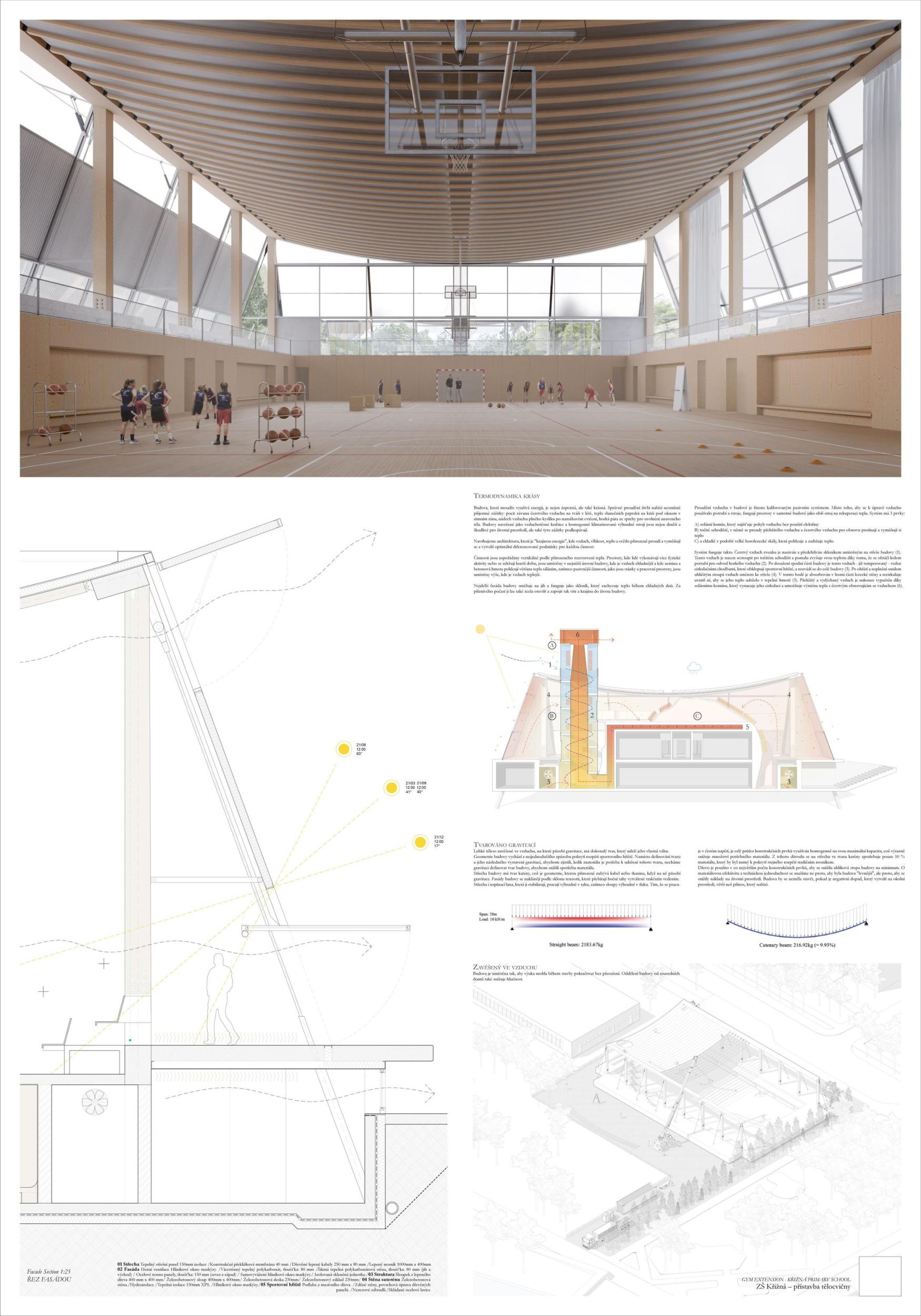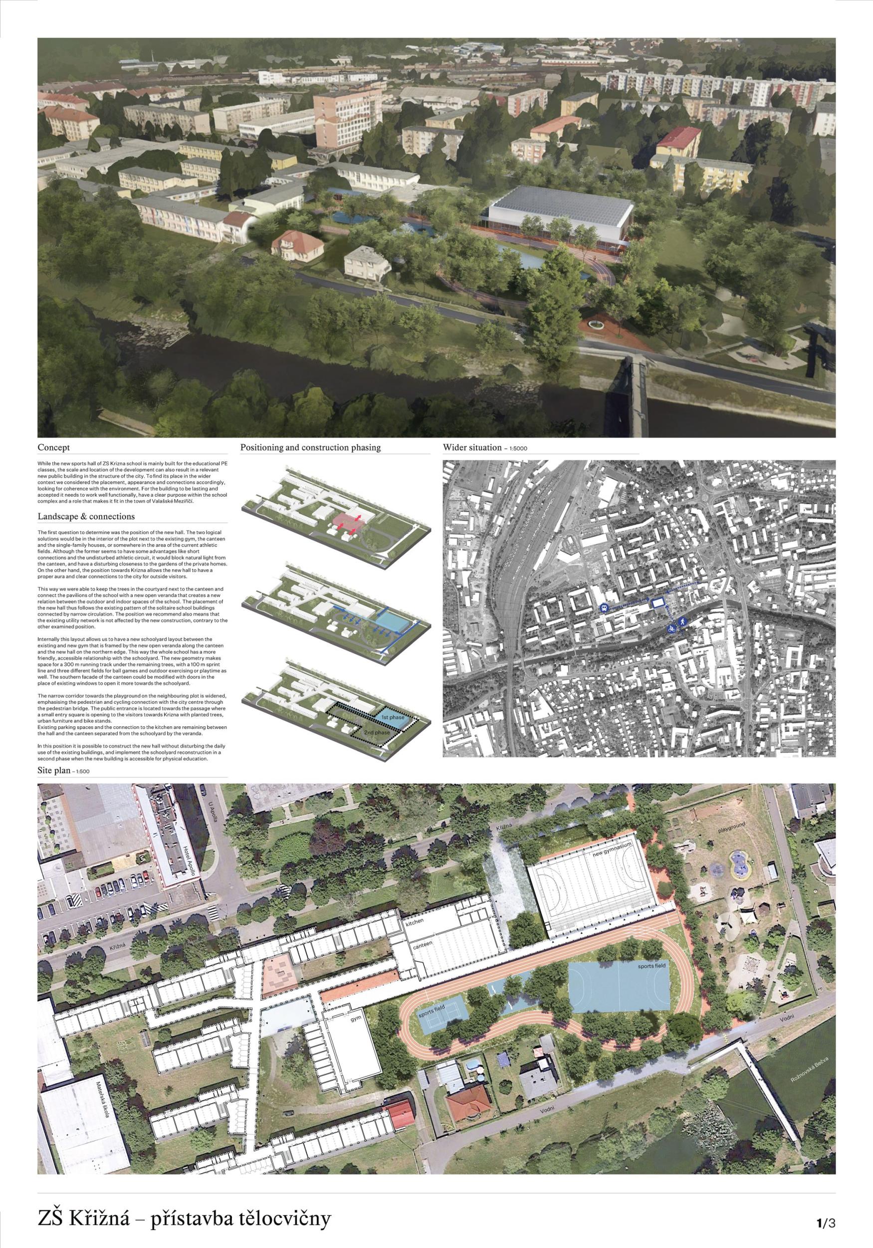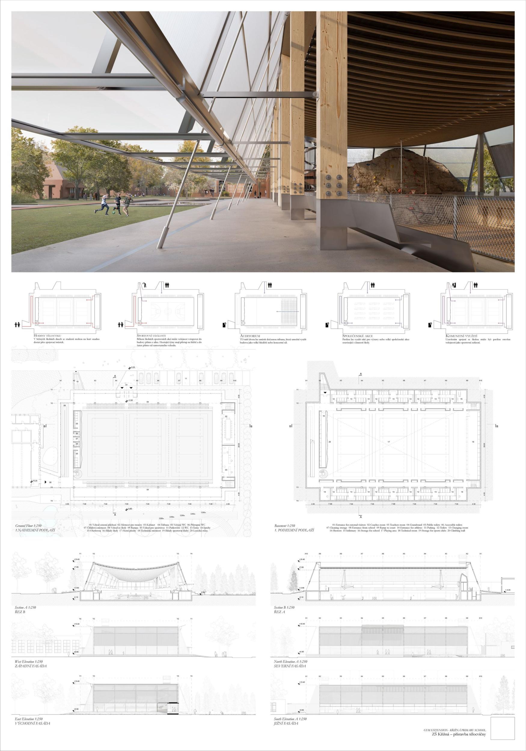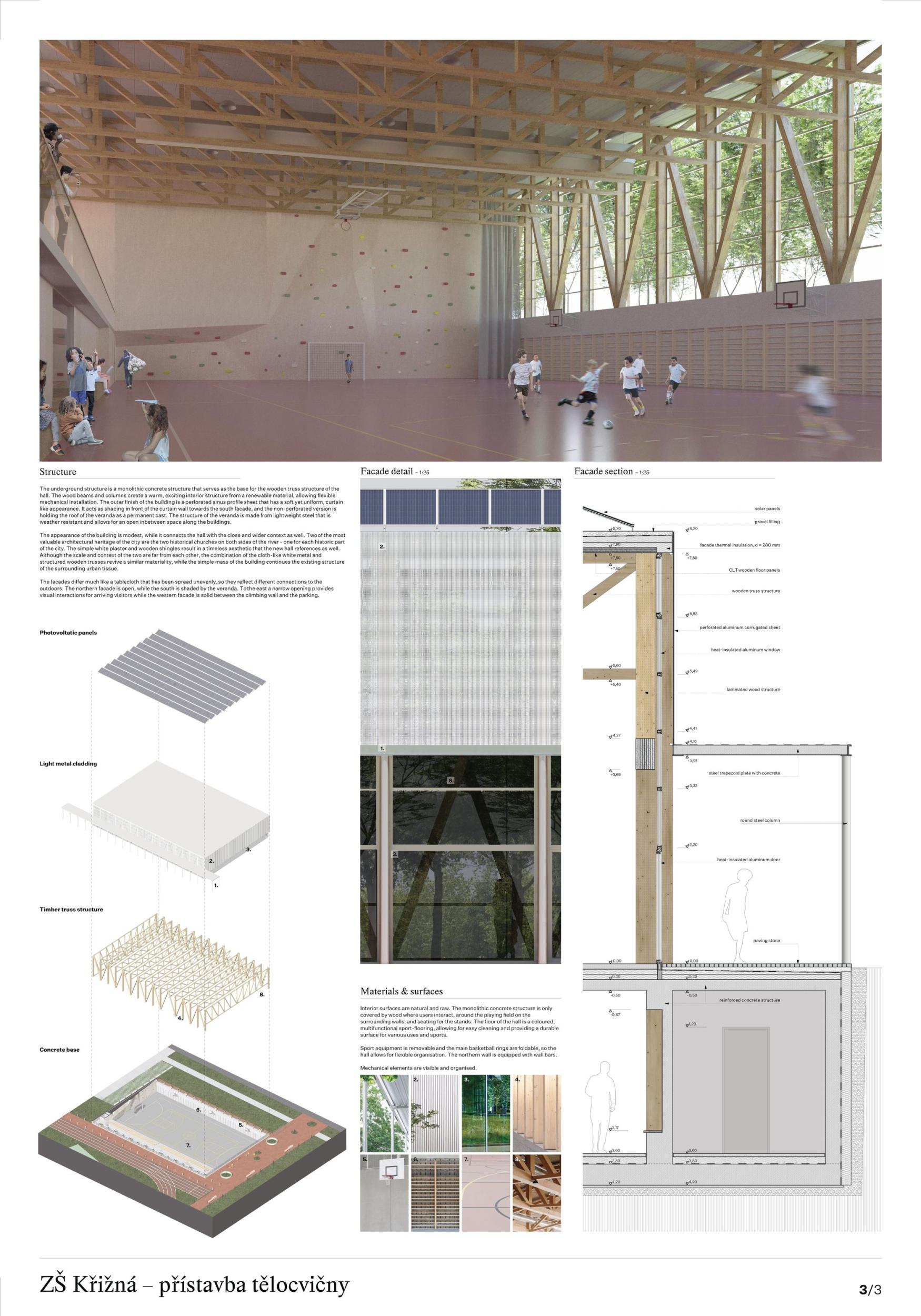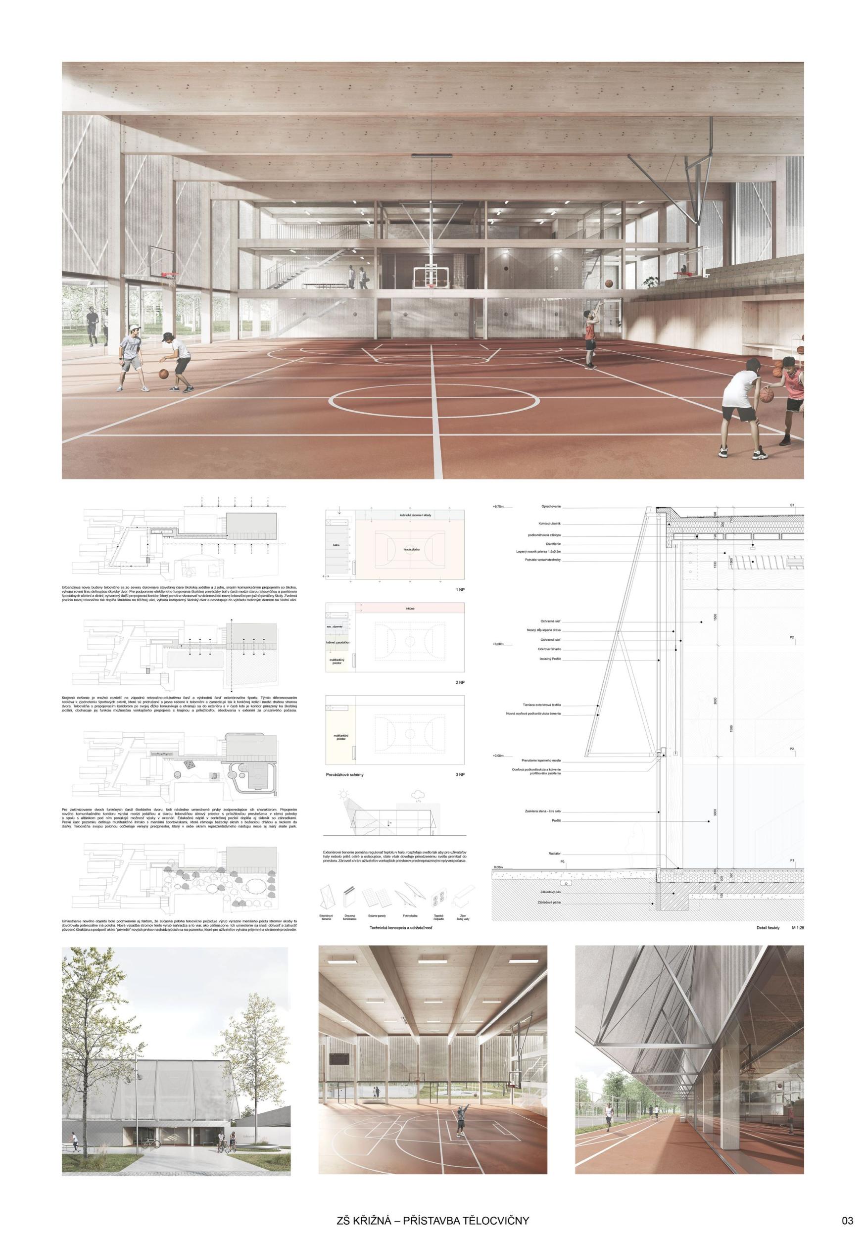 The proposal brings change to the entire Křižná Elementary School campus. The location of the sports hall right in the middle of the layout creates a wide range of opportunities and new potentials to turn a rather outdated building with many unclear corridors into a functional and modern unit. Suddenly you see a different school that stands up to the new buildings. So the main potential of the proposal is change that does not shy away from solving existing problems. This proposal for the extension of the gymnasium is the only one that has managed to preserve the playground and the garden with grown-up trees, and this decision gives a decent scope for a refined landscape solution, which at this stage is only offered in hints, which, however, have their logic. The design also allows for phasing and is sensitive to the existing trees. Access to the roofs is a very important part of the project and a big change for a school with previously predominantly internal pupil movement. Thus, another potential of the proposal is to work with all corridors and to significantly improve the internal environment for pupils who have been moving in unclear corridors. This change to the status quo will logically translate into the changing rooms, the canteen and can also better define the entrance and the school lobby. The placement of features such as the library, computer lab, recreation room should also follow this change and support the overall concept to create the heart of Krizna Elementary School. The proposal thus has a huge added value - to make the most of and improve the existing site into a modern vibrant complex with a quality indoor and outdoor environment that will inspire future generations.