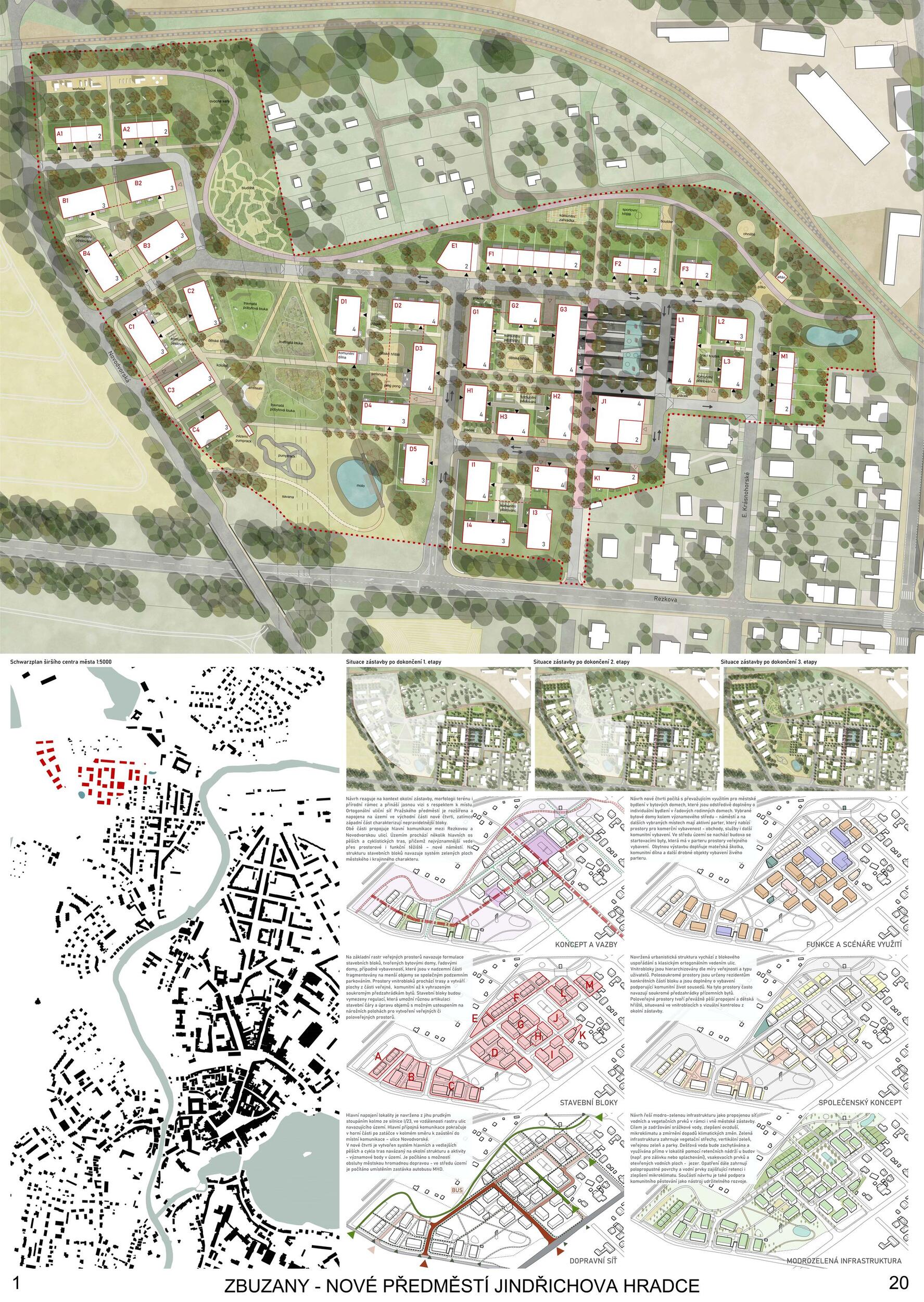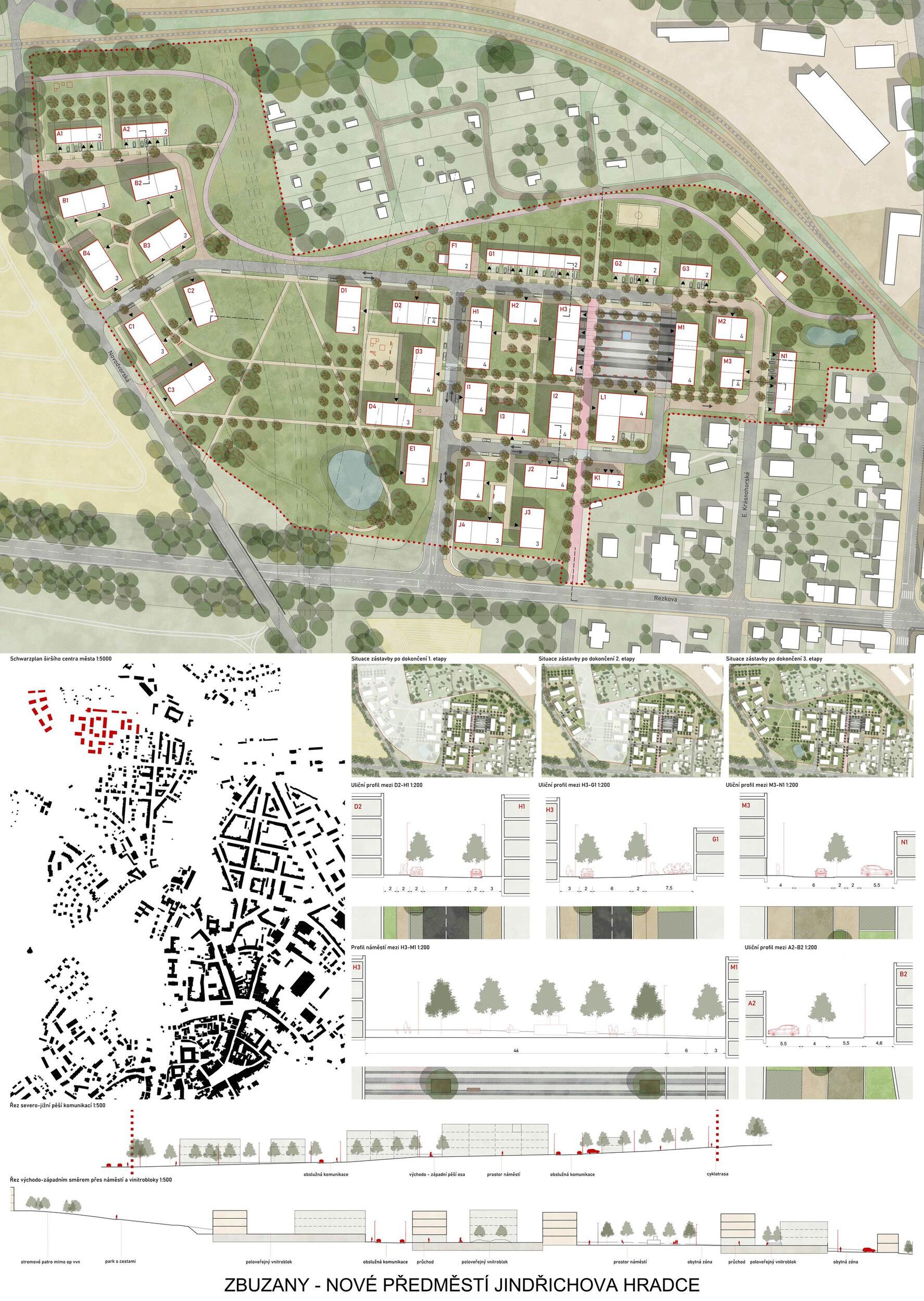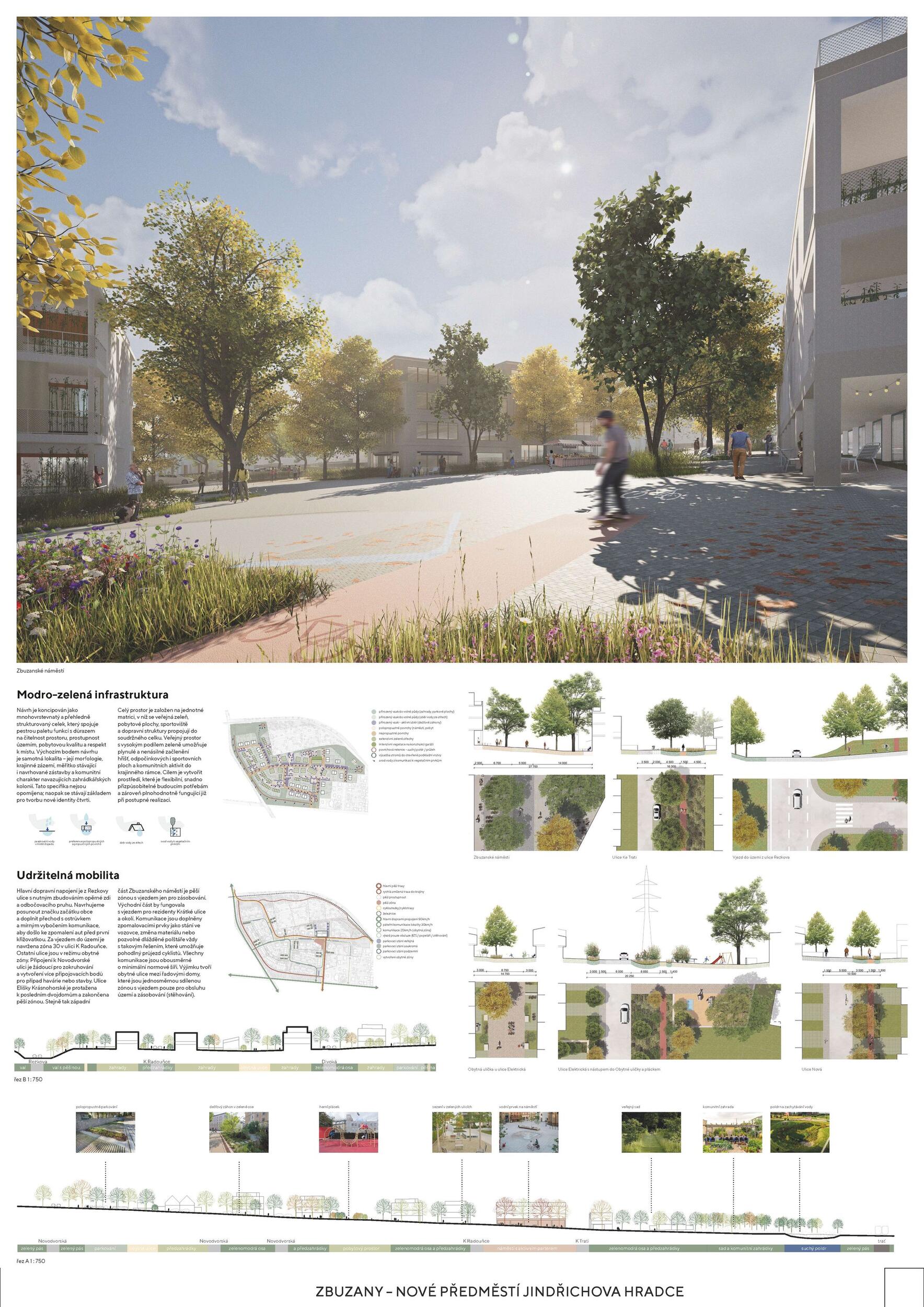 Three green axes converge at Zbuzany Square, connecting the existing residential district, the center, the train station, and the surrounding landscape. A calm and safe residential neighborhood with a diverse typology of houses, high-quality public spaces, and semi-public courtyards becomes an ideal place for a varied mix of residents. The decision not to relocate the utility lines unlocked the possibility of a higher-quality solution as well as simple phasing. The district makes use of green areas along the railway, serves as a recreational gateway into the landscape for the inhabitants of Jindřichův Hradec, and demonstrates that the periphery can indeed be truly beneficial.