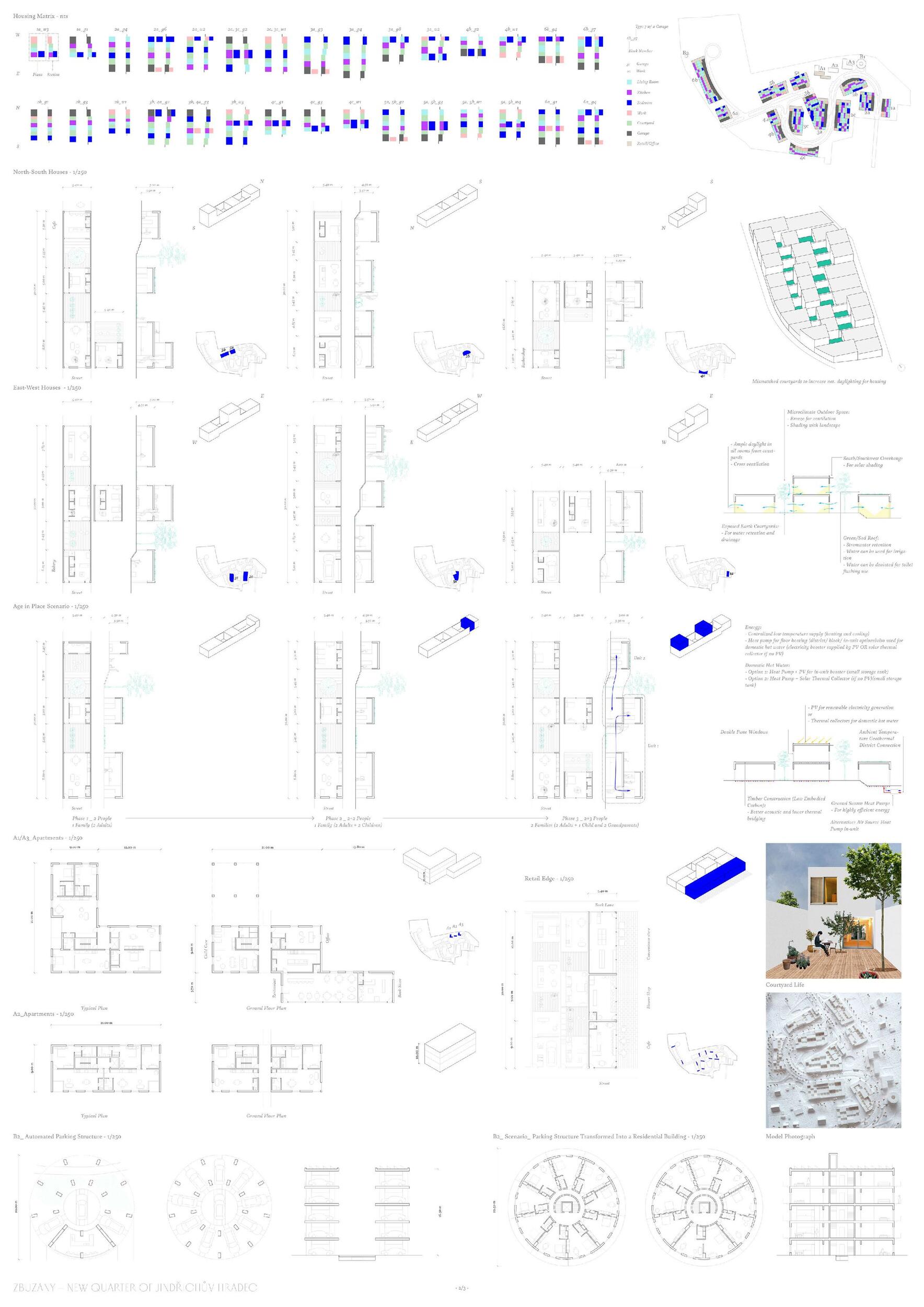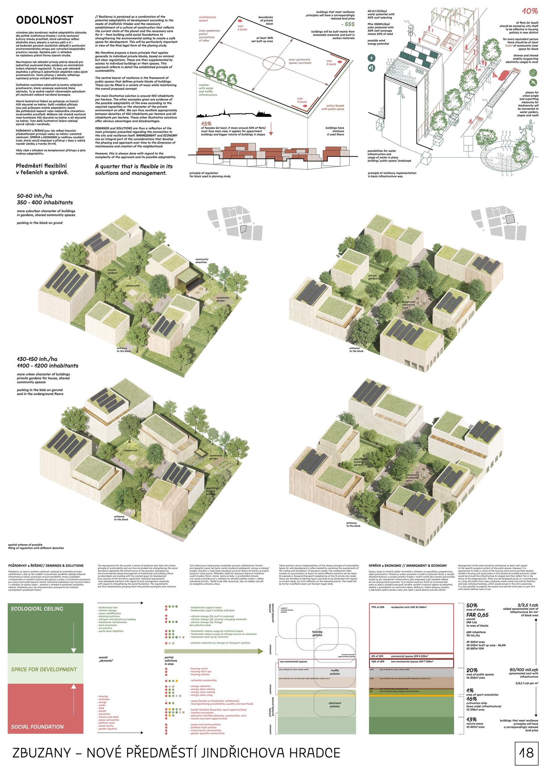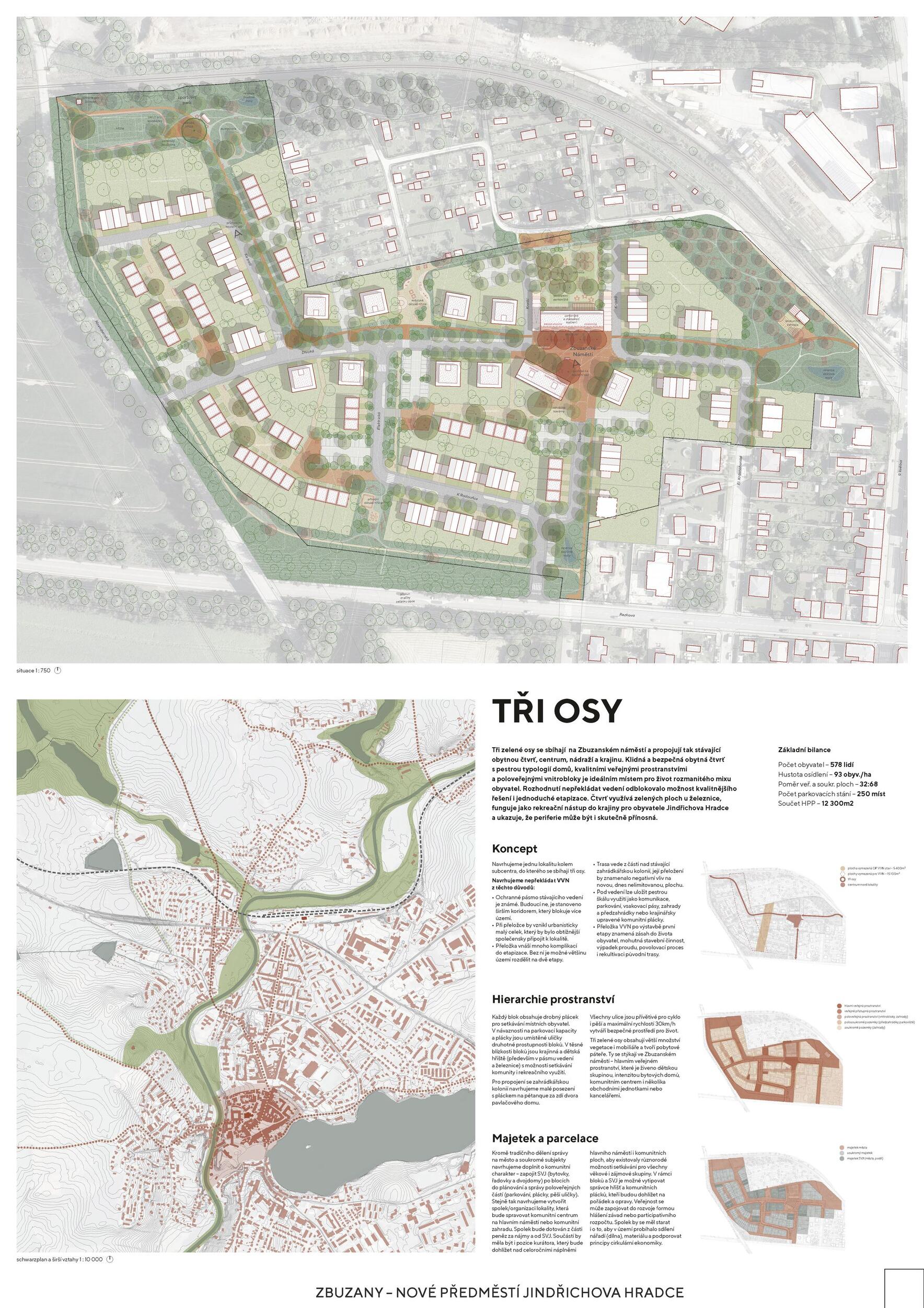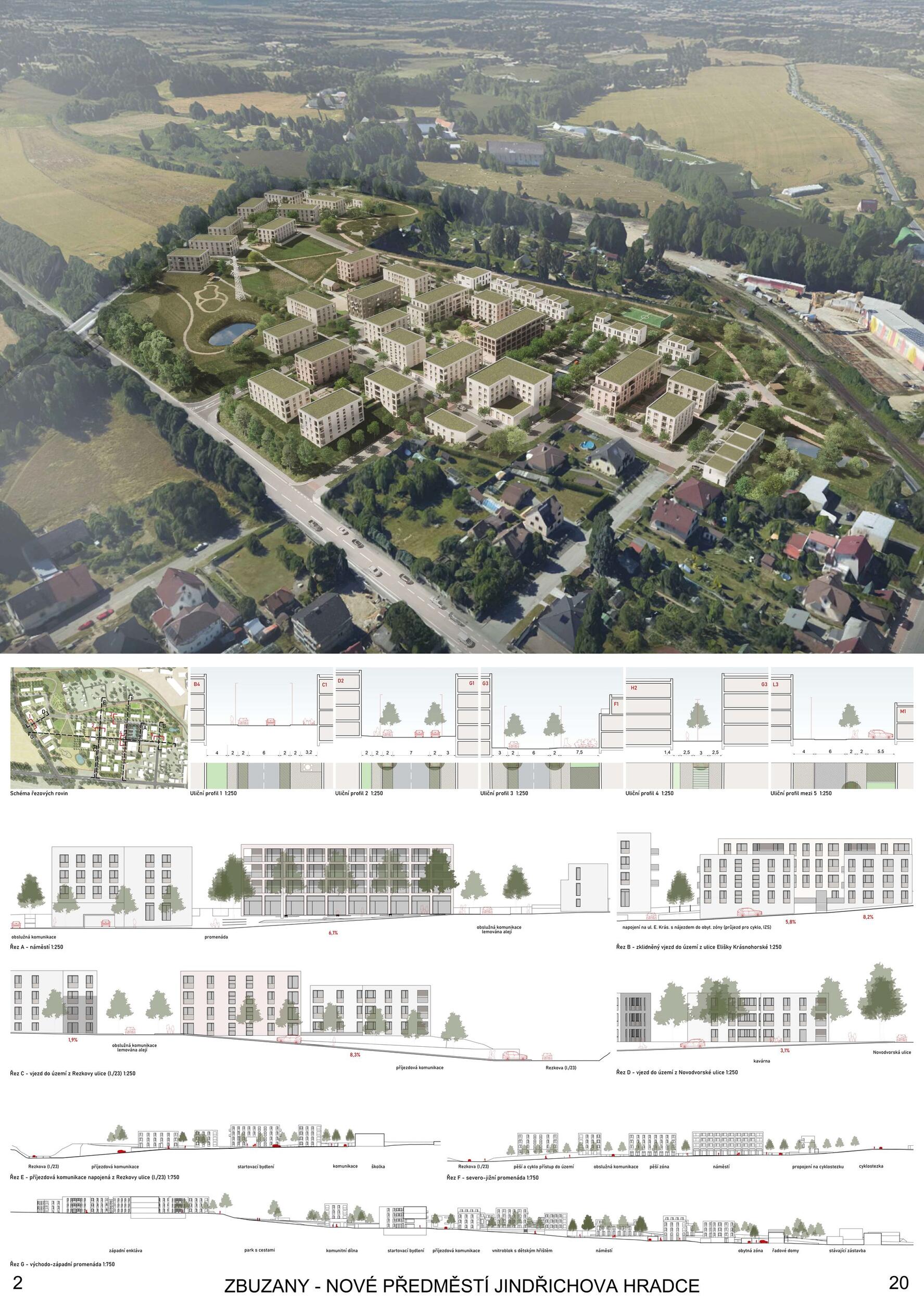 Three green axes converge at Zbuzany Square, connecting the existing residential district, the center, the train station, and the surrounding landscape. A calm and safe residential neighborhood with a diverse typology of houses, high-quality public spaces, and semi-public courtyards becomes an ideal place for a varied mix of residents. The decision not to relocate the utility lines unlocked the possibility of a higher-quality solution as well as simple phasing. The district makes use of green areas along the railway, serves as a recreational gateway into the landscape for the inhabitants of Jindřichův Hradec, and demonstrates that the periphery can indeed be truly beneficial.