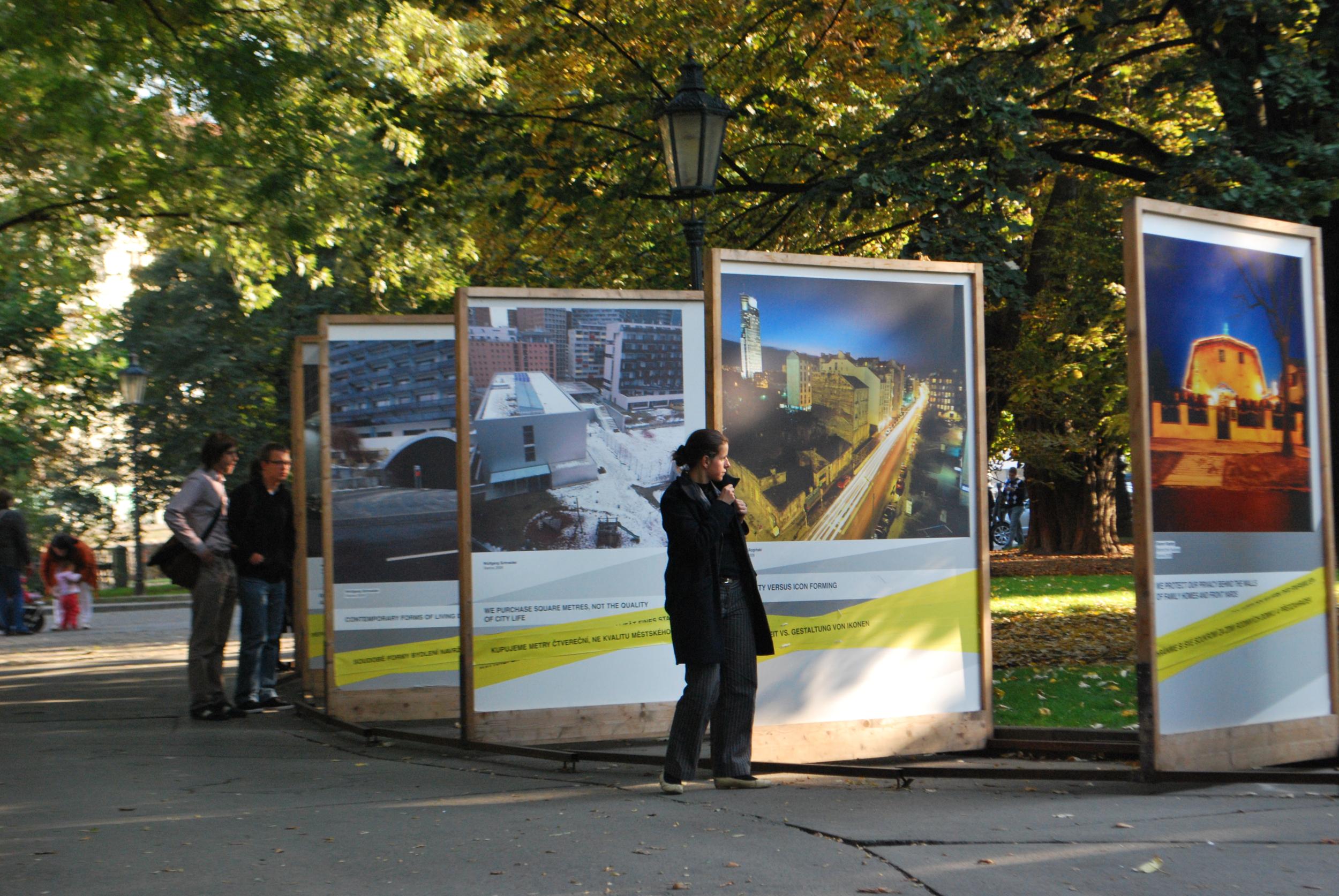 The Prague reprise of the exhibition Urbanity – Twenty Years Later took place on the occasion of the Forum 2000 conference in Prague under the auspices of Václav Havel. The Forum 2000 Foundation strives to identify key problems facing our civilization. This year's event was subtitled, The world we want to live in, and the main theme was architecture and urbanism. The exhibition of largely-formated photographs was presented in a public space on the island of Žofín in Prague with the aim of reaching the widest possible group of city residents and visitors to the Forum 2000 conference. Similarly to the case of the Berlin exhibition, it provided them with stimuli for a deeper reflection on the environment in which we live