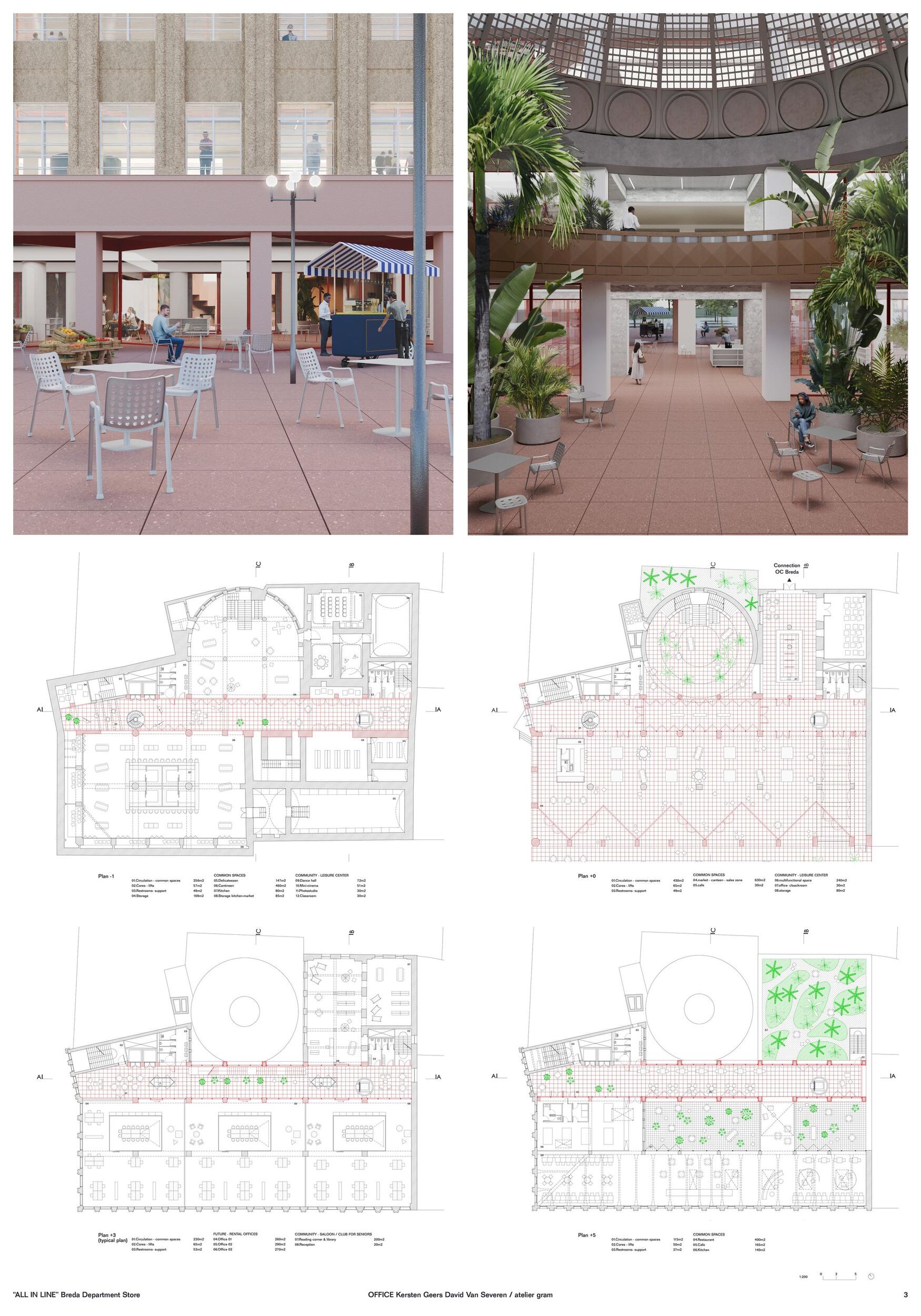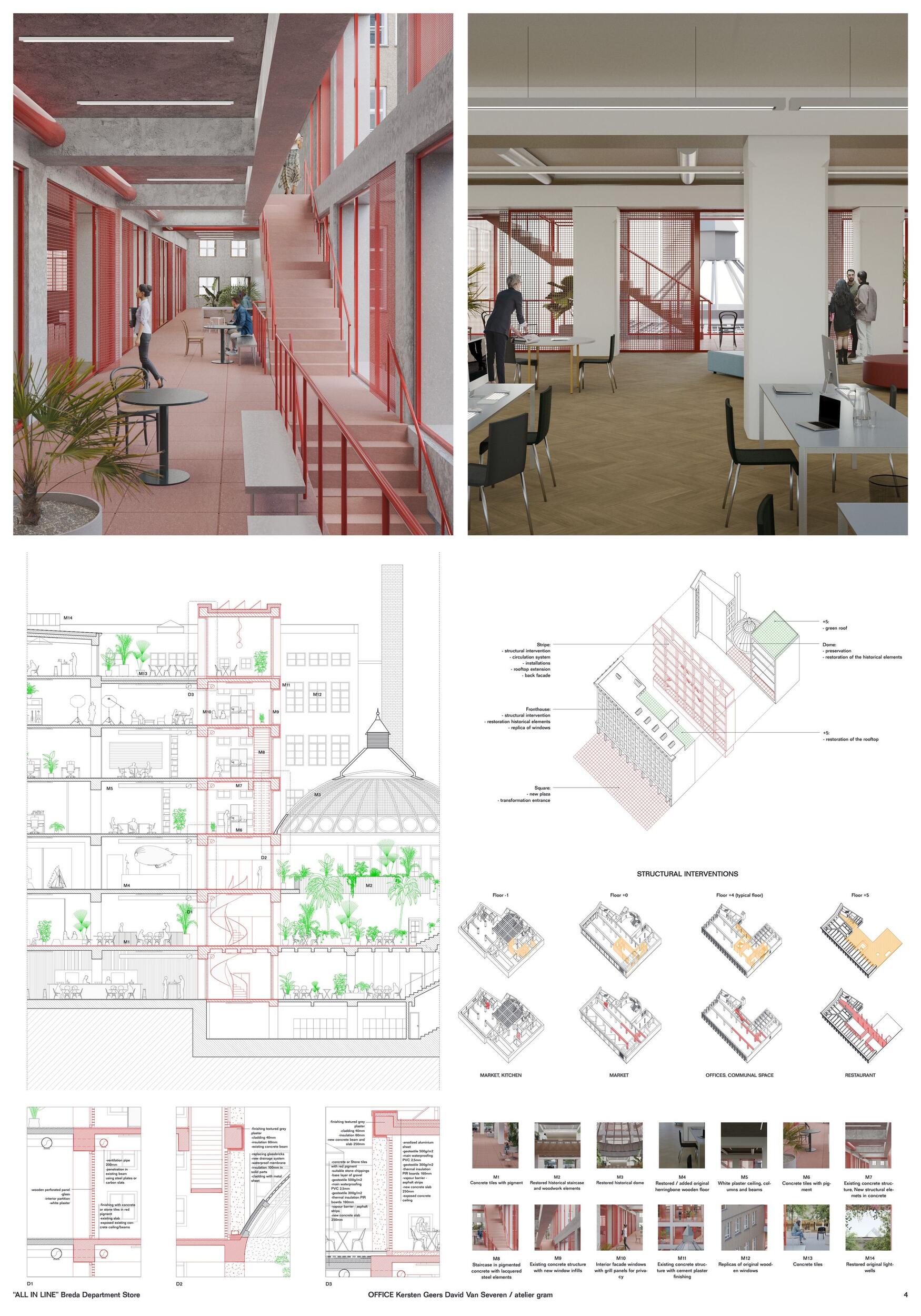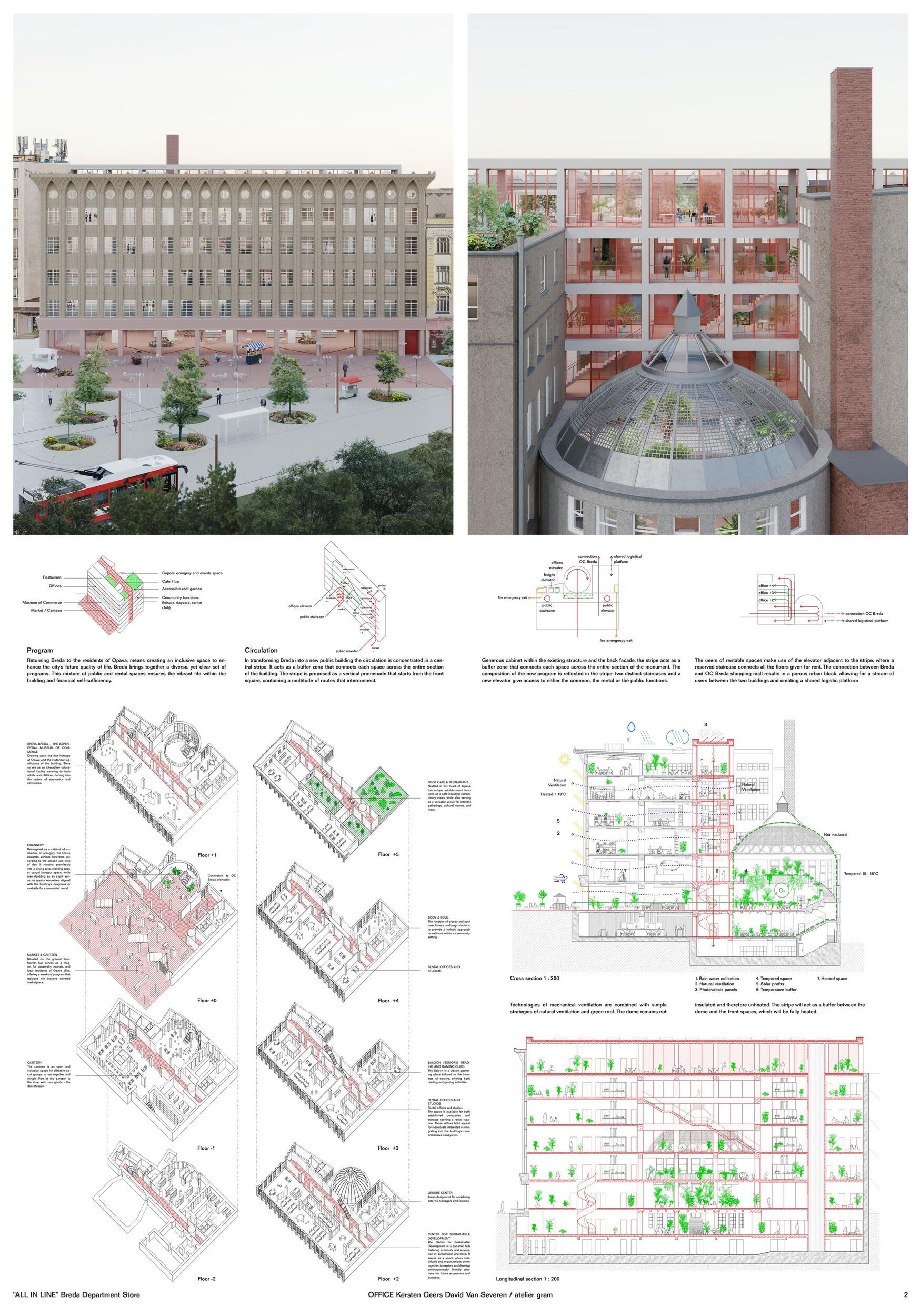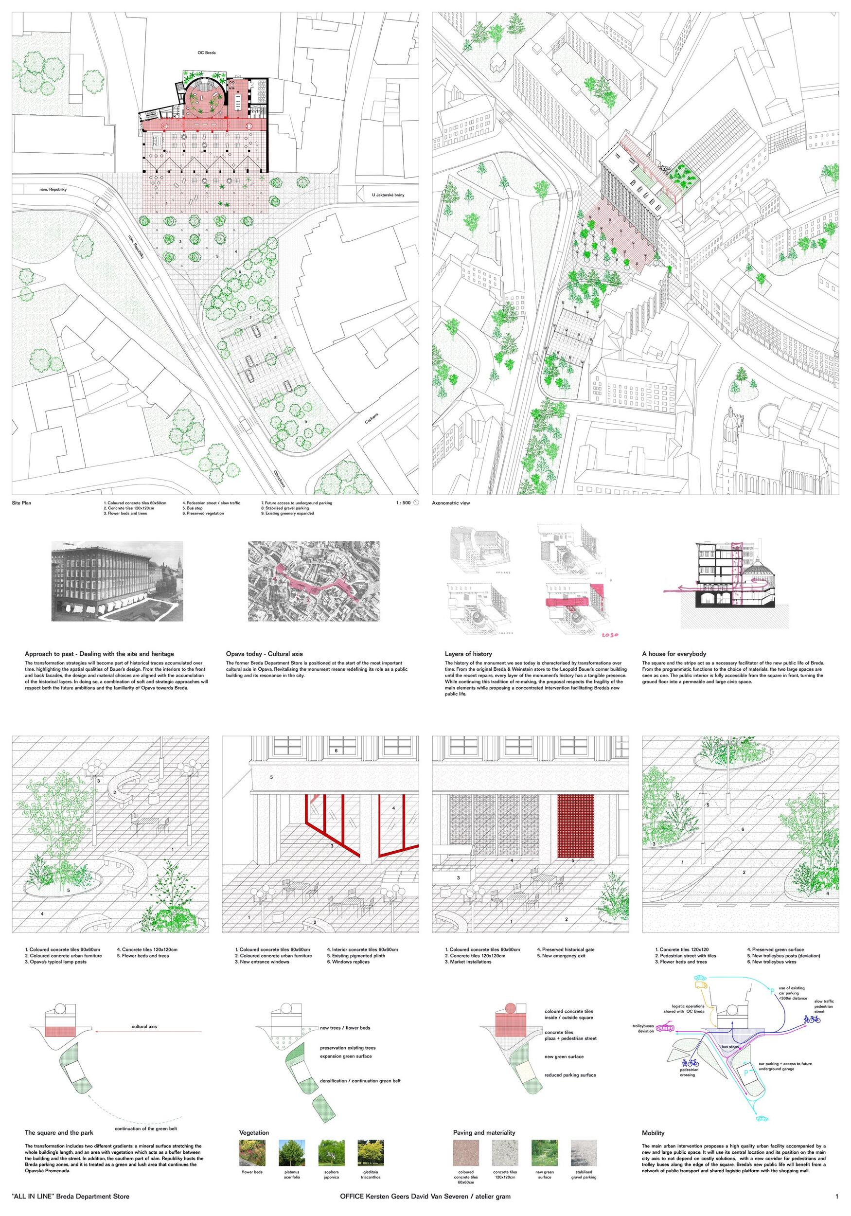 Opava today - Cultural axis. The former Breda Department Store is positioned at the start of the most important cultural axis in Opava. Revitalising the monument means redefining its role as a public building and its resonance in the city. Layers of history. The history of the monument we see today is characterized by transformations over time. From the original Breda & Weinstein store to the Leopold Bauer’s corner building until the recent repairs, every layer of the monument’s history has a tangible presence. While continuing this tradition of re-making, the proposal respects the fragility of the main elements while proposing a concentrated intervention facilitating Breda’s new public life.