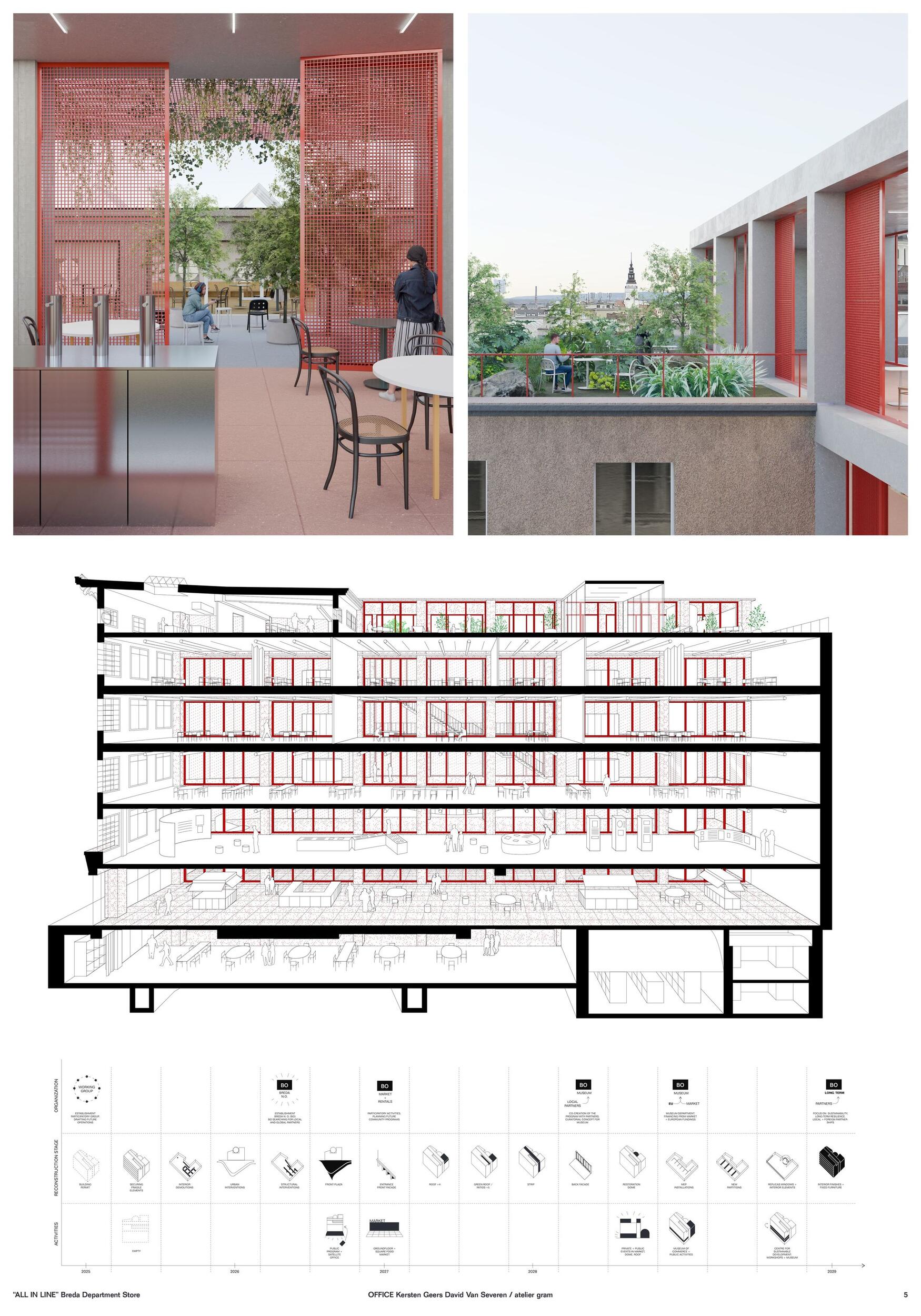 Approach to past - Dealing with the site and heritage. The transformation strategies will become part of historical traces accumulated over time, highlighting the spatial qualities of Bauer’s design. From the interiors to the front and back facades, the design and material choices are aligned with the accumulation of the historical layers. In doing so, a combination of soft and strategic approaches will respect both the future ambitions and the familiarity of Opava towards Breda.