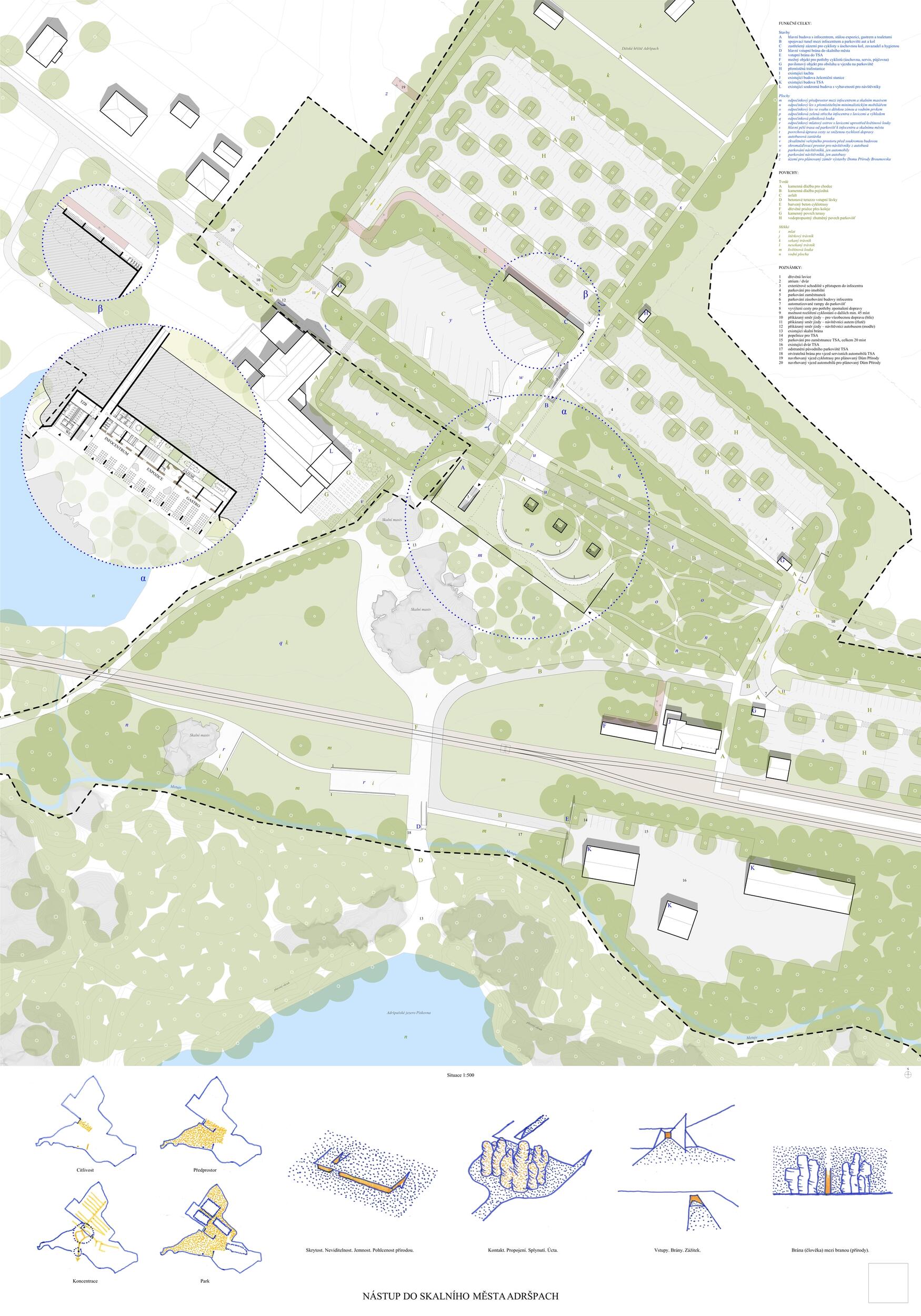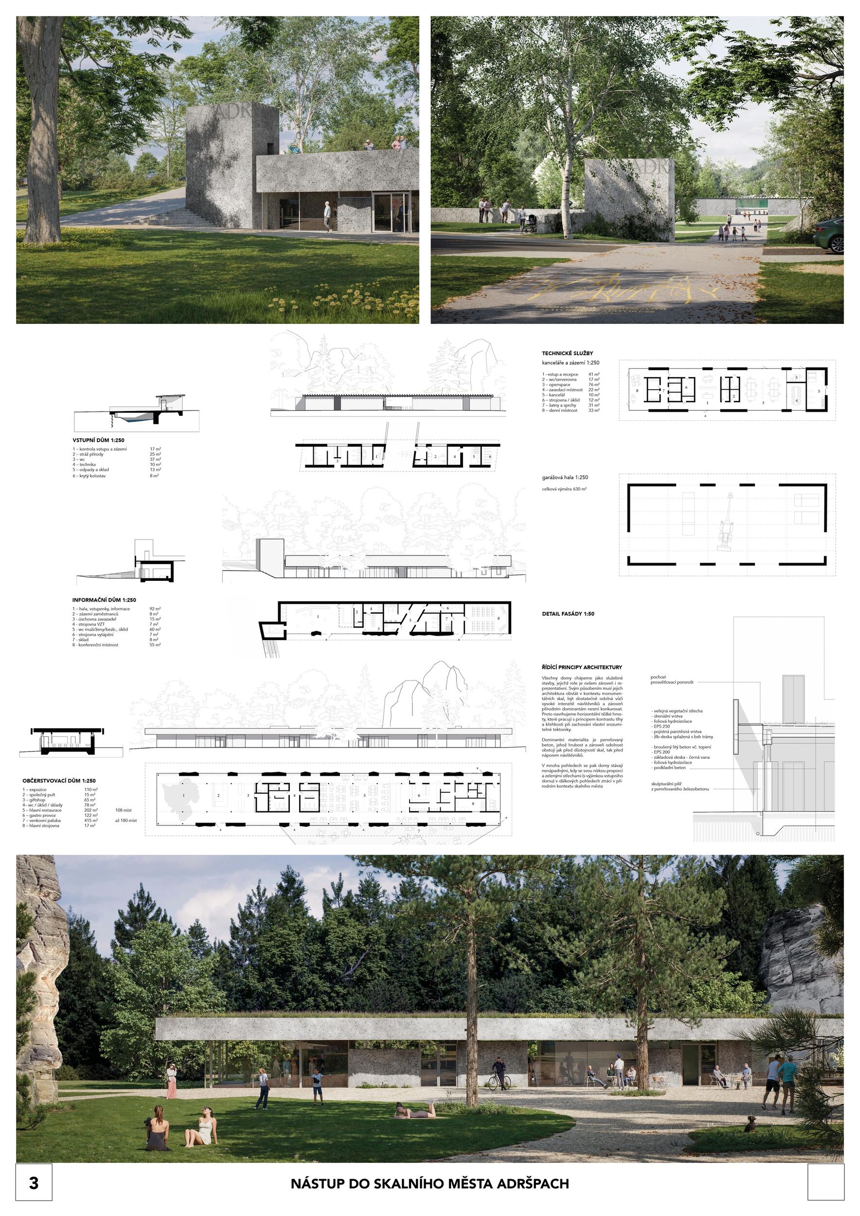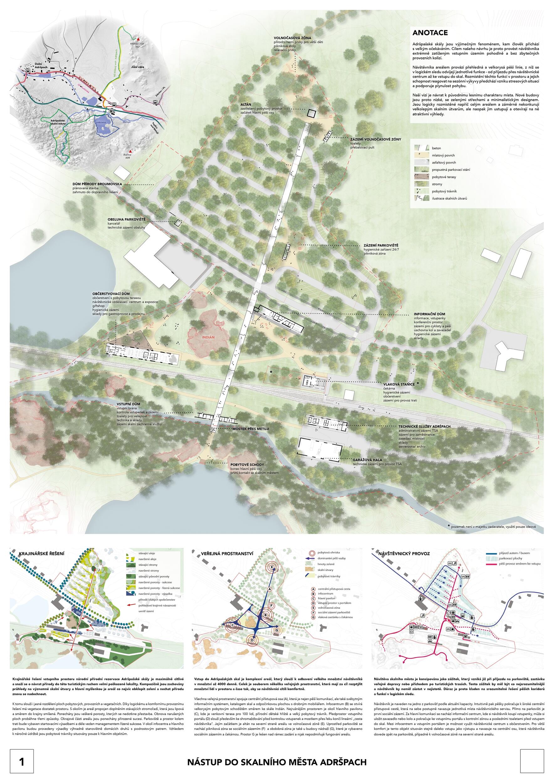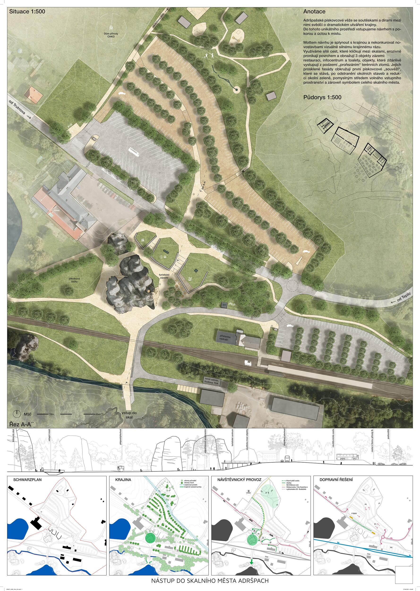 Adršpašské pískovcové věže se soutěskami a průrvami mezi nimi svědčí o dramatickém utváření krajiny. Do tohoto unikátního prostředí vstupujeme návrhem s pokorou a obdivem k místu. Mottem návrhu je splynout s krajinou a nekonkurovat novostavbami vizuálně silnému krajinnému rázu. Využíváme sítě cest, které kličkují mezi skalami, erozivně pronikají povrchem a obnažují 3 objekty zázemí - restauraci, infocentrum a prodejnu suvenýrů, objekty, které zdánlivě vystupují z podzemí „prořezáním“ terénních zlomů. Jejich prosklené fasády obkružují první pískovcové „souvěží“, které se stává, po odstranění okolních staveb a redukci okolní zeleně, pomyslným středem volného vstupního prostranství a zároveň symbolem celého skalního města.