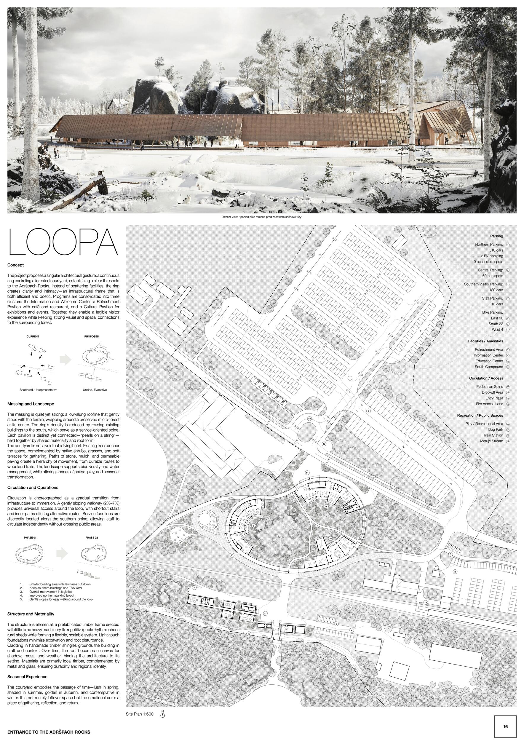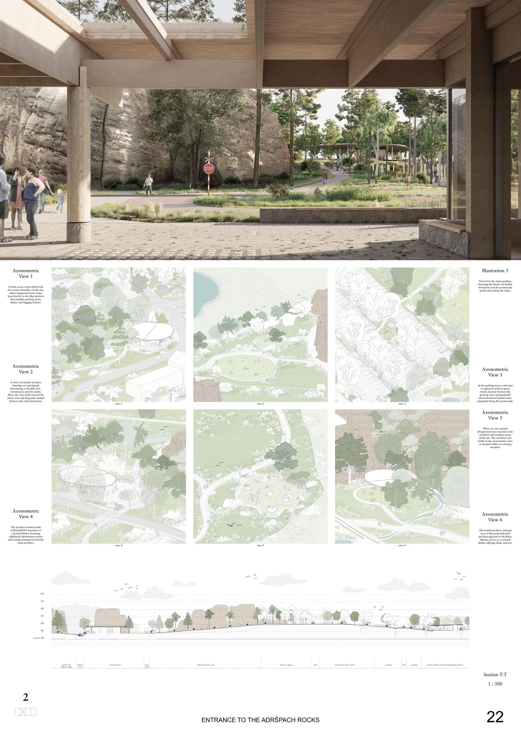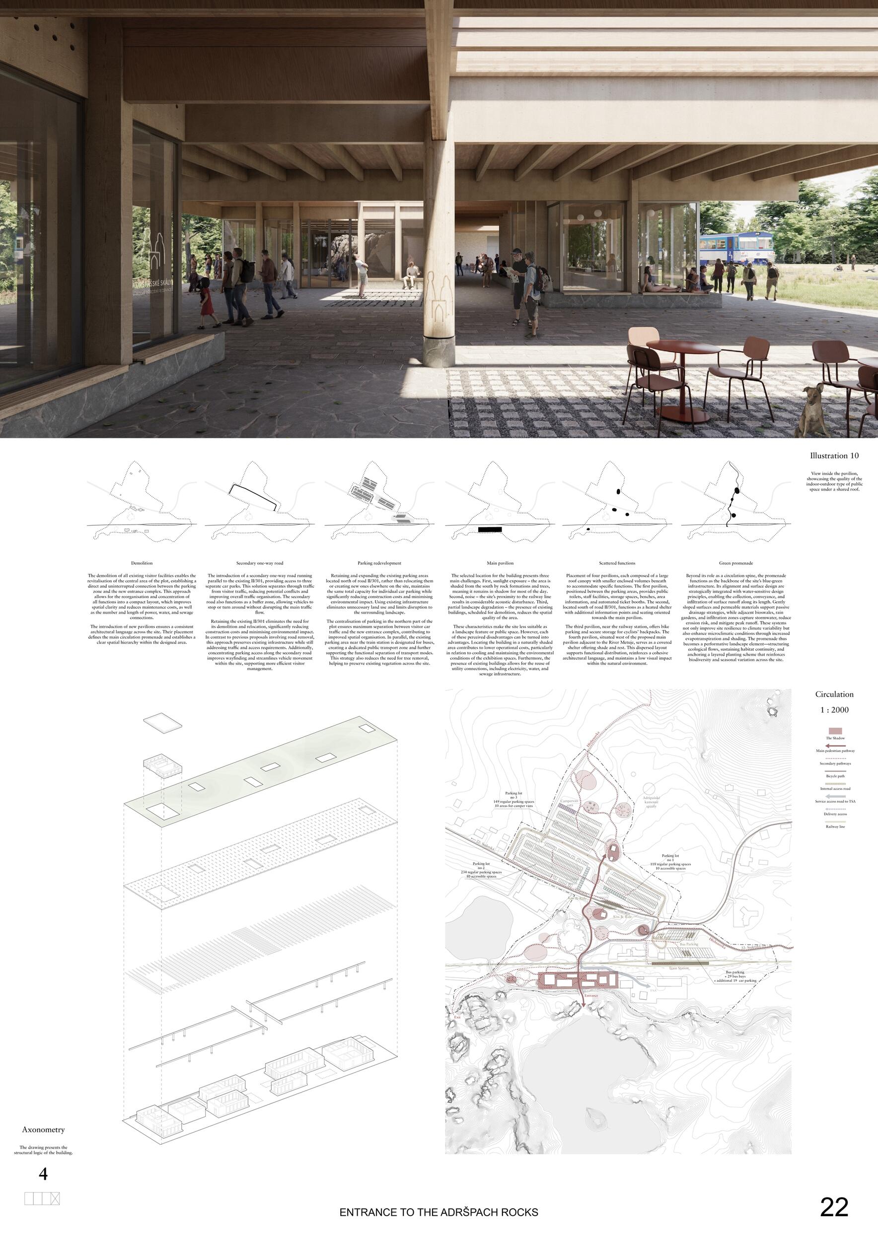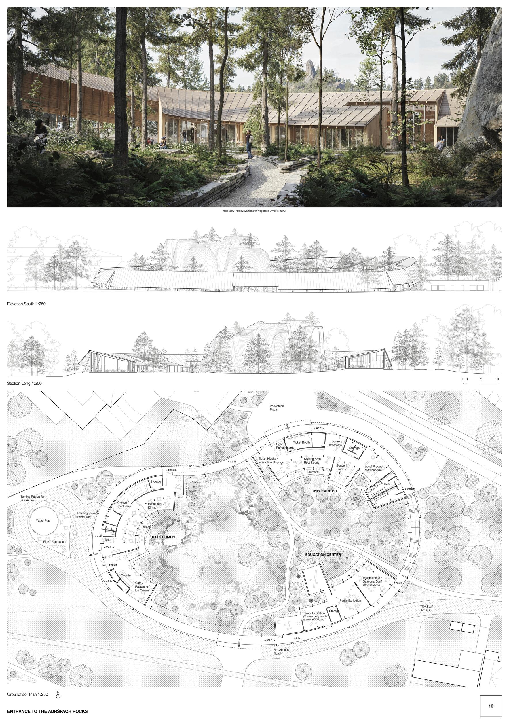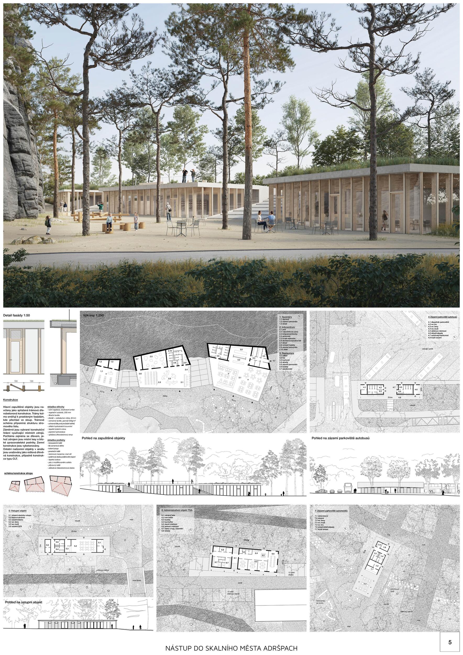 Adršpašské pískovcové věže se soutěskami a průrvami mezi nimi svědčí o dramatickém utváření krajiny. Do tohoto unikátního prostředí vstupujeme návrhem s pokorou a obdivem k místu. Mottem návrhu je splynout s krajinou a nekonkurovat novostavbami vizuálně silnému krajinnému rázu. Využíváme sítě cest, které kličkují mezi skalami, erozivně pronikají povrchem a obnažují 3 objekty zázemí - restauraci, infocentrum a prodejnu suvenýrů, objekty, které zdánlivě vystupují z podzemí „prořezáním“ terénních zlomů. Jejich prosklené fasády obkružují první pískovcové „souvěží“, které se stává, po odstranění okolních staveb a redukci okolní zeleně, pomyslným středem volného vstupního prostranství a zároveň symbolem celého skalního města.
