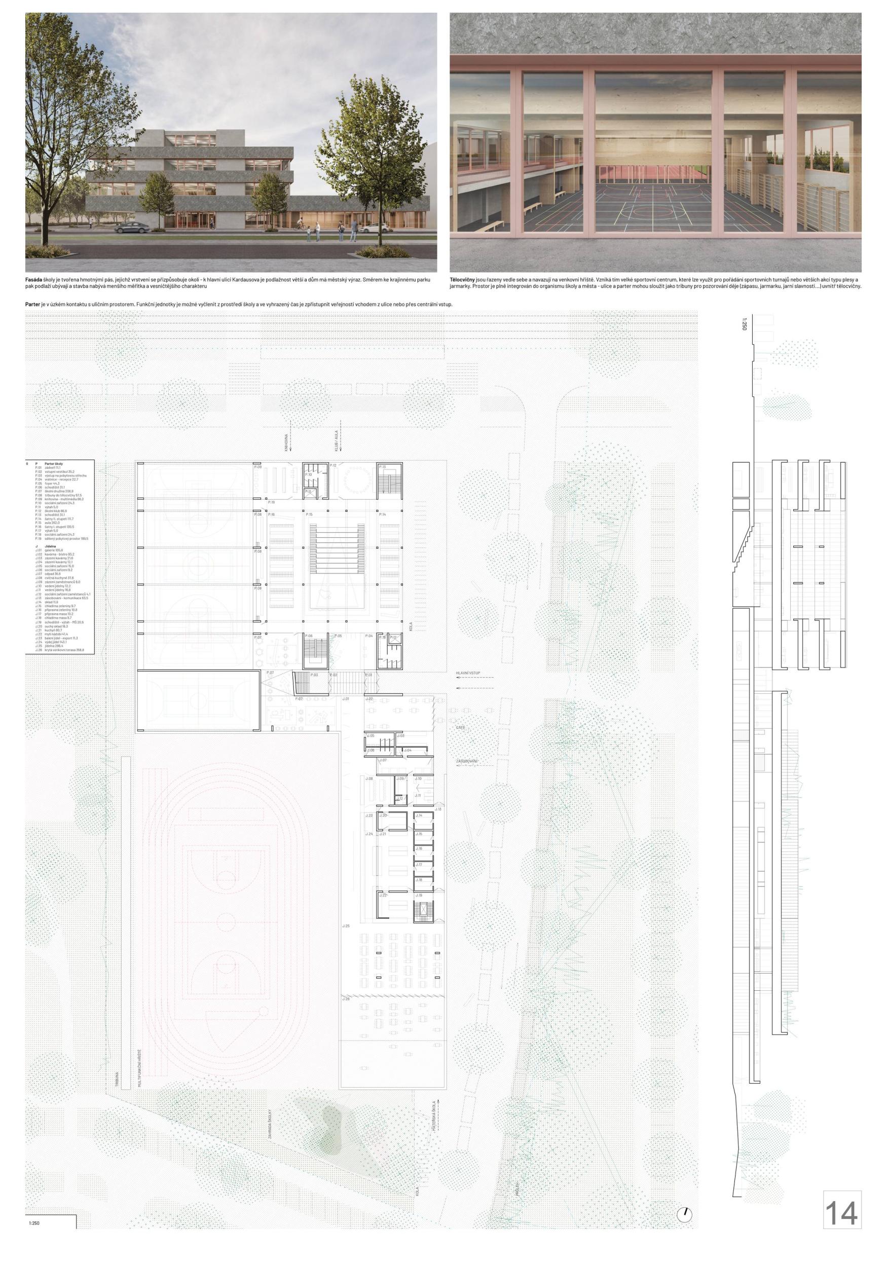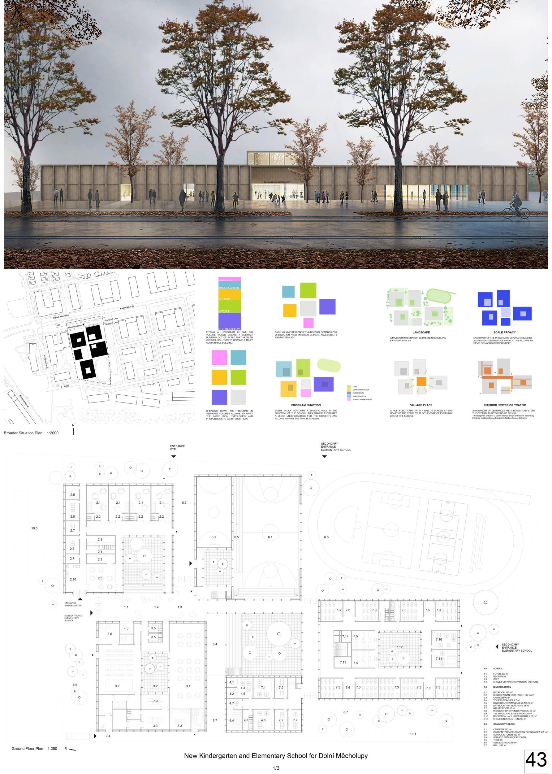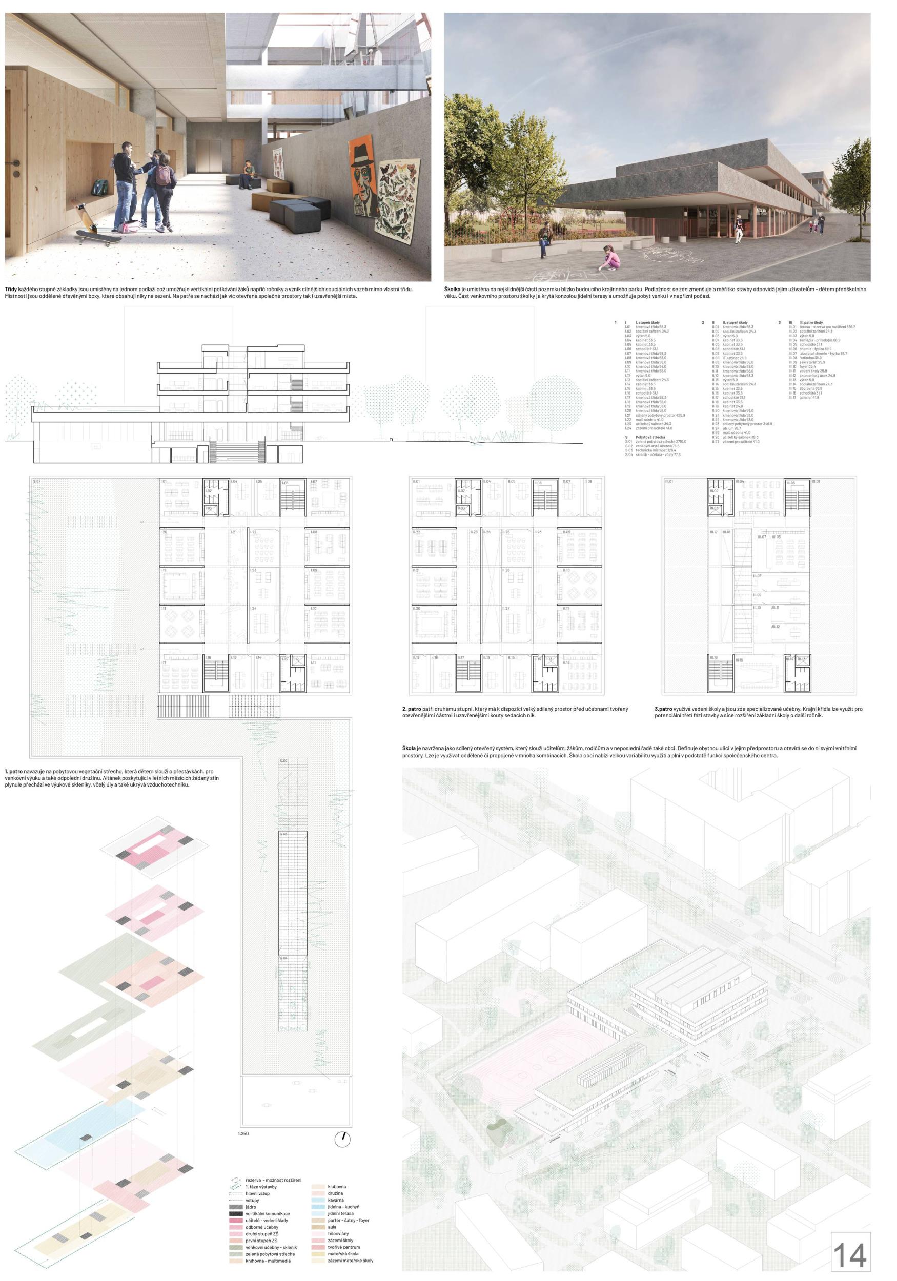 Autoři: Václav Matějka, Eva Šarochová // „Čtyřlístek staveb se společným srdcem“ Návrh areálu vychází z myšlenky 1 základního modulu a postupného připojení dalších budov různých funkcí. Rozvržení je dle návazností na uliční parter či přírodu. Základna uprostřed zajišťuje společné zázemí a vstupy. Jednotlivé hmoty definují hranice a chrání život uvnitř. Minimalistické fasády vstupují v dialog s okolní zástavbou. Zastavěnou plochu nahrazují střešní terasy, které mohou sloužit i pro rozšíření školy. Koncept umožňuje libovolnou etapizaci.