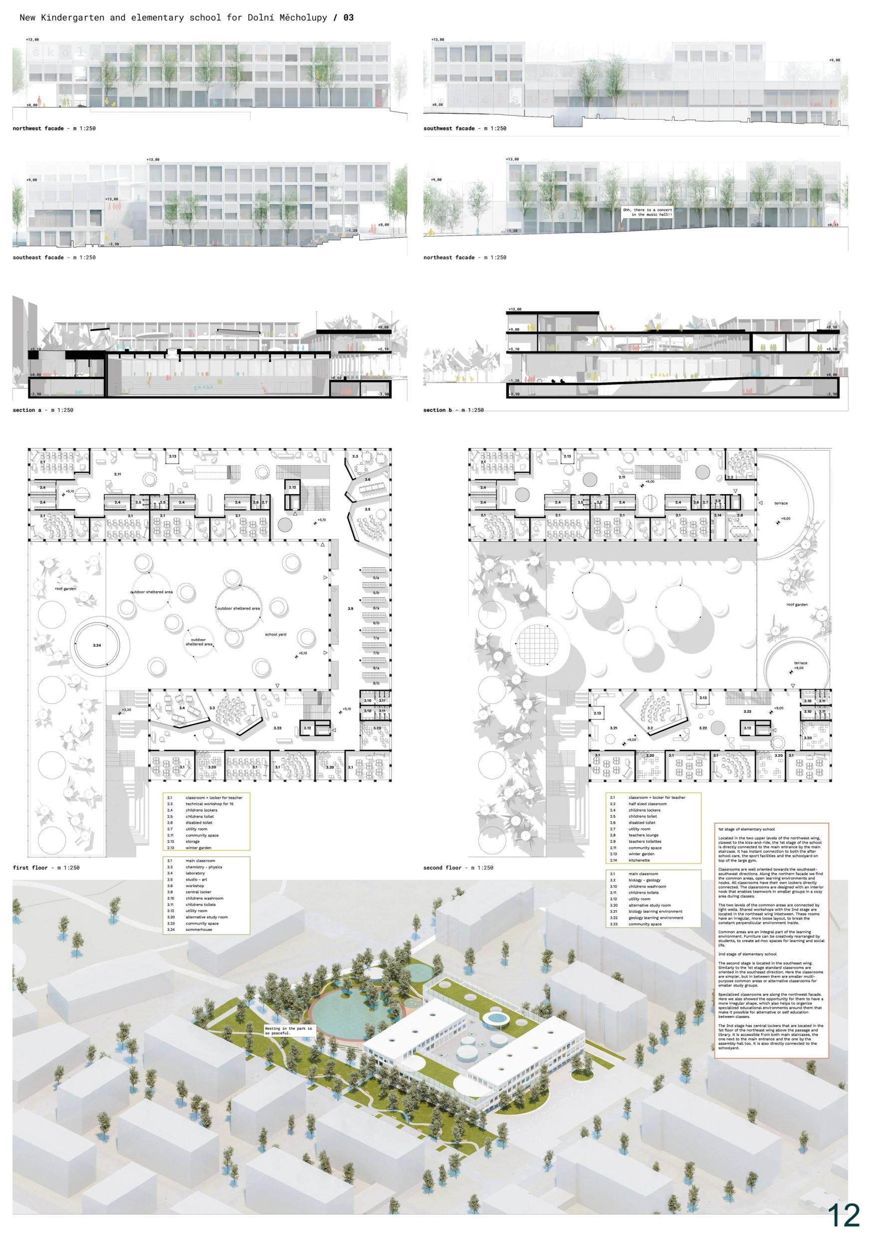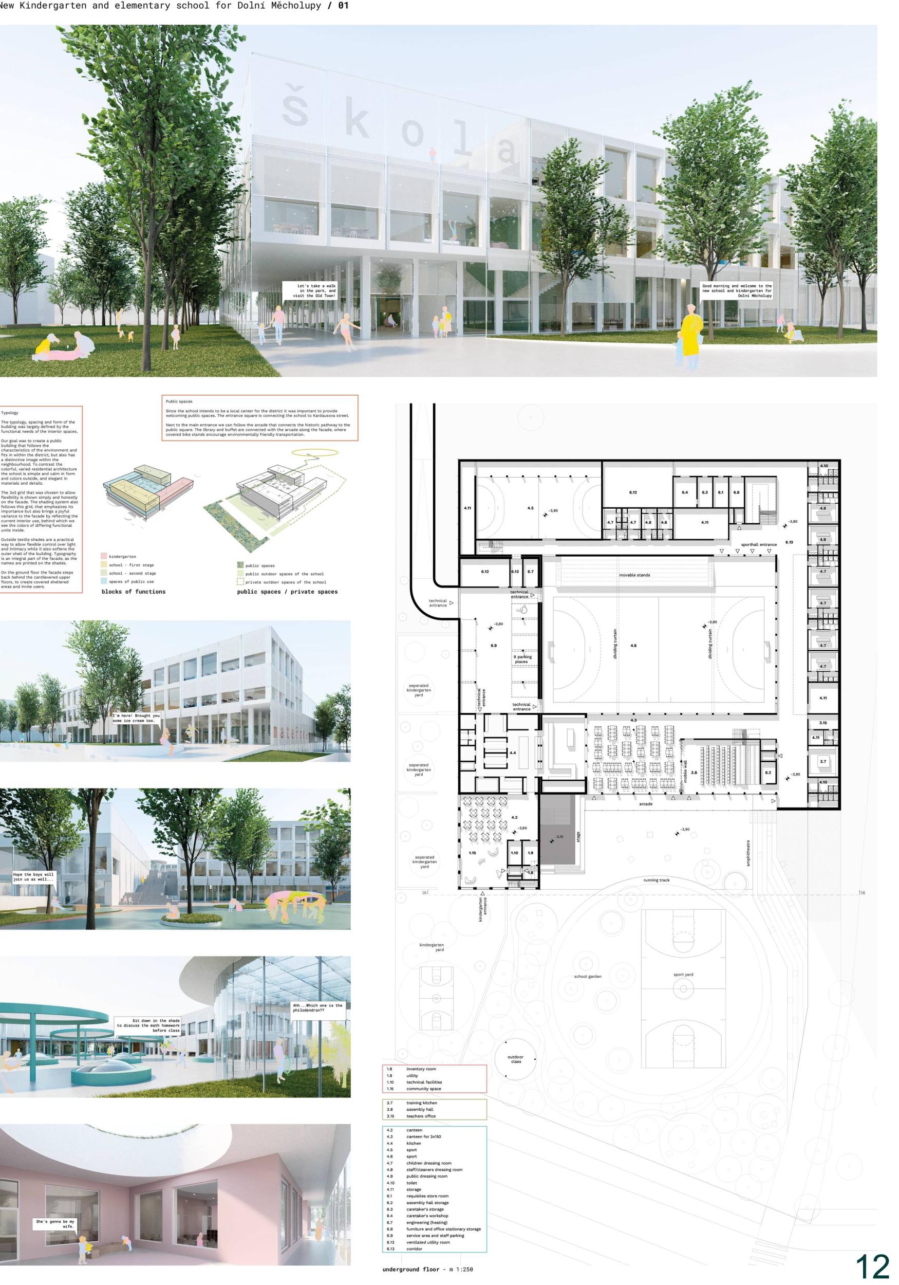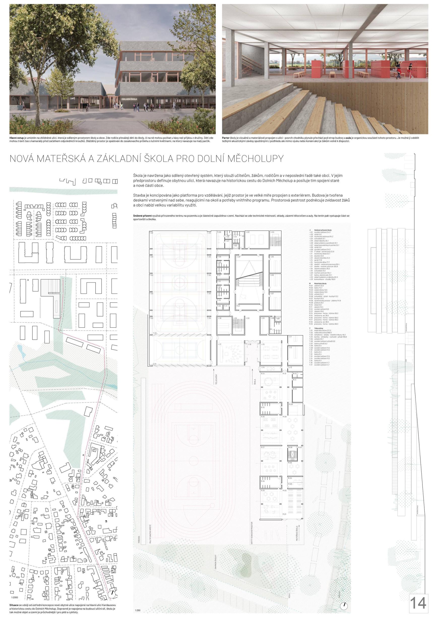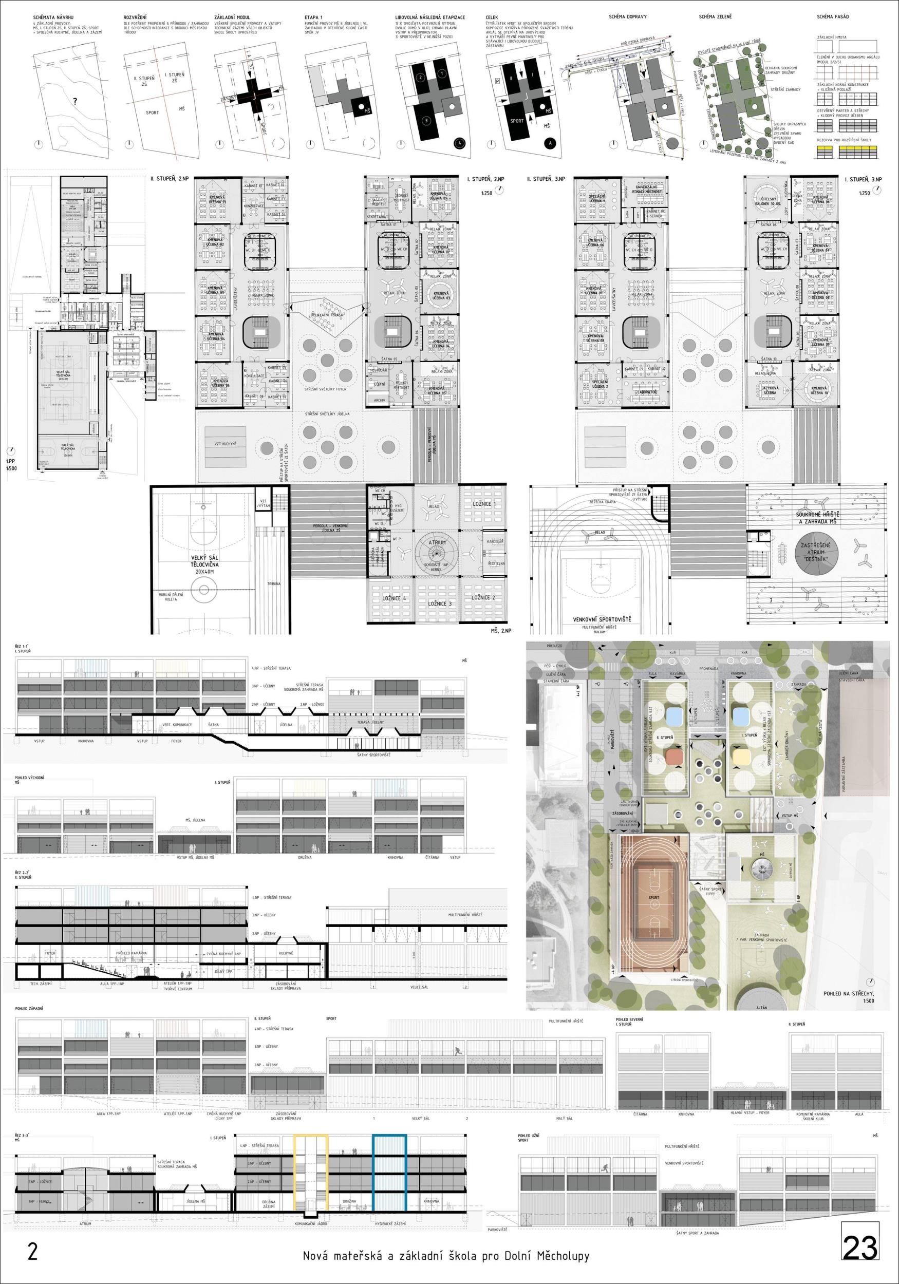 Autoři: Václav Matějka, Eva Šarochová // „Čtyřlístek staveb se společným srdcem“ Návrh areálu vychází z myšlenky 1 základního modulu a postupného připojení dalších budov různých funkcí. Rozvržení je dle návazností na uliční parter či přírodu. Základna uprostřed zajišťuje společné zázemí a vstupy. Jednotlivé hmoty definují hranice a chrání život uvnitř. Minimalistické fasády vstupují v dialog s okolní zástavbou. Zastavěnou plochu nahrazují střešní terasy, které mohou sloužit i pro rozšíření školy. Koncept umožňuje libovolnou etapizaci.