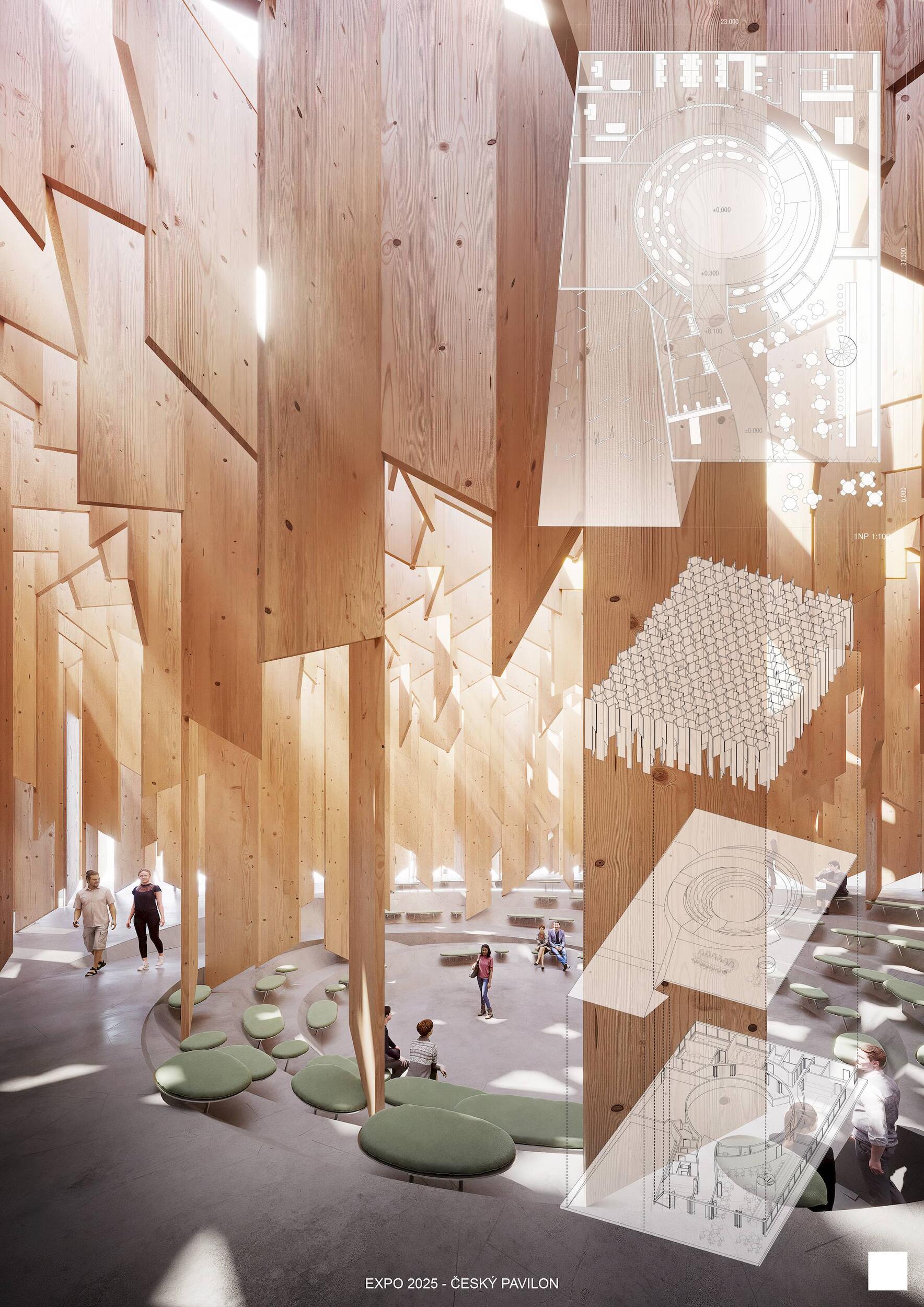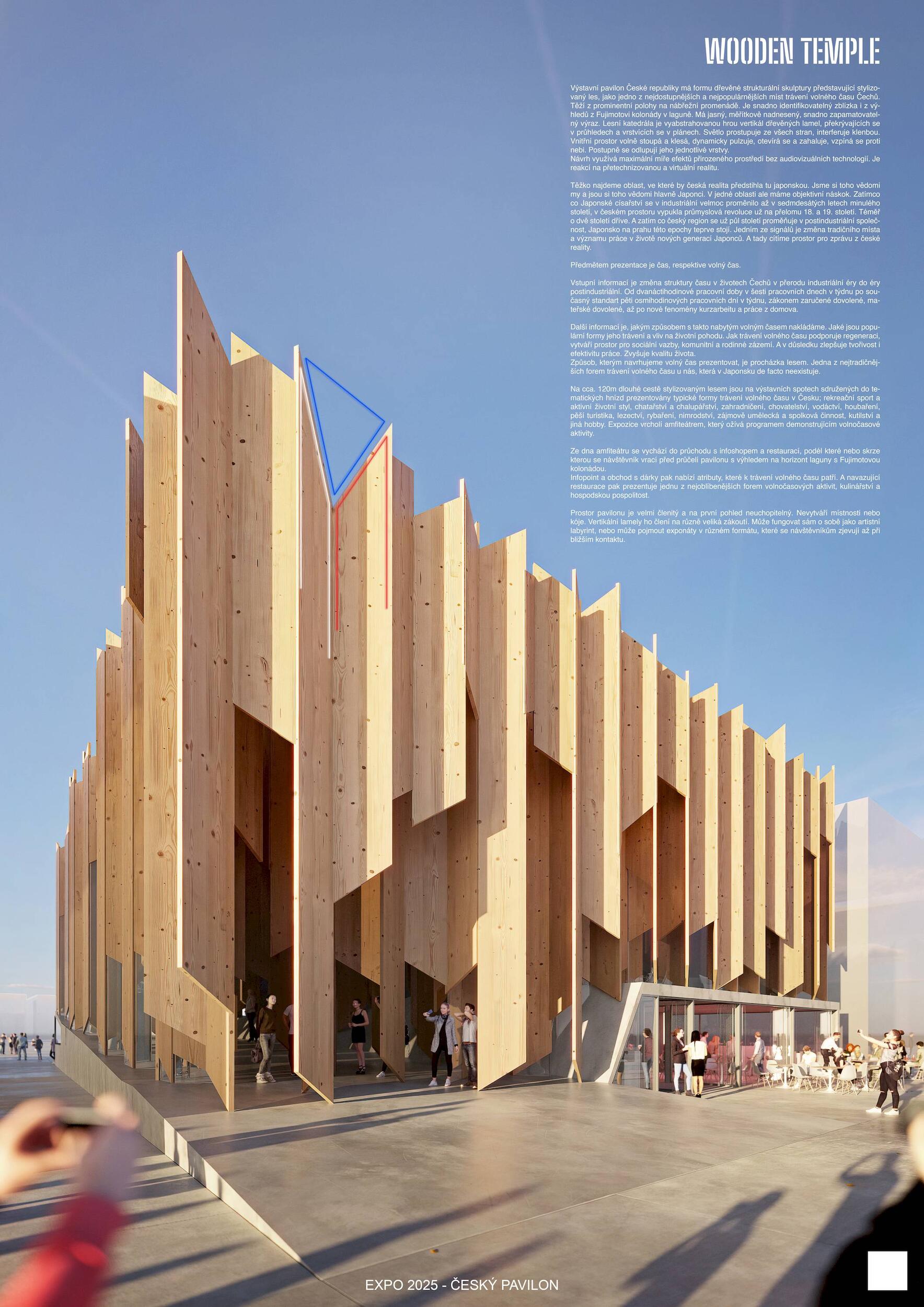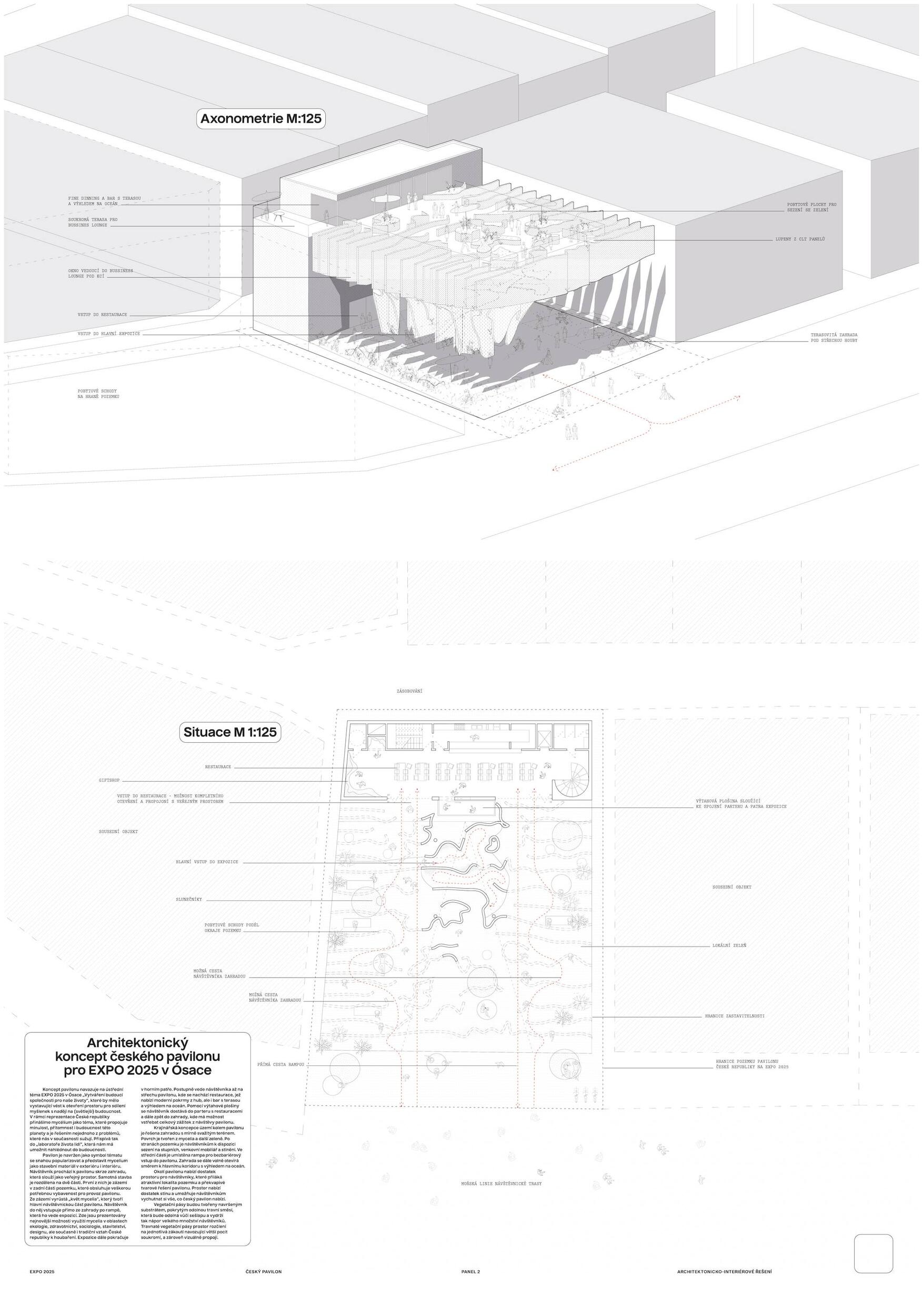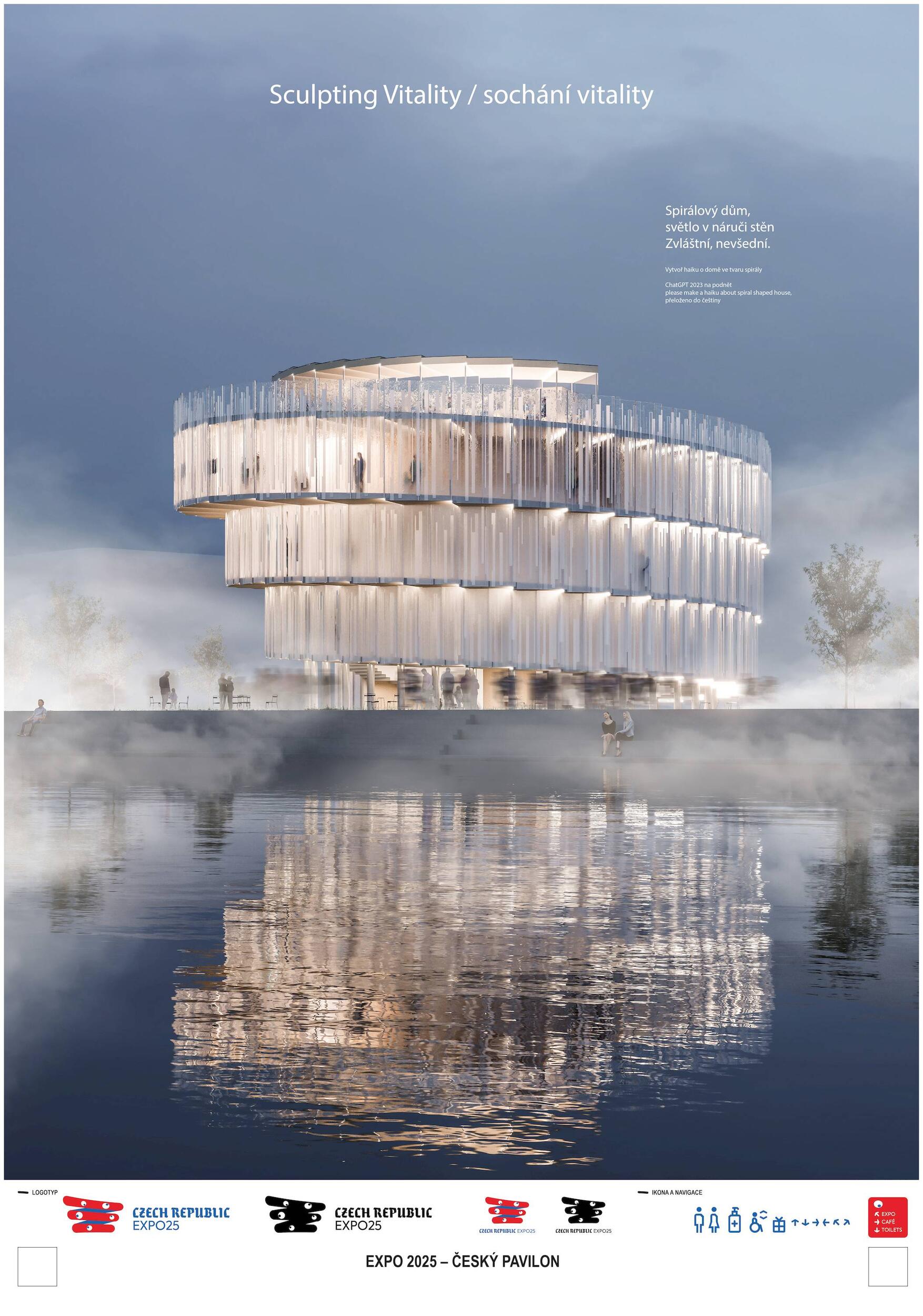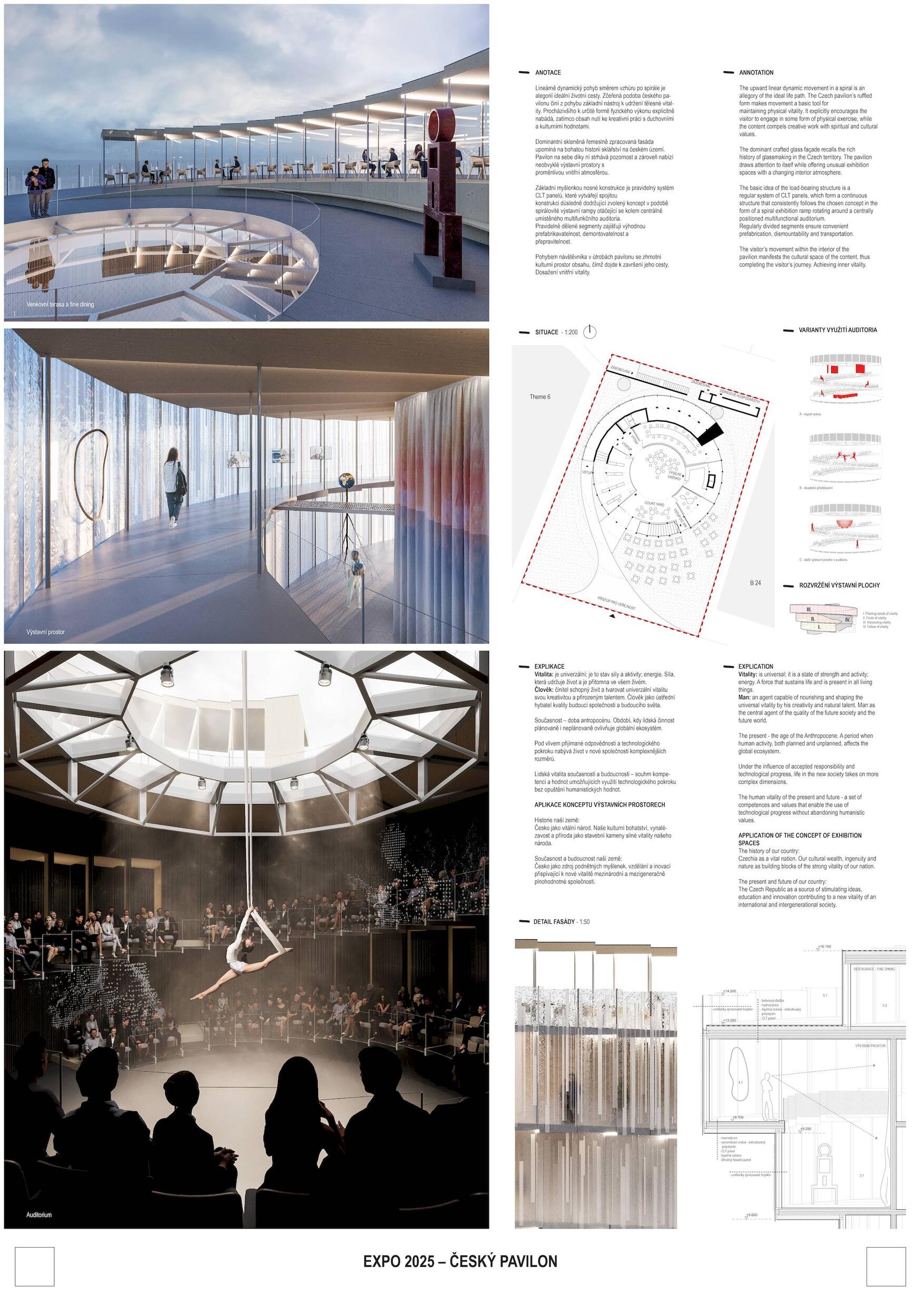 SOCHÁNÍ VITALITY. Lineárně dynamický pohyb směrem vzhůru po spirále jako by byl alegorií ideální a naplněné životní cesty. Bazální a hluboce zakódovaný pud však člověku velí především přežít, což ústí v řadu nekoordinovaných po-hybů často nejasnými směry. Ty se stávají potřebným zdrojem zkušeností k docílení kýžené schopnosti adaptace. Ve stejnou chvíli se v člověku, bytosti společenské, objeví nutkání si svou životní cestu rovněž užít. K neoddiskutovatelně důležité fyzické životaschopnosti se v tu chvíli přidává vrstva vitality nehmatatelné, kulturní a niterné. Zčeřená podoba českého pavilonu činí z pohybu základní nástroj k udržení tělesné vitality. Procházivšího k určité formě fyzického výkonu explicitně nabádá, zatímco obsah nutí ke kreativní práci s duchovními a kulturními hodnotami. Konceptem navržené architektury je teze, jejímž obsahem je prostor formovaný pohybem těla a duše. Pavilon je hmotou vyžadující aktivní zapojení návštěvníka, jehož pohyb expozici zpřítomňuje. Samým pohybem návštěvníka v útrobách pavilonu se zhmotní kulturní prostor obsahu, čímž dojde k završení jeho cesty. Dosažení vnitřní vitality.