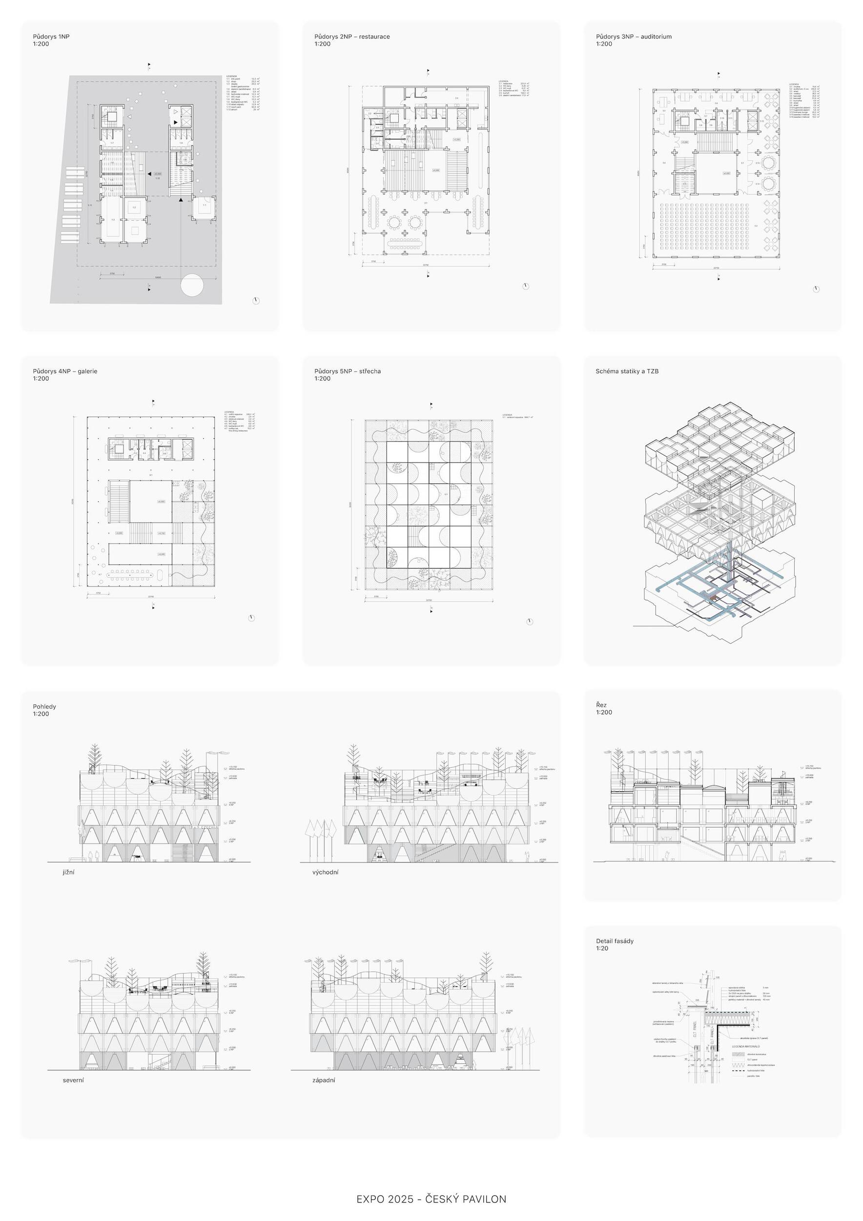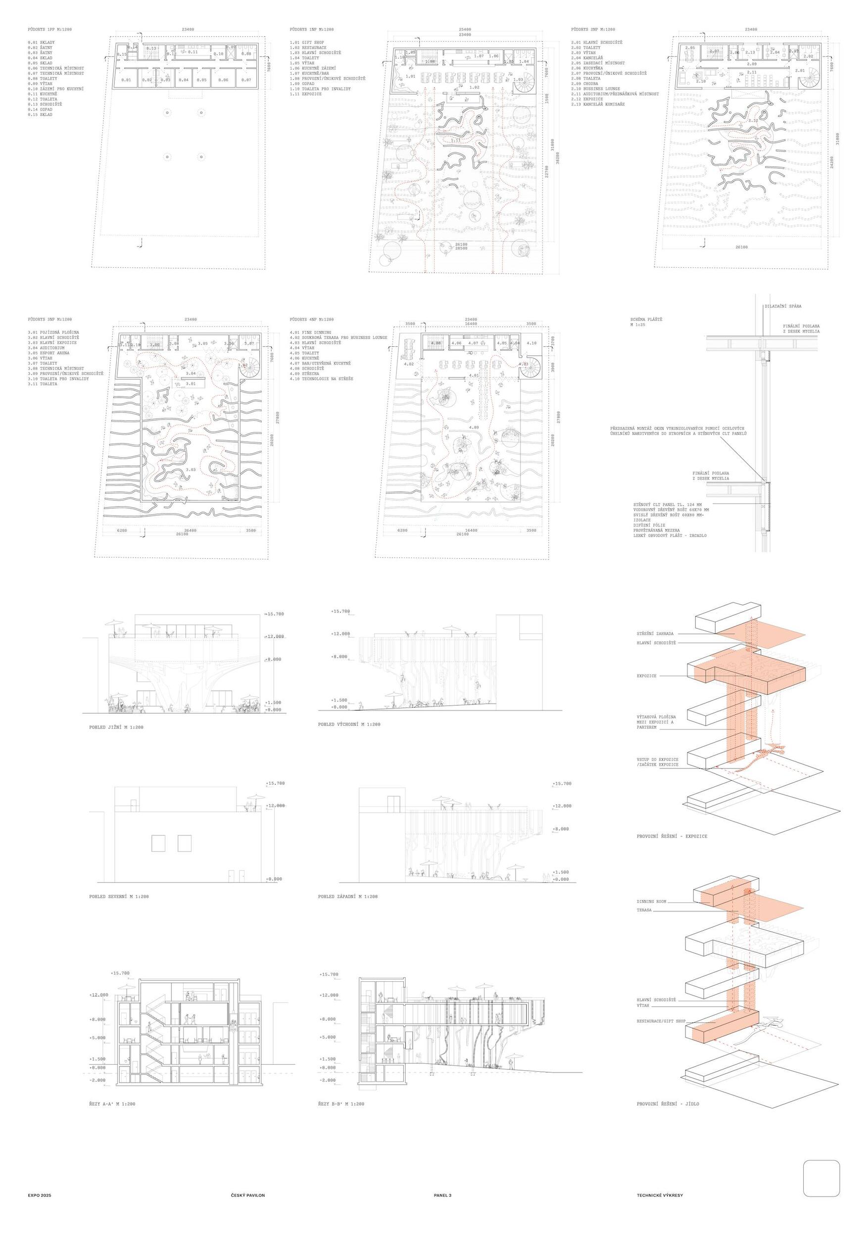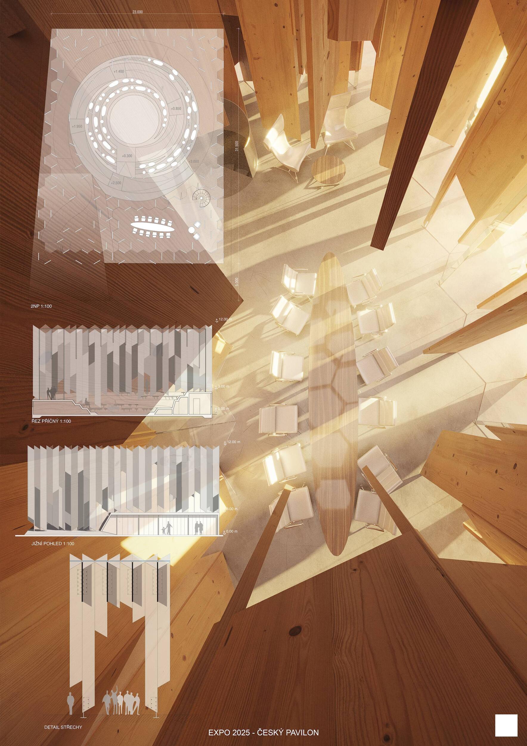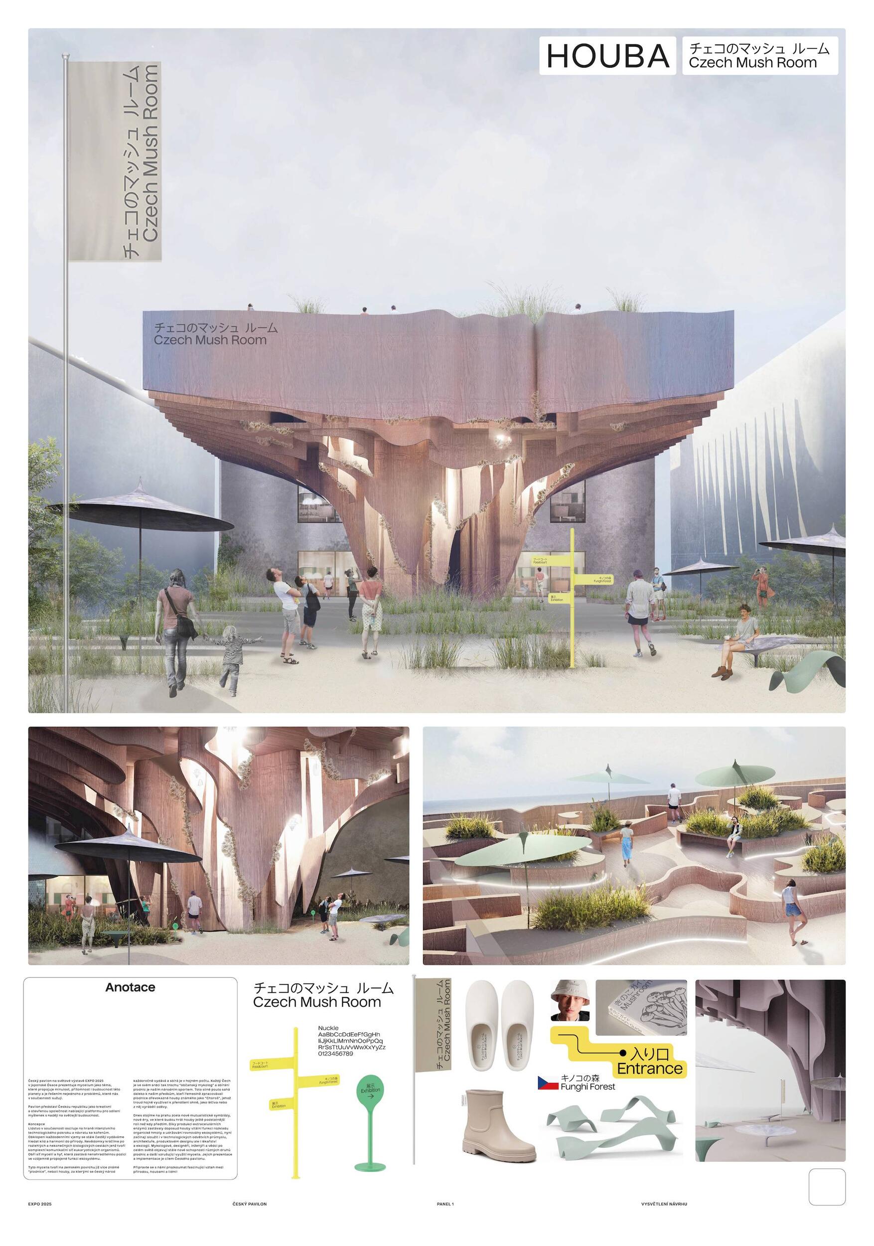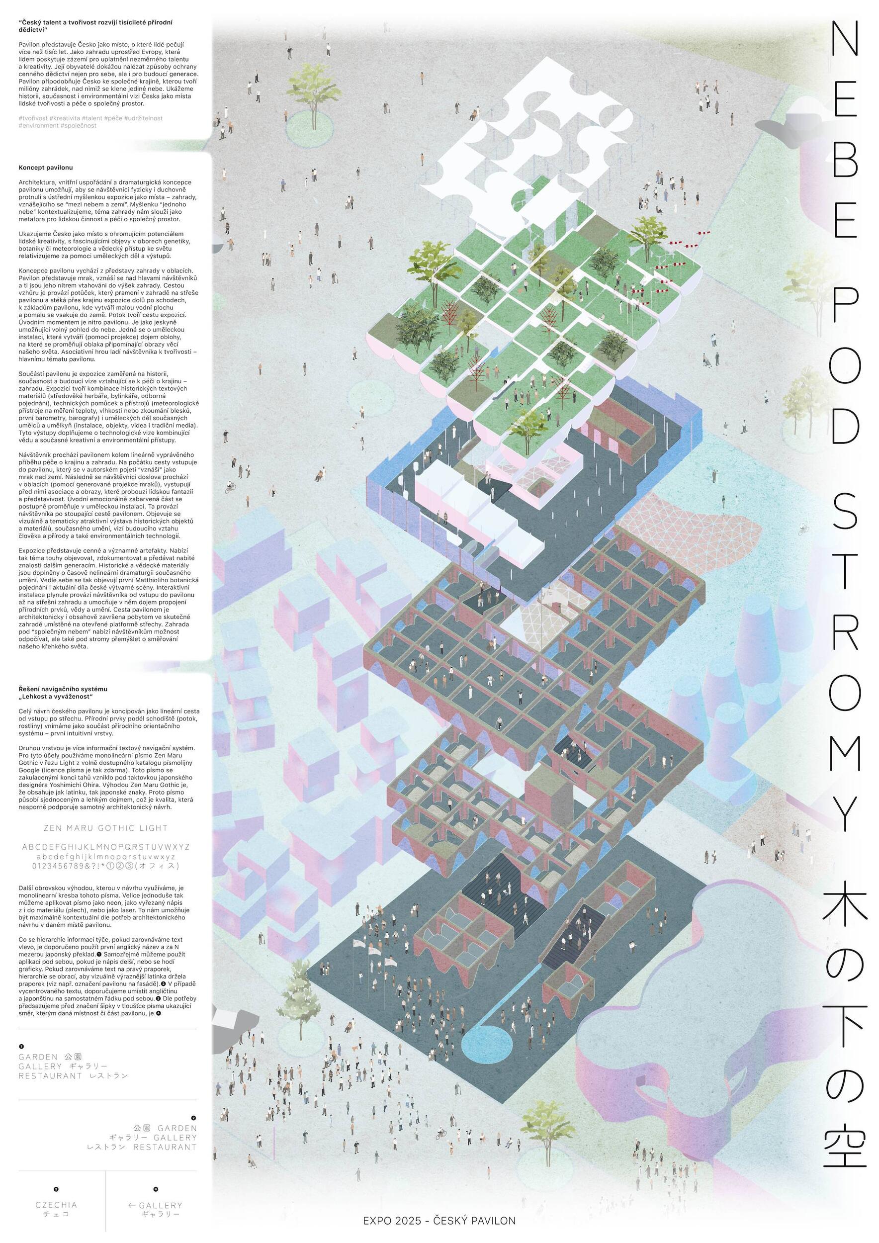 SOCHÁNÍ VITALITY. Lineárně dynamický pohyb směrem vzhůru po spirále jako by byl alegorií ideální a naplněné životní cesty. Bazální a hluboce zakódovaný pud však člověku velí především přežít, což ústí v řadu nekoordinovaných po-hybů často nejasnými směry. Ty se stávají potřebným zdrojem zkušeností k docílení kýžené schopnosti adaptace. Ve stejnou chvíli se v člověku, bytosti společenské, objeví nutkání si svou životní cestu rovněž užít. K neoddiskutovatelně důležité fyzické životaschopnosti se v tu chvíli přidává vrstva vitality nehmatatelné, kulturní a niterné. Zčeřená podoba českého pavilonu činí z pohybu základní nástroj k udržení tělesné vitality. Procházivšího k určité formě fyzického výkonu explicitně nabádá, zatímco obsah nutí ke kreativní práci s duchovními a kulturními hodnotami. Konceptem navržené architektury je teze, jejímž obsahem je prostor formovaný pohybem těla a duše. Pavilon je hmotou vyžadující aktivní zapojení návštěvníka, jehož pohyb expozici zpřítomňuje. Samým pohybem návštěvníka v útrobách pavilonu se zhmotní kulturní prostor obsahu, čímž dojde k završení jeho cesty. Dosažení vnitřní vitality.