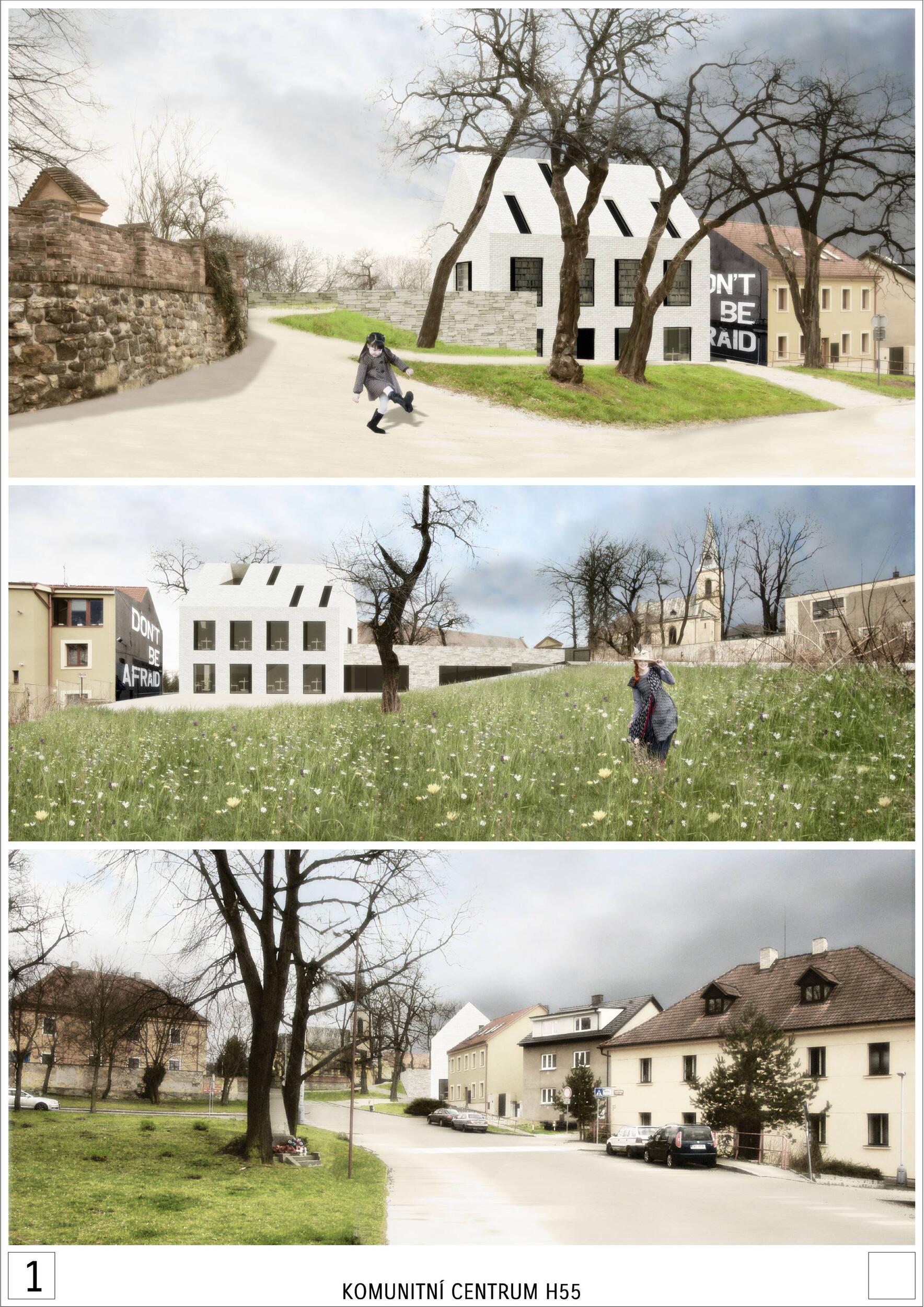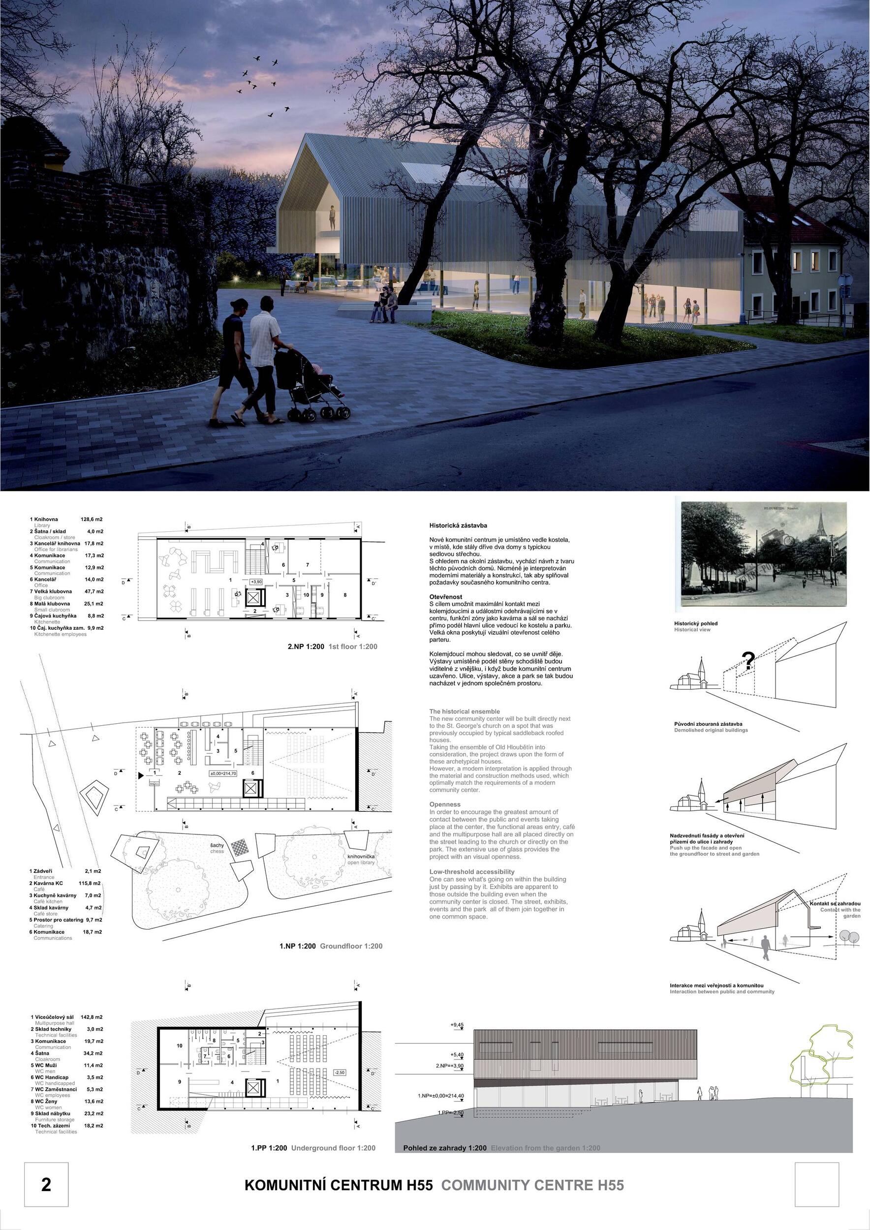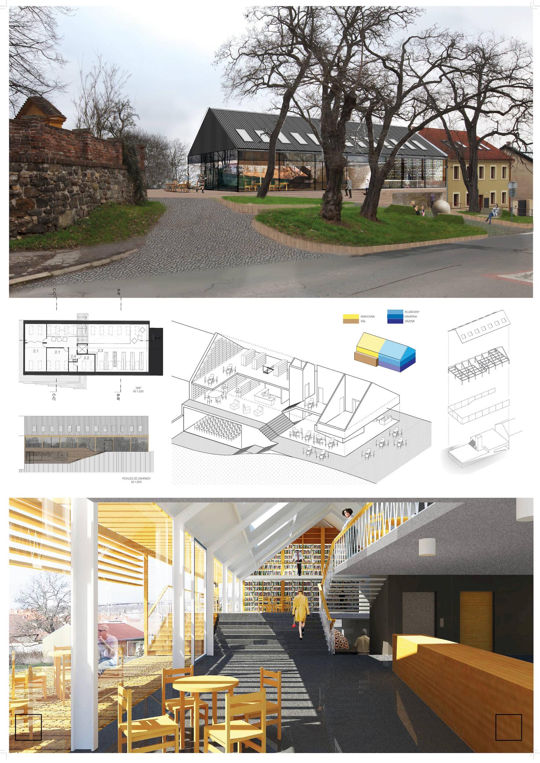 Porota ocenila přehledné dispoziční a hmotové řešení, které vtipně navazuje na původní parcelaci místa. Vnitřní uspořádání s plynule navazujícími prostory knihovny, kavárny a víceúčelového sálu umožňuje optimální návaznost i vhodný vizuální kontakt mezi těmito prostory navzájem i kontakt a aktivaci přilehlých venkovních prostor. Výtvarné pojetí je kultivované, i když poněkud schematické. Úprava venkovních prostor je jednoduchá a pádná a spolu s hmotovým řešením vhodně doplňuje místo i přiměřeně akcentuje přístup ke kostelu i do zahrady. Porota vnímá jako určitý nedostatek projektu jeho ne zcela zřejmé, zároveň však výtvarně silně exponované konstrukční řešení a doporučuje návrh v tomto smyslu zjednodušit. Z hlediska udržitelnosti porota oceňuje, že se jedná o jeden z mála návrhu, který pracoval s víceúčelovým sálem jako sezonním prostorem, čímž lez dosáhnout podstatných investičních úspor. Pochybnosti byly vysloveny o řešení fasád ve smyslu poměru prosklených a plných ploch.