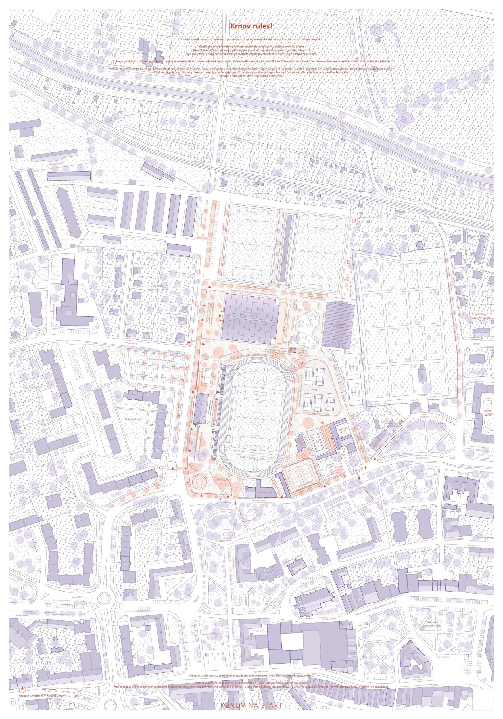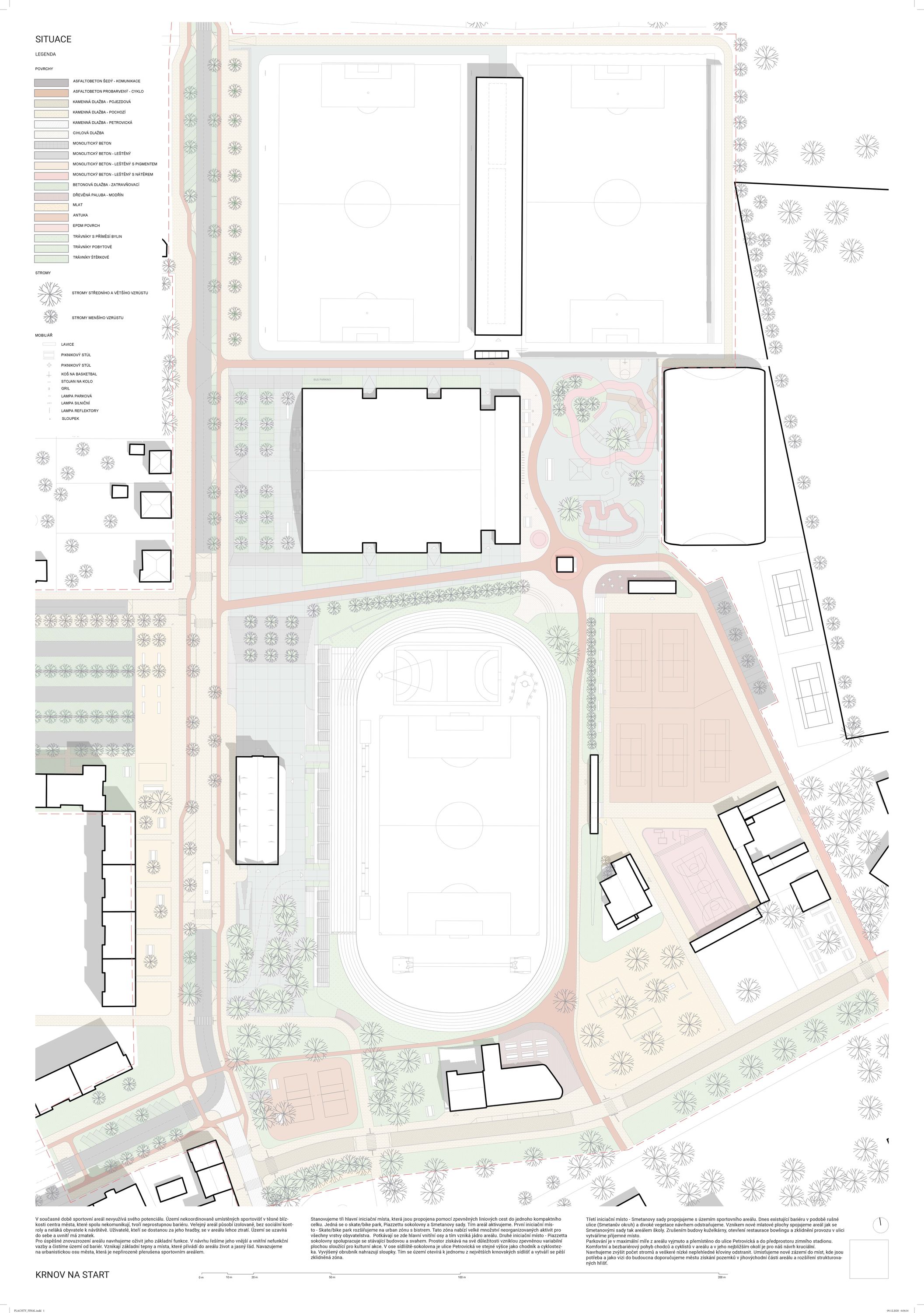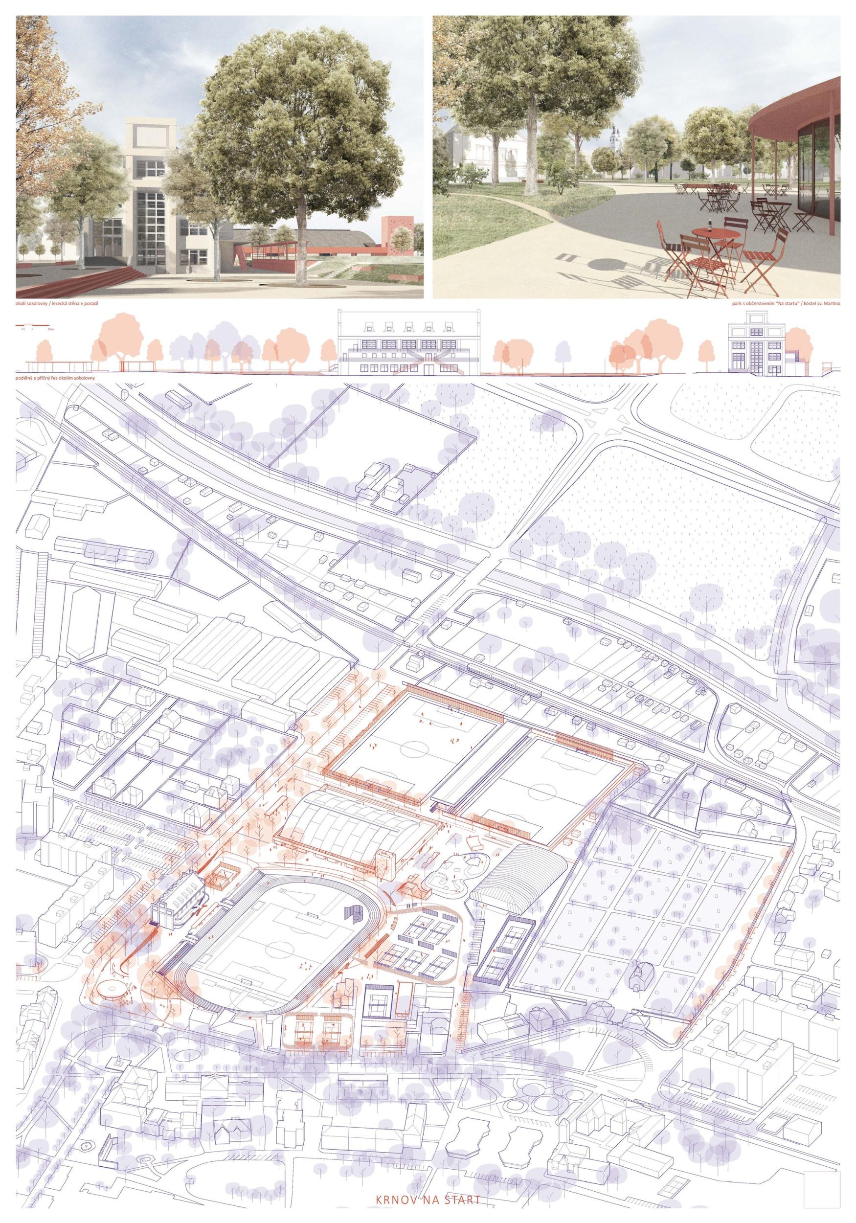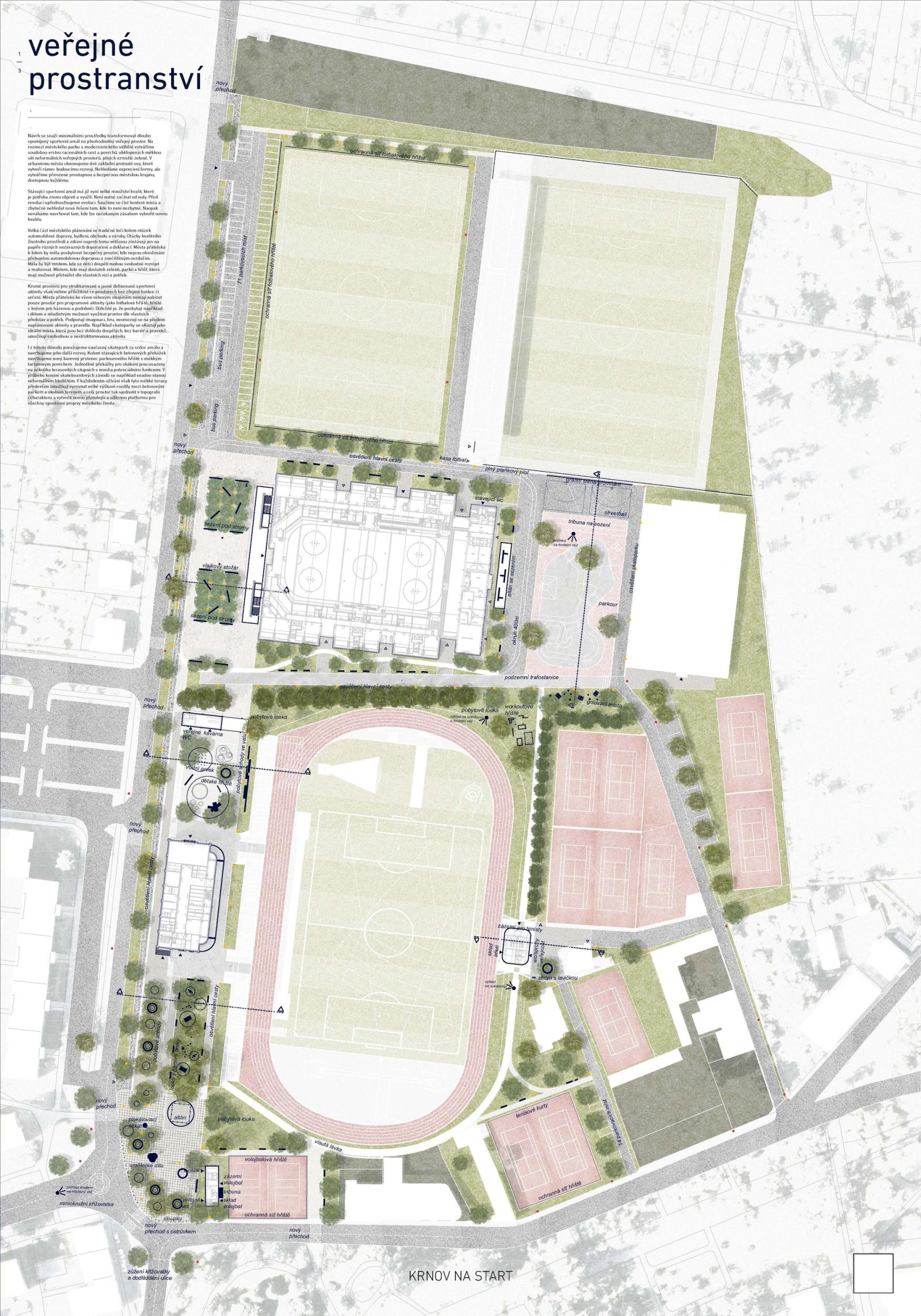 V současné době sportovní areál nevyužívá svého potenciálu. Území nekoordinovaně umístěných sportovišť v těsné blízkosti centra města, které spolu nekomunikují, tvoří neprostupnou bariéru. Veřejný areál působí izolovaně, bez sociální kontroly a neláká obyvatele k návštěvě. Uživatelé, kteří se dostanou za jeho hradby, se v areálu lehce ztratí. Území se uzavírá do sebe a uvnitř má zmatek. Pro úspěšné znovuzrození areálu navrhujeme oživit jeho základní funkce. V návrhu řešíme jeho vnější a vnitřní nefunkční vazby a čistíme území od bariér. Vznikají základní tepny a místa, které přivádí do areálu život a jasný řád. Navazujeme na urbanistickou osu města, která je nepřirozeně přerušena sportovním areálem. Stanovujeme tři hlavní iniciační místa, která jsou propojena pomocí zpevněných liniových cest do jednoho kompaktního celku. Jedná se o skate/bike park, piazzettu sokolovny a Smetanovy sady. Tím areál aktivujeme.