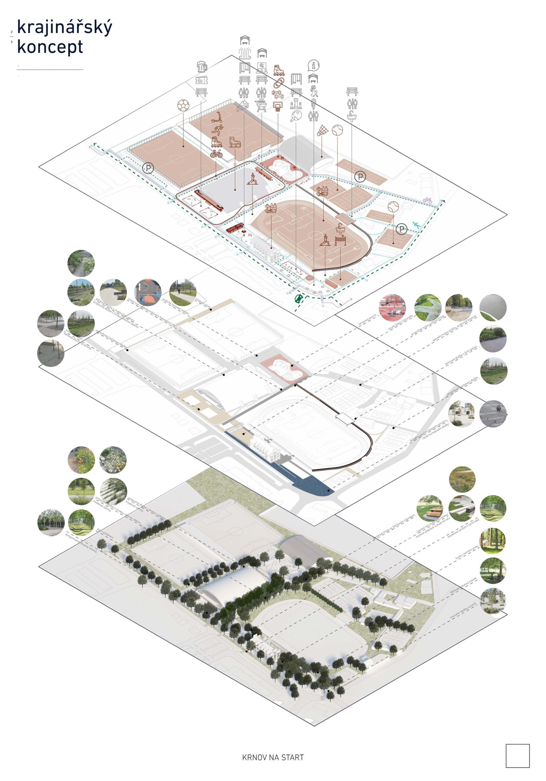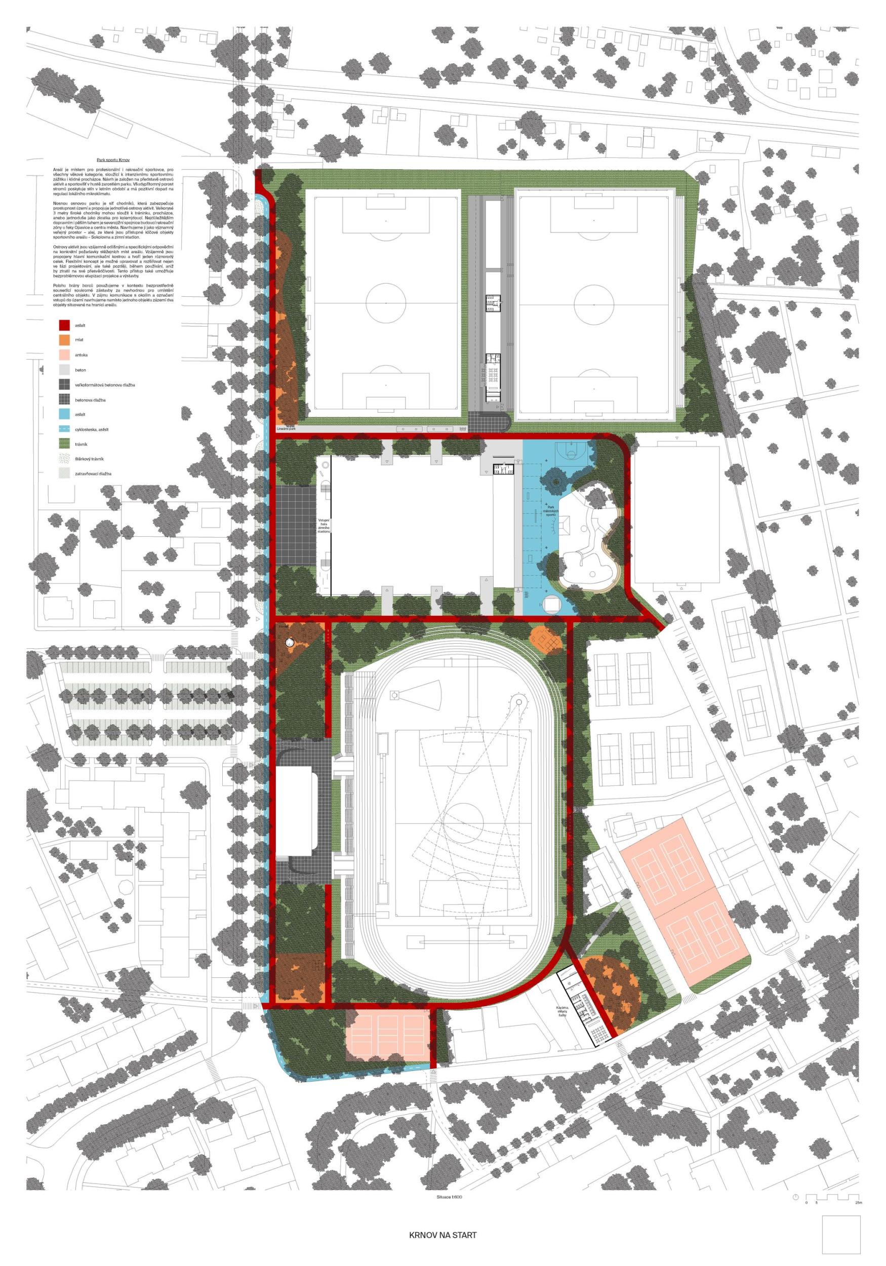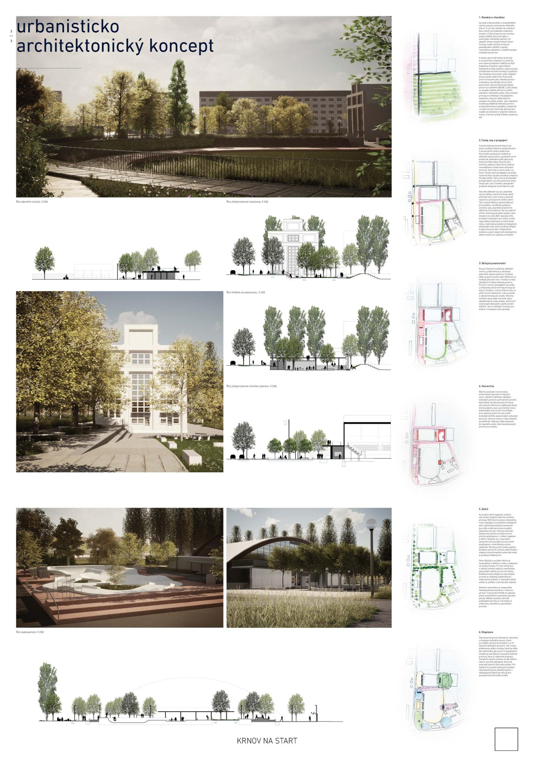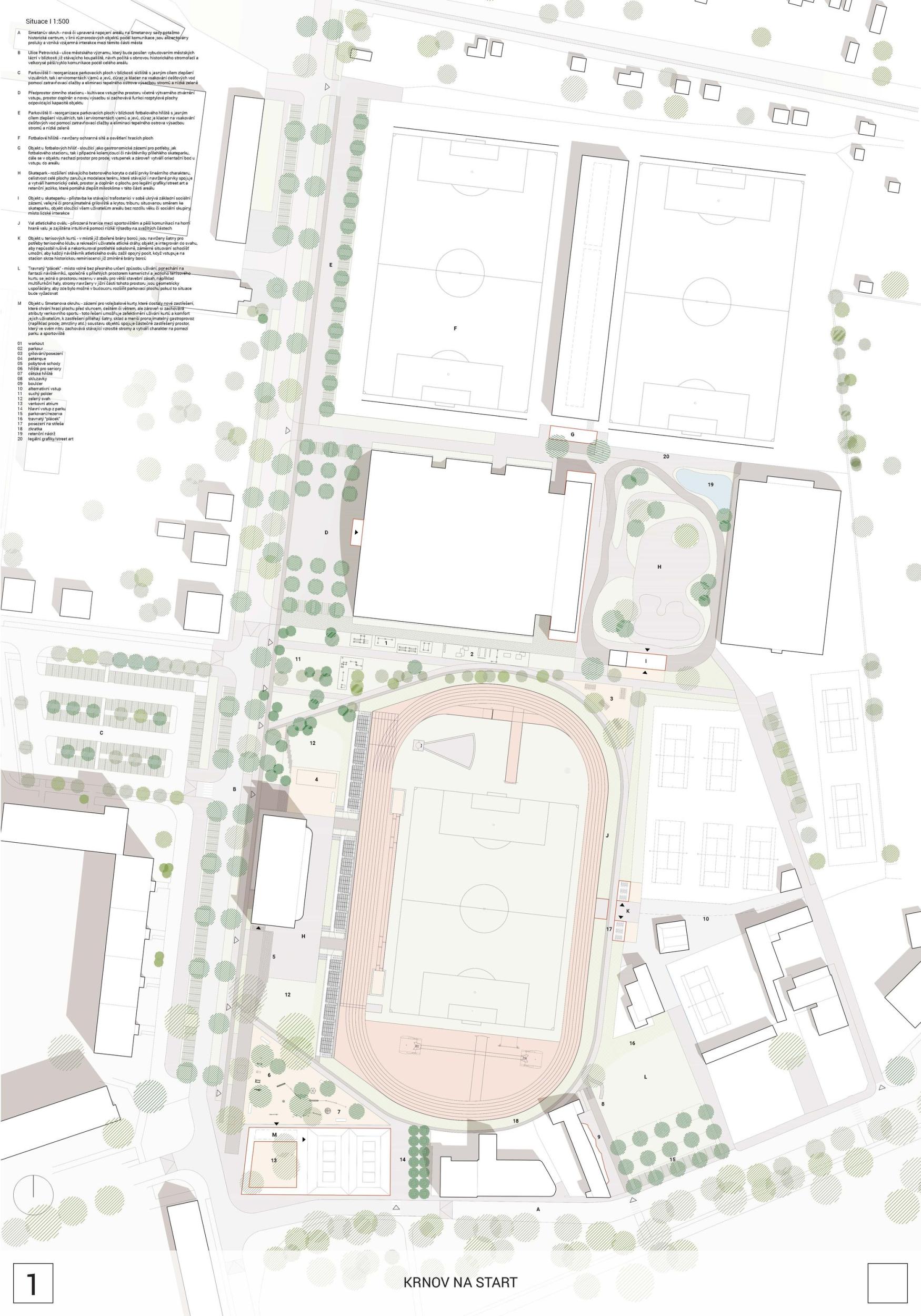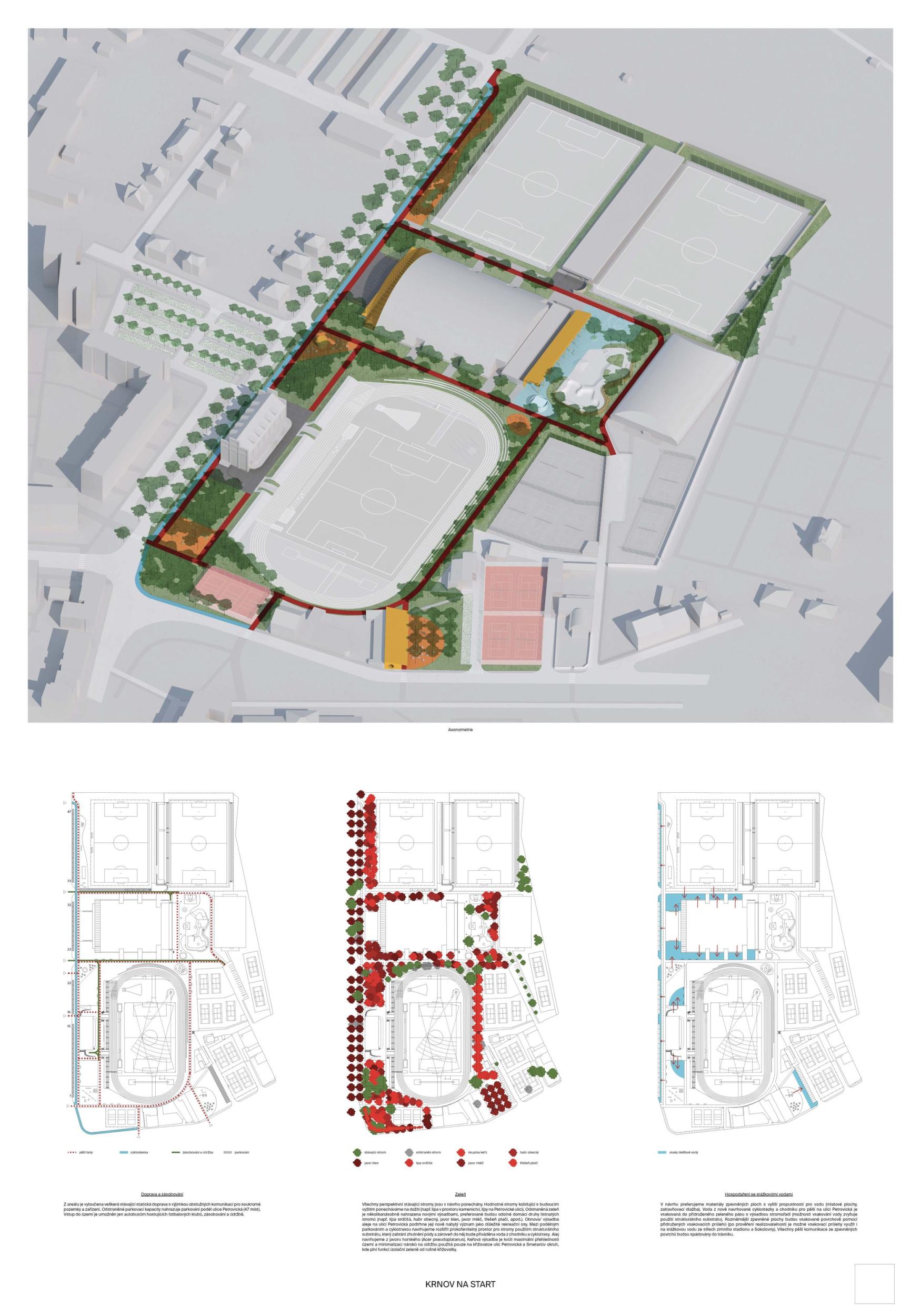 Autoři návrhu logicky a jasné zdůvodňuje navržené řešení, které je komplexní včetně dopravy, zeleně a vodního hospodářství. Situační řešení je jasné, srozumitelné a logické, vhodně je umístěno zázemí pro atletický stadion a sousední sportoviště v místě bývalé brány borců. Stanovením tří hlavních iniciačních míst, která jsou propojena pomocí zpevněných liniových cest do jednoho kompaktního celku, areál aktivují a zapojují do organismu města. První iniciační místo, skate/bike park, rozšiřují na výraznou urbanistickou zónu s bistrem, pod kterým je díky terénní konfigurace možné citlivě umístit zázemí pro sousední tenisové kurty. Tím je zajištěno i optické a hlukové oddělení různě rušných funkcí. Tato zóna nabízí velké množství neorganizovaných aktivit pro všechny vrstvy obyvatelstva. Pro tento cíl není ale nutno stávající zařízení podstatně měnit. Prostor piazzetty sokolovny spolupracuje se stávající budovou a svahem a získává na důležitosti zpevněnou variabilní plochou sloužící pro společenské, kulturní a jiné akce. Stává se tak nejen novým těžištěm nástupní části sportovního areálu, ale i významným bodem na ulici Petrovická. Vytváří se zde pěší zklidněná zóna, která se otevírá k jednomu z největších krnovských sídlišť. Různých výškových úrovní u ulice i tribuny atletického stadionu využívají autoři pro umístění potřebného zázemí, které tvaroslovím některých prvků navazuje na architekturu sokolovny. Řešení tohoto prostoru považuje porota za nejvyšší přínos návrhu.
