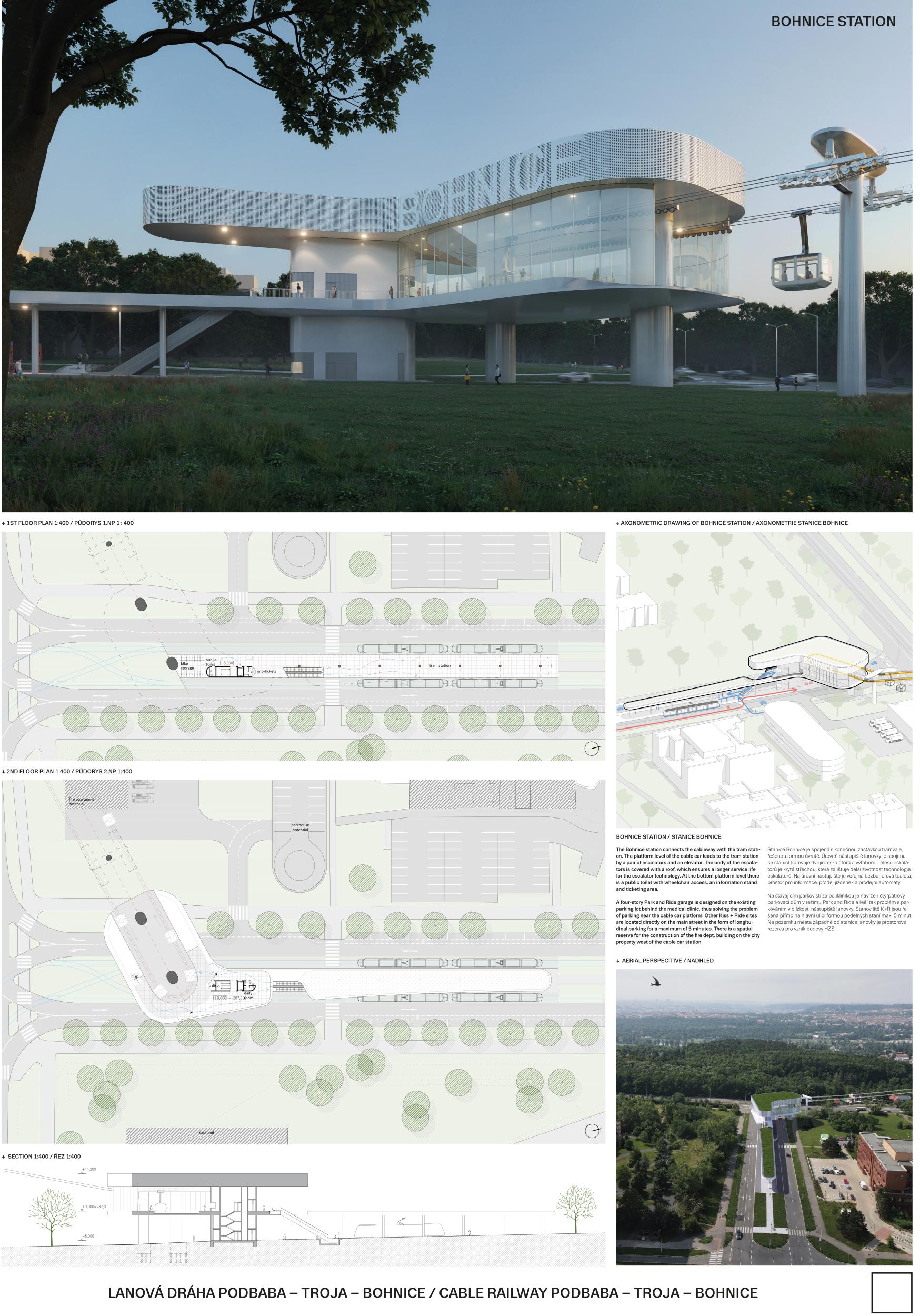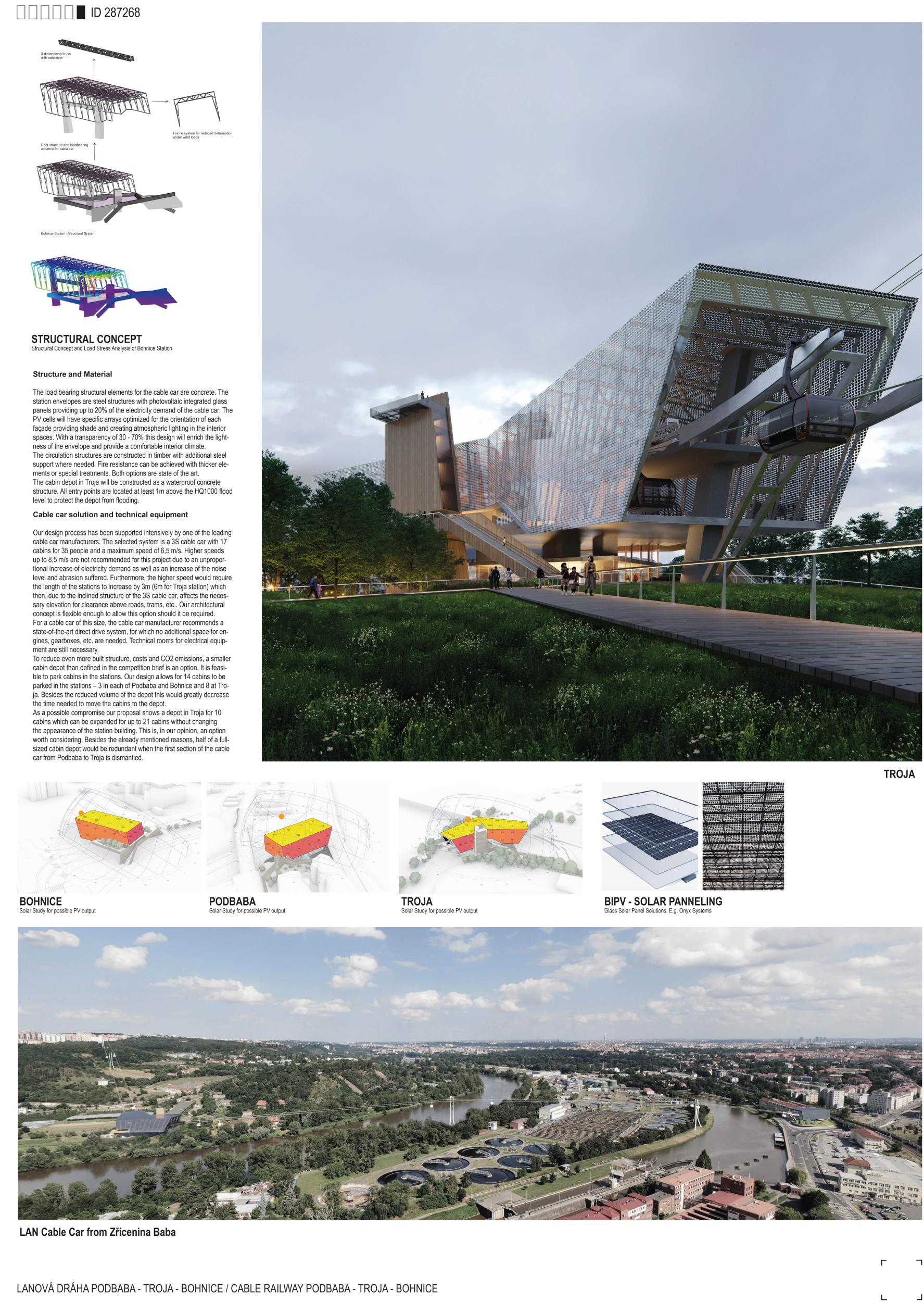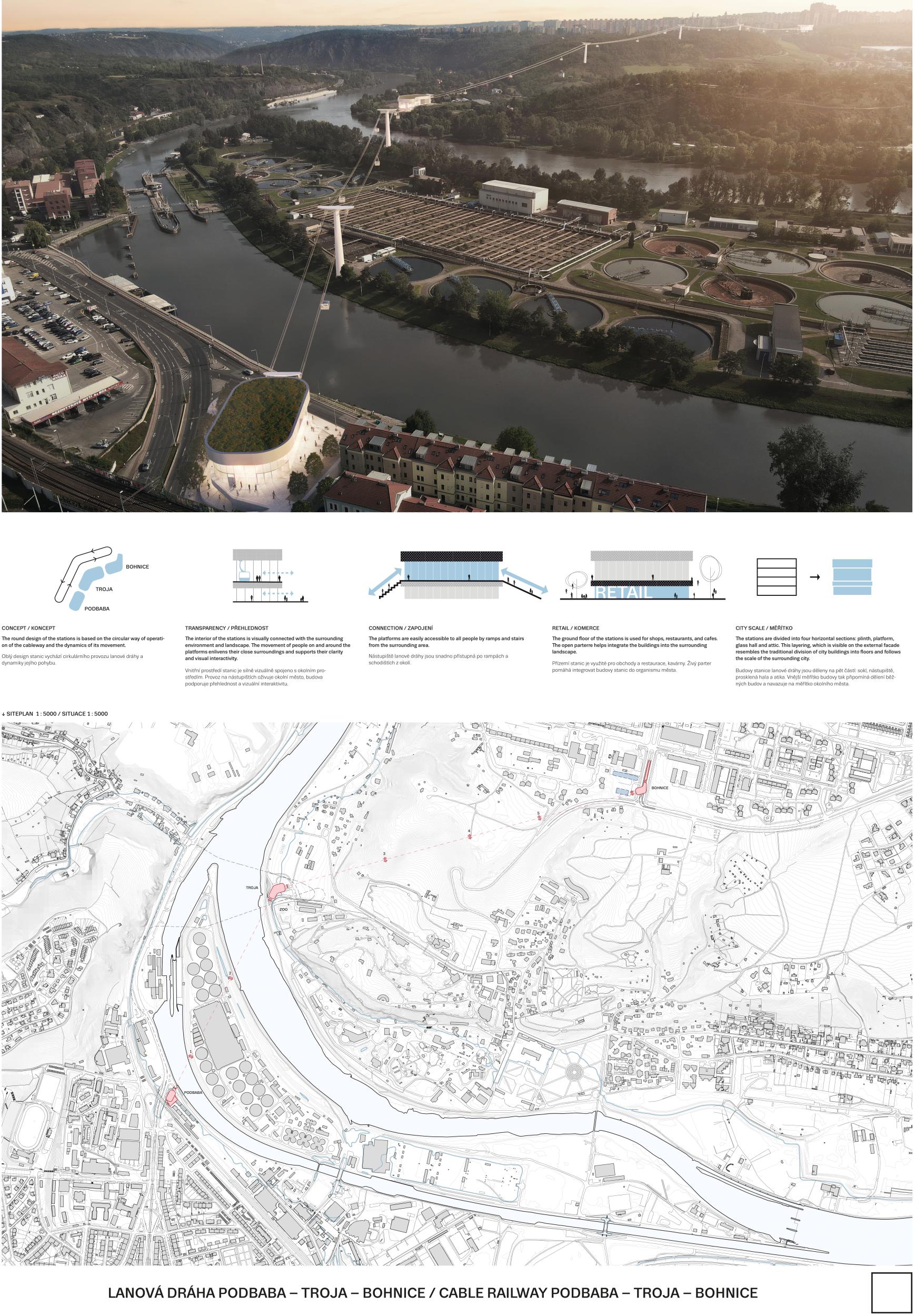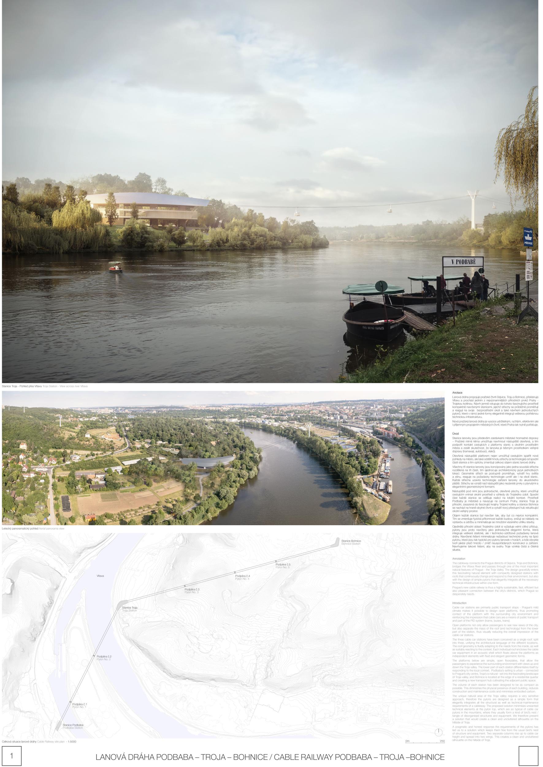 Lanová dráha propojuje pražské čtvrti Dejvice, Troju a Bohnice, překlenuje Vltavu a prochází jedním z nejvýznamnějších přírodních prvků Prahy - Trojskou kotlinou. Návrh jemně vstupuje do tohoto fascinujícího prostředí kompaktně navrženými stanicemi, jejichž střechy se průběžně proměňují a reagují na svoje bezprostřední okolí, a také návrhem jednoduchých pylonů, které v rámci jedné formy elegantně integrují veškerou potřebnou technickou infrastrukturu. Nová pražská lanová dráha je vysoce udržitelným, rychlým, efektivním ale i příjemným propojením městských čtvrtí, které Praha tak nutně potřebuje.