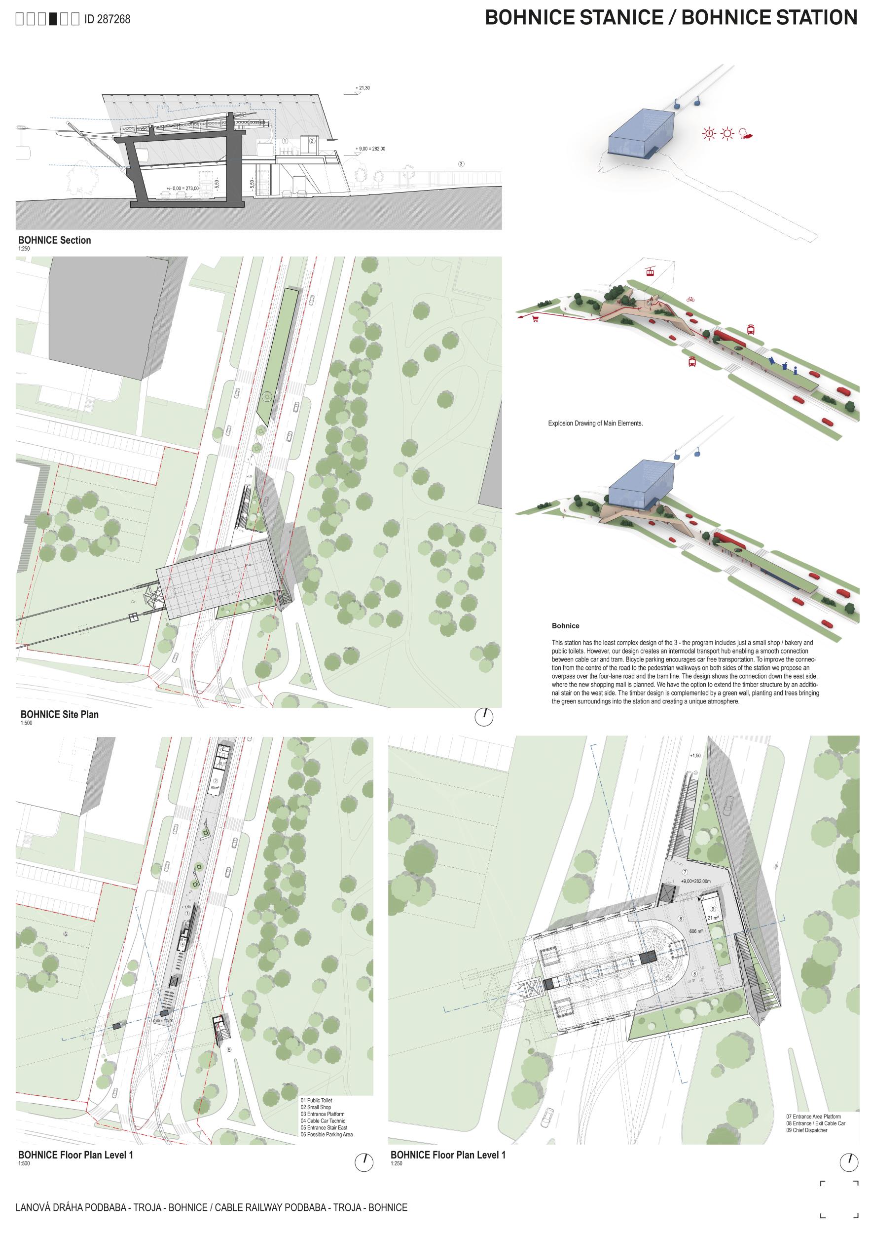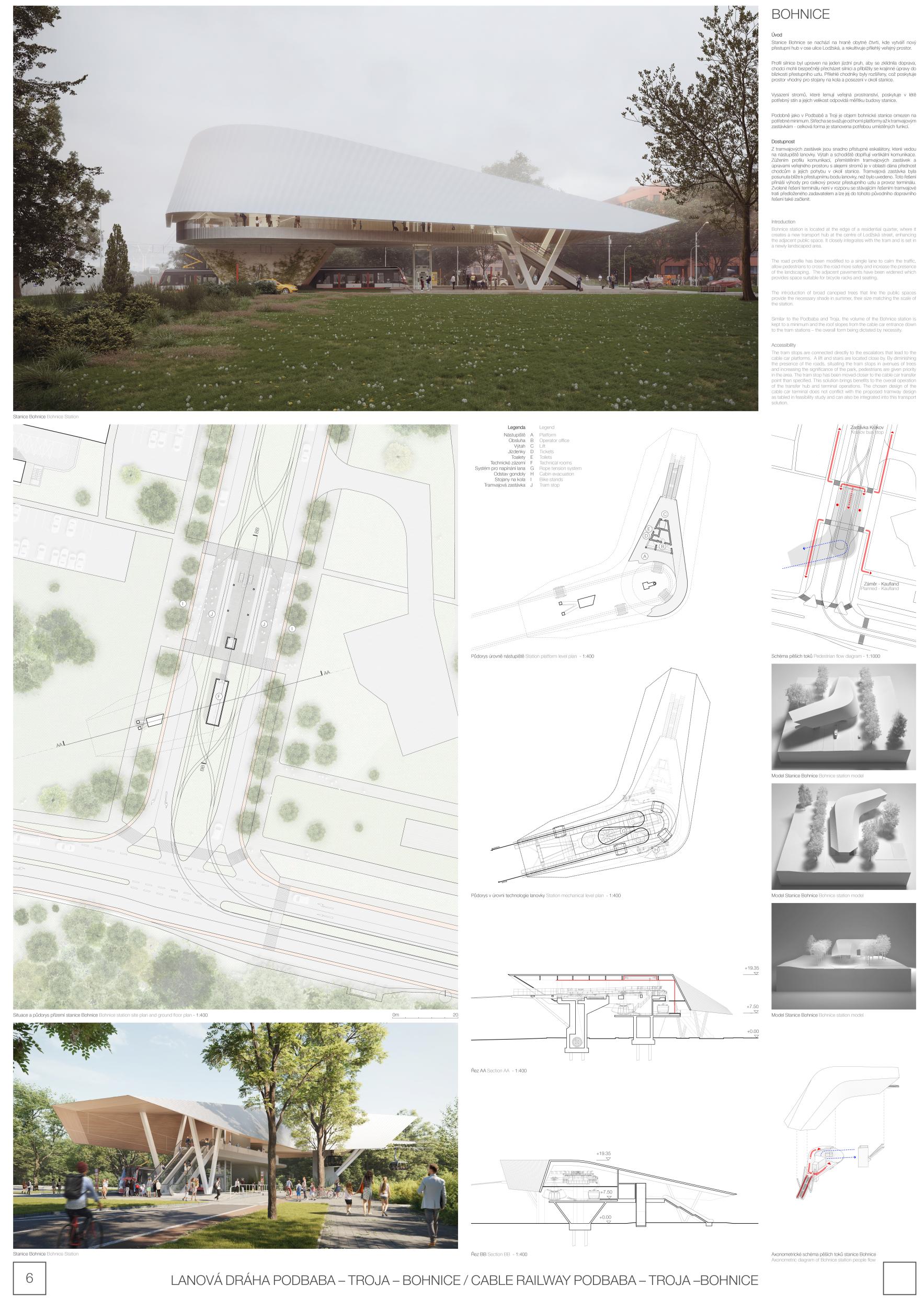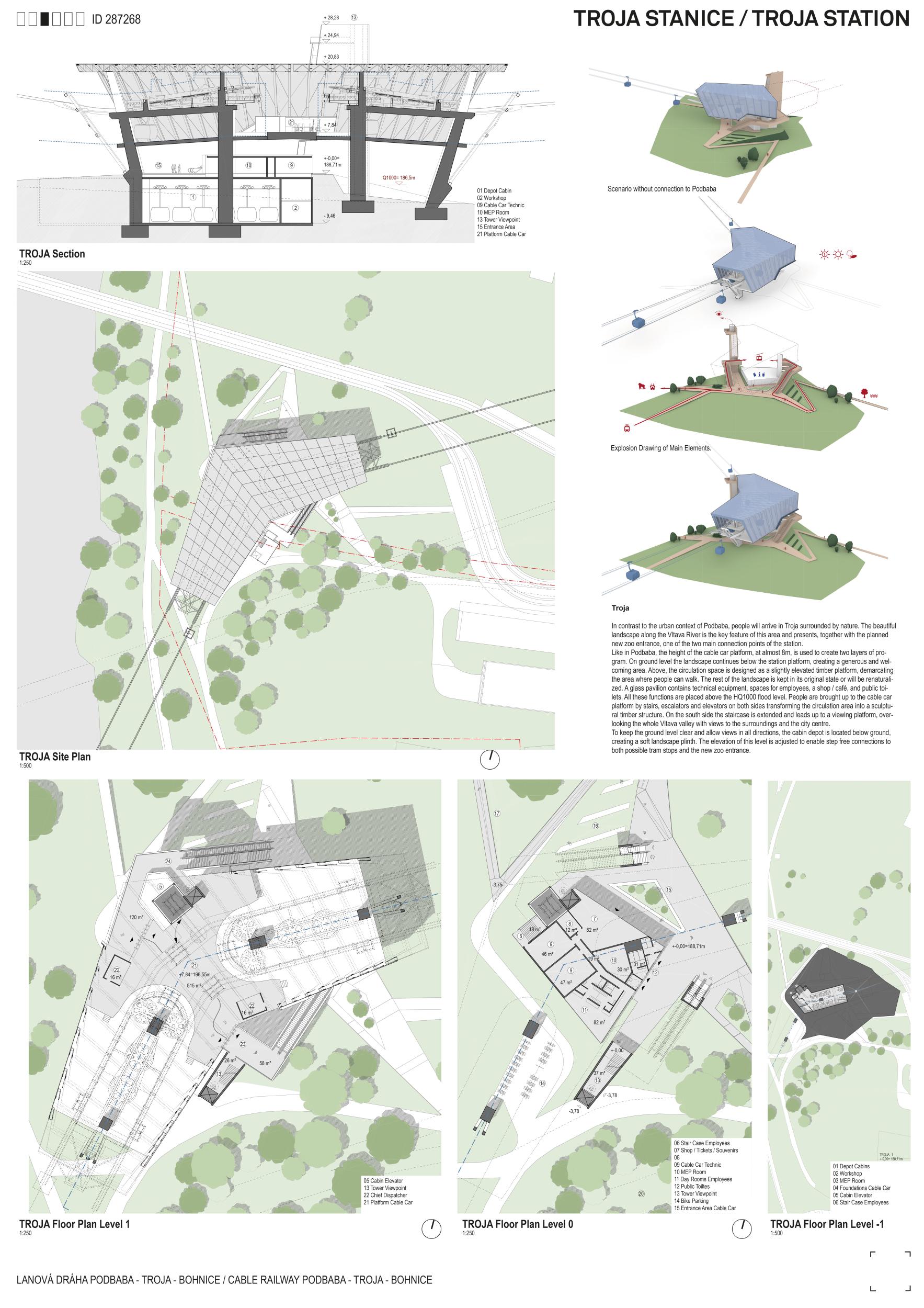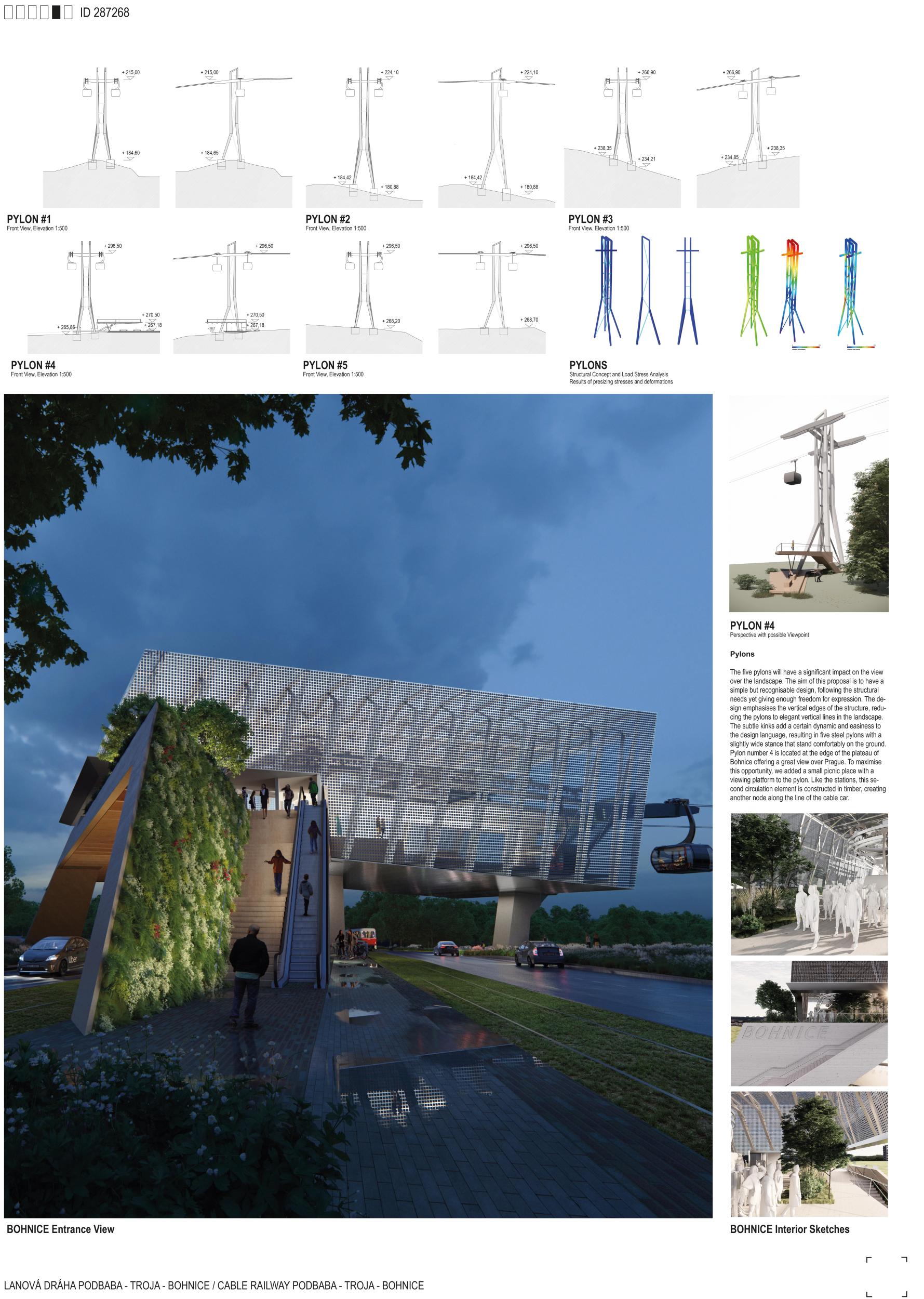 Lanová dráha propojuje pražské čtvrti Dejvice, Troju a Bohnice, překlenuje Vltavu a prochází jedním z nejvýznamnějších přírodních prvků Prahy - Trojskou kotlinou. Návrh jemně vstupuje do tohoto fascinujícího prostředí kompaktně navrženými stanicemi, jejichž střechy se průběžně proměňují a reagují na svoje bezprostřední okolí, a také návrhem jednoduchých pylonů, které v rámci jedné formy elegantně integrují veškerou potřebnou technickou infrastrukturu. Nová pražská lanová dráha je vysoce udržitelným, rychlým, efektivním ale i příjemným propojením městských čtvrtí, které Praha tak nutně potřebuje.