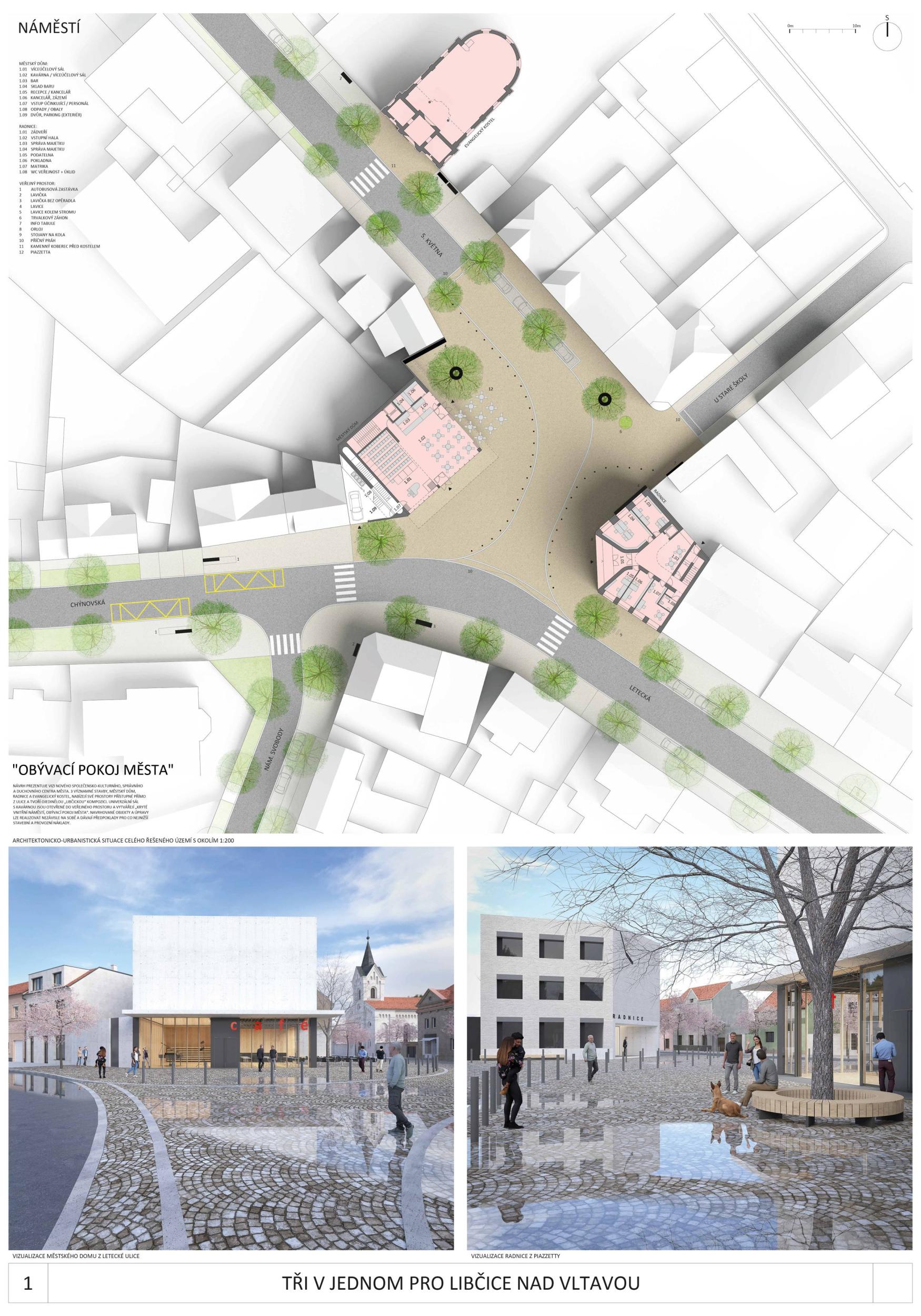 Rádi bychom vytvořili nový městský prostor – náměstí definované dvojicí vzájemně komunikujících veřejných budov vyrůstající ze společné podnože. Radnice a městský dům vytvářejí pomyslný trojúhelník s blízkým kostelem a navazují na okolní zástavbu. Své společenské postavení dávají najevo osobitou formou, vstupují na náměstí jako diamanty se zalomenými hranami fasád a střech. Celá plocha náměstí je sjednocena kamenným zadlážděním a s domy je propojena přírodní barevností.