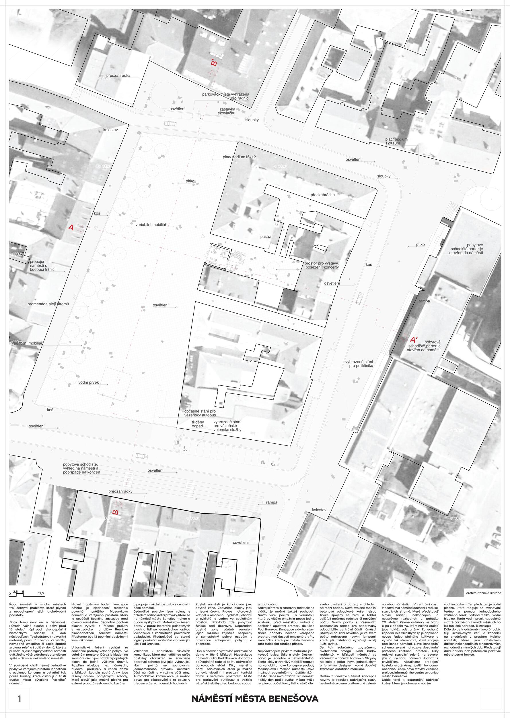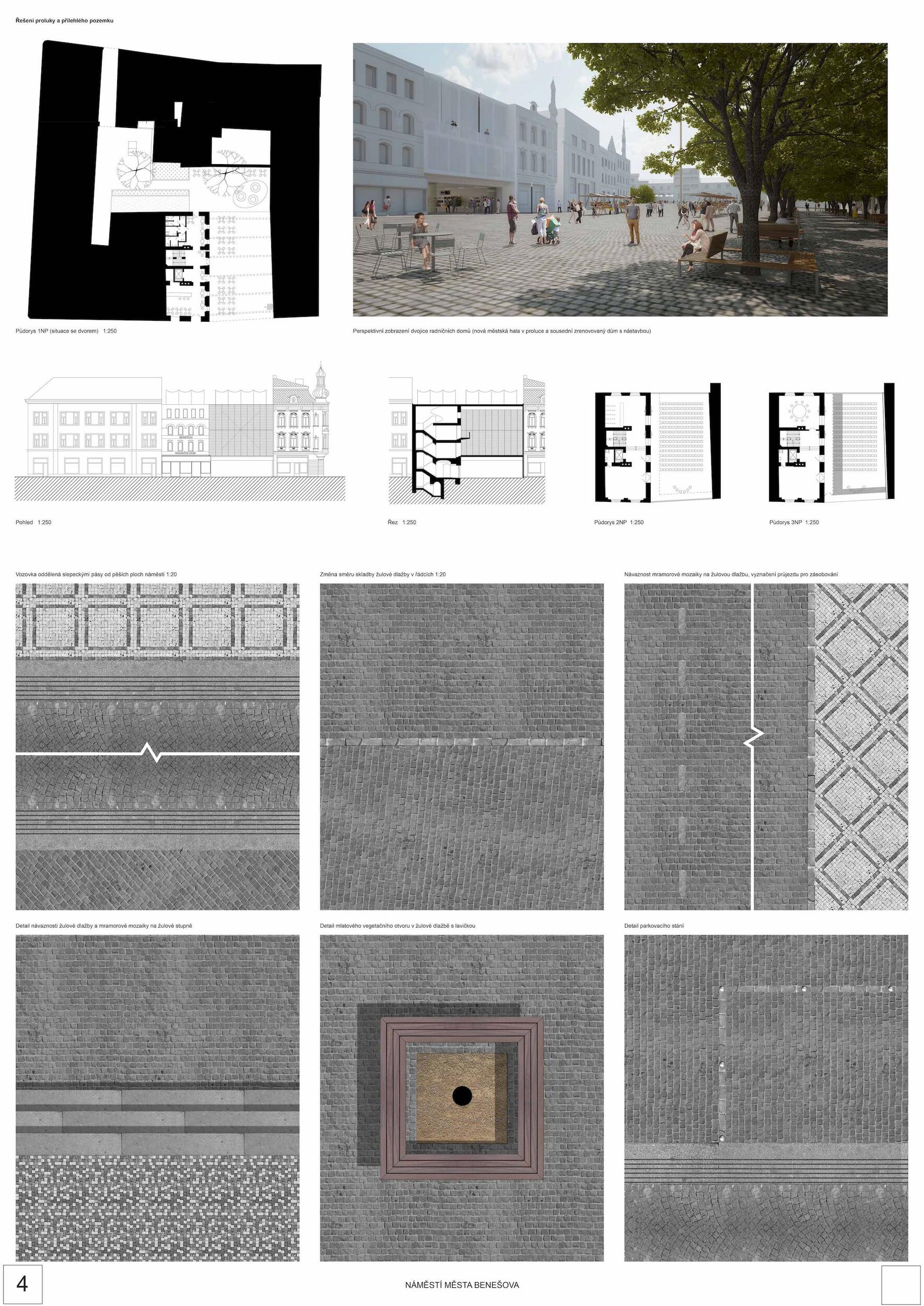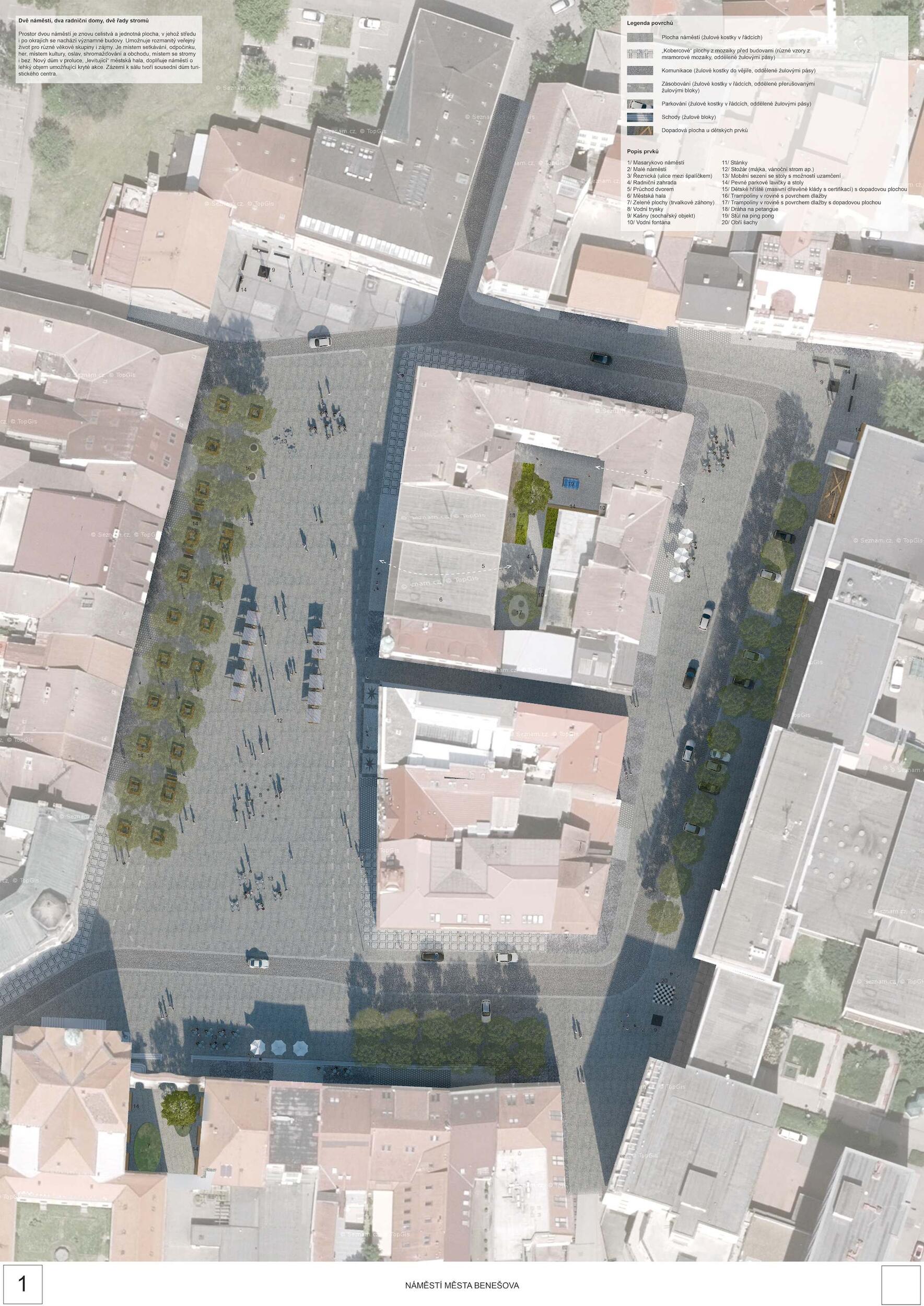 Dvě náměstí, dva radniční domy, dvě řady stromů. Prostor dvou náměstí je znovu celistvá a jednotná plocha, v jehož středu i po okrajích se nachází významné budovy. Umožnuje rozmanitý veřejný život pro různé věkové skupiny i zájmy. Je místem setkávání, odpočinku, her, místem kultury, oslav, shromažďování a obchodu, místem se stromy i bez. Nový dům v proluce, „levitující“ městská hala, doplňuje náměstí o lehký objem umožňující kryté akce. Zázemí k sálu tvoří sousední dům turistického centra.