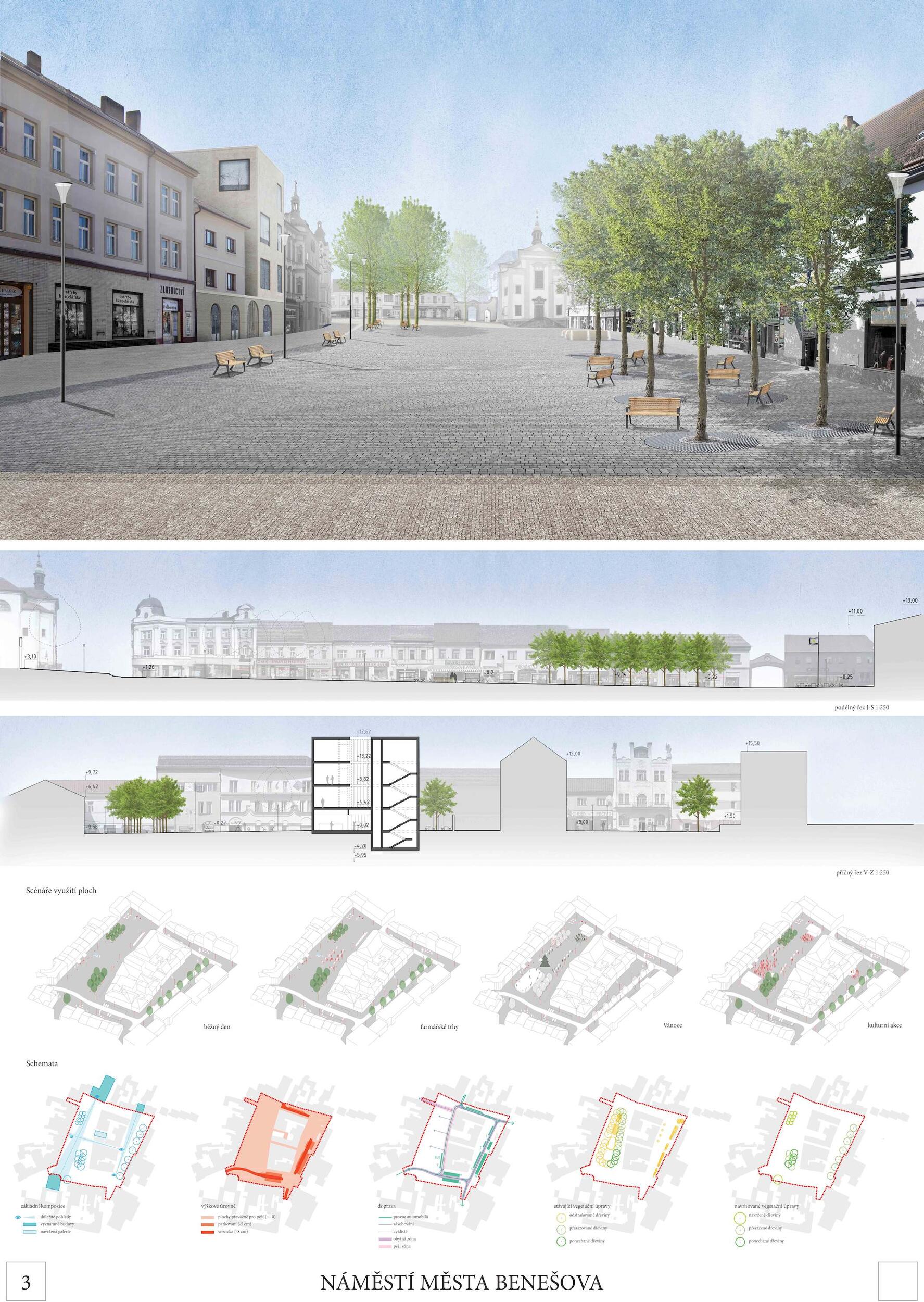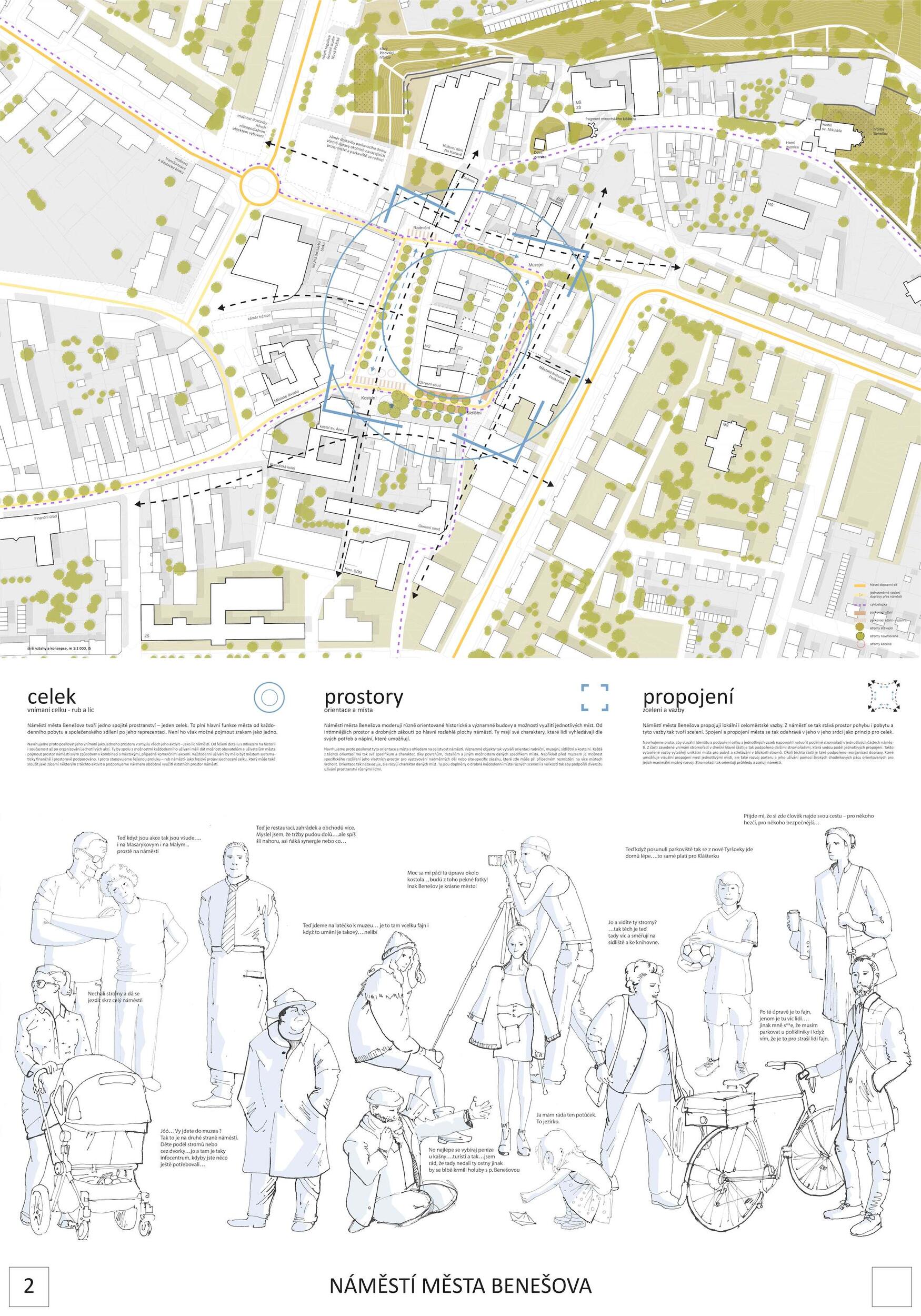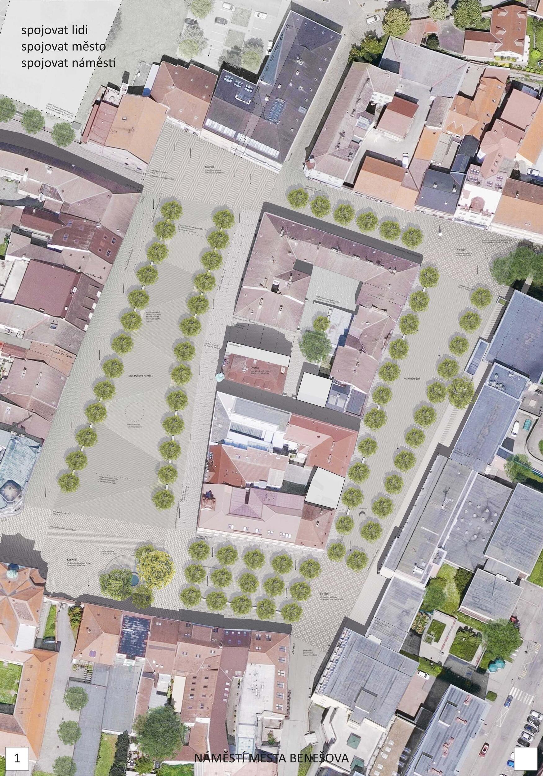Návrh vytváří přirozená ohniska sociálního života na náměstí (vodní prvek, zázemí kulturních i společenských akcí, městské trhy i prostor pro relaxaci pod stromořadím). Současně vytváří místa pro podobné aktivity i v druhém plánu (vnitroblok špalíčku). Návrh úspěšně sceluje dva dosud prostorově oddělené celky Masarykova a Malého náměstí. Dobře pracuje s rozmístěním stromů (dvojřada na západní straně náměstí s využitím stávajících lip, dvojřada na jižní straně Masarykova náměstí, stromořadí před poliklinikou na Malém náměstí). Stromy ze tří stran rámují celek obou náměstí a přirozeným způsobem ho sjednocují. Návrh pracuje logicky i s individuální automobilovou dopravou, kterou umisťuje přirozeně na obvod celku obou náměstí při poliklinice, jižní i severní straně. Parkování je umístěno logicky a kapacitně odpovídá. Porota doporučuje umožnit jednosměrný a kapacitně omezený průjezd do Vlašimské ulice jako počátku významné městské radiály. Návrh úspěšně využívá stávajících kvalitních prvků: dlažby před budovou radnice a tento motiv inteligentně rozvíjí formou mozaikových „koberců“ před jednotlivými budovami.