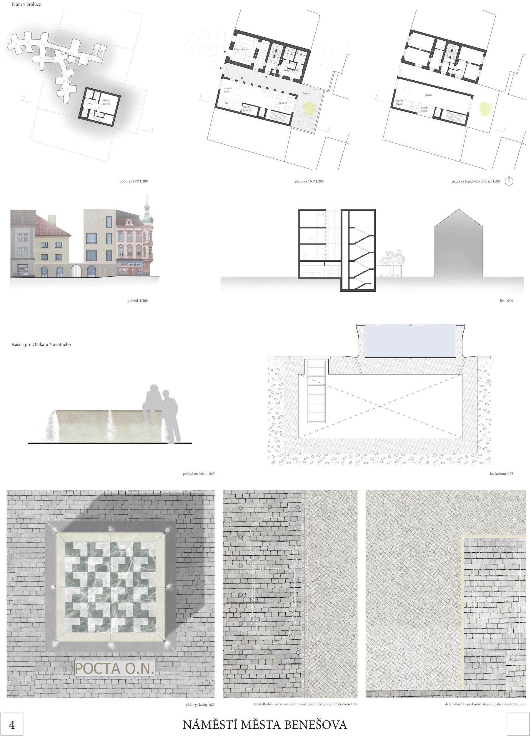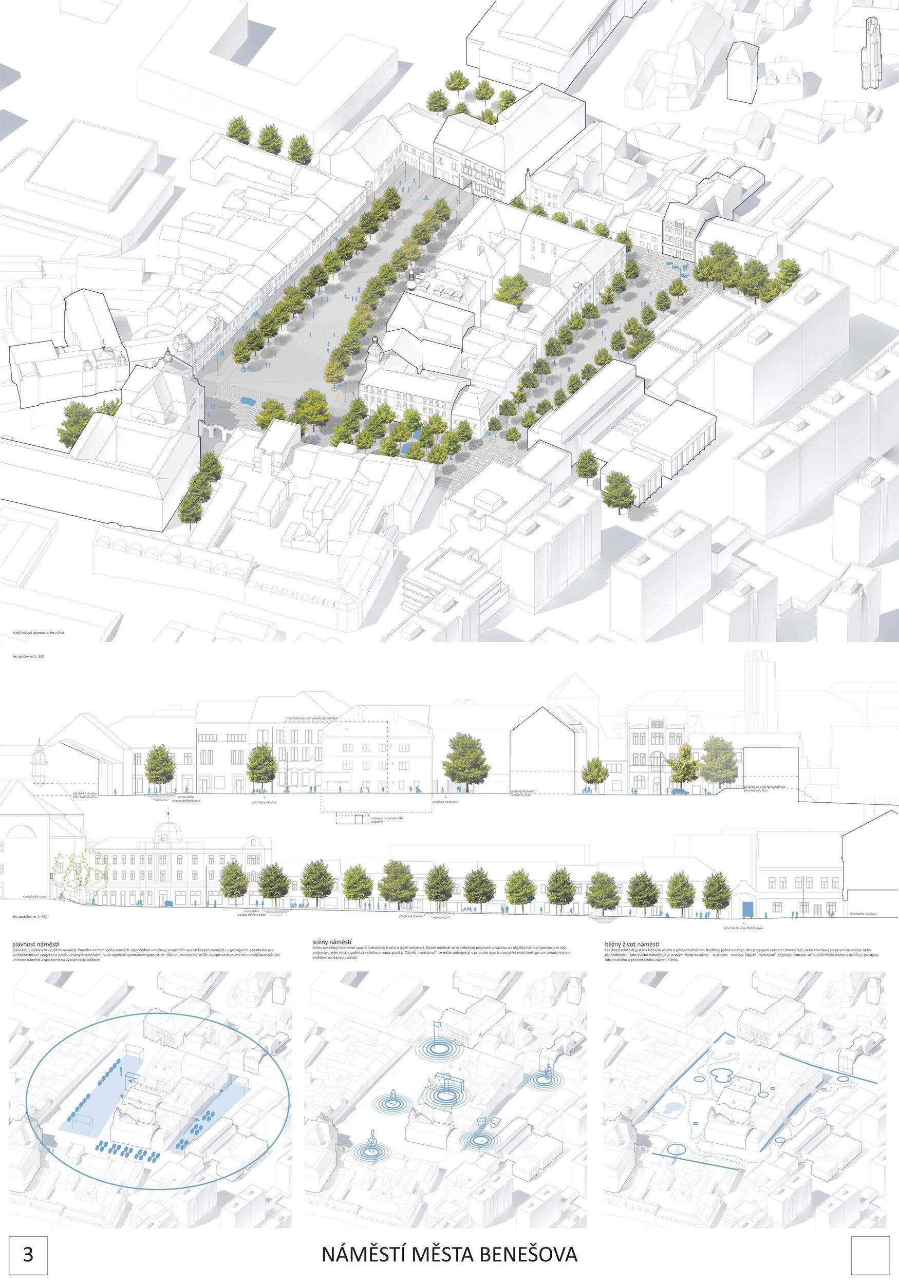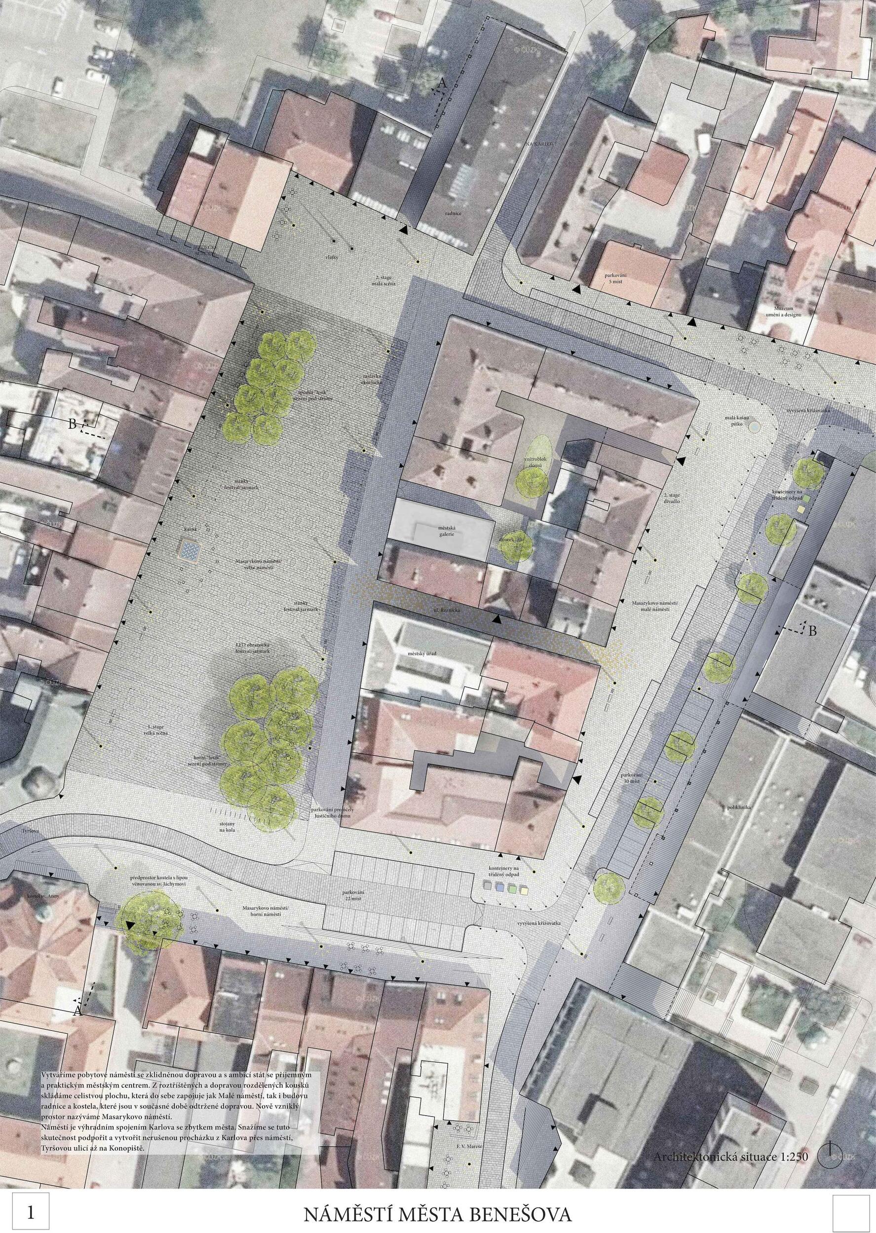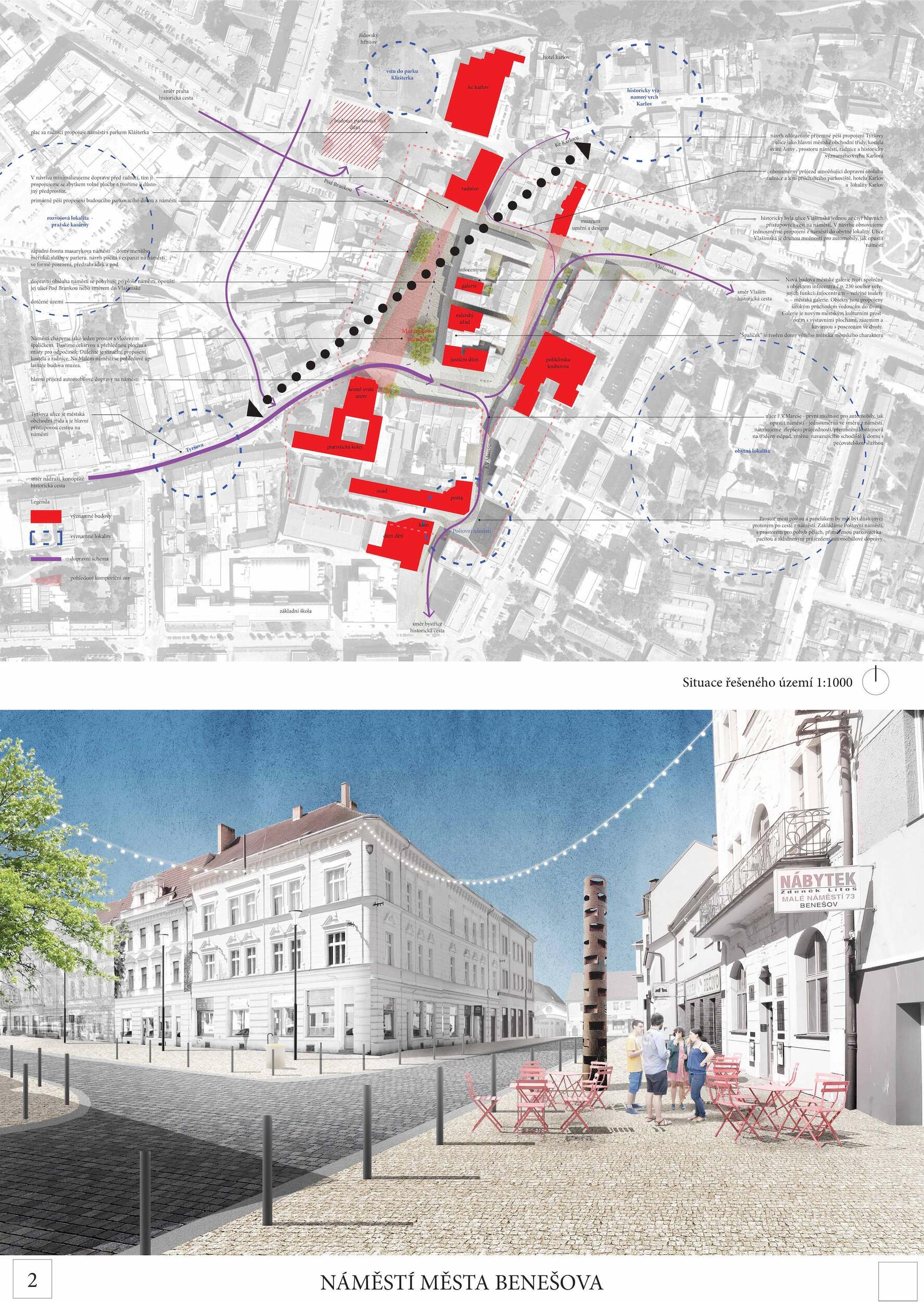 Návrh vytváří přirozená ohniska sociálního života na náměstí (vodní prvek, zázemí kulturních i společenských akcí, městské trhy i prostor pro relaxaci pod stromořadím). Současně vytváří místa pro podobné aktivity i v druhém plánu (vnitroblok špalíčku). Návrh úspěšně sceluje dva dosud prostorově oddělené celky Masarykova a Malého náměstí. Dobře pracuje s rozmístěním stromů (dvojřada na západní straně náměstí s využitím stávajících lip, dvojřada na jižní straně Masarykova náměstí, stromořadí před poliklinikou na Malém náměstí). Stromy ze tří stran rámují celek obou náměstí a přirozeným způsobem ho sjednocují. Návrh pracuje logicky i s individuální automobilovou dopravou, kterou umisťuje přirozeně na obvod celku obou náměstí při poliklinice, jižní i severní straně. Parkování je umístěno logicky a kapacitně odpovídá. Porota doporučuje umožnit jednosměrný a kapacitně omezený průjezd do Vlašimské ulice jako počátku významné městské radiály. Návrh úspěšně využívá stávajících kvalitních prvků: dlažby před budovou radnice a tento motiv inteligentně rozvíjí formou mozaikových „koberců“ před jednotlivými budovami.