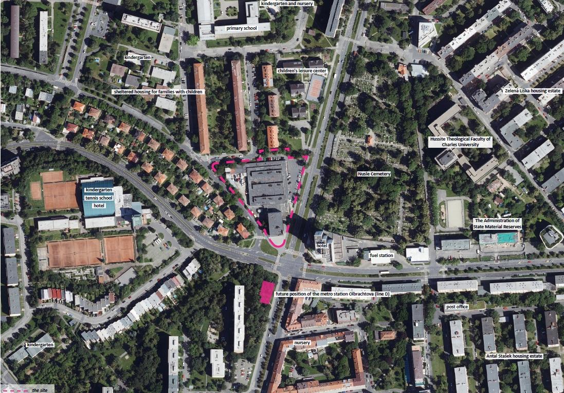 Dnes je možné v území postavit 18 712 m2 HPP. Stávající využití parcely „nerušící výroba a služby se s výstavbou nové stanice metra D Olbrachtova stane do budoucna nelogickým, proto je potřeba iniciovat změnu územního plánu, která v místě umožní vznik soudobé, vysoce kvalitní stavby. Cílem soutěže je v první řadě připravit podklad pro změnu územního plánu, který zohlední novou stanici metra D jako lokální centrum, a následovně ve spolupráci s investorem navržený projekt realizovat. Věříme, že tím vznikne dominantní stavba vysoké architektonické úrovně s výborným poměrem mezi cenou a hodnotou stavby.
