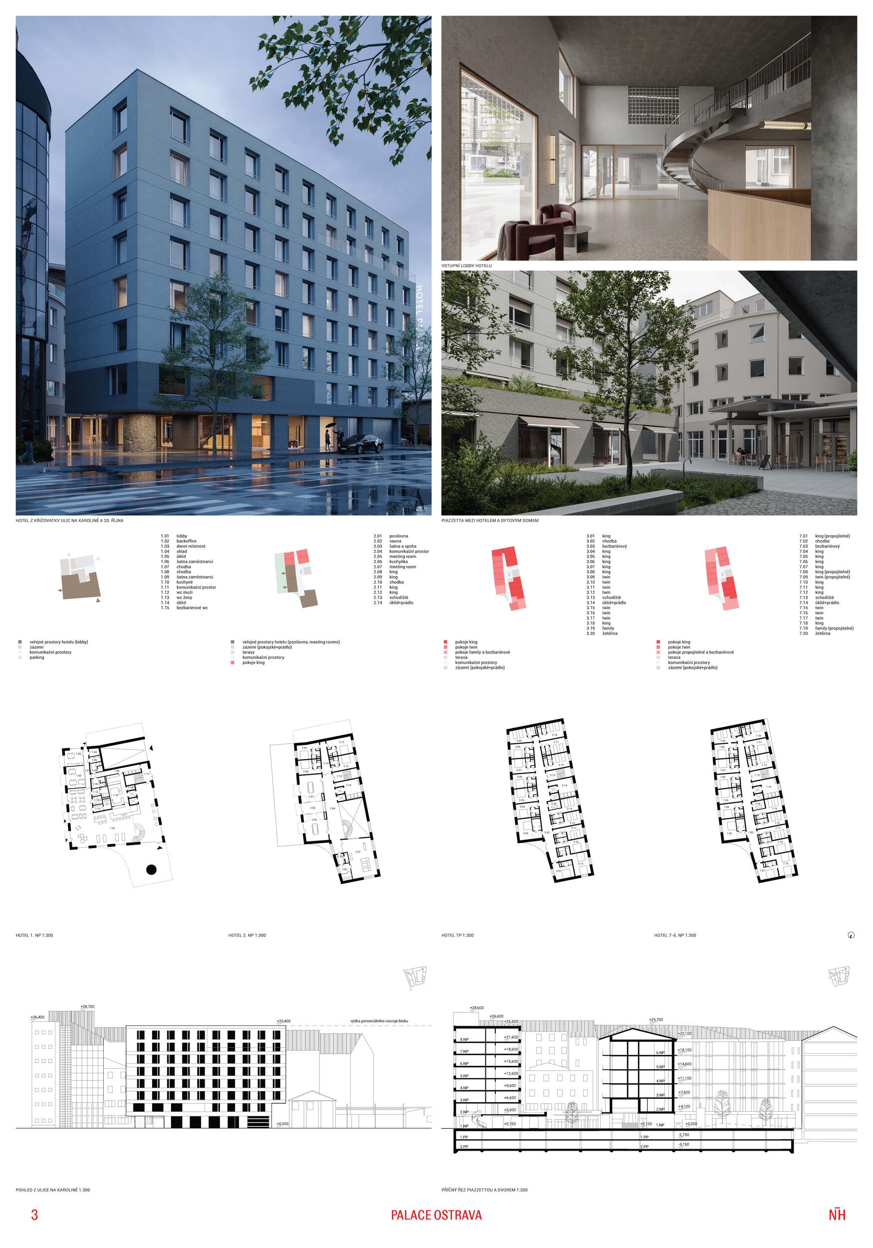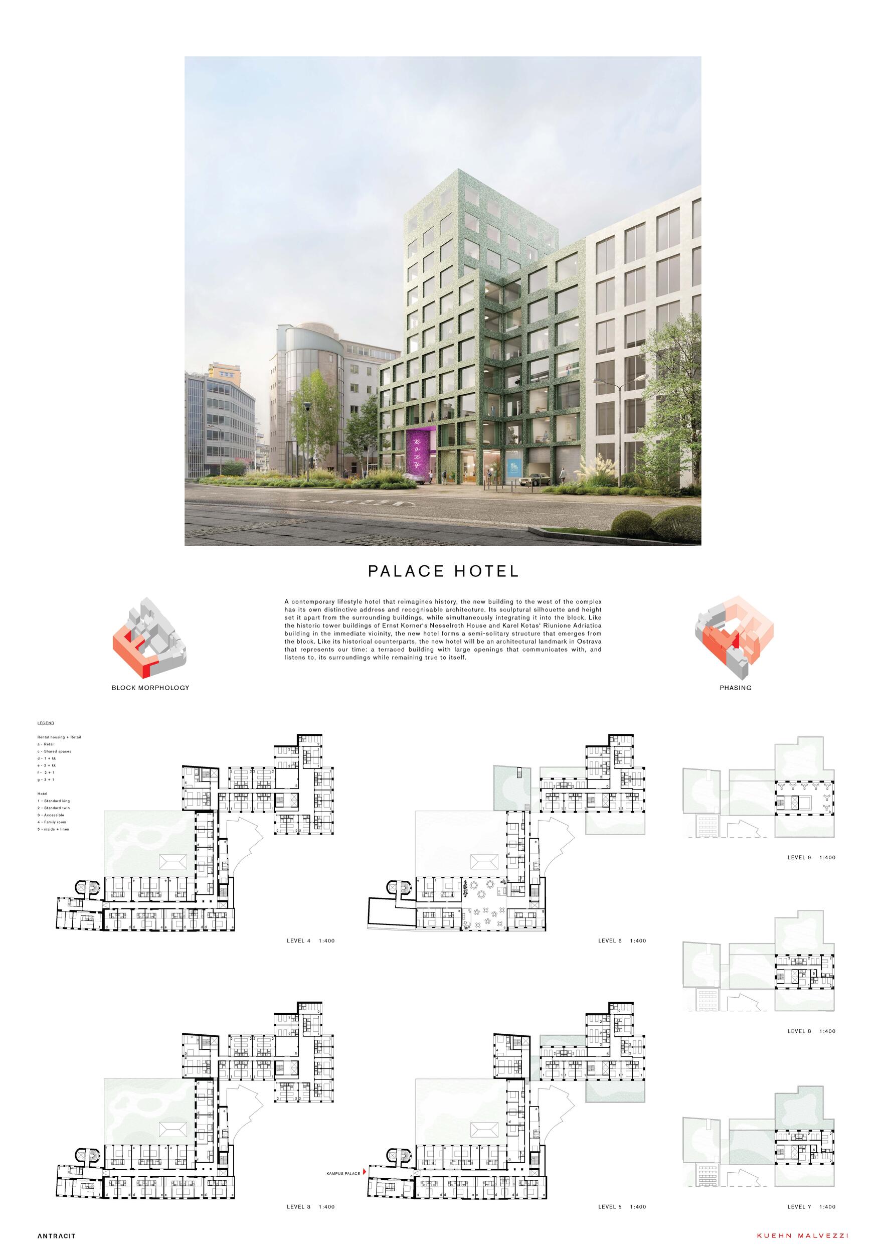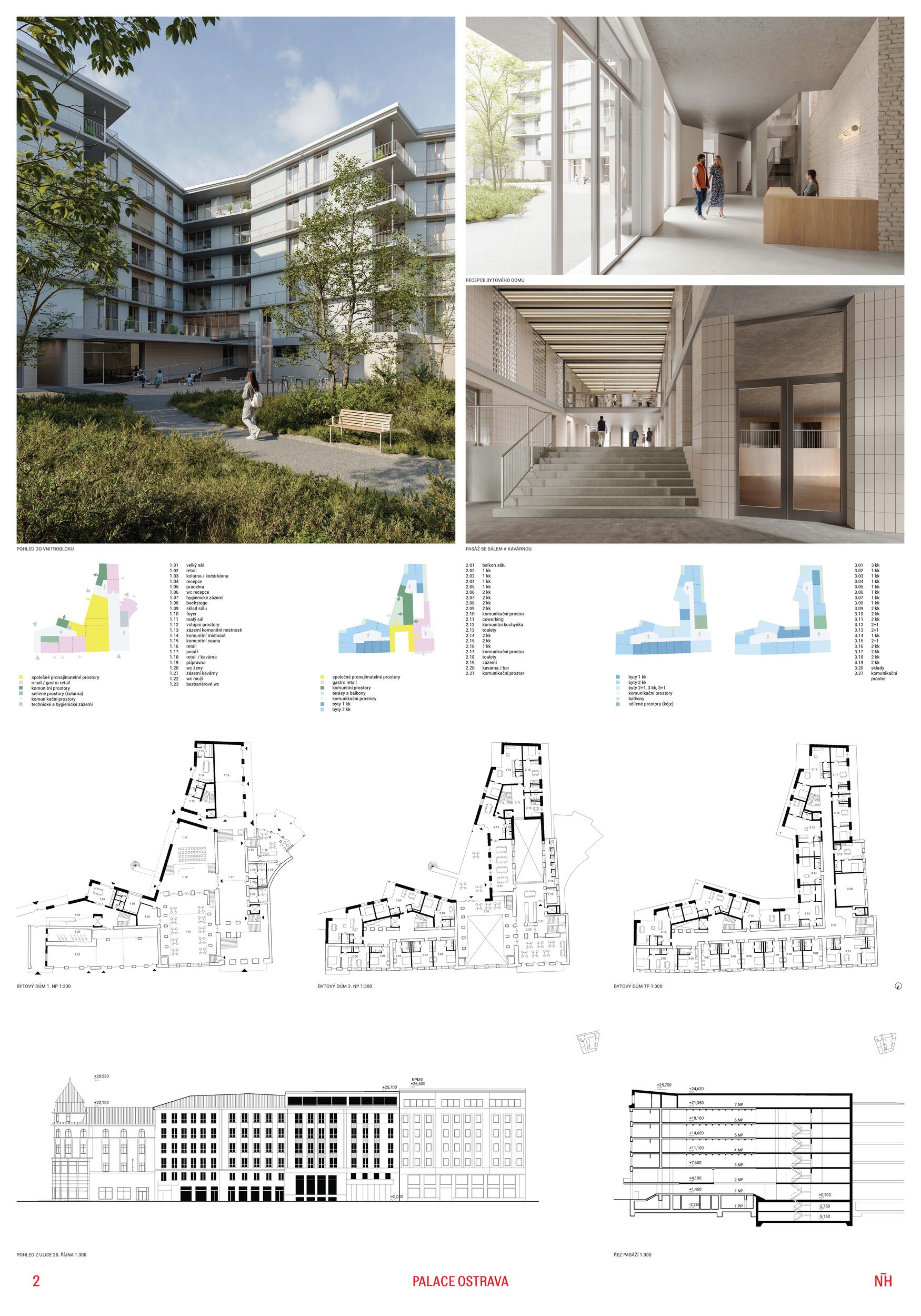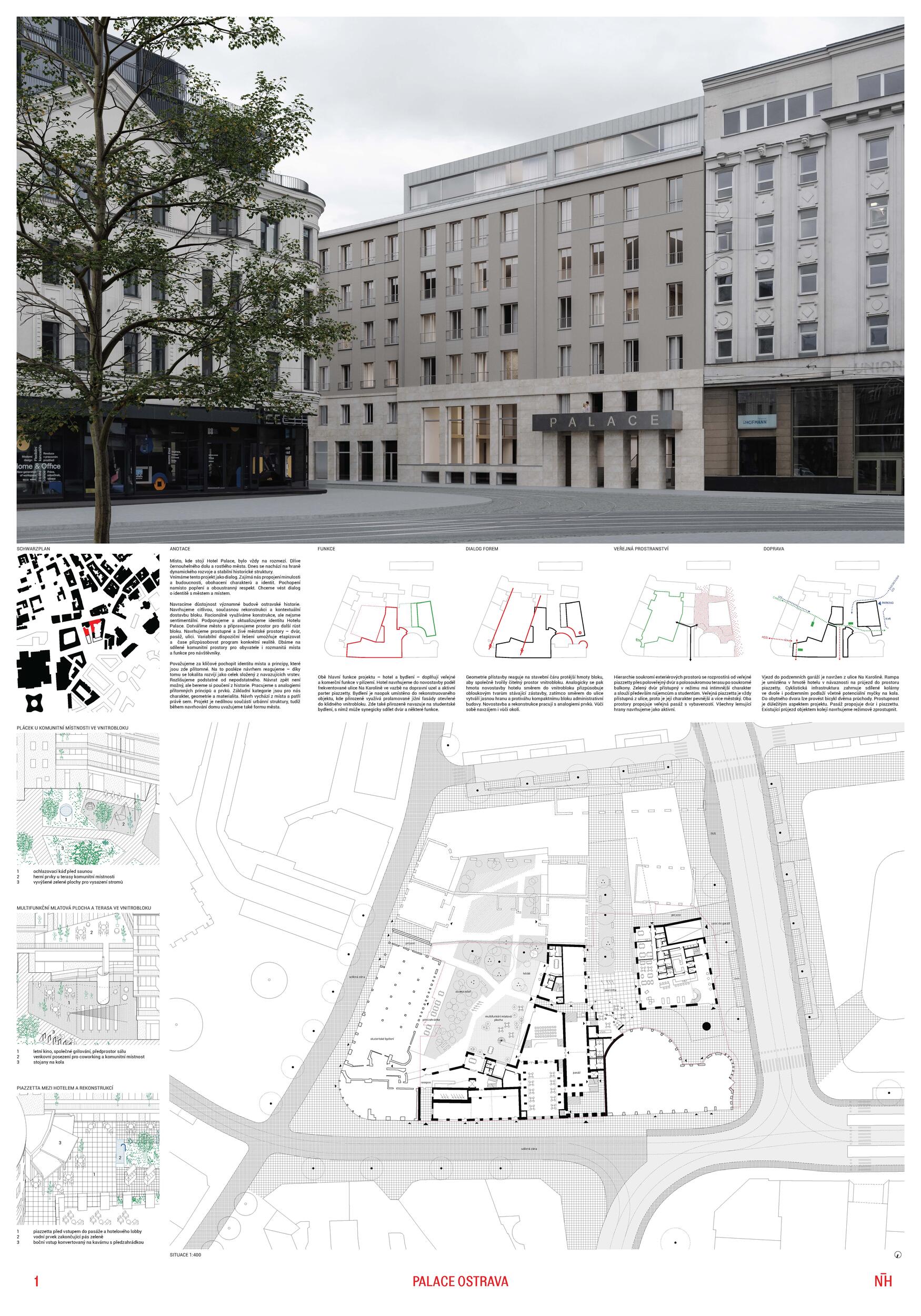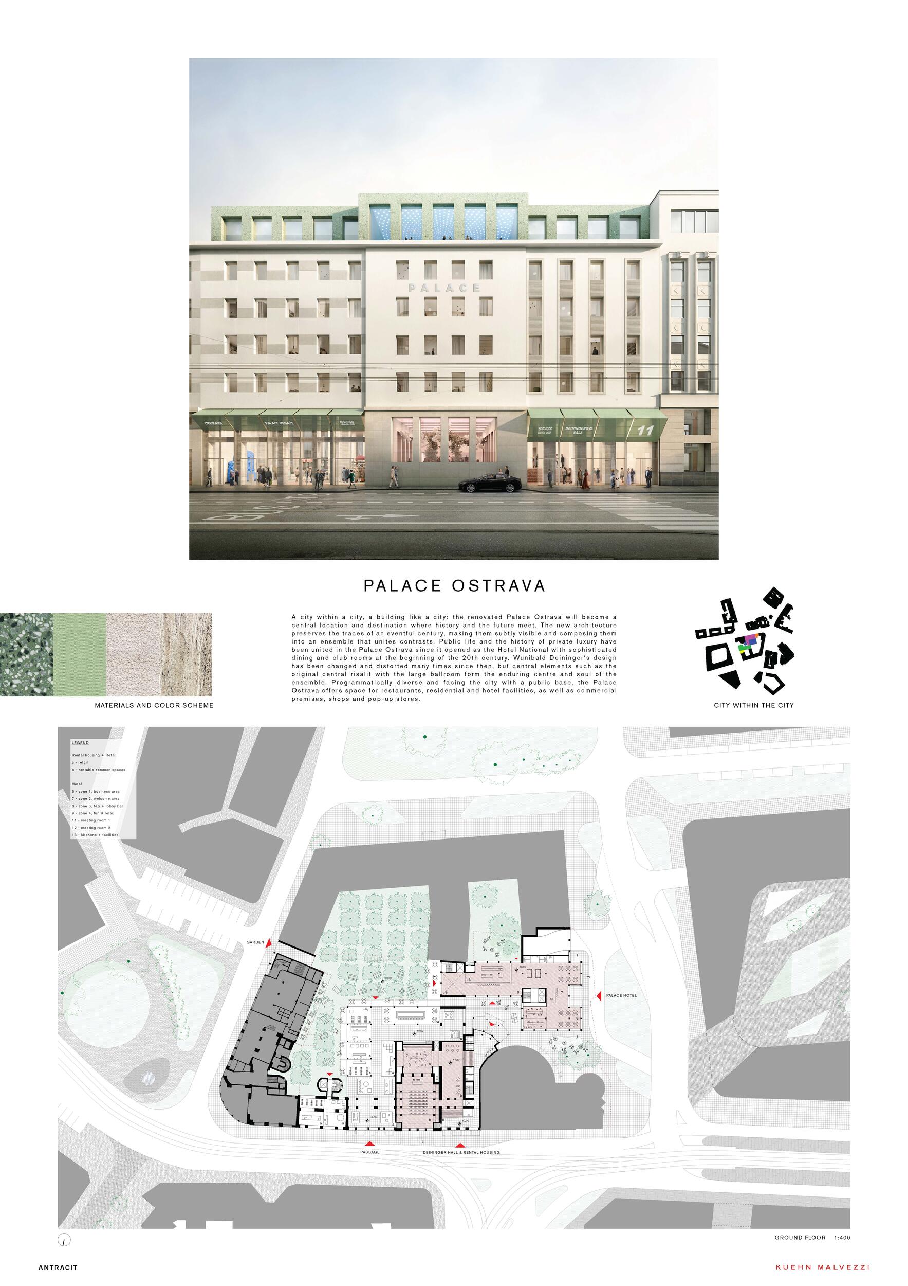 Město ve městě, budova jako město: zrenovovaný Palác Ostrava se stane centrálním místem a cílem, kde se setkává historie a budoucnost. Nová architektura zachovává stopy bouřlivého století, jemně je zpřítomňuje a skládá je do celku, který spojuje kontrasty. Veřejný život a historie soukromého luxusu jsou v Paláci Ostrava propojeny už od doby, kdy byl na počátku 20. století otevřen jako Hotel National s vytříbenou gastronomií a klubovými salonky. Návrh Wunibalda Deiningera byl od té doby mnohokrát upravován a pozměňován, ale klíčové prvky, jako původní centrální rizalit s velkým tanečním sálem, zůstávají trvalým srdcem a duší celého komplexu. Programově rozmanitý a orientovaný k městu s veřejným parterem nabízí Palác Ostrava prostory pro restaurace, bydlení a hotelové služby, stejně jako pro komerční prostory, obchody a pop-up prodejny.