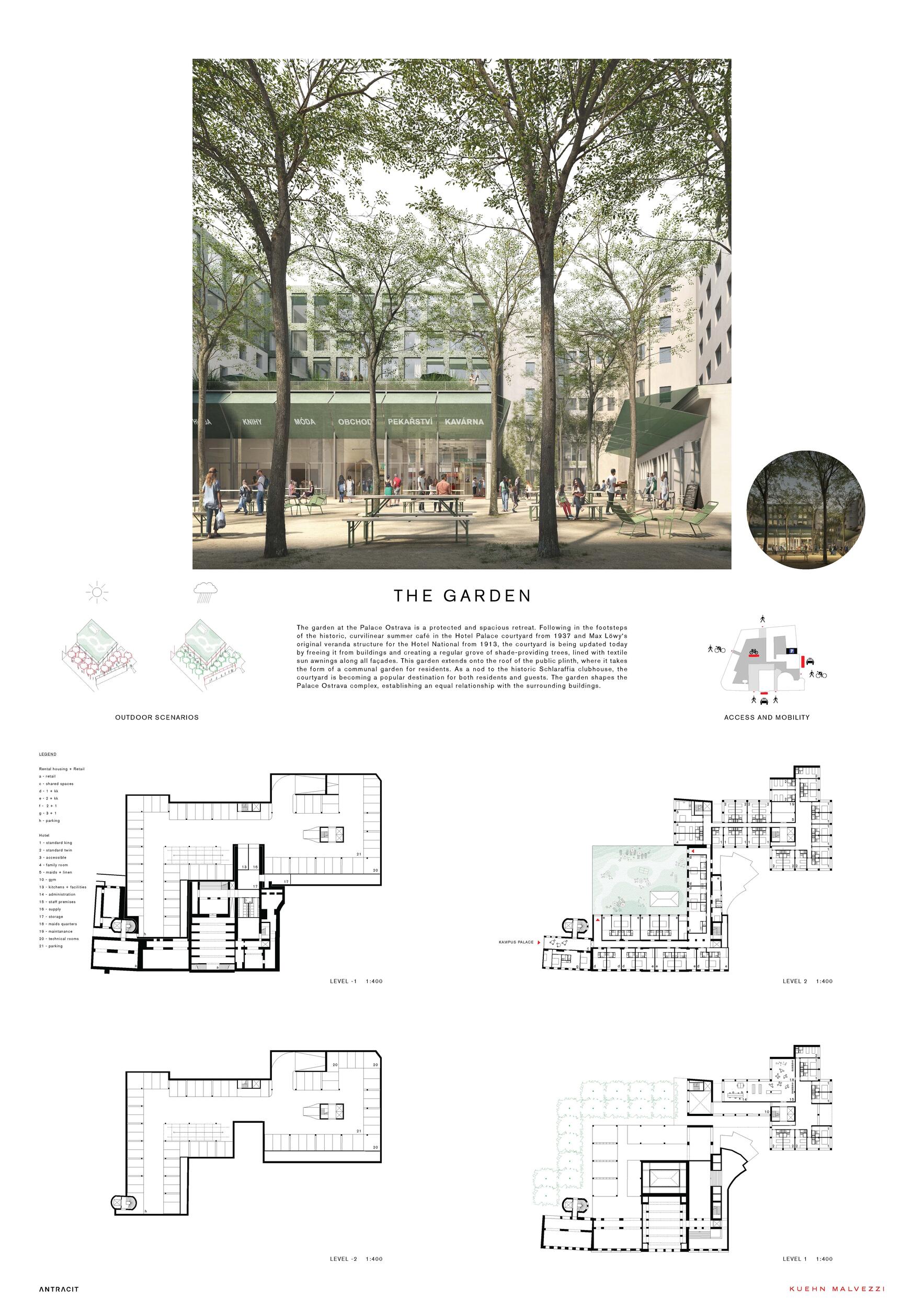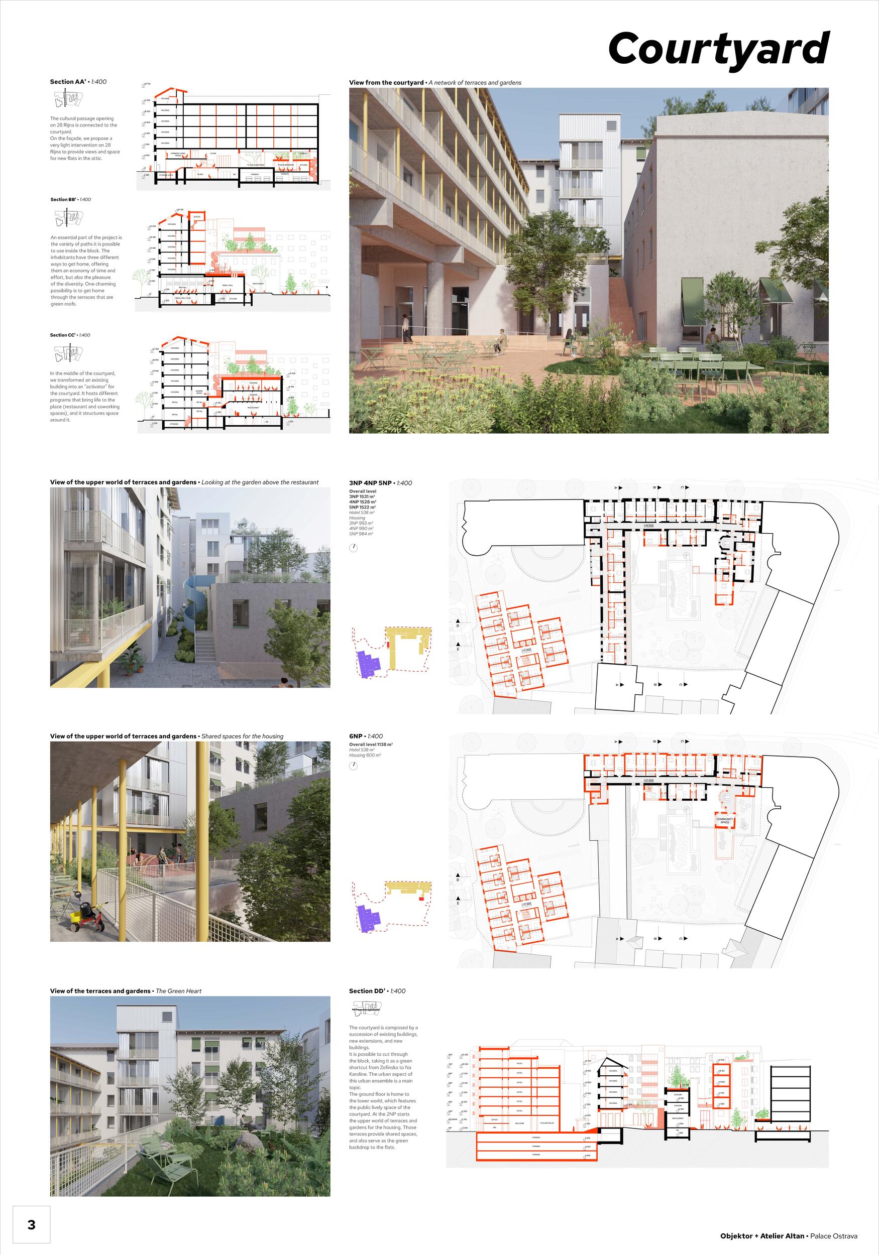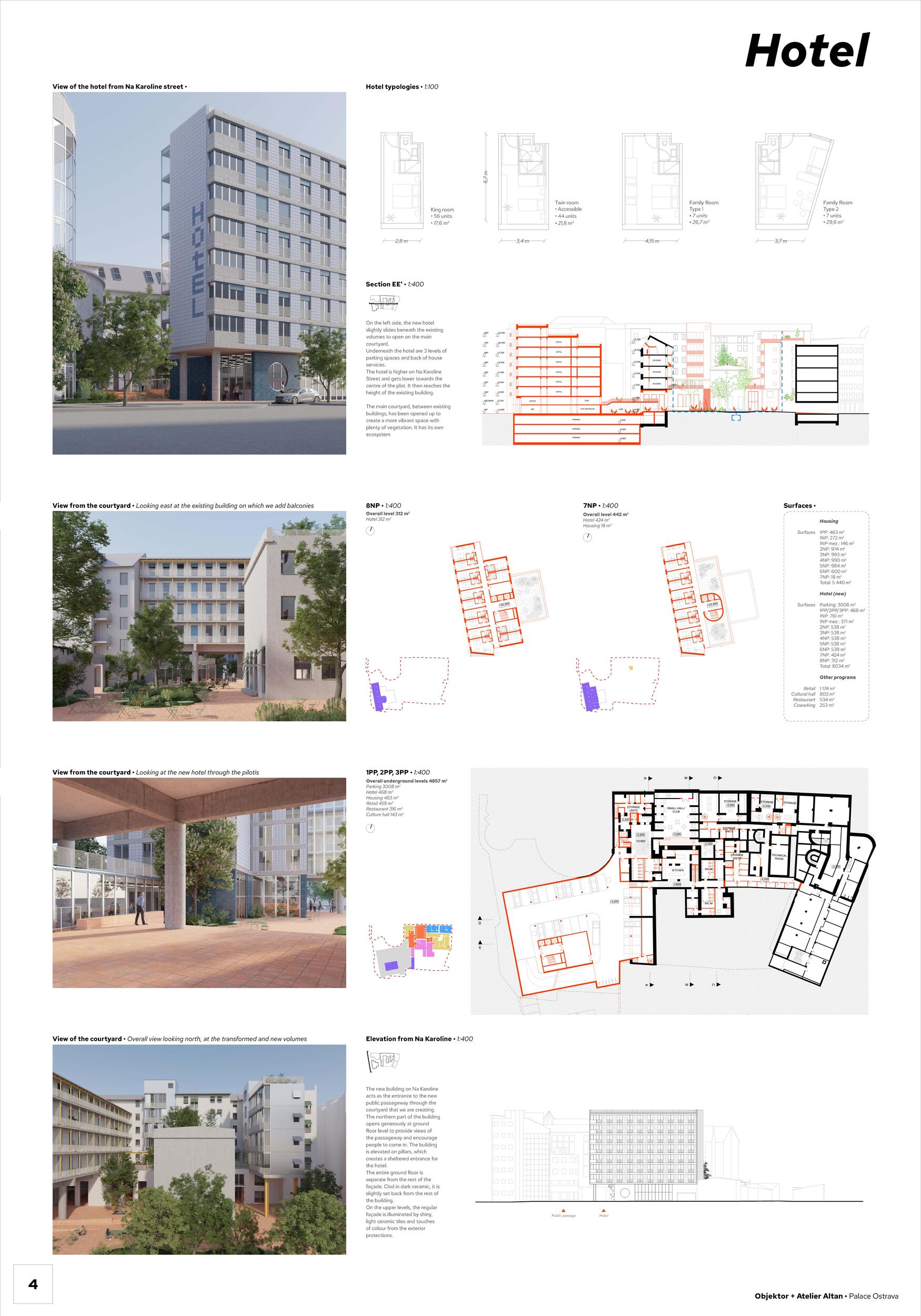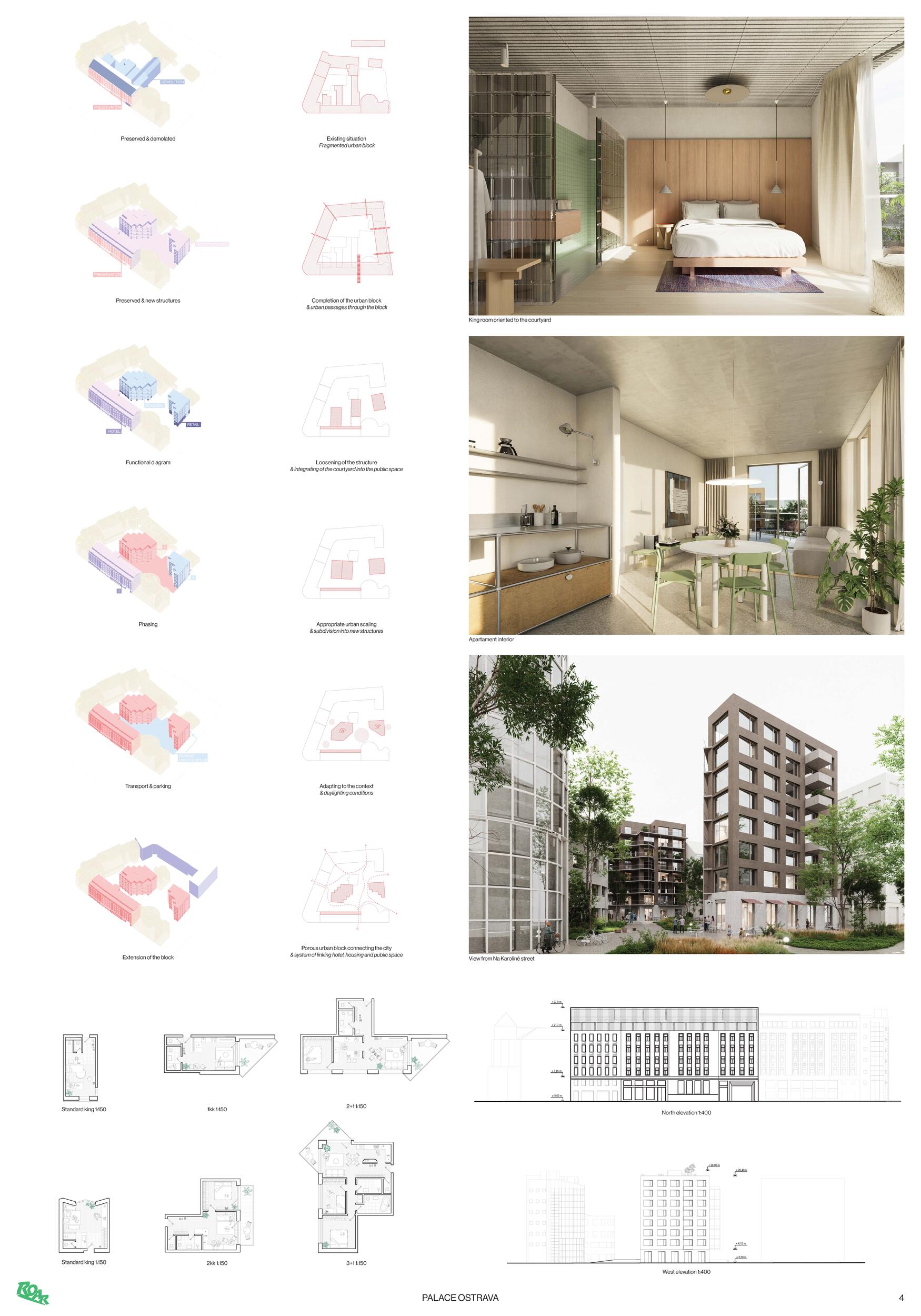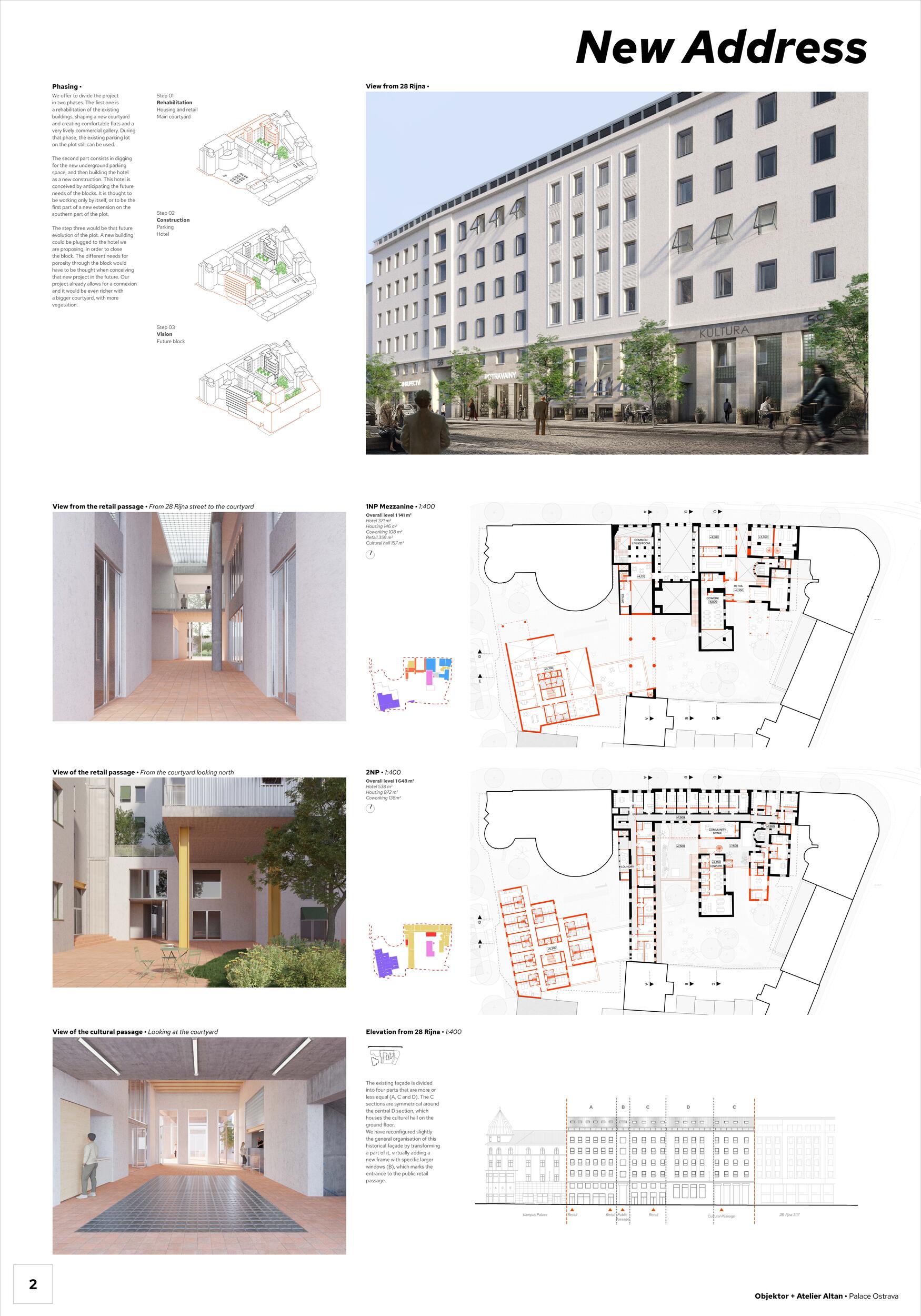 Město ve městě, budova jako město: zrenovovaný Palác Ostrava se stane centrálním místem a cílem, kde se setkává historie a budoucnost. Nová architektura zachovává stopy bouřlivého století, jemně je zpřítomňuje a skládá je do celku, který spojuje kontrasty. Veřejný život a historie soukromého luxusu jsou v Paláci Ostrava propojeny už od doby, kdy byl na počátku 20. století otevřen jako Hotel National s vytříbenou gastronomií a klubovými salonky. Návrh Wunibalda Deiningera byl od té doby mnohokrát upravován a pozměňován, ale klíčové prvky, jako původní centrální rizalit s velkým tanečním sálem, zůstávají trvalým srdcem a duší celého komplexu. Programově rozmanitý a orientovaný k městu s veřejným parterem nabízí Palác Ostrava prostory pro restaurace, bydlení a hotelové služby, stejně jako pro komerční prostory, obchody a pop-up prodejny.