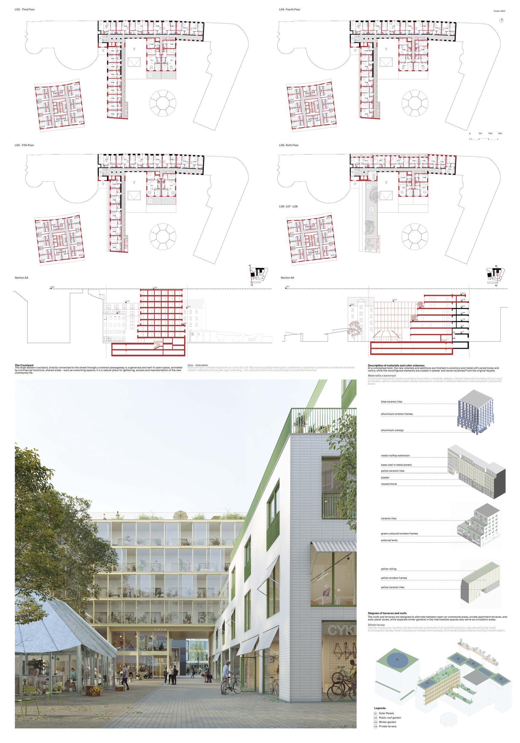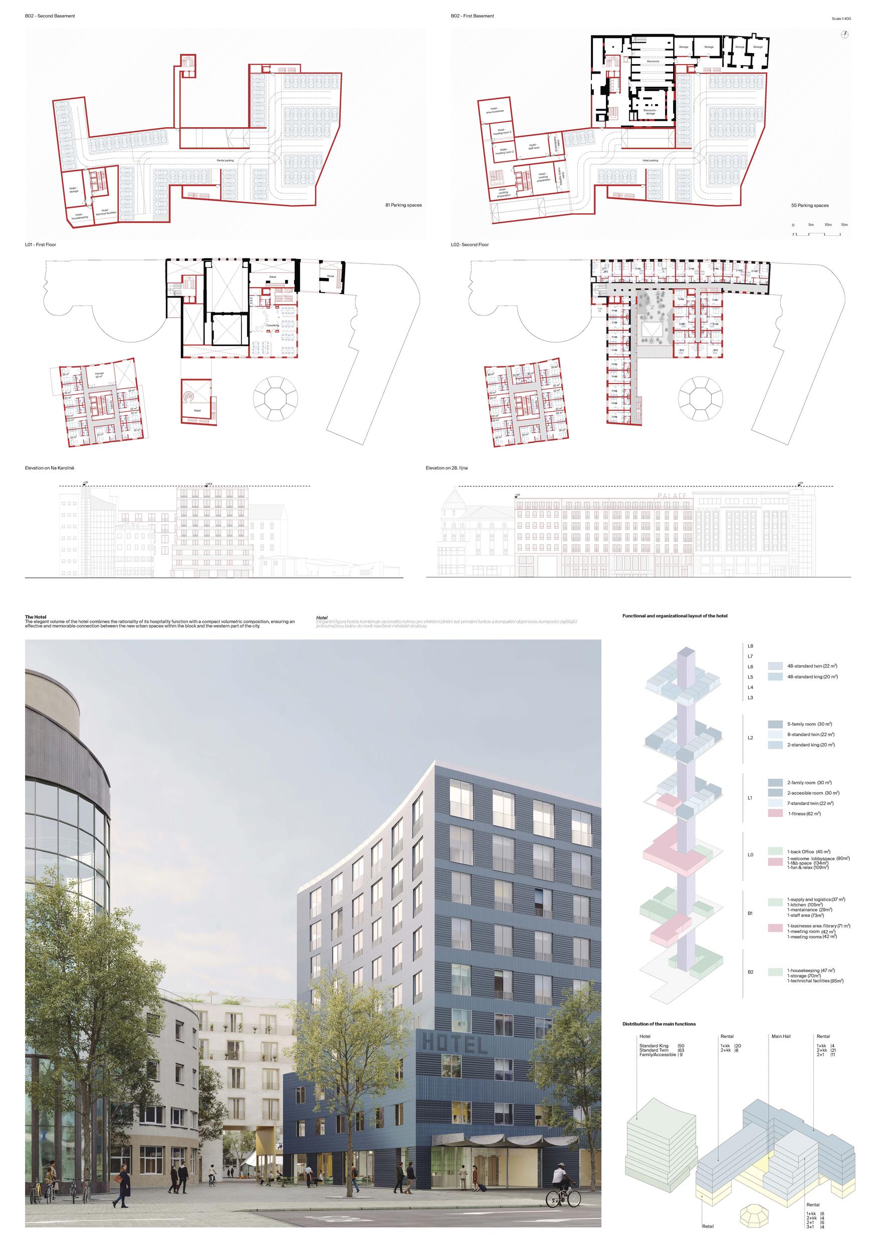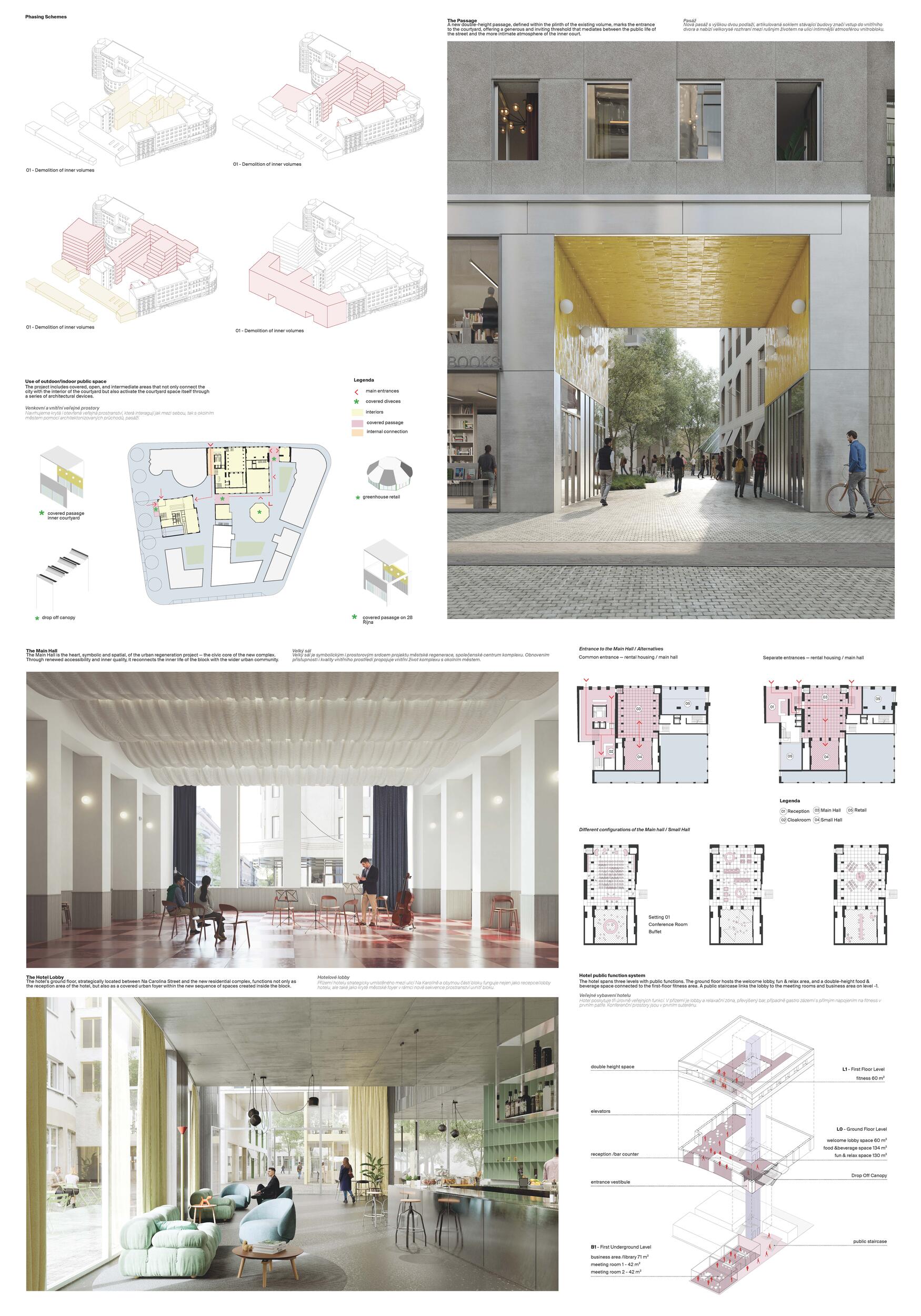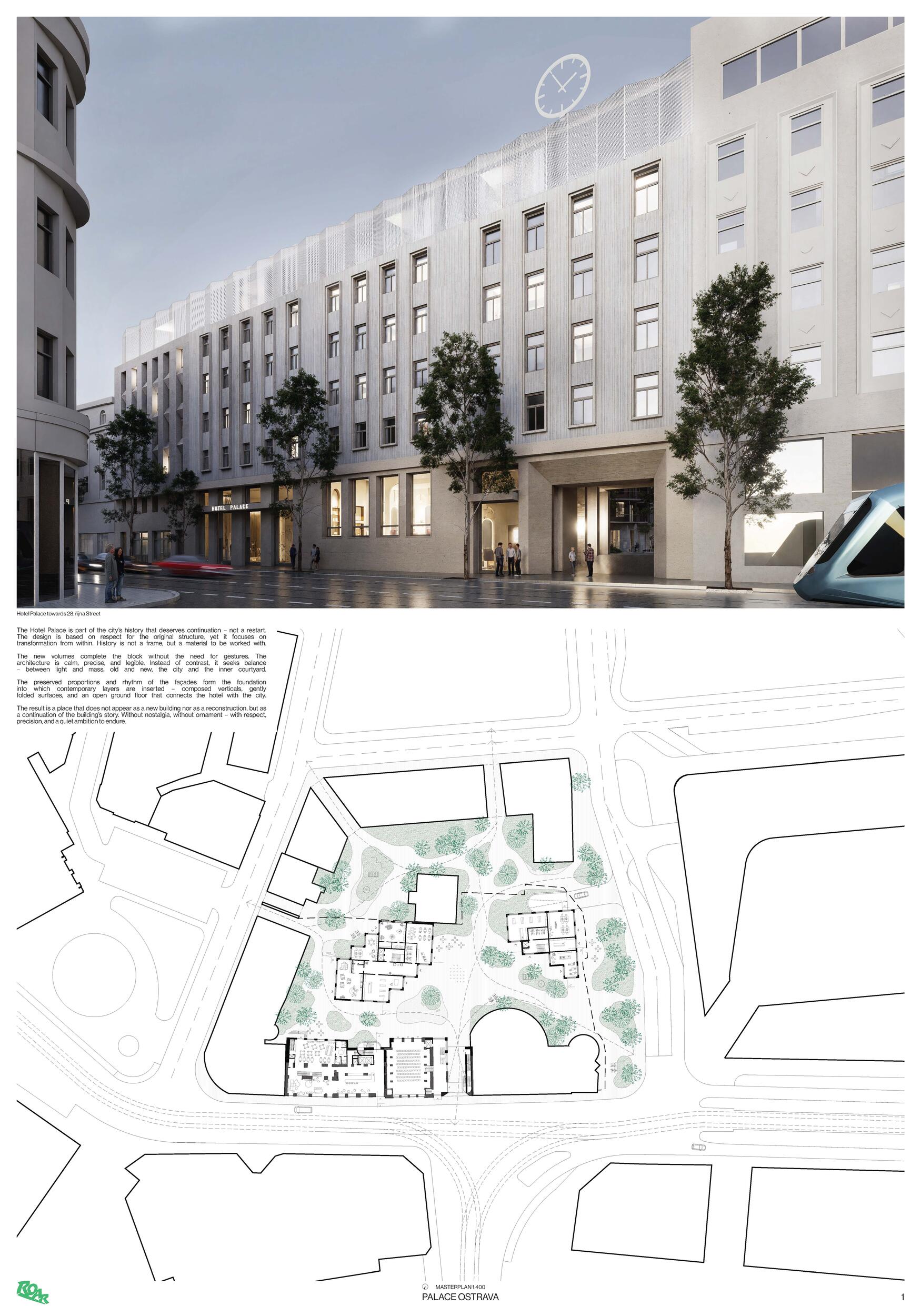 Projekt v příkladné míře ukazuje, jak pracovat v komplexní městské situaci utvářené fragmenty, historickými stopami a zaniklými strukturami. Architektům se daří nejen reinterpretovat původní funkce a znovu je zpřítomnit, ale také redefinovat celý městský blok vložením jediné kompozitní figury. Ta propojuje zachovanou strukturu podél ulice 28. října s novým objemem, který na západním okraji bloku vrcholí hotelovou věží. Druhá fáze na jižní části území pak blok dotváří pomocí dvou jasně vymezených vnitřních dvorů. Krytý pasážový průchod propojuje obě strany bloku, aniž by narušoval zelené plochy. Sjednocení programových funkcí do jedné kompozitní hmoty navíc umožňuje flexibilní rozdělování ploch mezi bydlení a hotel. Urbanistická figura vychází ze stávající morfologie, kdy nižší zástavba kolem dvorů graduje do volně stojící, sochařsky pojaté hotelové věže. Porota podporuje toto čtení okolní městské struktury, které připouští jediný objemový akcent přesahující běžnou výšku okolních budov. Navržená věž nicméně překračuje výškové limity uvedené v dokumentu vydaném pro soutěž Útvarem hlavního architekta města Ostravy (ÚHA MMO). Její přesná výška a proporce budou muset být dále zpřesněny ve spolupráci s investorem a lokálními orgány, aby se našla vhodná rovnováha mezi samostatným orientačním bodem a integrovaným výškovým akcentem v rámci blokové struktury. Porota oceňuje nejen analytickou práci s městskou morfologií, ale také výzkum a reflexi tvorby Wunibalda Deiningera, architekta původního Hotelu National. Na základě této analýzy si Kuehn Malvezzi vytvořili soubor architektonických nástrojů pro reinterpretaci a strukturování nových zásahů. Tyto nástroje mohou dále sloužit při navazujícím rozvoji návrhu, zejména v oblasti materiálového řešení fasád, detailu a interiérové architektury, a tím přispět k vyšší atmosférické i architektonické kvalitě. V parteru jsou vstupní sekvence i pasáž s navrženými obchodními jednotkami jasně strukturovány a prokazují flexibilitu pro různé typologie retailu. Celkově je projekt přesvědčivý svou reinterpretací historické morfologie Ostravy, výrazným uličním projevem a samostatně fungujícím hotelem s působivým objemovým výrazem na západní straně bloku.
