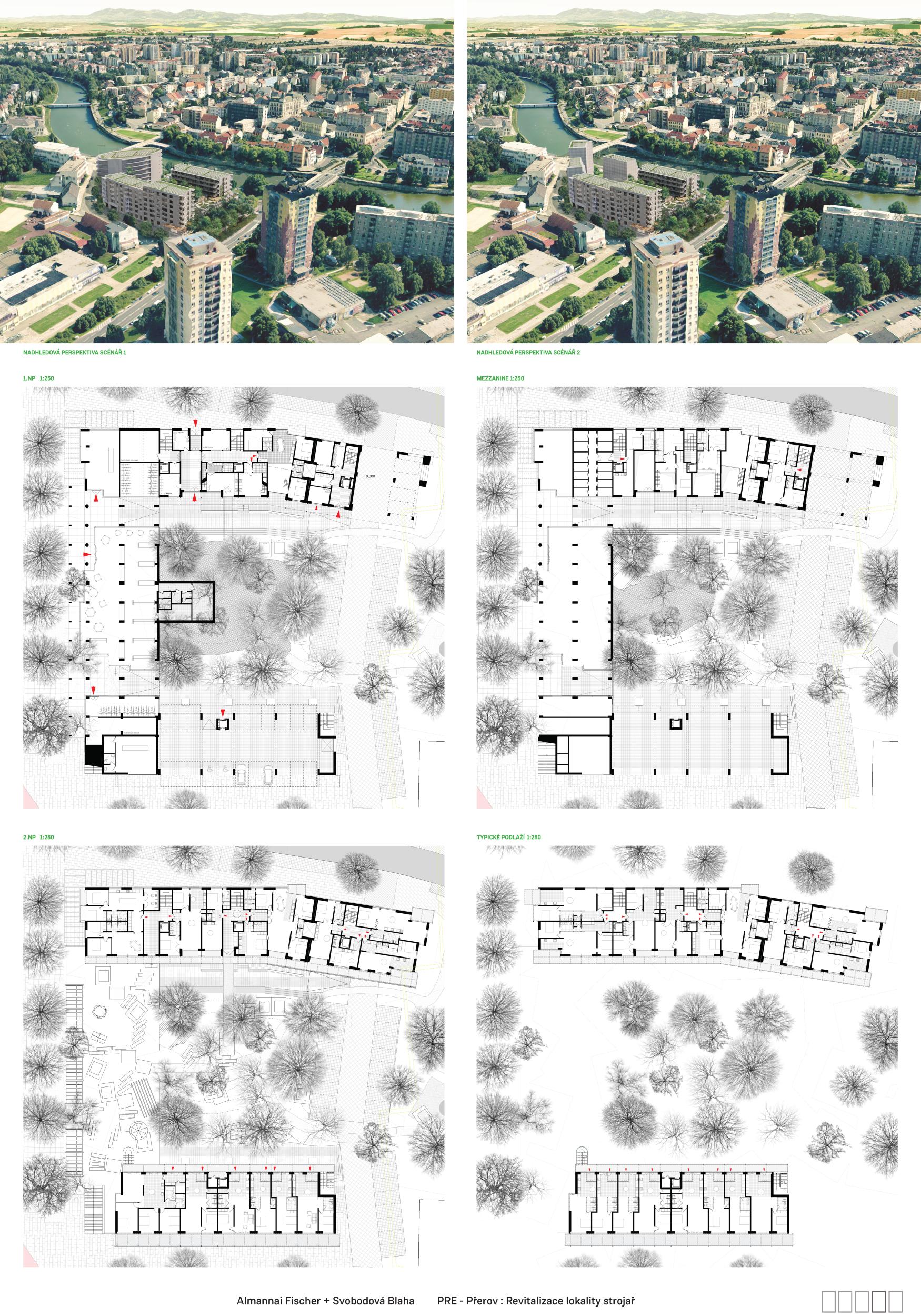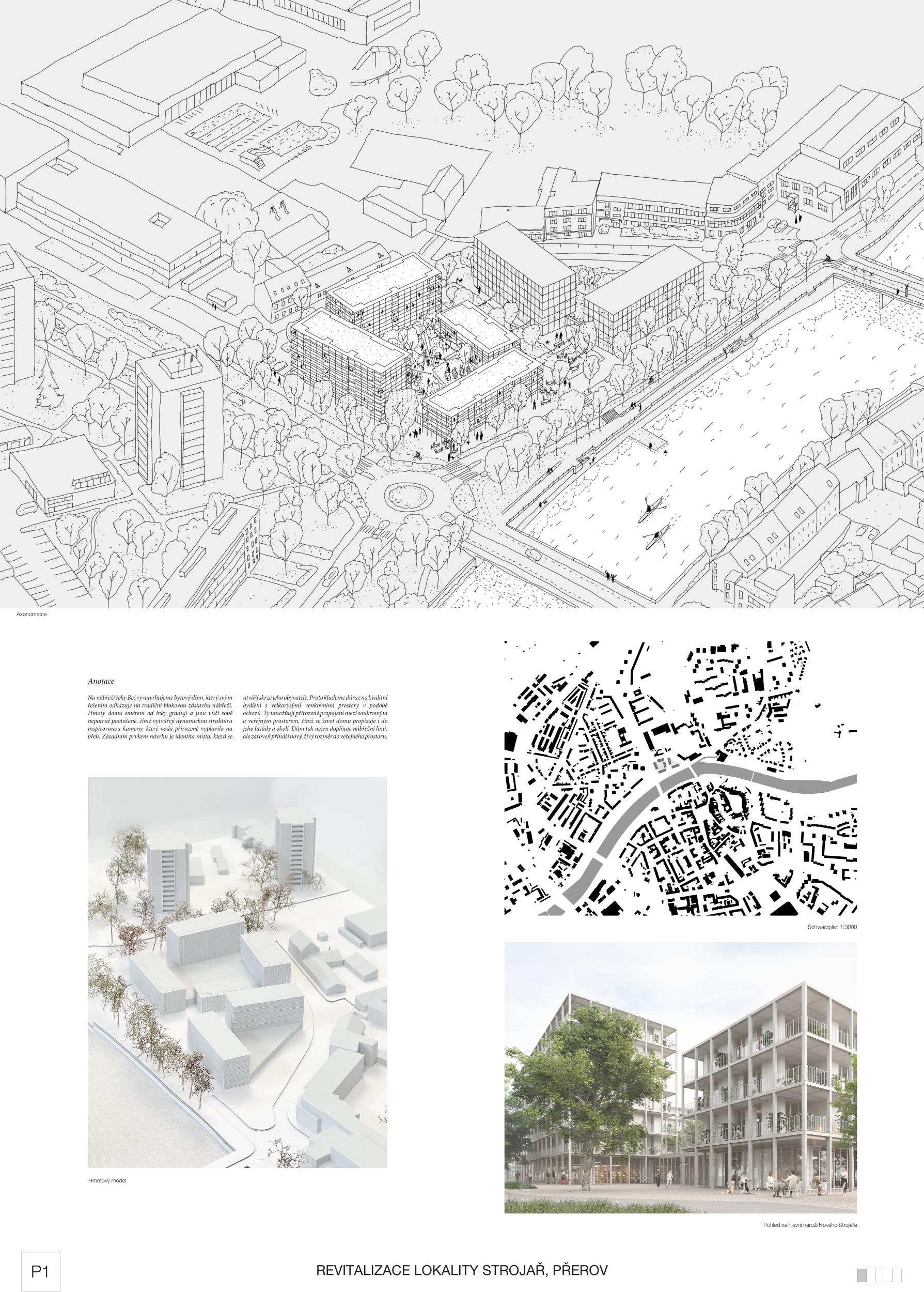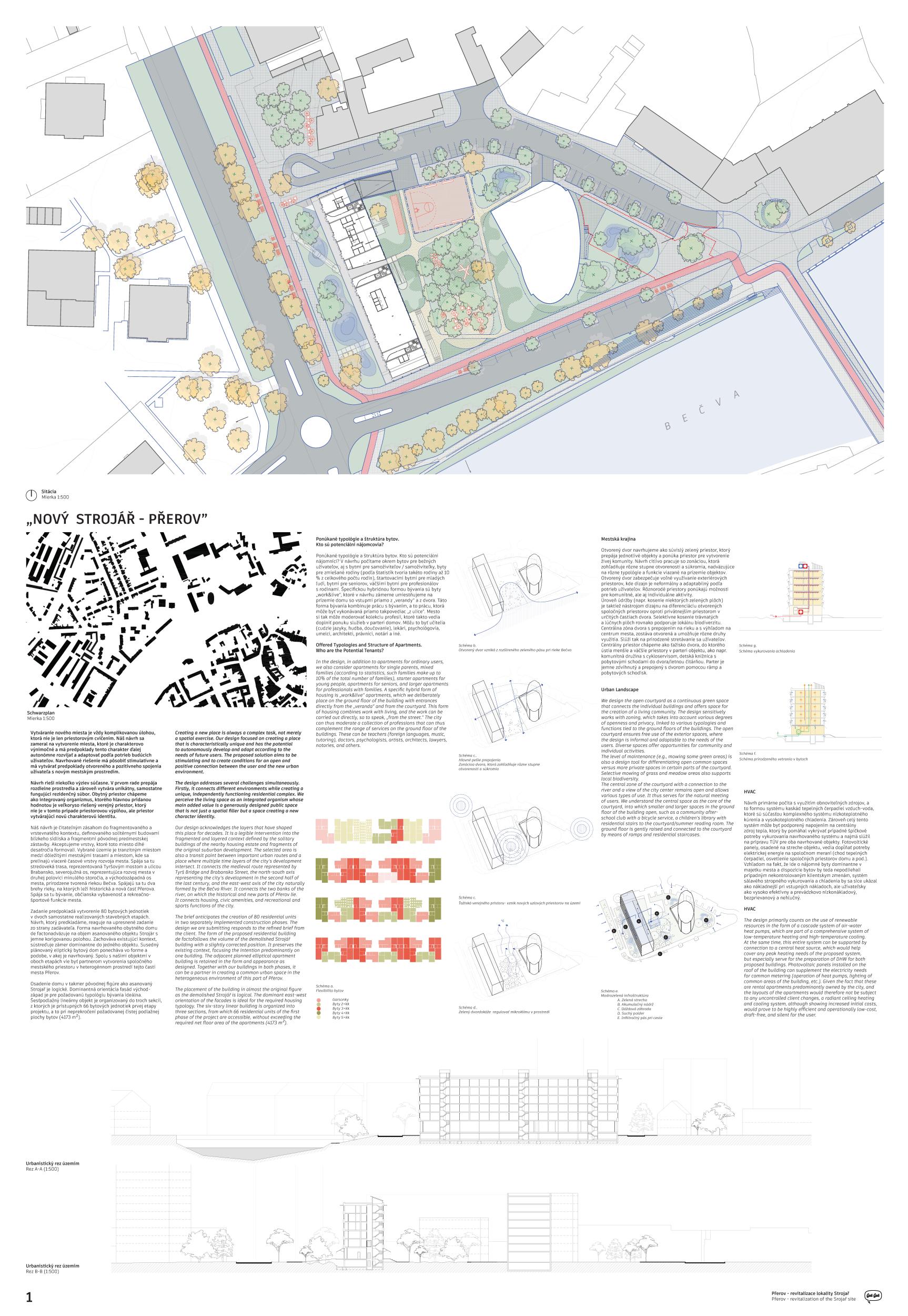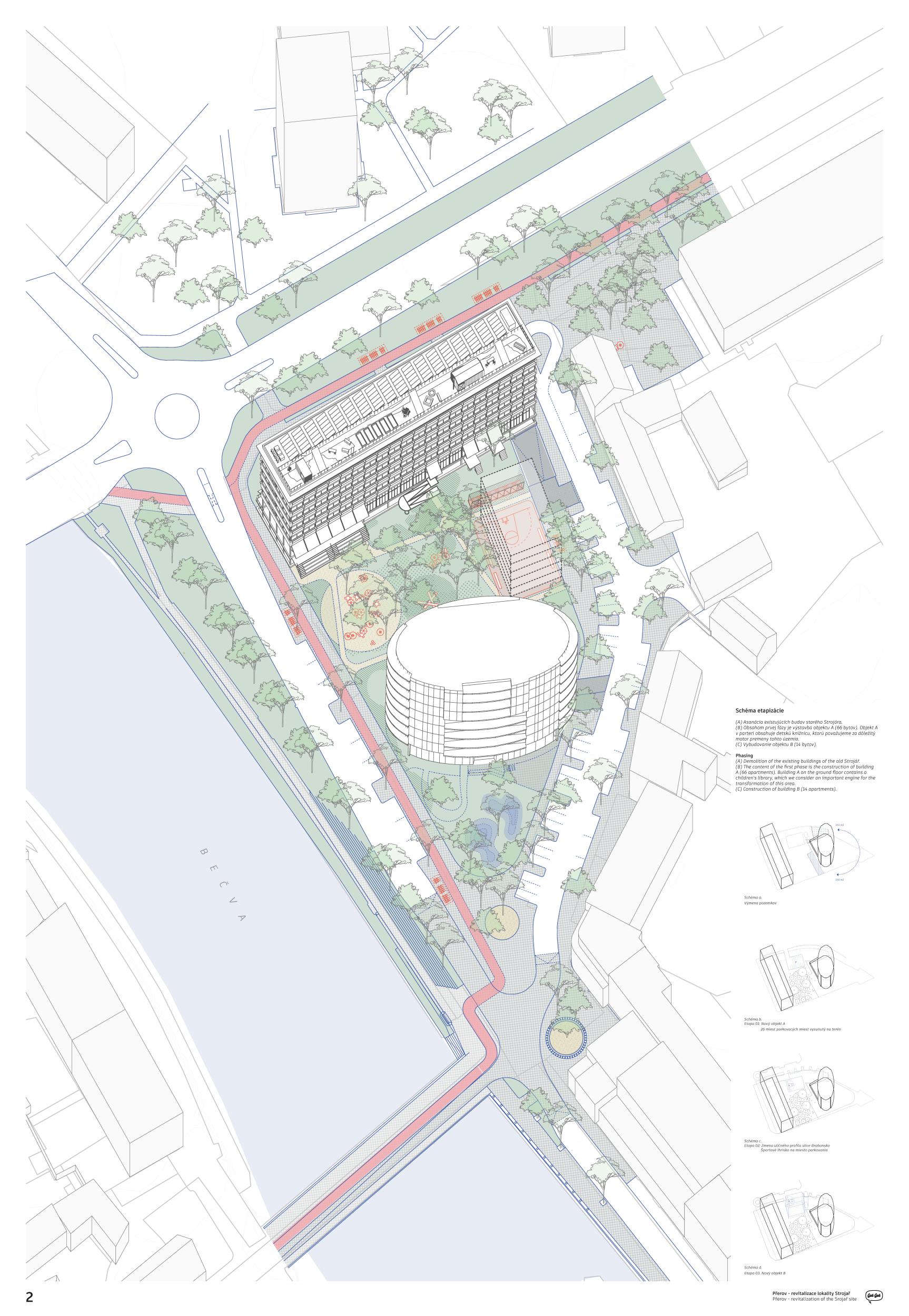 Urbanistické a hmotové řešení reaguje zejména na nábřežní pozici parcely s dálkovými výhledy na centrum města v jižním směru a zároveň na přilehlou komunikační osu, ulici Velká Dlážka. Program je rozdělen do dvou hlavních hmot – desek ve dvou řadách, které jsou orientovány delšími stranami k jižnímu slunci a zároveň dálkovým výhledům na centrum města a kopce v pozadí. Jejich vzájemný rozestup je dostatečný na to, aby vzniknul prostorný zelený dvůr a zůstaly zachovány srovnatelné kvality slunce a výhledu pro oba domy, potažmo byty. Z toho důvodu je také přední hmota řešena jako nižší a užší. Ze strany frekventované silnice a komunikační osy Velká Dlážka je pak navržena jednopodlažní hmota parteru s knihovnou v pozici přízemní části stávajícího hotelu, která vhodně navazuje a oživuje ulici a zároveň přirozeně vytváří polosoukromou část dvora a odcloňuje ji od dopravní zátěže. Nabízí se zachování bytelné přízemní monolitické části stavby, která má potenciál vytvořit kvalitní veřejný prostor s krytou částí loubí a zpevněným například mlatovým předprostorem s druhou řadou stromů a která dokáže pojmout knihovnu, ale také vytvořit velkorysé kryté vstupní prostory pro domy nebo parkování kol. Konstrukce je dimenzována na to, aby unesla pobytovou zelenou střechu, která vytváří jakousi novou základní úroveň pro obyvatele obou domů a na kterou je pro všechny zajištěn bezbariérový přístup přímo ze schodišť nebo pavlače. Na úroveň přízemí se pak směrem do středu parcely terén plynule svažuje. Je zde navržen porostlý kopec vzniklý částečně ze stavební suti bouraného hotelu, kterou tak nebude nutné draze odvážet za město a částečně z deponované zeminy a ornice z ostatních zastavovaných částí pozemku. Typologie bytů Jižní budova u nábřeží je řešena jako pavlačový dům. Z toho důvodu jsou v něm umístěny převážně byty typu garsonka, které by bylo jinak obtížné a neekonomické umístit do domu klasickým jádrem. Nespornou výhodou pavlače je pak možnost příčného provětrávání a prosvětlení bytů z více světových stran. Budova severní je pak řešena s klasickými jádry a disponuje byty o větší metráži. Snahou bylo dopřát všem bytům osvětlení ze dvou světových stran. Vznikají tak byty buď s hlubokou příčnou dispozicí a provětráním nebo koncové byty, naopak mělké, umožňující pohyb podél fasády. Jedním z témat návrhu je recyklace a uvážlivé nakládaní se stavebním odpadem po bourané budově současného Strojaře. Uprostřed urbanistického řešení navrhovaných budov, tak vznikl zelený kopec, který terénně propojuje vnitřek dvora se střešní pobytovou zahradou na budově B3. Jedná se o neformální a velmi civilně laděný veřejný prostor s vlastní atmosférou a mikroklimatem. Některé prvky odstraňovaného hotelu mohou být použity ve smyslu cirkulární ekonomiky jako obložení fasád, parkový mobiliář, drobné stavby skleníků či altánu, apod.