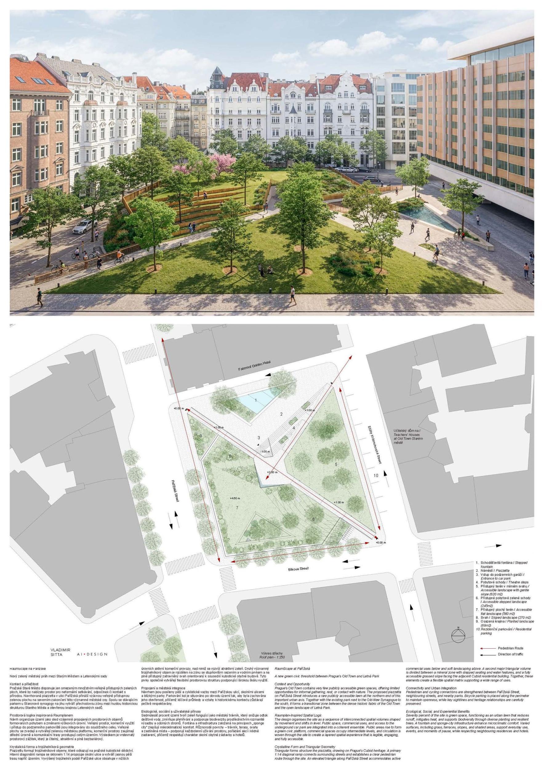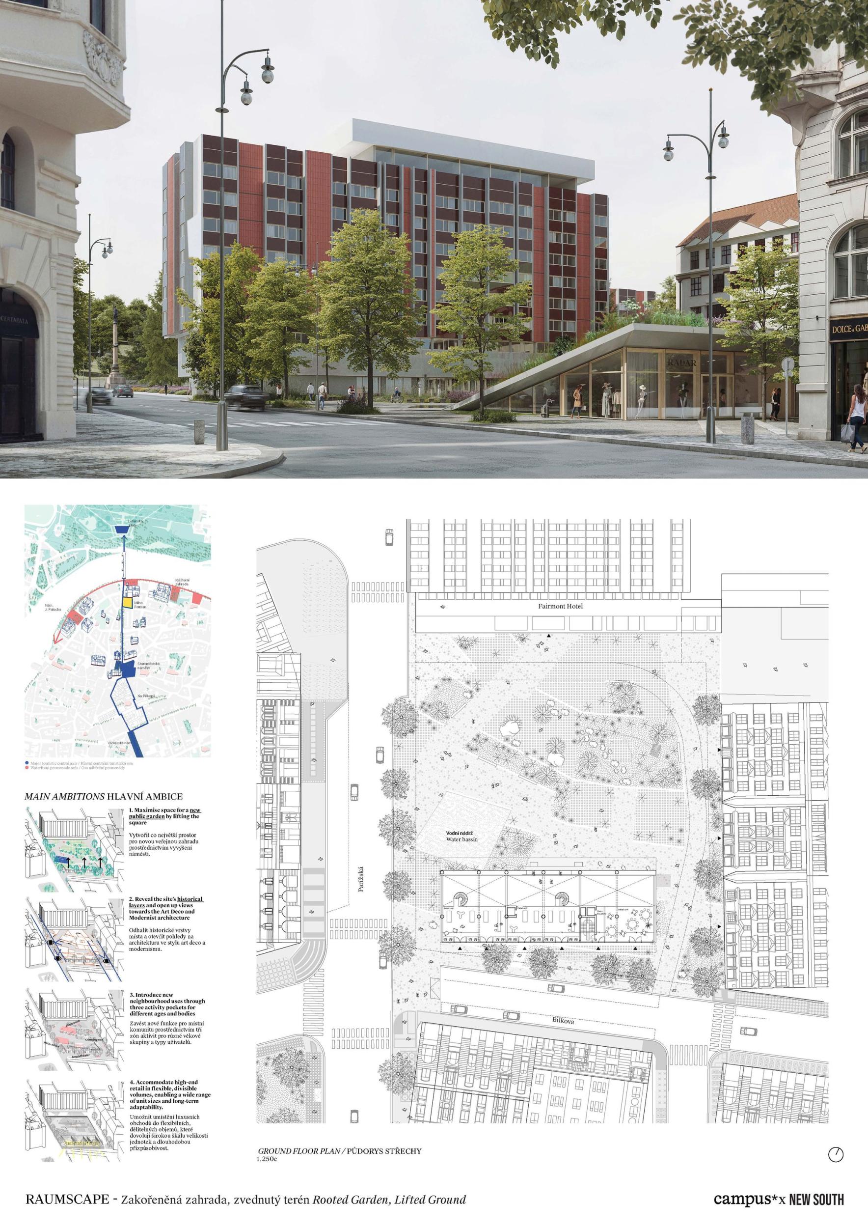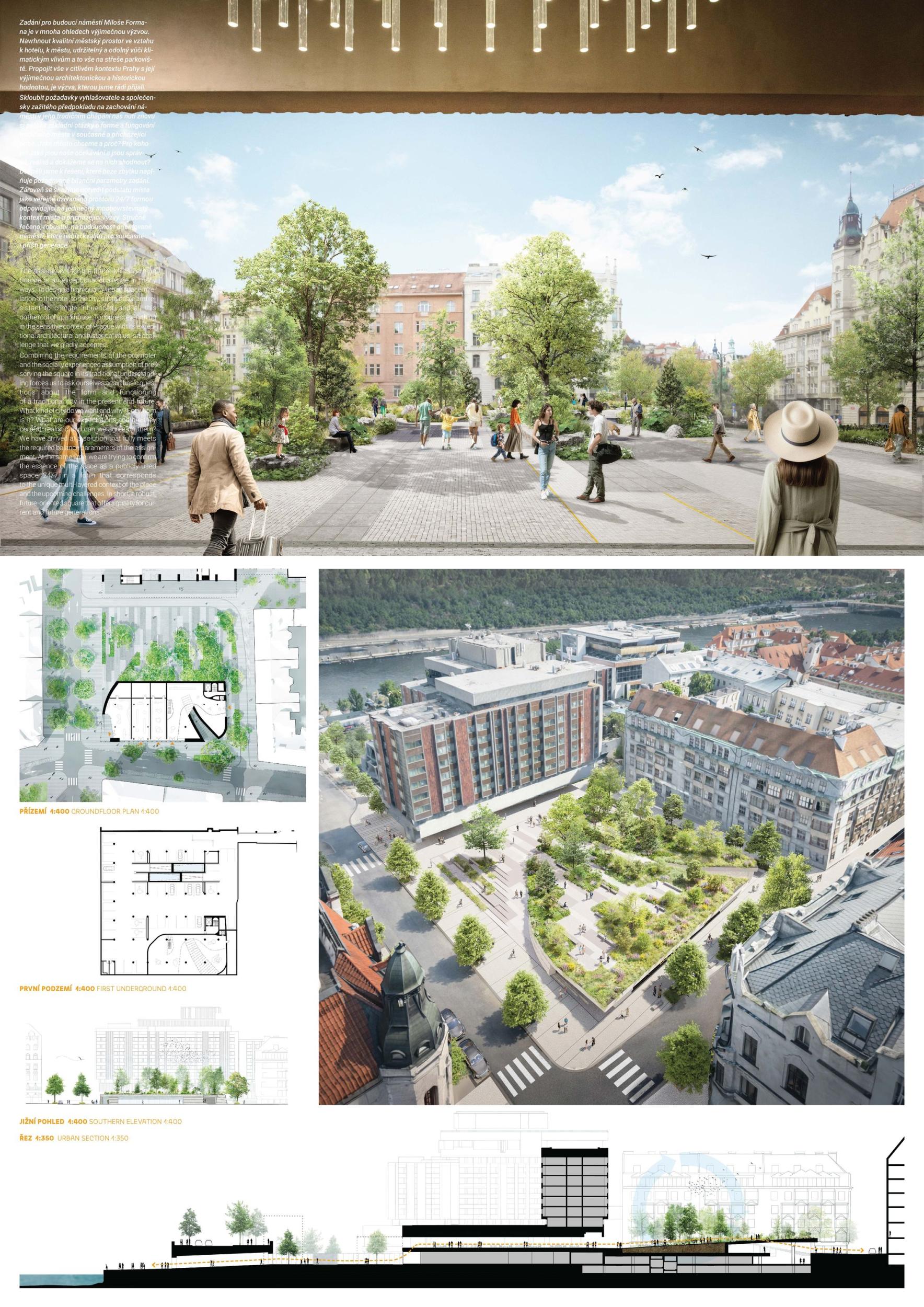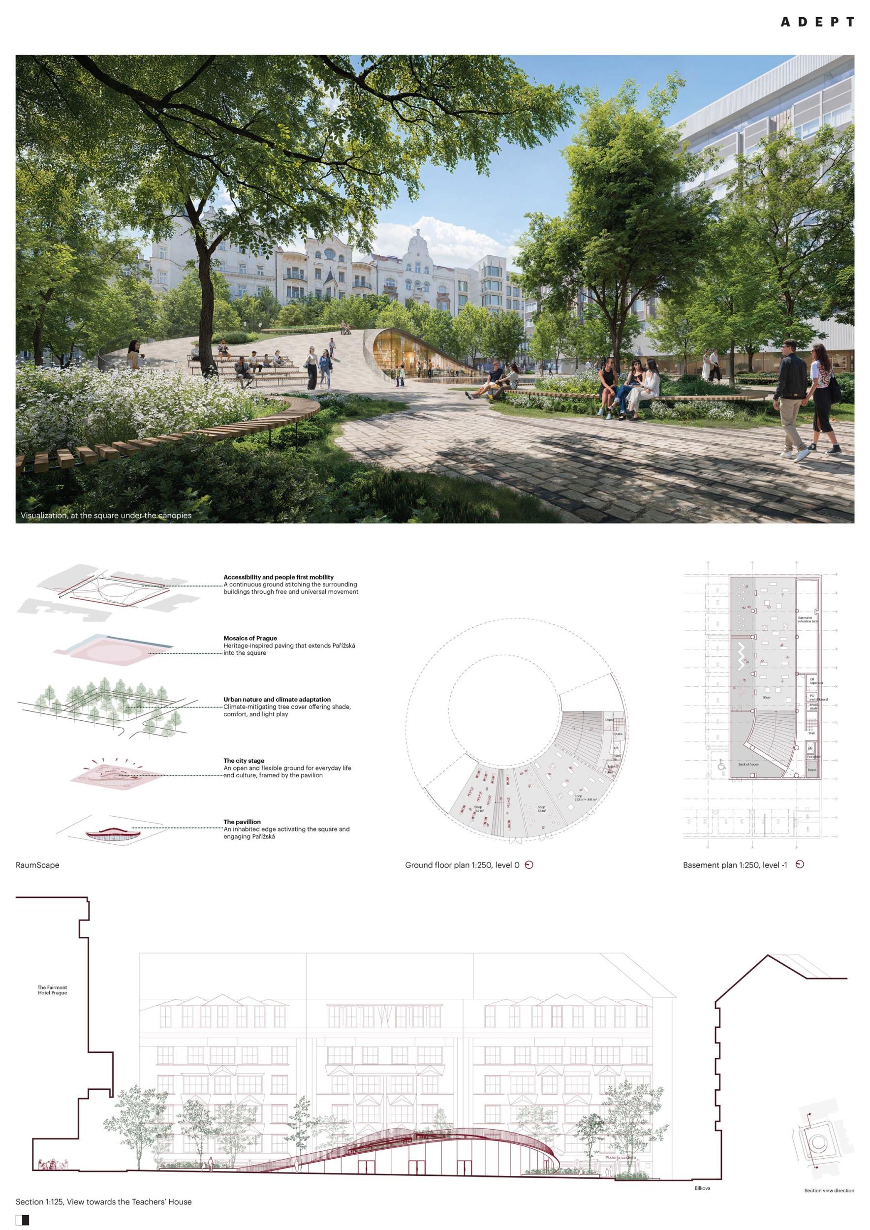 Projekt RaumScape rozvíjí náměstí Miloše Formana jako živou městskou krajinu v srdci pražského památkového území UNESCO. Návrh proměňuje dříve roztříštěný prostor v soudržné veřejné prostranství, které přirozeně propojuje okolní budovy a znovu napojuje náměstí na strukturu města. Koncepce je založena na vrstveném veřejném prostoru, v němž architektura a krajina společně vytvářejí dostupnost, komfort a plnohodnotný městský život. Souvislá pobytová plocha zajišťuje volný a bezbariérový pohyb napříč územím a propojuje Pařížskou ulici, hotel i okolní ulice do jednoho čitelného celku. Dláždění inspirované historickým kontextem navazuje na charakteristický pražský mozaikový jazyk a posiluje kontinuitu s historickou městskou strukturou. Stromový baldachýn z druhů odolných vůči klimatickým změnám vytváří příjemné městské mikroklima — poskytuje stín, ochlazení a sezónní proměnlivost, aniž by narušoval otevřenost a flexibilitu prostoru. V centru se náměstí Miloše Formana proměňuje v občanskou scénu — otevřenou a adaptabilní plochu pro každodenní život i pro kulturní akce, trhy a vystoupení v průběhu celého roku. Pavilon plynule vyrůstá z terénu jako obývaná hrana prostoru, aktivuje náměstí a navazuje dialog s Pařížskou ulicí. Jeho transparentní struktura podporuje veřejný život každodenními funkcemi, rámuje městskou scénu a rozšiřuje veřejný prostor na svou přístupnou střechu. Tyto vzájemně provázané vrstvy společně vytvářejí velkorysý, odolný a inkluzivní městský prostor — hluboce zakořeněný v identitě Prahy a navržený pro současný veřejný život.