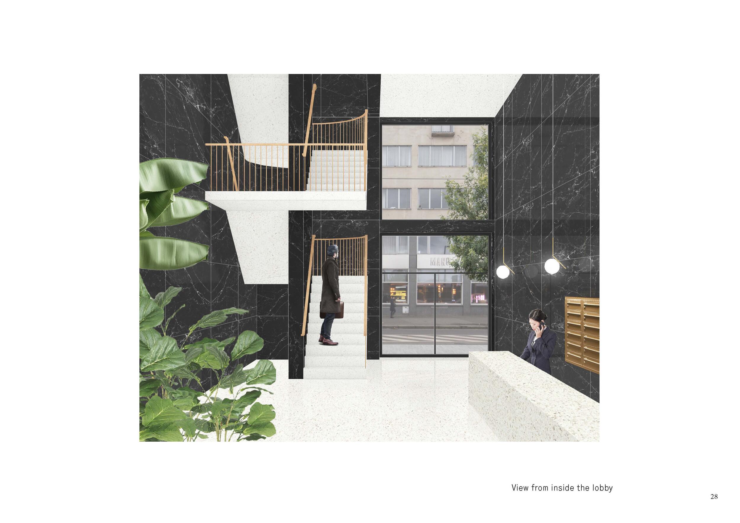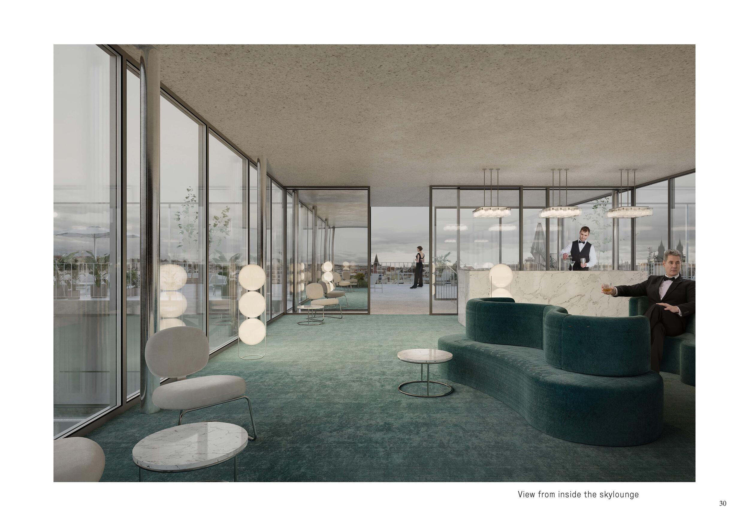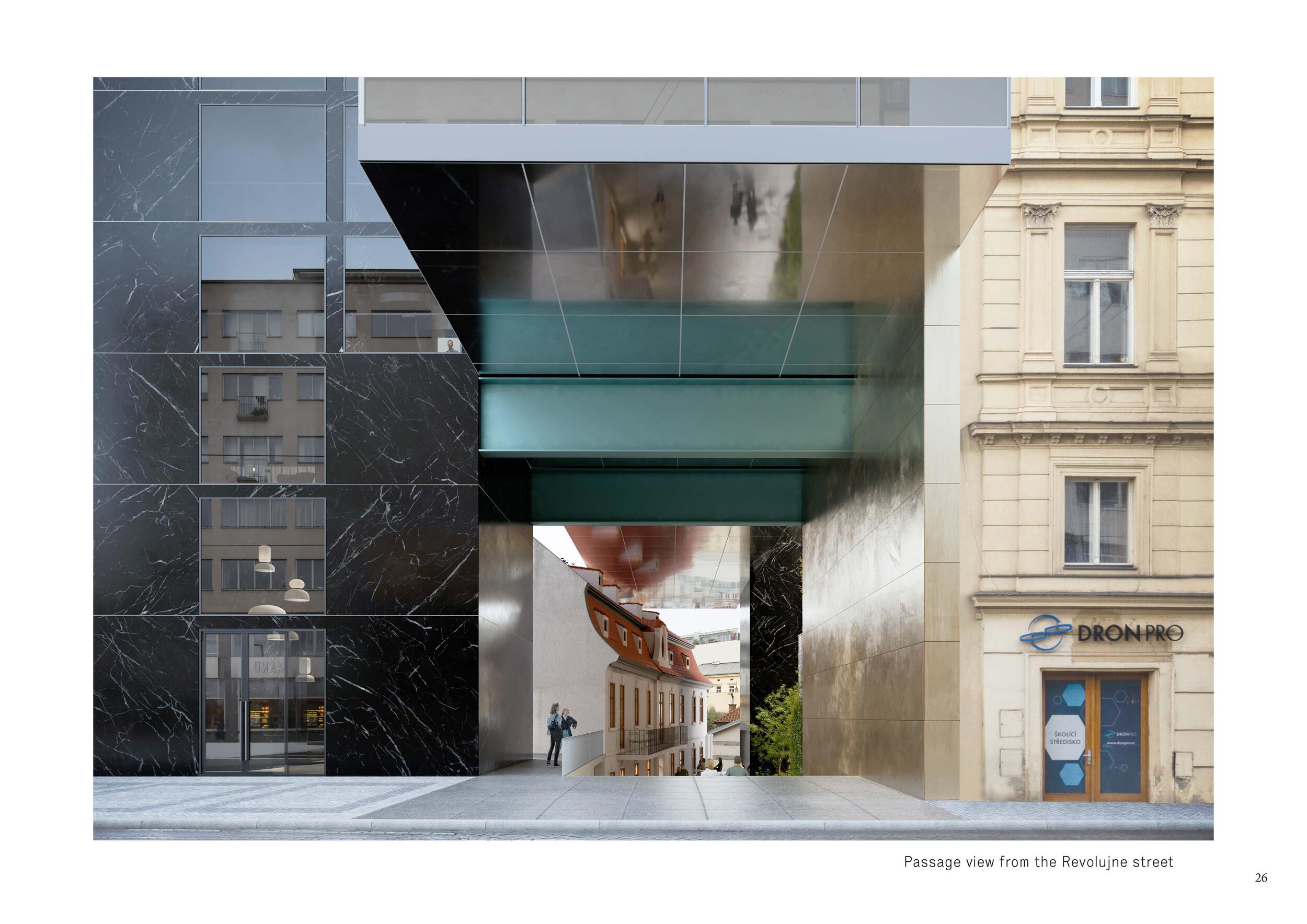 Přehled vývoje potvrzuje, že řešení této výzvy vyžaduje inovativní přístup: městská brána, která vytváří toto předmostí, by měla nabídnout harmonii mezi exkluzivitou a ikoničností, vzdušností a atmosférou nové architektury, která se s úctou tyčí nad stávající historickou městskou strukturou. Nové kvality tohoto prostředí jsou podpořeny zhodnocením parteru jako veřejného prostoru parteru a obohacením "stověžaté" Prahy o nový vertikální akord. Samotná budova by měla svým uživatelům poskytnout řadu dobrodružství: průchod v parteru, v němž rezonuje historická paměť v konfrontaci s duchem nové doby, labyrint vertikálních a horizontálních propojení v polaritě mezi veřejnou a soukromou sférou a v neposlední řadě atraktivní výhledy na Letnou a střešní krajinu historického jádra Prahy, vrcholící v "Sky-lounge" na střešní terase. To vše je podpořeno důmyslným konstrukčním systémem, širokou flexibilitou poskytovaných bytů včetně mezonetů a horizontálních "vil", rozmanitou strukturou ušlechtilých materiálů použitých v exteriérech a interiérech a nápaditou technologií osvětlení, která zdůrazňuje prostorové hodnoty celého komplexu a jeho historického okolí. Návrh sleduje zejména následující cíle: 1 - najít správnou rovnováhu mezi exkluzivitou a ikoničností - projekt chce být POZORUHODNÝ / 2 - zaměřit se na kvalitu společných prostor - zejména na kvalitu živé pasáže a vyhlídkové střešní terasy s 360stupňovým výhledem do krajiny a na město / 3 - pojmout typologii bydlení jako horizontální vily - prostory s kvalitními výhledy a maximální flexibilitou interiéru / 4 - učinit projekt pozoruhodným nejen svým designem, ale (a to je možná důležitější) i zážitkem z prostoru a výhledů pro obyvatele a náhodné návštěvníky. Těmito prostředky má ambici stát se důstojným protějškem paláce MERKUR a ikonou nové Prahy - její tradice, inovace a fascinace - na prahu třetího tisíciletí. V návrhu je rovněž kladen důraz na otevření a zpřístupnění přízemí s dalšími funkcemi ve spojení se stávající barokní hmotou. Navazuje se tak na tradici historických a novodobých pražských pasáží, aby byla budova zasazena do širšího městského kontextu. Figura bytového domu, sjednocená do jediné plovoucí hmoty nad pasáží, zdůrazňuje rozdíl mezi veřejnou a soukromou sférou, nabízí lukrativní výhledy na centrální prostor Prahy a výtvarně atraktivní a lehké působení struktury materiálu ztvárněním pláště. Dispozice bytů nabízí maximální flexibilitu s ohledem na specifika potřeb uživatelů. Tyto principy mají reprezentovat kulturu a technologické a funkční standardy jednadvacátého století.
