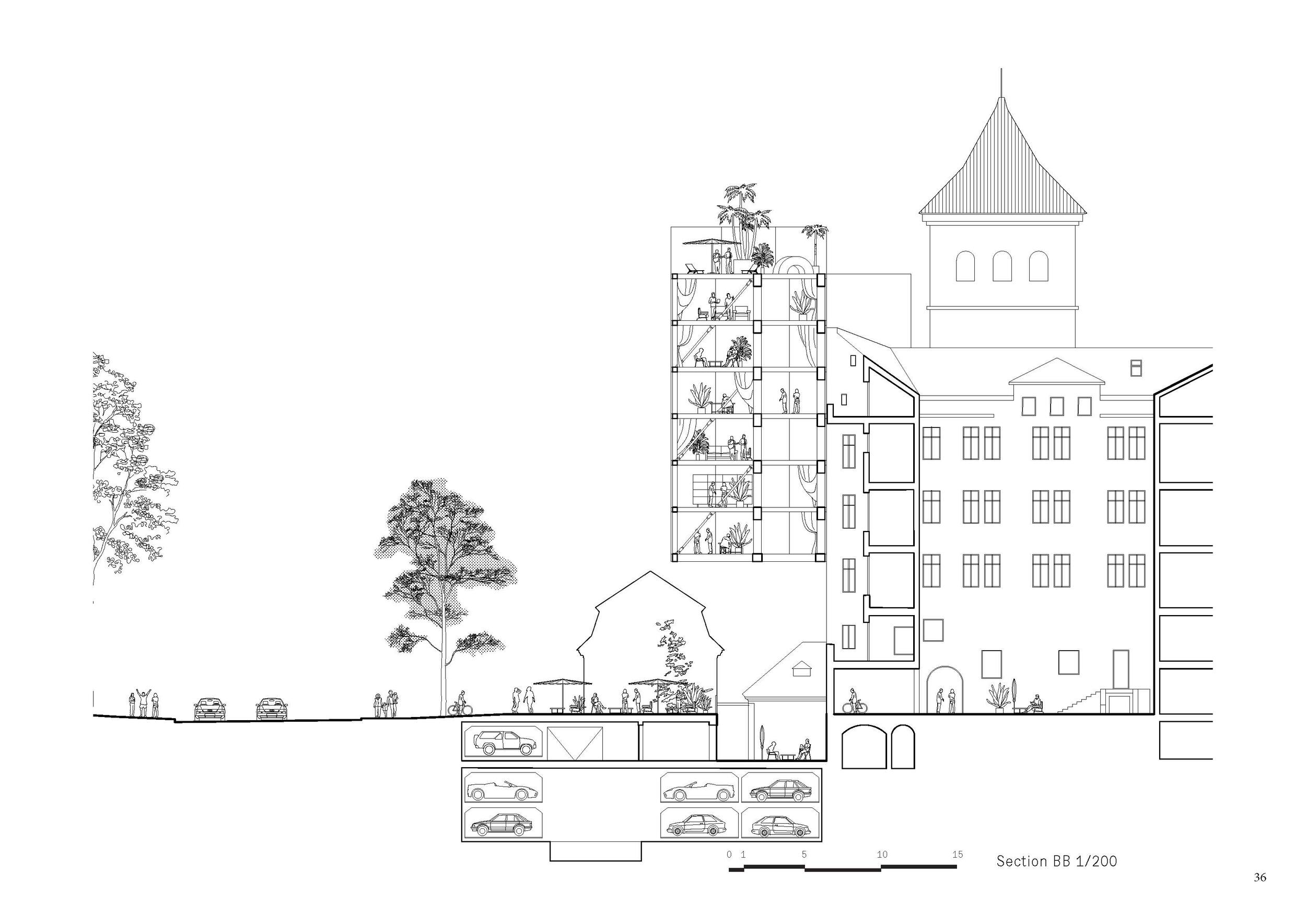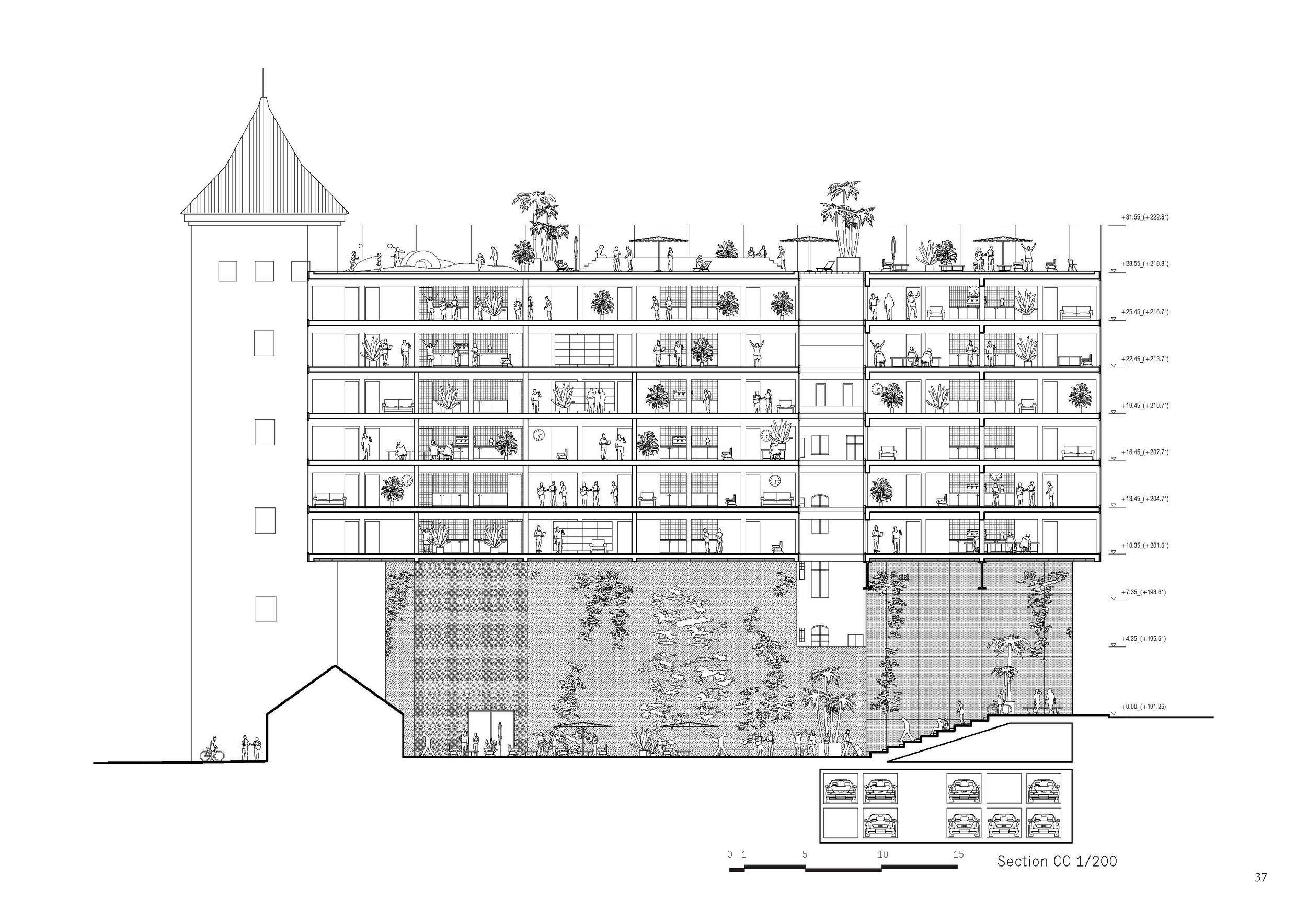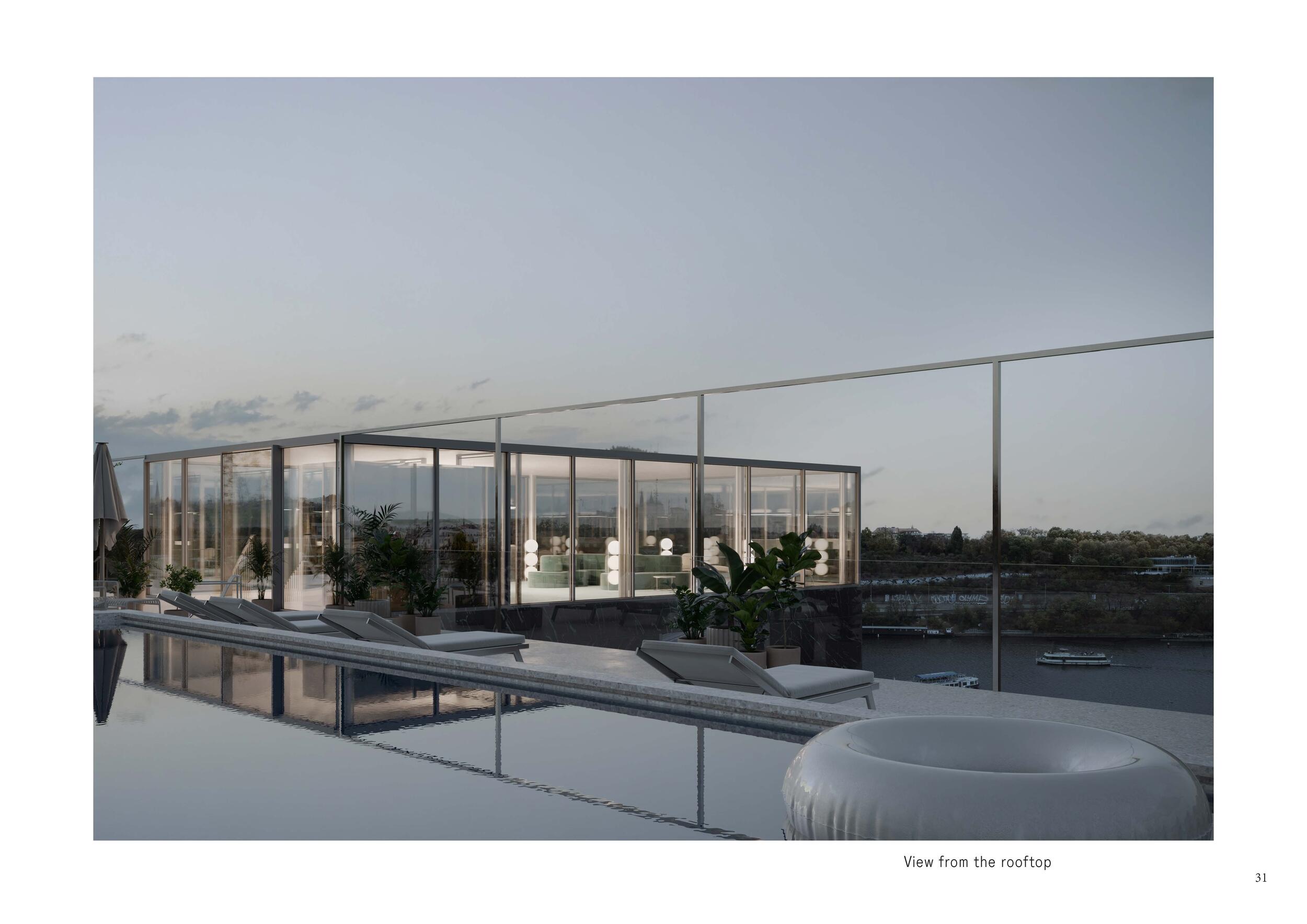 Přehled vývoje potvrzuje, že řešení této výzvy vyžaduje inovativní přístup: městská brána, která vytváří toto předmostí, by měla nabídnout harmonii mezi exkluzivitou a ikoničností, vzdušností a atmosférou nové architektury, která se s úctou tyčí nad stávající historickou městskou strukturou. Nové kvality tohoto prostředí jsou podpořeny zhodnocením parteru jako veřejného prostoru parteru a obohacením "stověžaté" Prahy o nový vertikální akord. Samotná budova by měla svým uživatelům poskytnout řadu dobrodružství: průchod v parteru, v němž rezonuje historická paměť v konfrontaci s duchem nové doby, labyrint vertikálních a horizontálních propojení v polaritě mezi veřejnou a soukromou sférou a v neposlední řadě atraktivní výhledy na Letnou a střešní krajinu historického jádra Prahy, vrcholící v "Sky-lounge" na střešní terase. To vše je podpořeno důmyslným konstrukčním systémem, širokou flexibilitou poskytovaných bytů včetně mezonetů a horizontálních "vil", rozmanitou strukturou ušlechtilých materiálů použitých v exteriérech a interiérech a nápaditou technologií osvětlení, která zdůrazňuje prostorové hodnoty celého komplexu a jeho historického okolí. Návrh sleduje zejména následující cíle: 1 - najít správnou rovnováhu mezi exkluzivitou a ikoničností - projekt chce být POZORUHODNÝ / 2 - zaměřit se na kvalitu společných prostor - zejména na kvalitu živé pasáže a vyhlídkové střešní terasy s 360stupňovým výhledem do krajiny a na město / 3 - pojmout typologii bydlení jako horizontální vily - prostory s kvalitními výhledy a maximální flexibilitou interiéru / 4 - učinit projekt pozoruhodným nejen svým designem, ale (a to je možná důležitější) i zážitkem z prostoru a výhledů pro obyvatele a náhodné návštěvníky. Těmito prostředky má ambici stát se důstojným protějškem paláce MERKUR a ikonou nové Prahy - její tradice, inovace a fascinace - na prahu třetího tisíciletí. V návrhu je rovněž kladen důraz na otevření a zpřístupnění přízemí s dalšími funkcemi ve spojení se stávající barokní hmotou. Navazuje se tak na tradici historických a novodobých pražských pasáží, aby byla budova zasazena do širšího městského kontextu. Figura bytového domu, sjednocená do jediné plovoucí hmoty nad pasáží, zdůrazňuje rozdíl mezi veřejnou a soukromou sférou, nabízí lukrativní výhledy na centrální prostor Prahy a výtvarně atraktivní a lehké působení struktury materiálu ztvárněním pláště. Dispozice bytů nabízí maximální flexibilitu s ohledem na specifika potřeb uživatelů. Tyto principy mají reprezentovat kulturu a technologické a funkční standardy jednadvacátého století.
