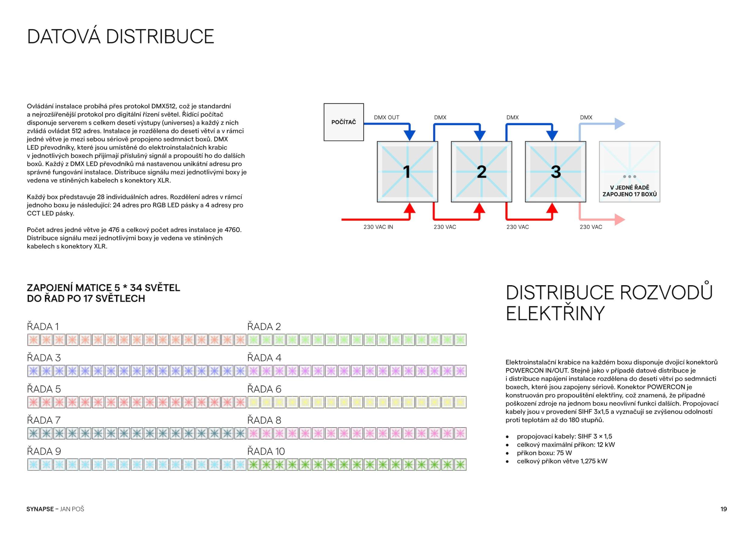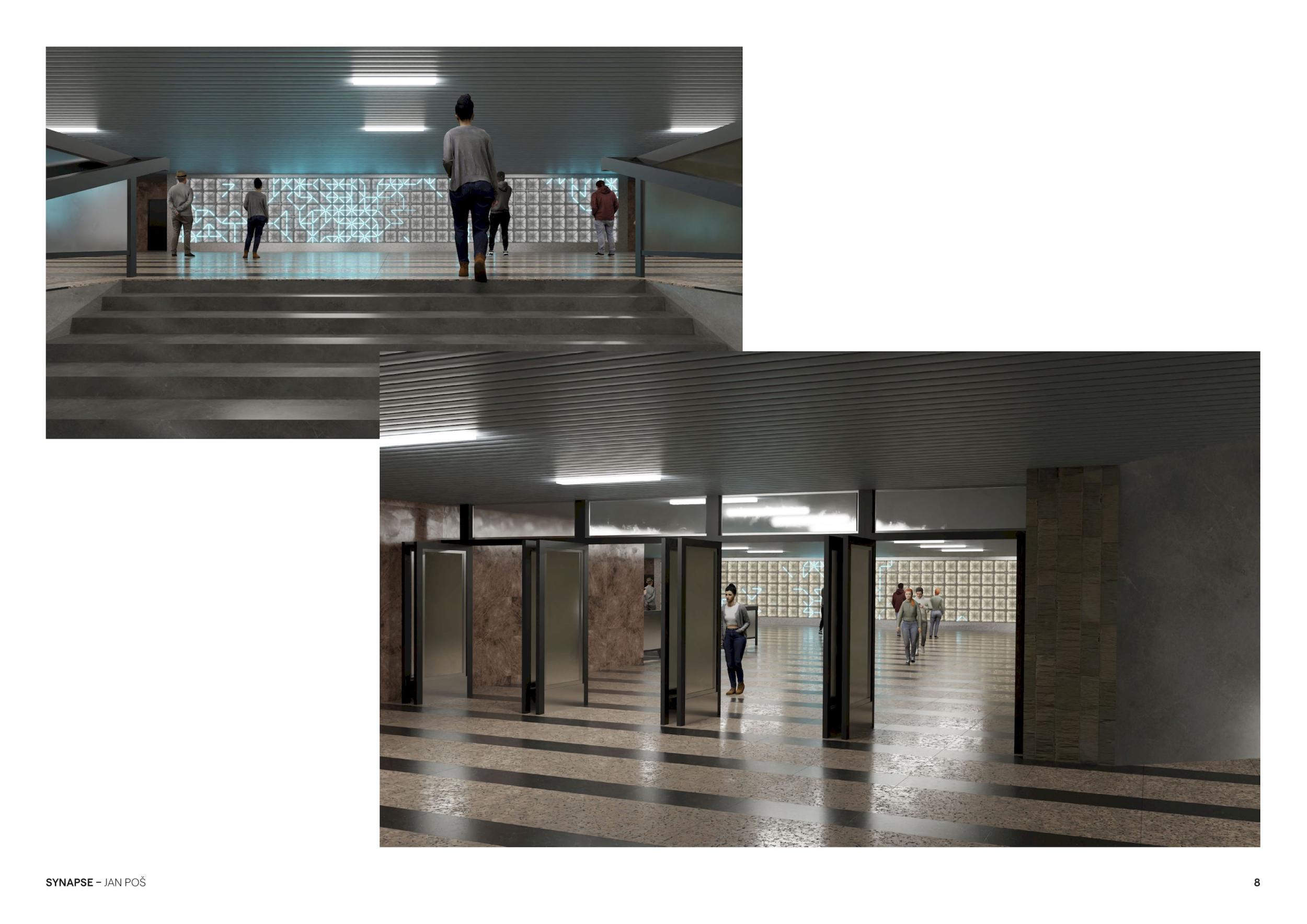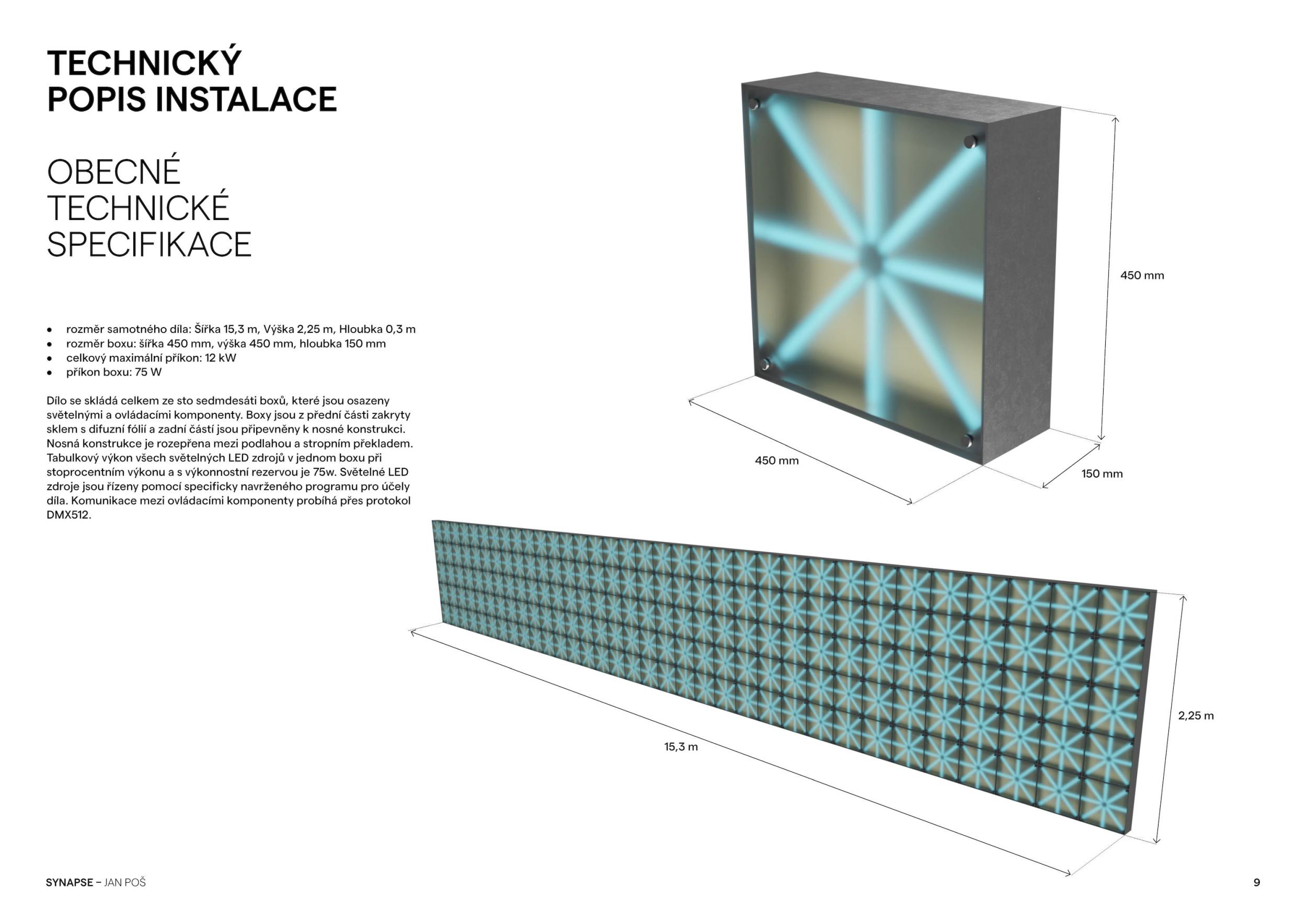 V duchu prozkoumání propojení lidské civilizace a technologie vytváří instalace na pražském Florenci vizuální metaforu městské dopravy jako nervového systému města. Město, žijící organismus, úl lidských vědomí, zpracovává svůj nervový systém skrze dráhy metra, tramvají a autobusů, na nichž jeho občané, světélkující neurony, přenášejí své příběhy a myšlenky podél světelně oživených synaptických spojů se stíny tajemství ve svých koridorech a tepnách. Tyto dráhy posunují lidstvo přes urbanistickou krajinu, vytváří komplexní síť propojených cest a stezek. Florenc, páteř Prahy, křižovatka osudů, ve které se střetávají příběhy lidí a kříží linky veřejné dopravy, místo, kde se přestupuje mezi stanicemi a životními etapami, vytváří největší synapsi v tomto organismu. Synapse — fungující na bázi elektrických výbojů a jejich přenosů, tak synchronně dotváří celou poetiku světelného díla, které by bez elektřiny fungovat nemohlo.