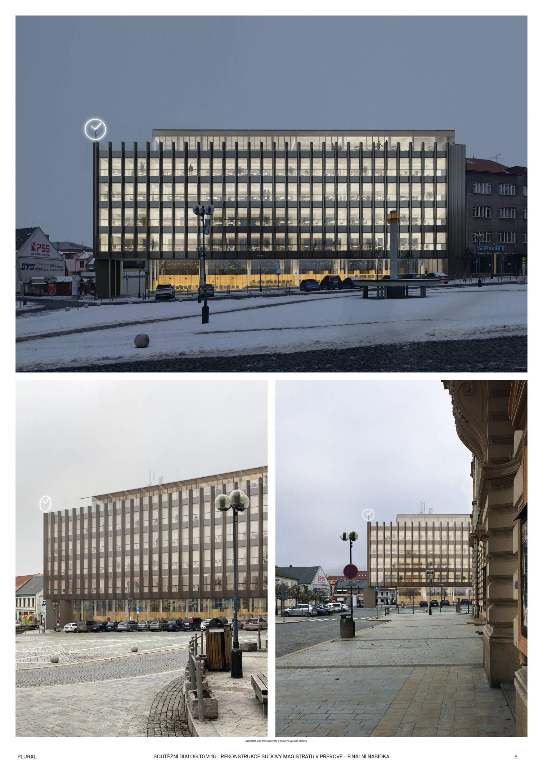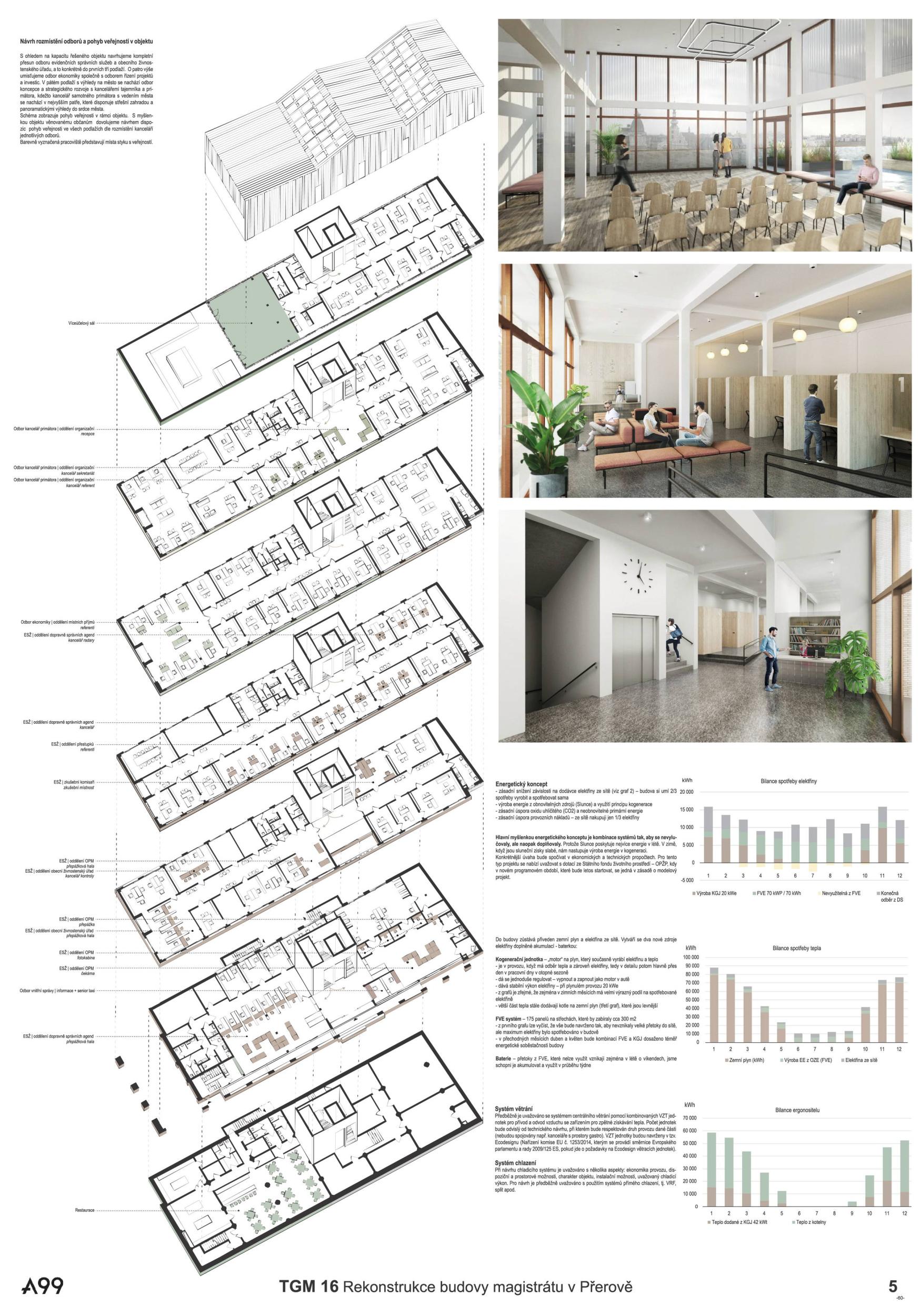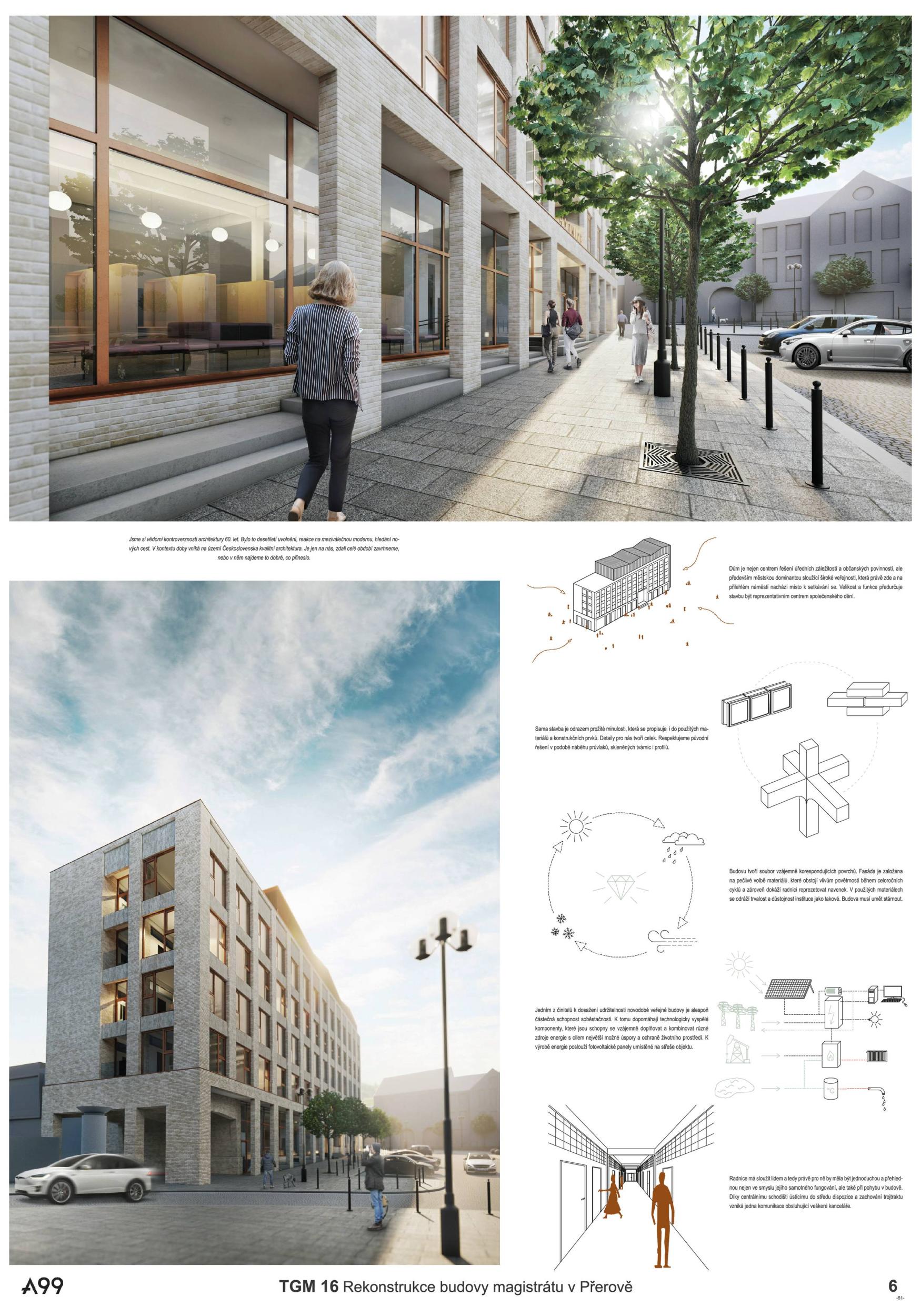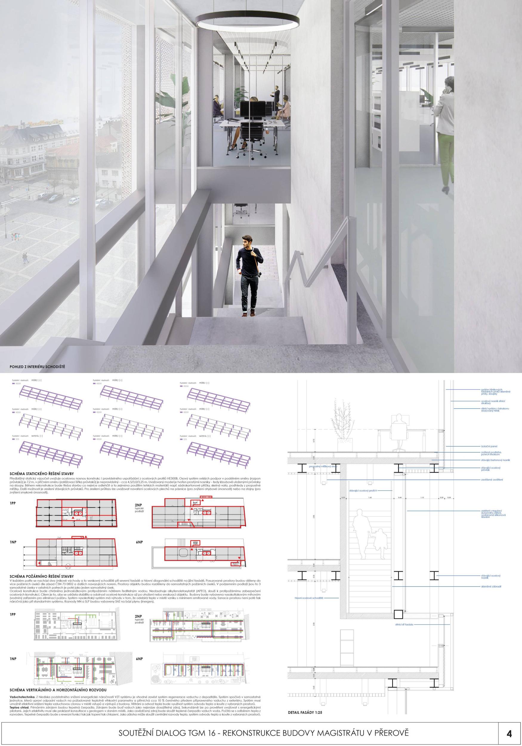 BUDOVA OTEVŘENÁ VEŘEJNOSTI. Diagonální atrium nabízí zcela průhlednou zónu fasády, která odhaluje činnost nové radnice a vytváří nový obraz města. Nabízí půdu pro skutečnou demokracii a znovu spojuje občany s městem. MODERNÍ ROZHLEDNA. Schodišťové atrium s vnitřní a vnější částí se stává hlavním lákadlem budovy, která vytváří současnou dominantu města Přerova a nabízí jedinečný výhled na panorama města. Schody končí u pavilonu s kavárnou. INTERAKCE S VEŘEJNOSTÍ. Centrální schody a výtahy definují zónu interakce s veřejností na patře. Vytváření dvou kancelářských zón, soukromé-tiché a veřejné-interaktivní. Občané mohou být pouze ve veřejné, ostatní plochy jsou přístupné pouze zaměstnancům radnice. FLEXIBILITA. Návrh vnitřních prostor je založen na mřížkovém systému stávající budovy s rozměry 7,2 x 7,2 m, který nabízí flexibilní kancelářské prostředí s otevřenými a uzavřenými prostorami kanceláří a zasedacích místností.