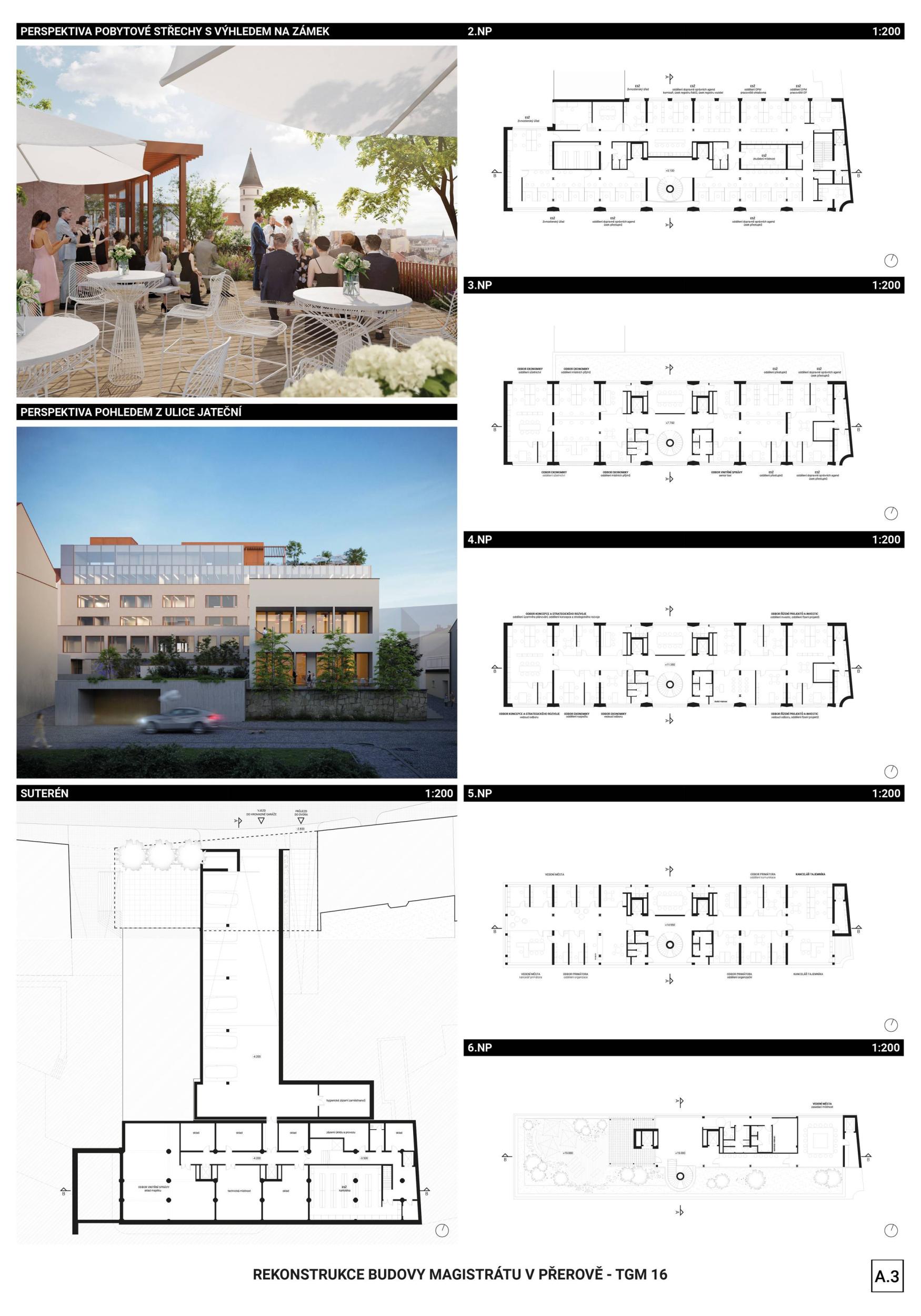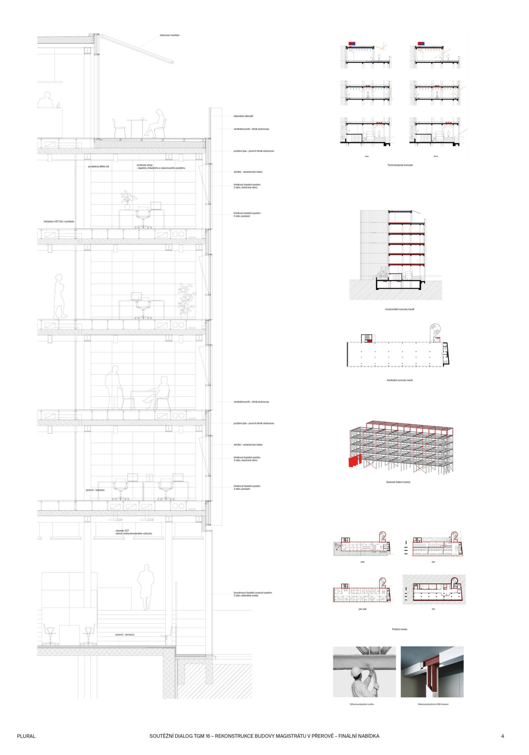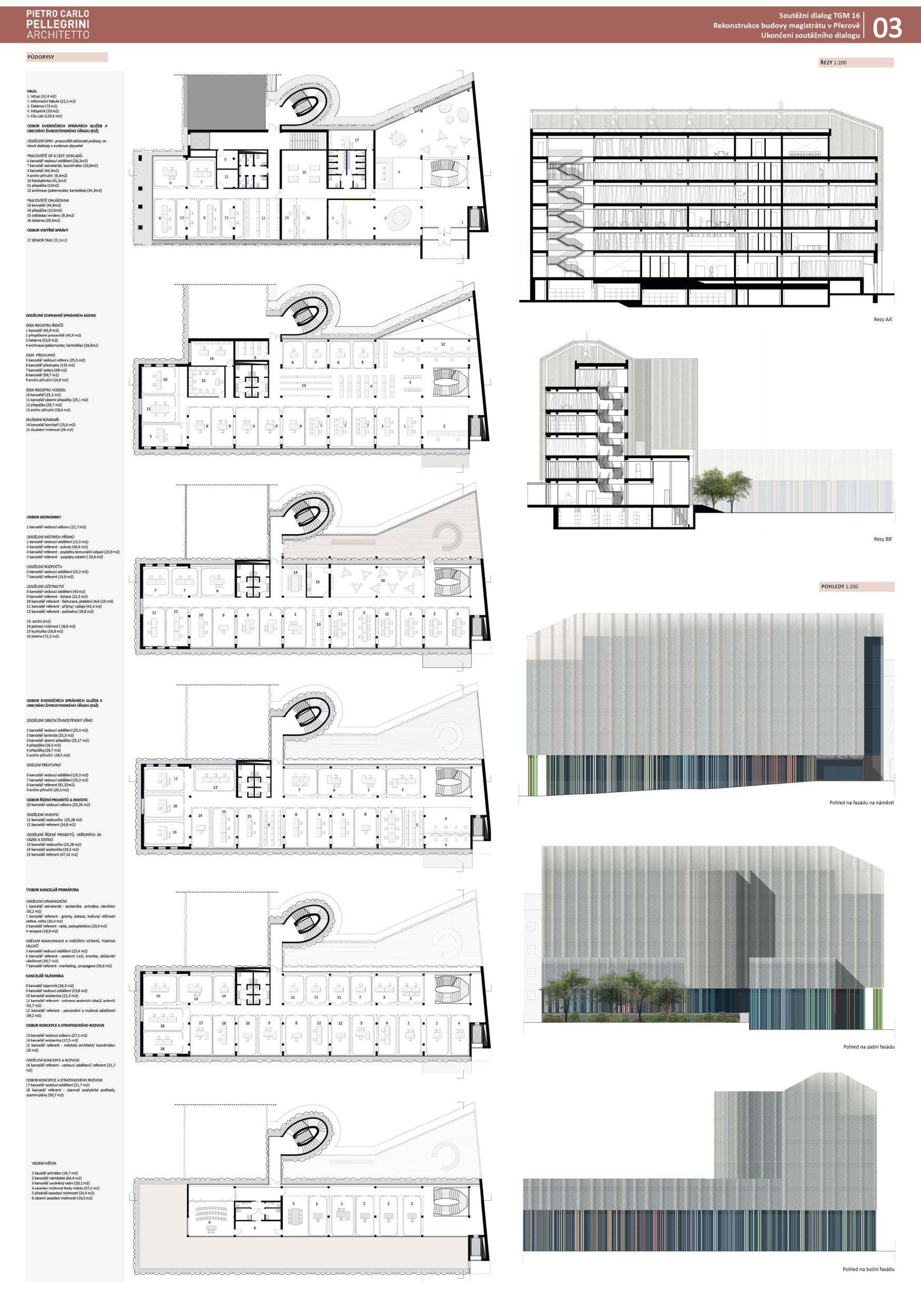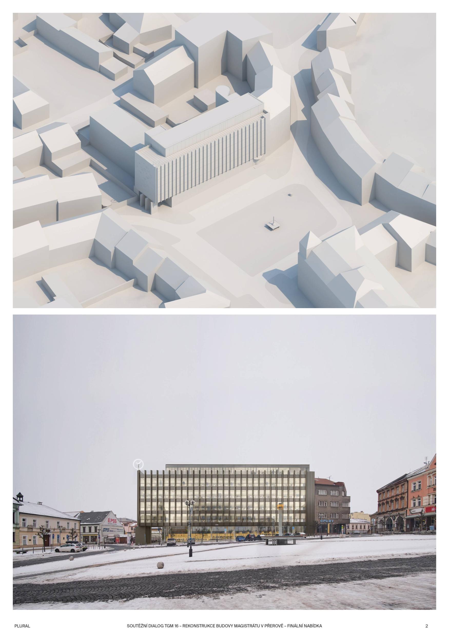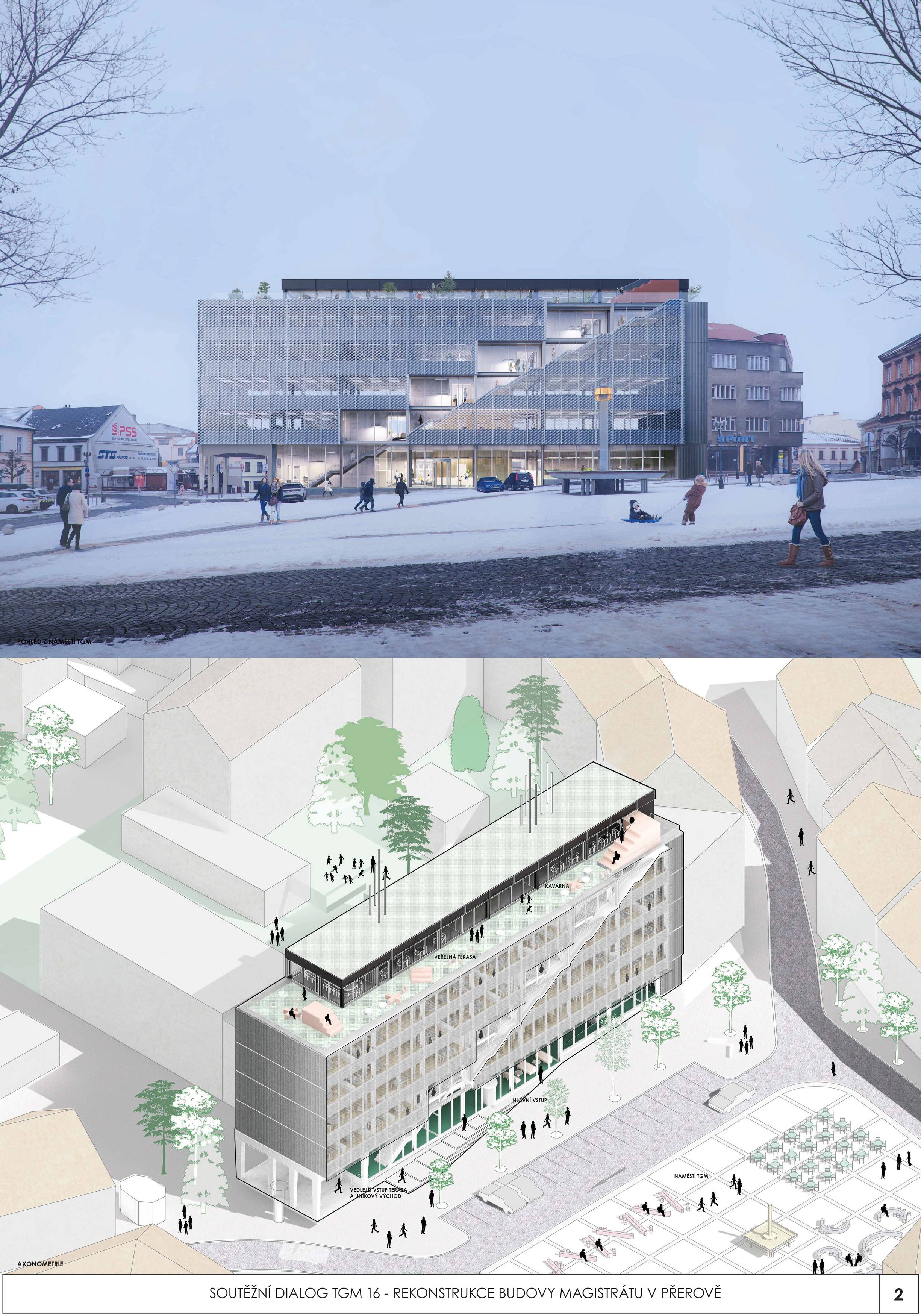 BUDOVA OTEVŘENÁ VEŘEJNOSTI. Diagonální atrium nabízí zcela průhlednou zónu fasády, která odhaluje činnost nové radnice a vytváří nový obraz města. Nabízí půdu pro skutečnou demokracii a znovu spojuje občany s městem. MODERNÍ ROZHLEDNA. Schodišťové atrium s vnitřní a vnější částí se stává hlavním lákadlem budovy, která vytváří současnou dominantu města Přerova a nabízí jedinečný výhled na panorama města. Schody končí u pavilonu s kavárnou. INTERAKCE S VEŘEJNOSTÍ. Centrální schody a výtahy definují zónu interakce s veřejností na patře. Vytváření dvou kancelářských zón, soukromé-tiché a veřejné-interaktivní. Občané mohou být pouze ve veřejné, ostatní plochy jsou přístupné pouze zaměstnancům radnice. FLEXIBILITA. Návrh vnitřních prostor je založen na mřížkovém systému stávající budovy s rozměry 7,2 x 7,2 m, který nabízí flexibilní kancelářské prostředí s otevřenými a uzavřenými prostorami kanceláří a zasedacích místností.