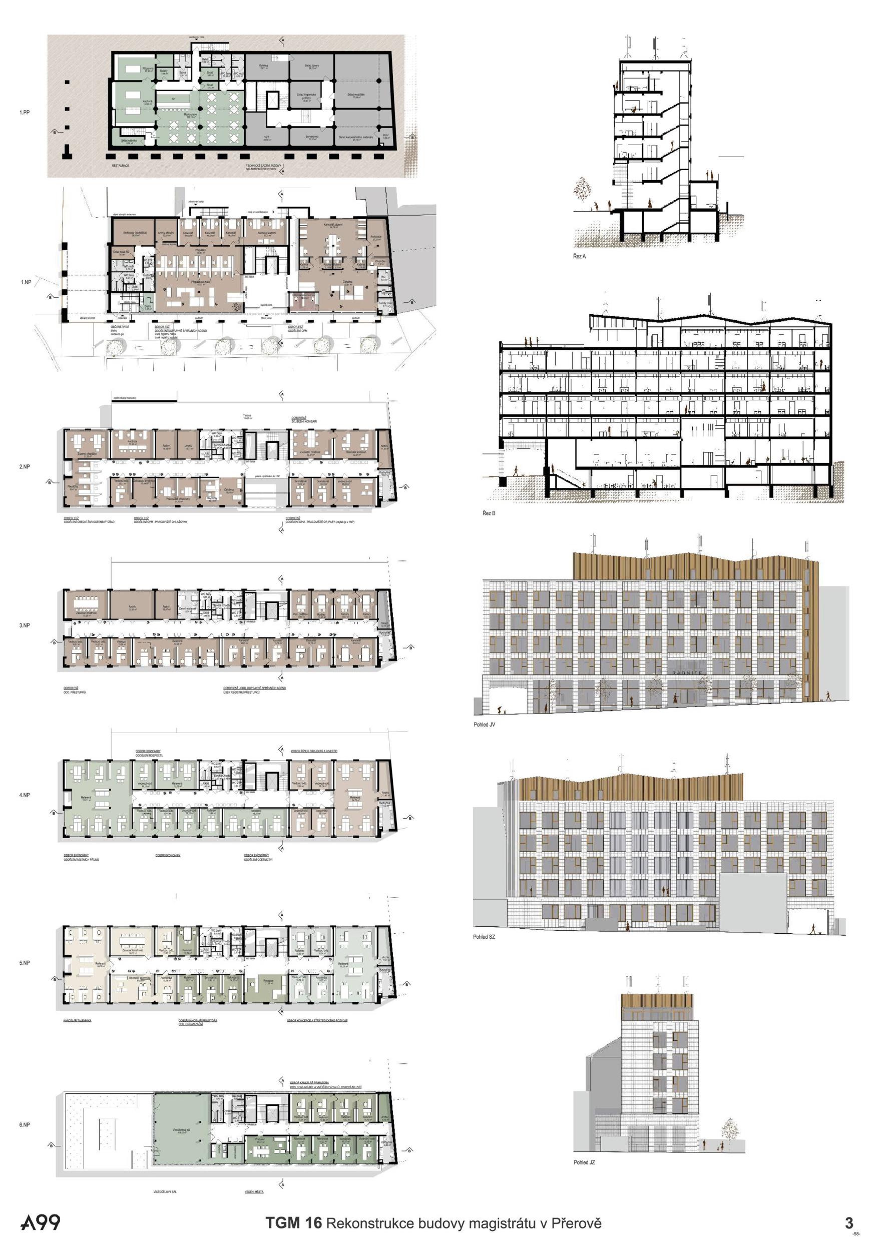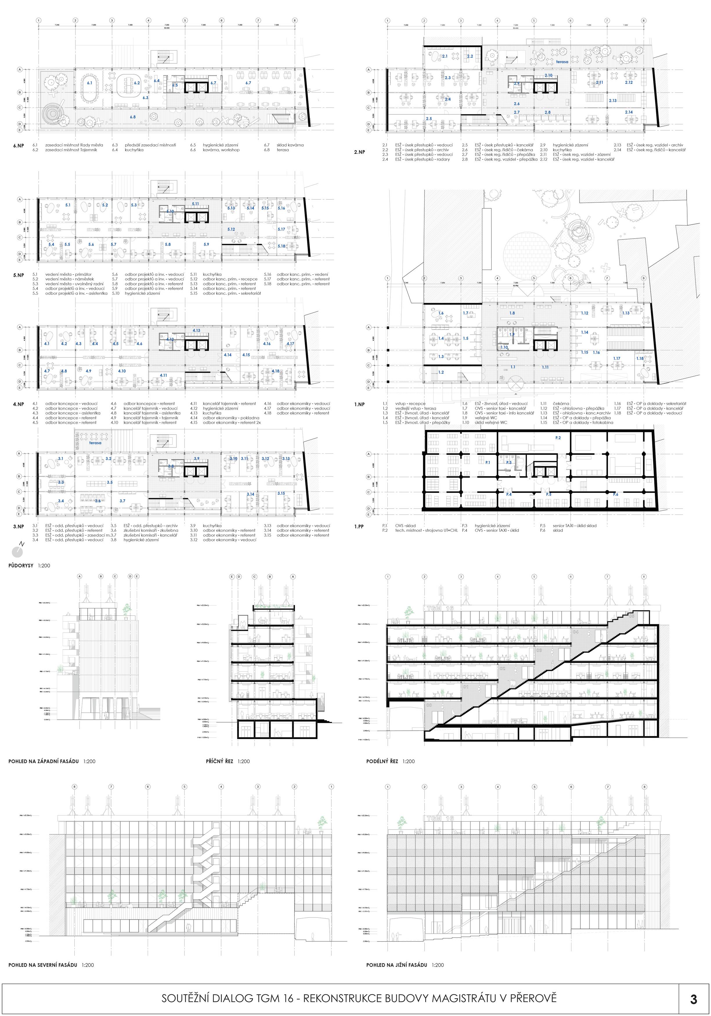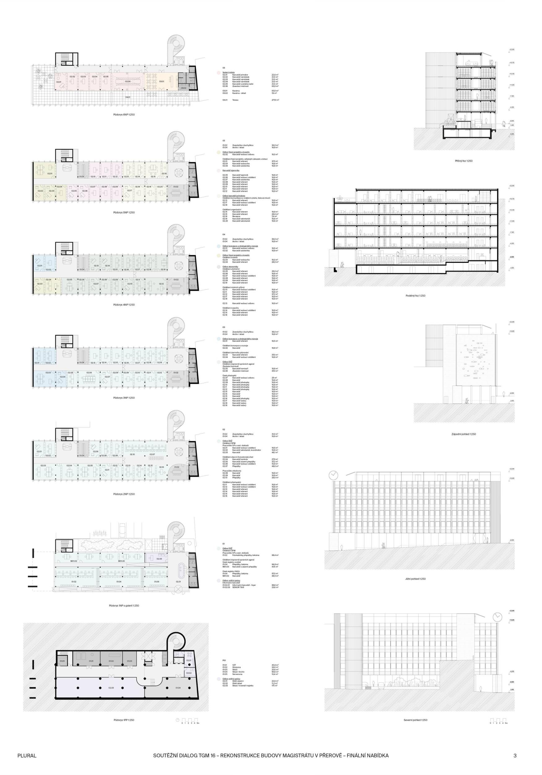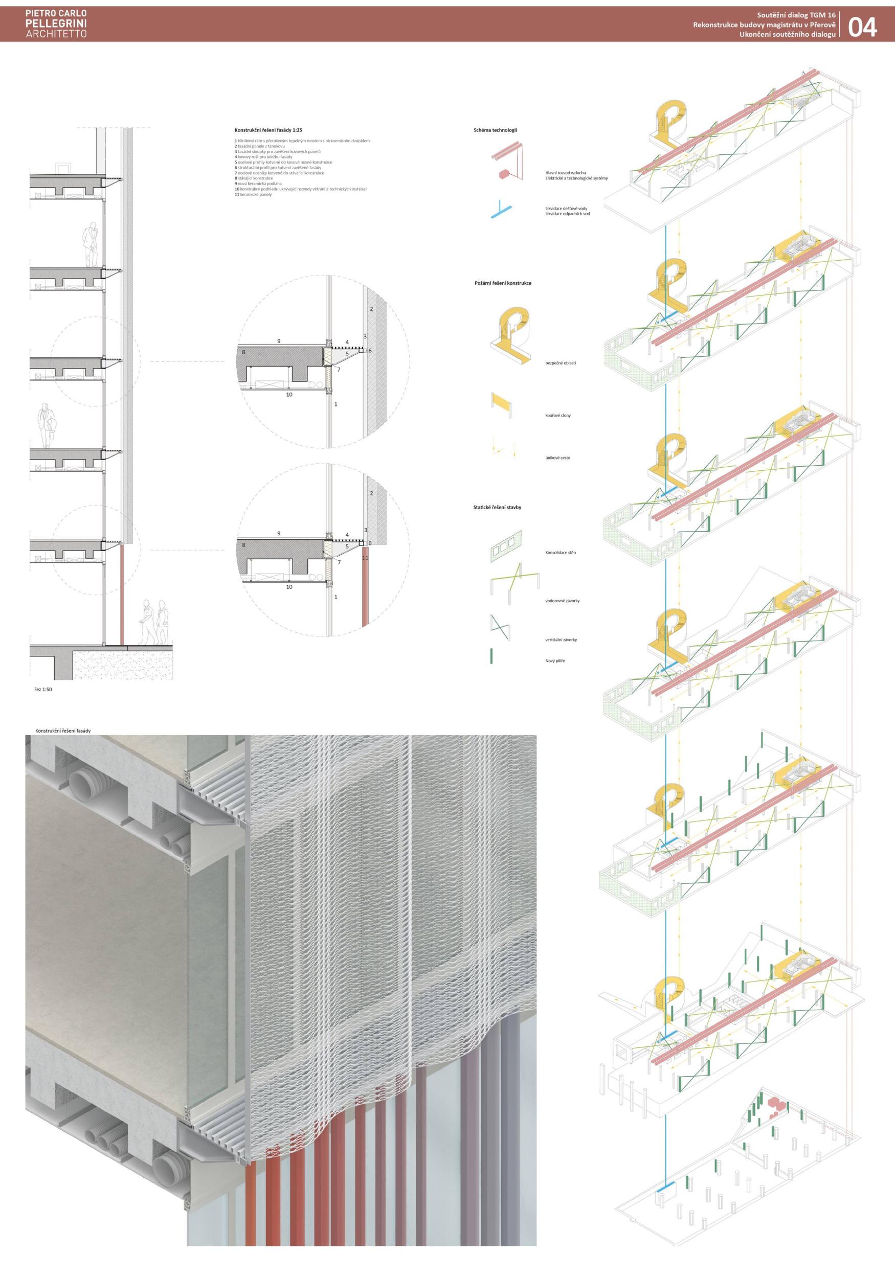 BUDOVA OTEVŘENÁ VEŘEJNOSTI. Diagonální atrium nabízí zcela průhlednou zónu fasády, která odhaluje činnost nové radnice a vytváří nový obraz města. Nabízí půdu pro skutečnou demokracii a znovu spojuje občany s městem. MODERNÍ ROZHLEDNA. Schodišťové atrium s vnitřní a vnější částí se stává hlavním lákadlem budovy, která vytváří současnou dominantu města Přerova a nabízí jedinečný výhled na panorama města. Schody končí u pavilonu s kavárnou. INTERAKCE S VEŘEJNOSTÍ. Centrální schody a výtahy definují zónu interakce s veřejností na patře. Vytváření dvou kancelářských zón, soukromé-tiché a veřejné-interaktivní. Občané mohou být pouze ve veřejné, ostatní plochy jsou přístupné pouze zaměstnancům radnice. FLEXIBILITA. Návrh vnitřních prostor je založen na mřížkovém systému stávající budovy s rozměry 7,2 x 7,2 m, který nabízí flexibilní kancelářské prostředí s otevřenými a uzavřenými prostorami kanceláří a zasedacích místností.
