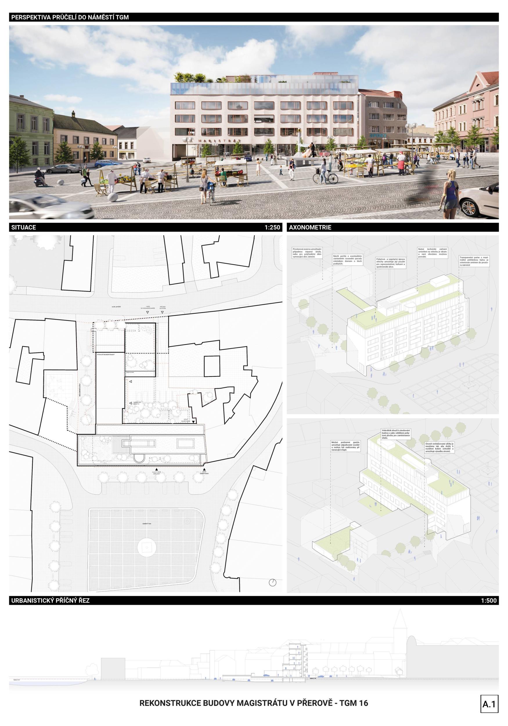 Návrh pracuje s novou zásadní přidanou hodnotou, kterou je oživení náměstí. Akceptuje původní hmotu domu, ale „proříznutím“ fasády se stává měřítkově bližší stávajícímu okolí. Dům návrhem získává nový charakter a je řazen do souvislosti s evropskými příklady, kde městská radnice je součástí veřejného prostoru. Foyer komunikační haly není pouze u vstupu, ale prostupuje celým domem, navazuje na diagonální schodiště a umožňuje tak jednotlivým odborům komunikaci s veřejností. Tento vnitřní veřejný prostor tak vertikálně prostupuje domem až na střešní terasu, která nově slouží jako demokratické místo setkávání. Transparentní soudobý výraz fasády domu není pouze formálním znakem, ale i koncept provozu zakládá na transparentní fungování objektu. Návrh vykazuje známky soudobého dispozičního uspořádání pro provoz úřadu 21. století.