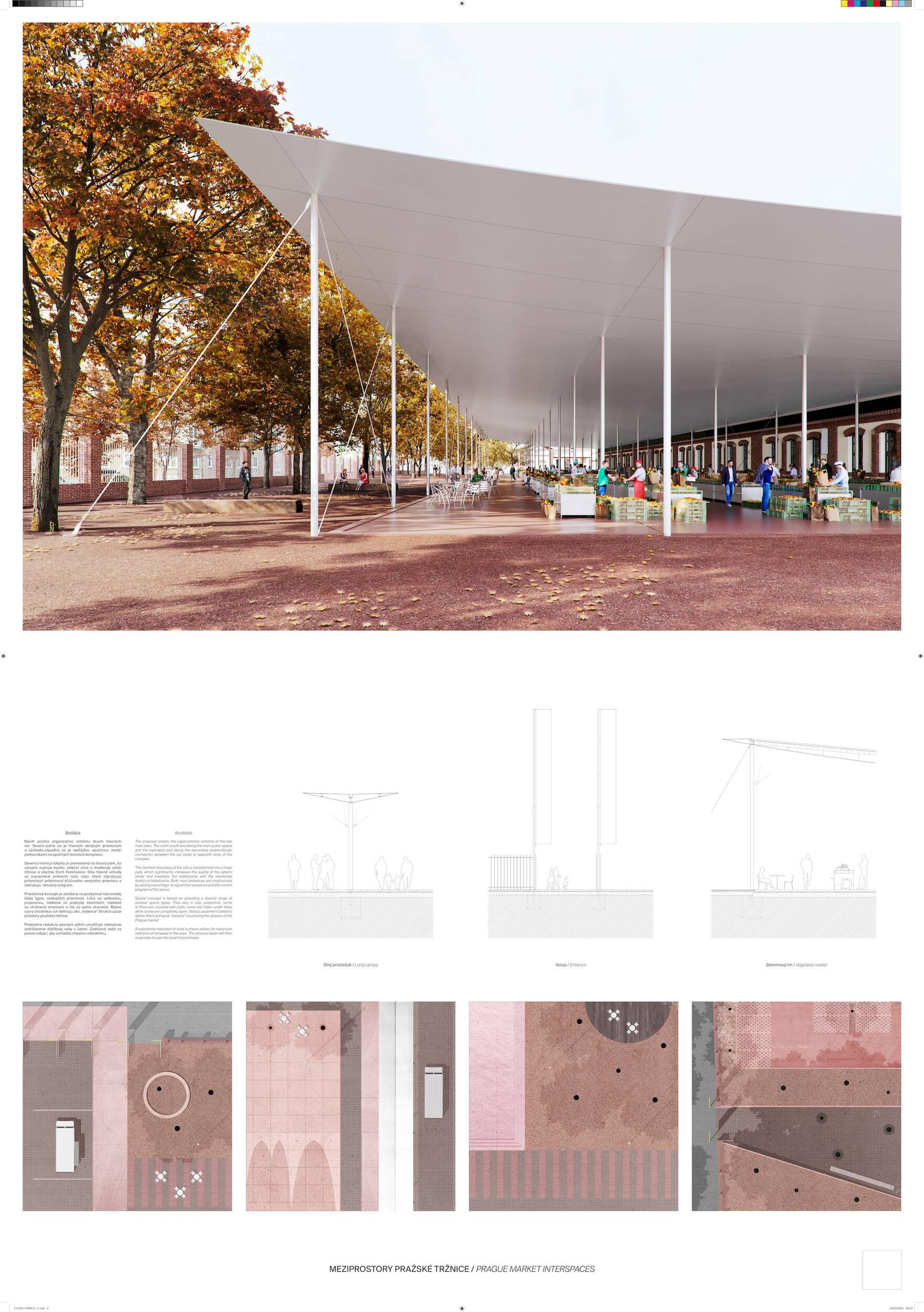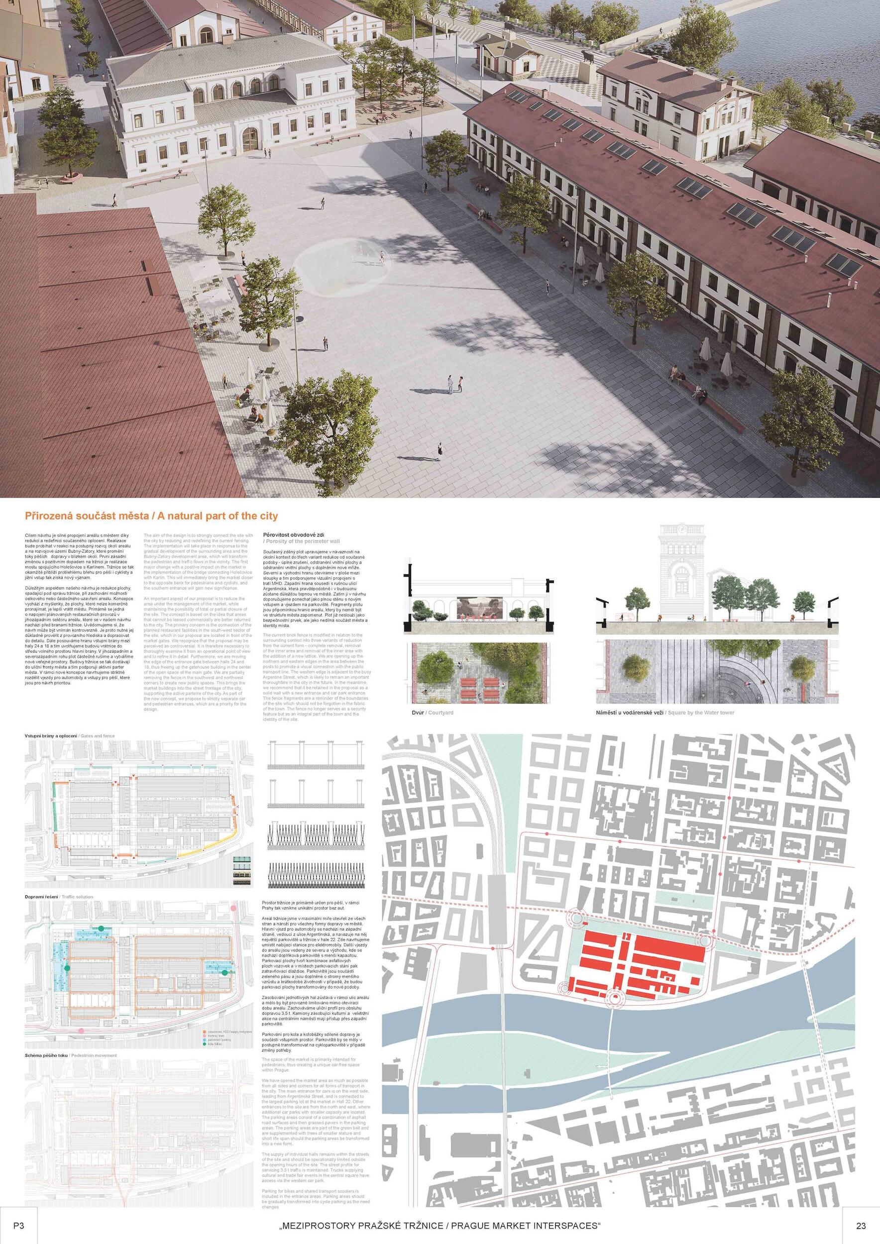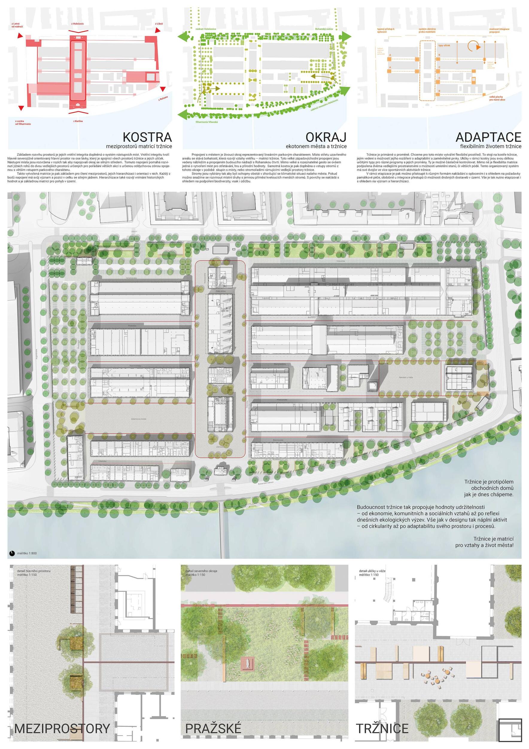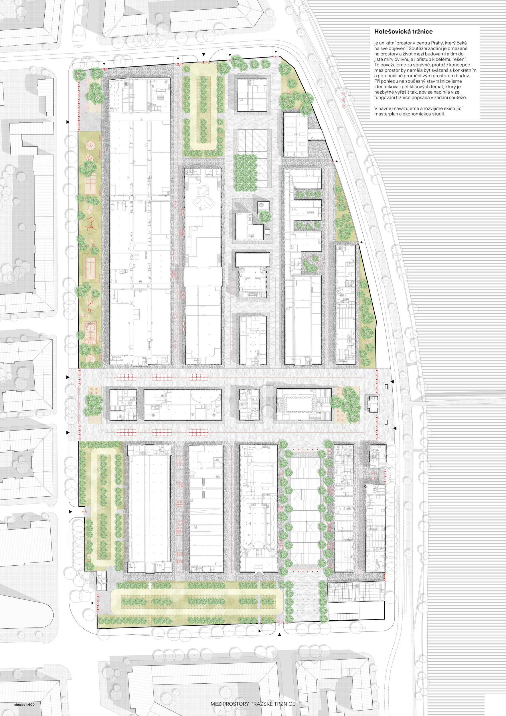 Holešovická tržnice, unikátní historický areál, který si přes úpadek v posledních desetiletí udržel své genius loci a nyní stojí na prahu nové příležitosti. Citlivou transformací veřejného prostoru s kvalitním programem může nalákat nové návštěvníky a vytvořit tak lokální i celoměstský cíl obyvatel s odkazem na historii i budoucnost Prahy. Současná tržnice trpí dlouhodobou podinvestovaností do infrastruktury, architektury i veřejného prostoru. Rozbité povrchy, nedostatek mobiliáře, absence jakékoliv zeleně a nepřehledné dopravní řešení dělá z meziprostor nepříjemné místo, ve kterém lidé nechtějí trávit volný čas. I přesto si však život v tržnici našel své příležitosti - guerillové zabydlování prostor food trucky, novými stánky i městským mobiliářem postupně zvyšují návštěvnost a lidé zde začínají trávit více času. Nové provozy jako Jatka78, cowork v H40 nebo výstavy v Trafo Gallery, vytváří ve svém okolí zajímavý program pro všechny věkové skupiny obyvatel po celý den. Inspirováni architekturou tržnice, akcentujeme kruhové výseče v kontrastu s ortogonálním systémem. Kruh a mřížka jsou tak hlavním jazykem nového tvarosloví navržených elementů. Vytváříme přirozené propojení mezi historií a budoucím rozvojem. Jednotlivé části návrhu vycházejí ze systémových principů, které lze snadno rozvíjet při aplikaci, ať už se jedná o kladení dlažby, mobiliář nebo nové oplocení. S geometrií pracujeme jako s konstrukcí nebo dekorem.