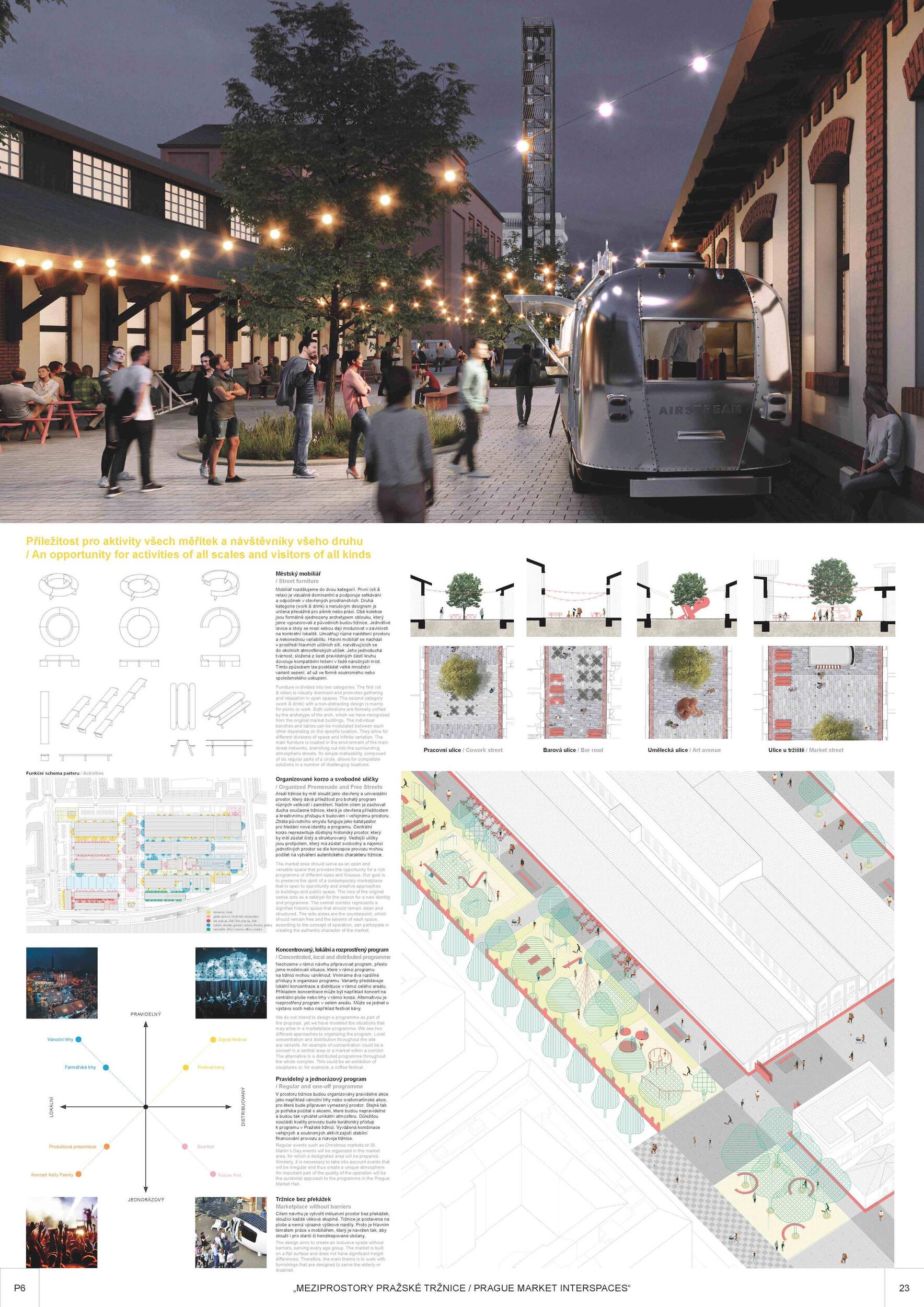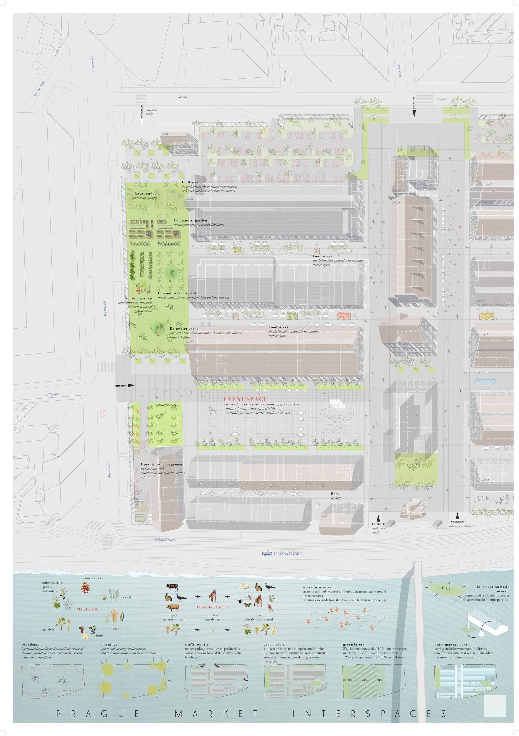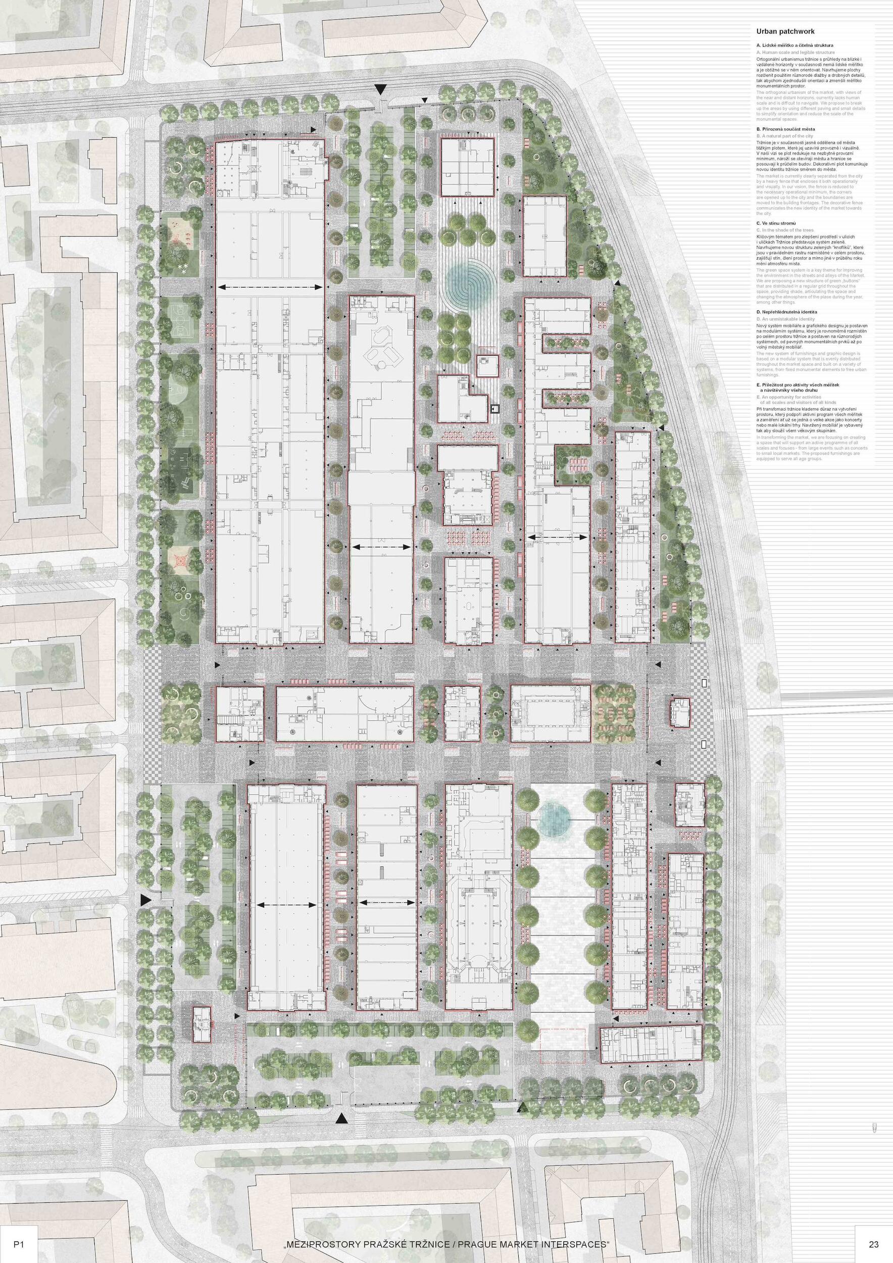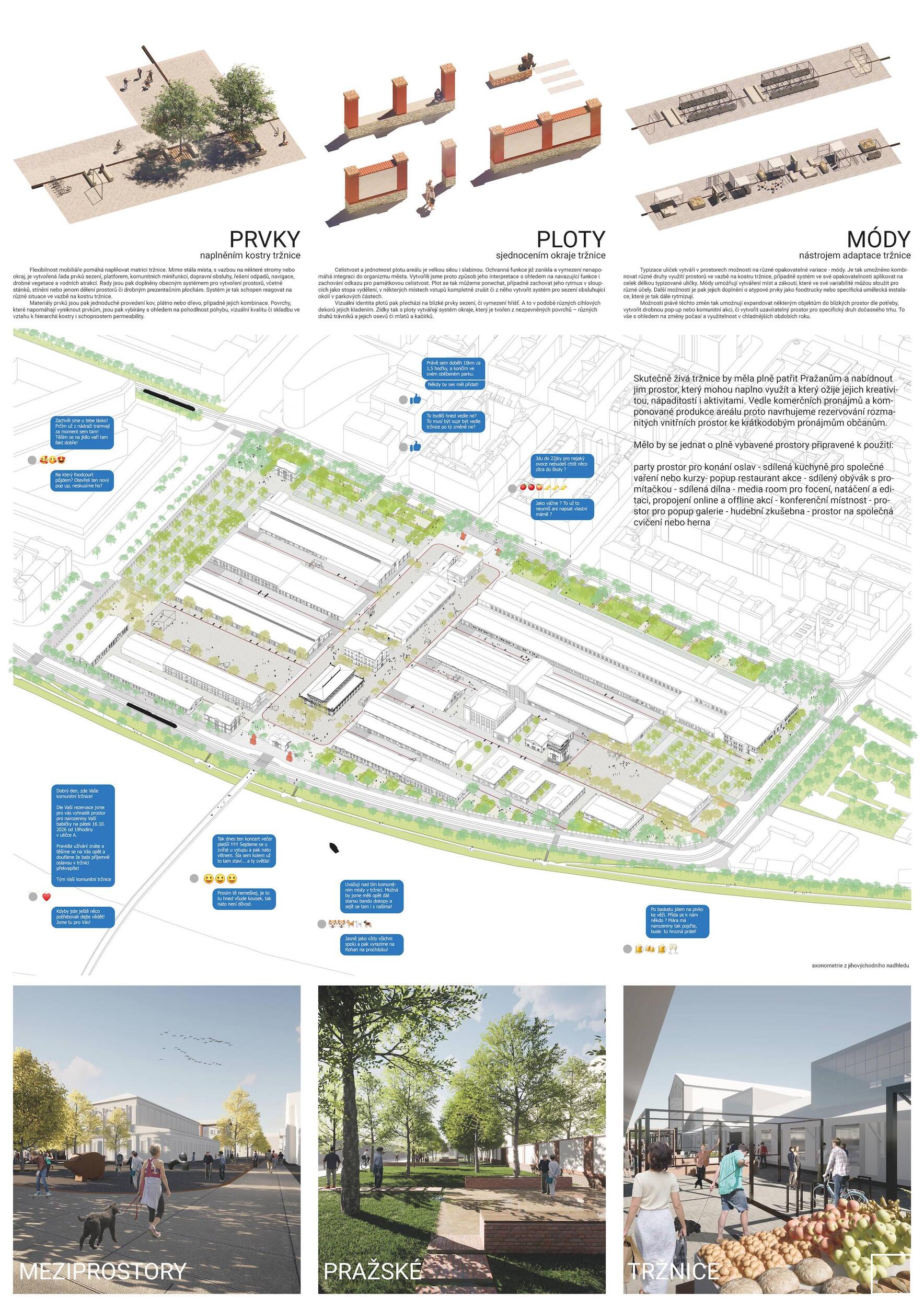 Holešovická tržnice, unikátní historický areál, který si přes úpadek v posledních desetiletí udržel své genius loci a nyní stojí na prahu nové příležitosti. Citlivou transformací veřejného prostoru s kvalitním programem může nalákat nové návštěvníky a vytvořit tak lokální i celoměstský cíl obyvatel s odkazem na historii i budoucnost Prahy. Současná tržnice trpí dlouhodobou podinvestovaností do infrastruktury, architektury i veřejného prostoru. Rozbité povrchy, nedostatek mobiliáře, absence jakékoliv zeleně a nepřehledné dopravní řešení dělá z meziprostor nepříjemné místo, ve kterém lidé nechtějí trávit volný čas. I přesto si však život v tržnici našel své příležitosti - guerillové zabydlování prostor food trucky, novými stánky i městským mobiliářem postupně zvyšují návštěvnost a lidé zde začínají trávit více času. Nové provozy jako Jatka78, cowork v H40 nebo výstavy v Trafo Gallery, vytváří ve svém okolí zajímavý program pro všechny věkové skupiny obyvatel po celý den. Inspirováni architekturou tržnice, akcentujeme kruhové výseče v kontrastu s ortogonálním systémem. Kruh a mřížka jsou tak hlavním jazykem nového tvarosloví navržených elementů. Vytváříme přirozené propojení mezi historií a budoucím rozvojem. Jednotlivé části návrhu vycházejí ze systémových principů, které lze snadno rozvíjet při aplikaci, ať už se jedná o kladení dlažby, mobiliář nebo nové oplocení. S geometrií pracujeme jako s konstrukcí nebo dekorem.