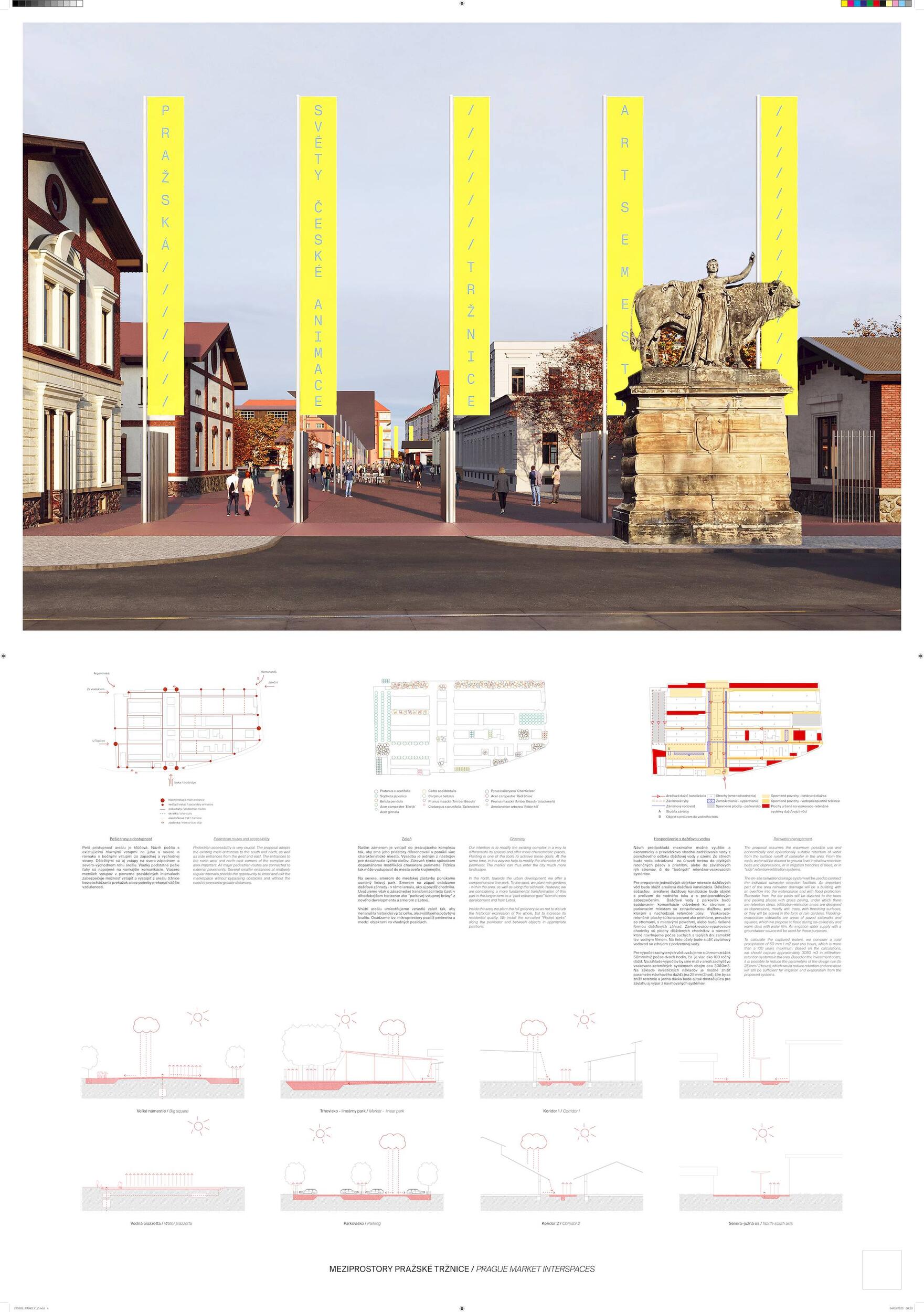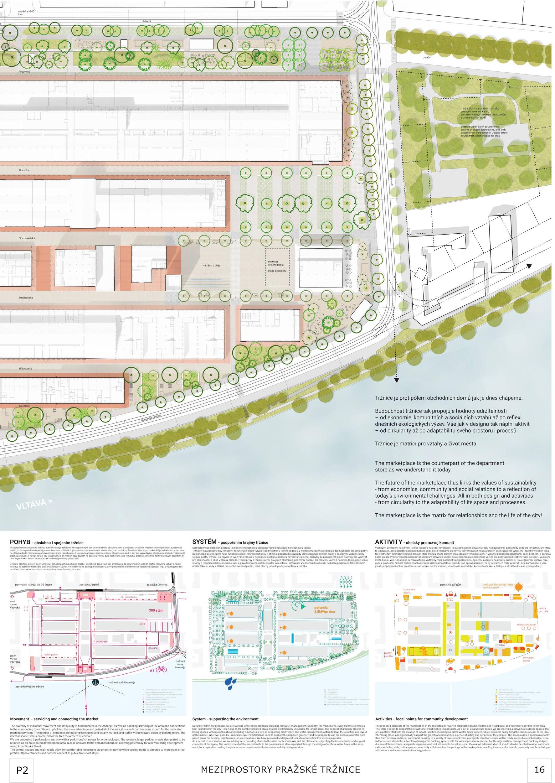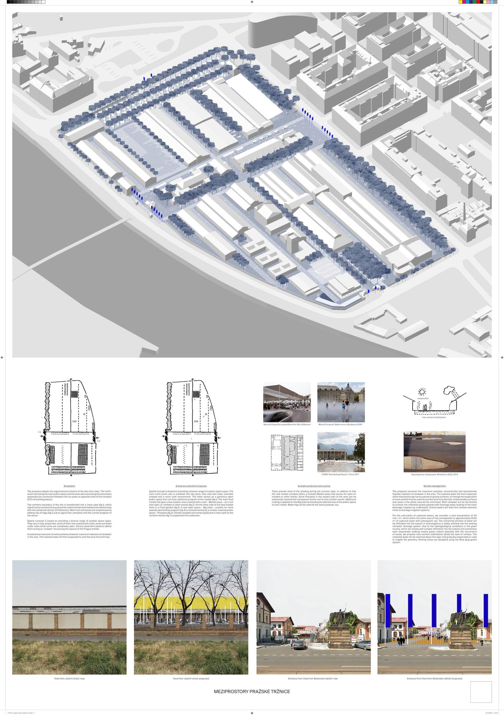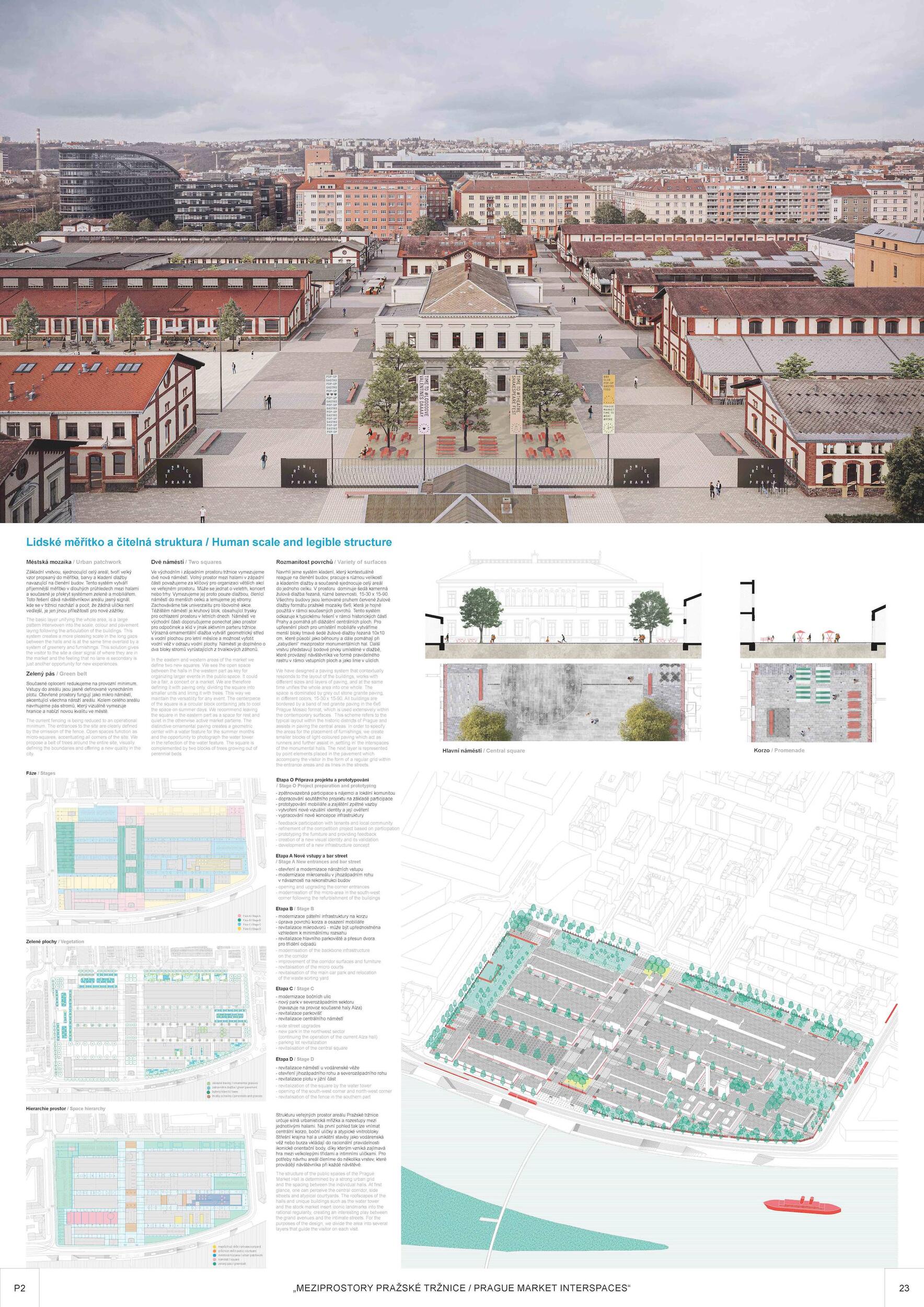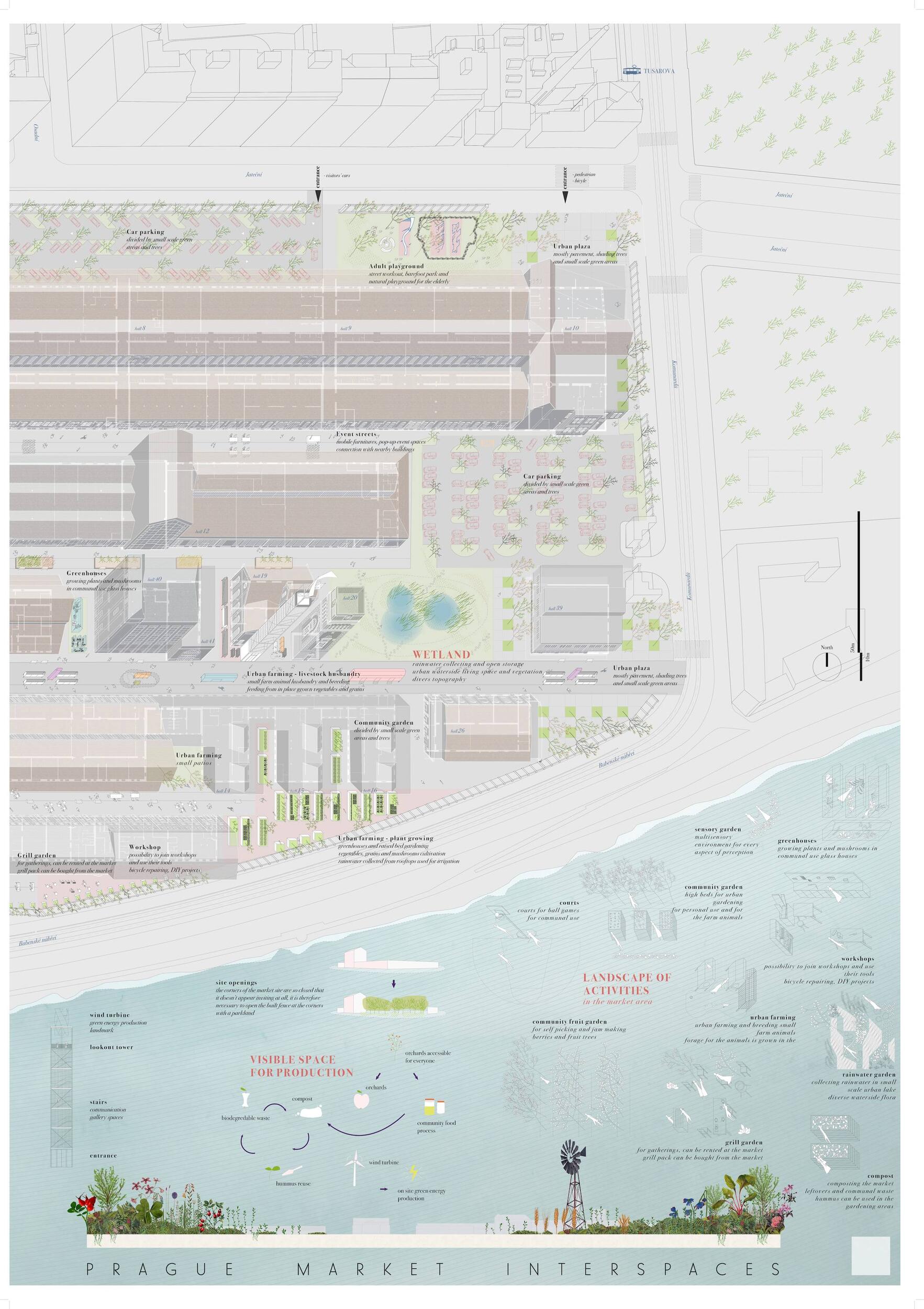 Holešovická tržnice, unikátní historický areál, který si přes úpadek v posledních desetiletí udržel své genius loci a nyní stojí na prahu nové příležitosti. Citlivou transformací veřejného prostoru s kvalitním programem může nalákat nové návštěvníky a vytvořit tak lokální i celoměstský cíl obyvatel s odkazem na historii i budoucnost Prahy. Současná tržnice trpí dlouhodobou podinvestovaností do infrastruktury, architektury i veřejného prostoru. Rozbité povrchy, nedostatek mobiliáře, absence jakékoliv zeleně a nepřehledné dopravní řešení dělá z meziprostor nepříjemné místo, ve kterém lidé nechtějí trávit volný čas. I přesto si však život v tržnici našel své příležitosti - guerillové zabydlování prostor food trucky, novými stánky i městským mobiliářem postupně zvyšují návštěvnost a lidé zde začínají trávit více času. Nové provozy jako Jatka78, cowork v H40 nebo výstavy v Trafo Gallery, vytváří ve svém okolí zajímavý program pro všechny věkové skupiny obyvatel po celý den. Inspirováni architekturou tržnice, akcentujeme kruhové výseče v kontrastu s ortogonálním systémem. Kruh a mřížka jsou tak hlavním jazykem nového tvarosloví navržených elementů. Vytváříme přirozené propojení mezi historií a budoucím rozvojem. Jednotlivé části návrhu vycházejí ze systémových principů, které lze snadno rozvíjet při aplikaci, ať už se jedná o kladení dlažby, mobiliář nebo nové oplocení. S geometrií pracujeme jako s konstrukcí nebo dekorem.