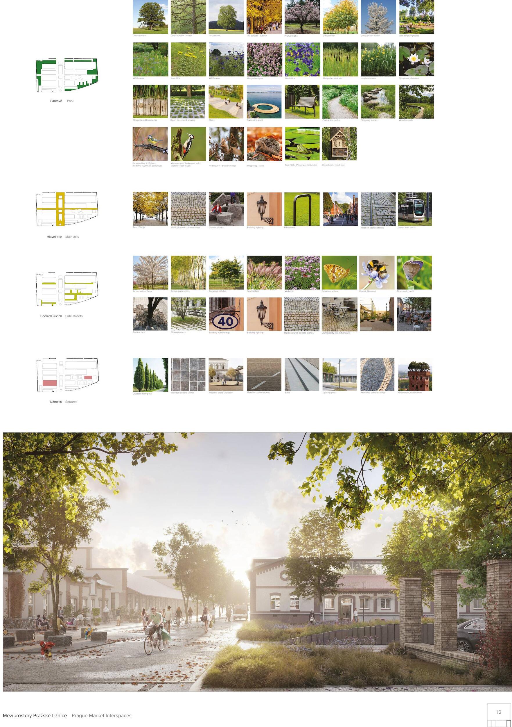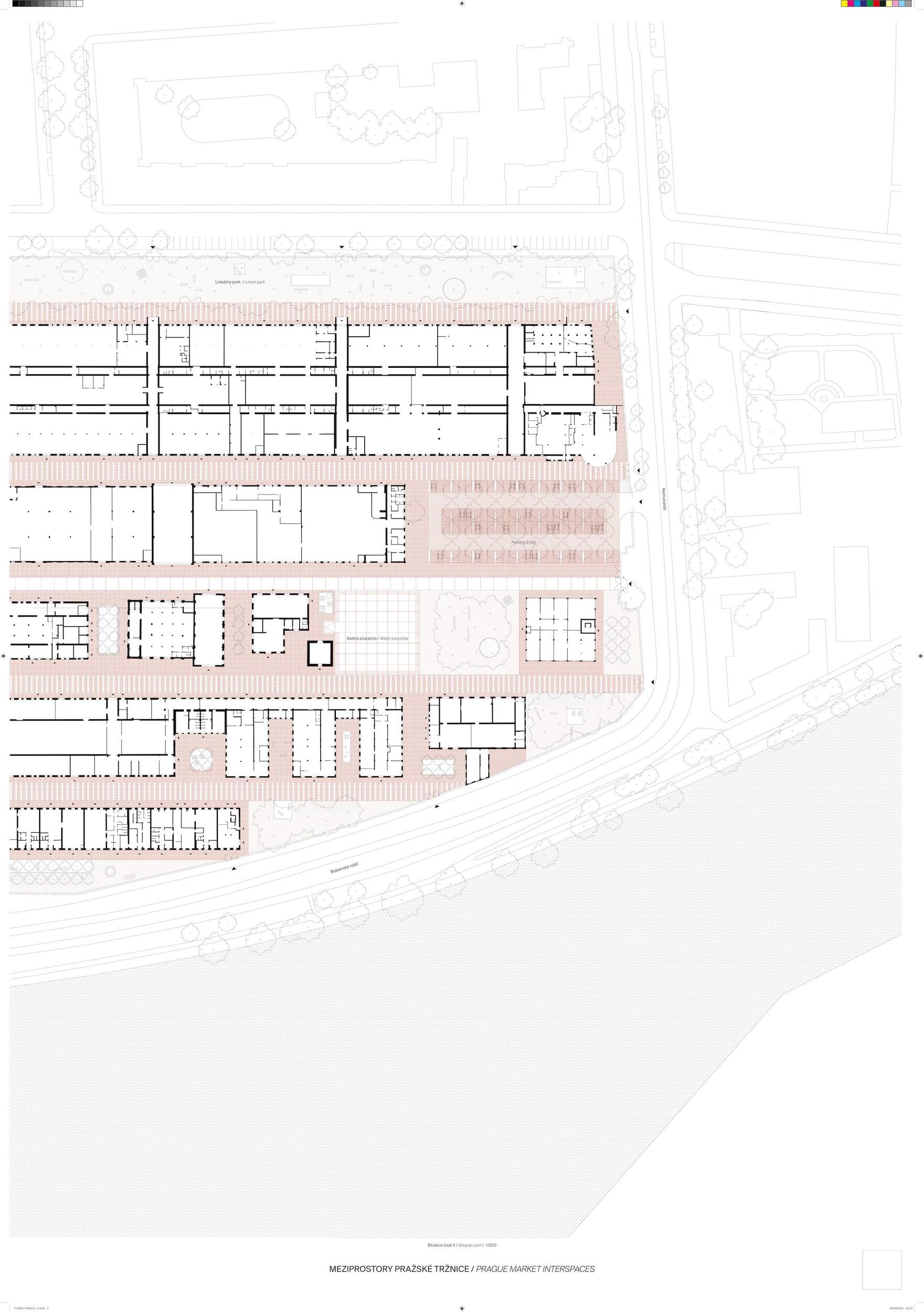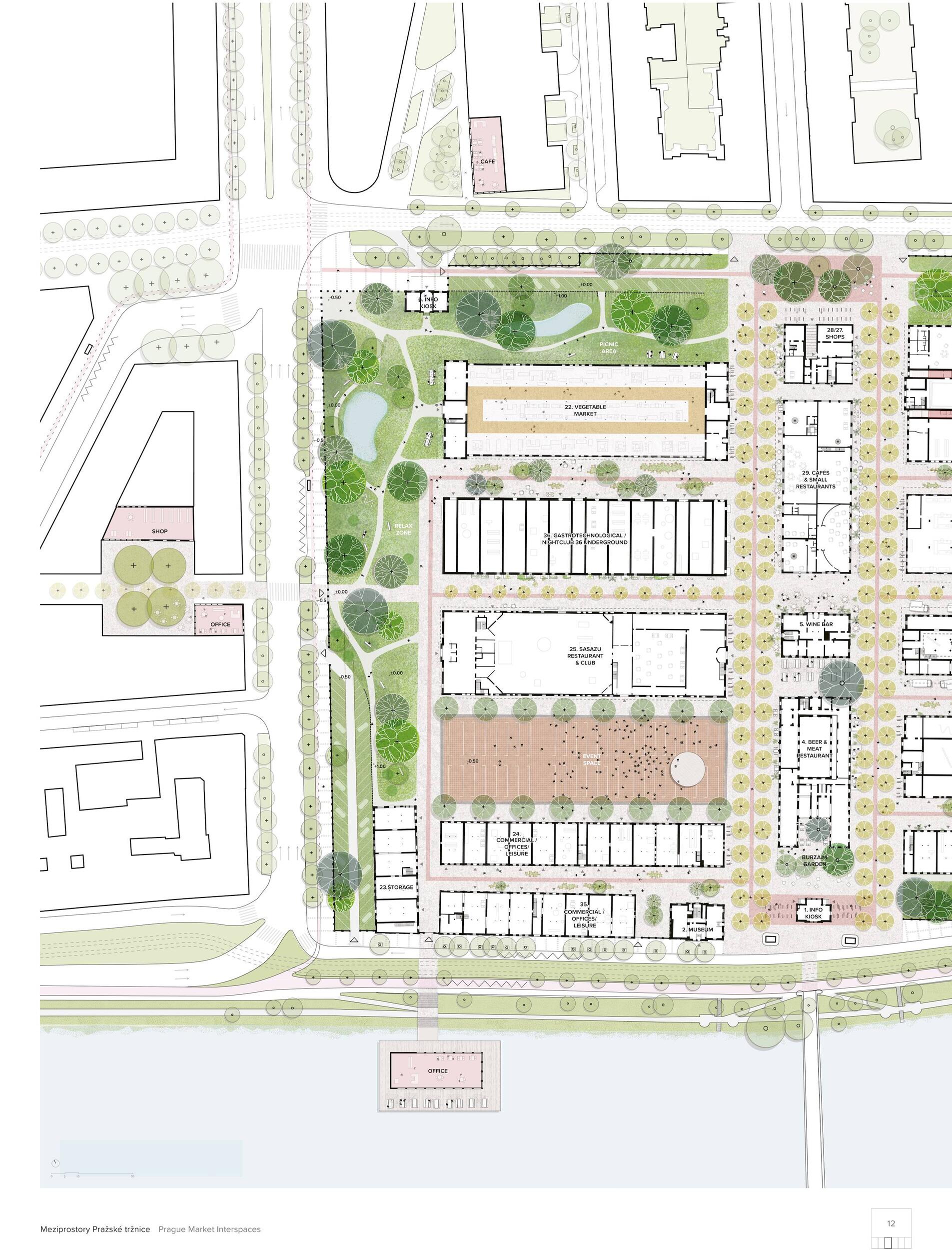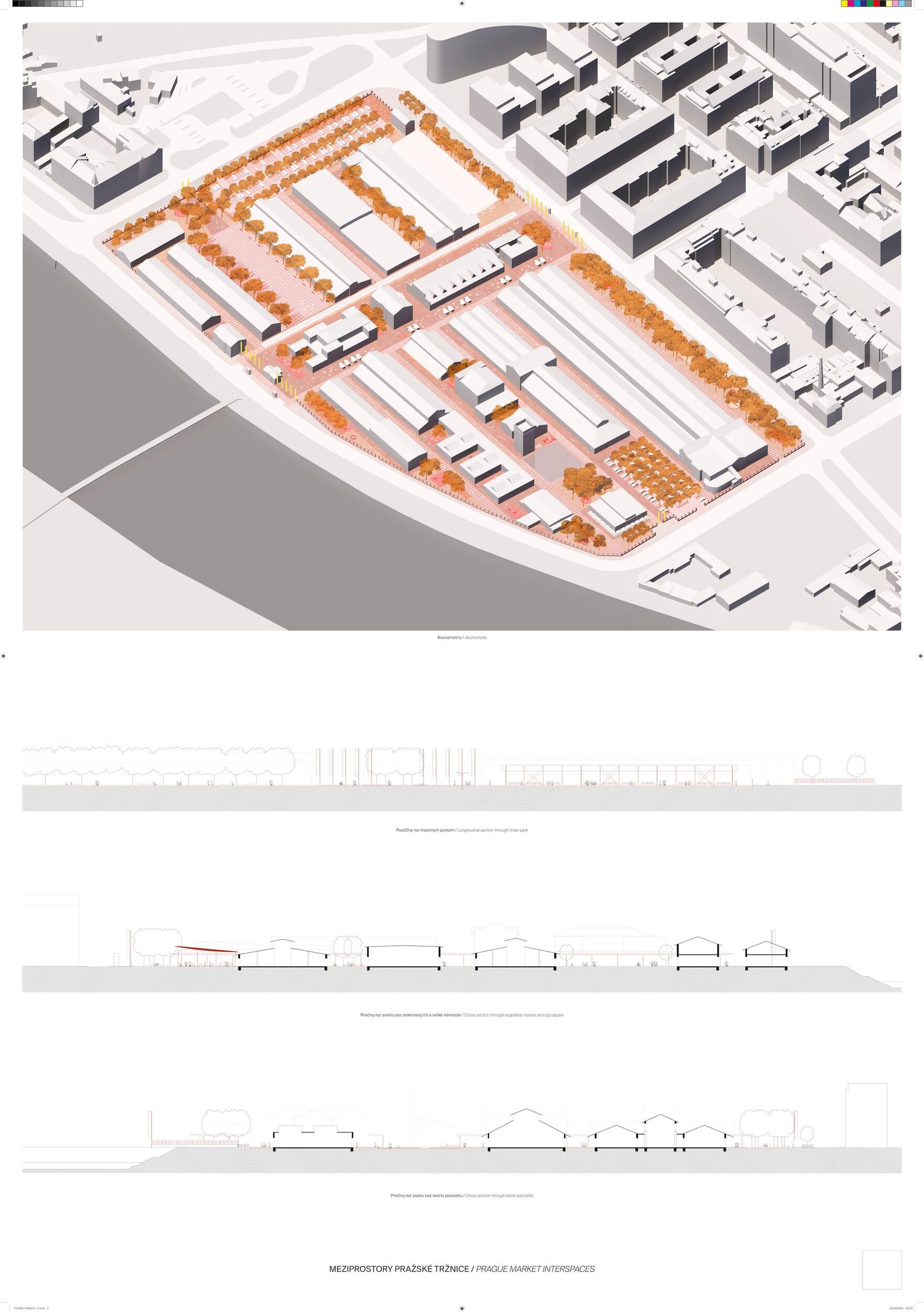 Holešovická tržnice, unikátní historický areál, který si přes úpadek v posledních desetiletí udržel své genius loci a nyní stojí na prahu nové příležitosti. Citlivou transformací veřejného prostoru s kvalitním programem může nalákat nové návštěvníky a vytvořit tak lokální i celoměstský cíl obyvatel s odkazem na historii i budoucnost Prahy. Současná tržnice trpí dlouhodobou podinvestovaností do infrastruktury, architektury i veřejného prostoru. Rozbité povrchy, nedostatek mobiliáře, absence jakékoliv zeleně a nepřehledné dopravní řešení dělá z meziprostor nepříjemné místo, ve kterém lidé nechtějí trávit volný čas. I přesto si však život v tržnici našel své příležitosti - guerillové zabydlování prostor food trucky, novými stánky i městským mobiliářem postupně zvyšují návštěvnost a lidé zde začínají trávit více času. Nové provozy jako Jatka78, cowork v H40 nebo výstavy v Trafo Gallery, vytváří ve svém okolí zajímavý program pro všechny věkové skupiny obyvatel po celý den. Inspirováni architekturou tržnice, akcentujeme kruhové výseče v kontrastu s ortogonálním systémem. Kruh a mřížka jsou tak hlavním jazykem nového tvarosloví navržených elementů. Vytváříme přirozené propojení mezi historií a budoucím rozvojem. Jednotlivé části návrhu vycházejí ze systémových principů, které lze snadno rozvíjet při aplikaci, ať už se jedná o kladení dlažby, mobiliář nebo nové oplocení. S geometrií pracujeme jako s konstrukcí nebo dekorem.
