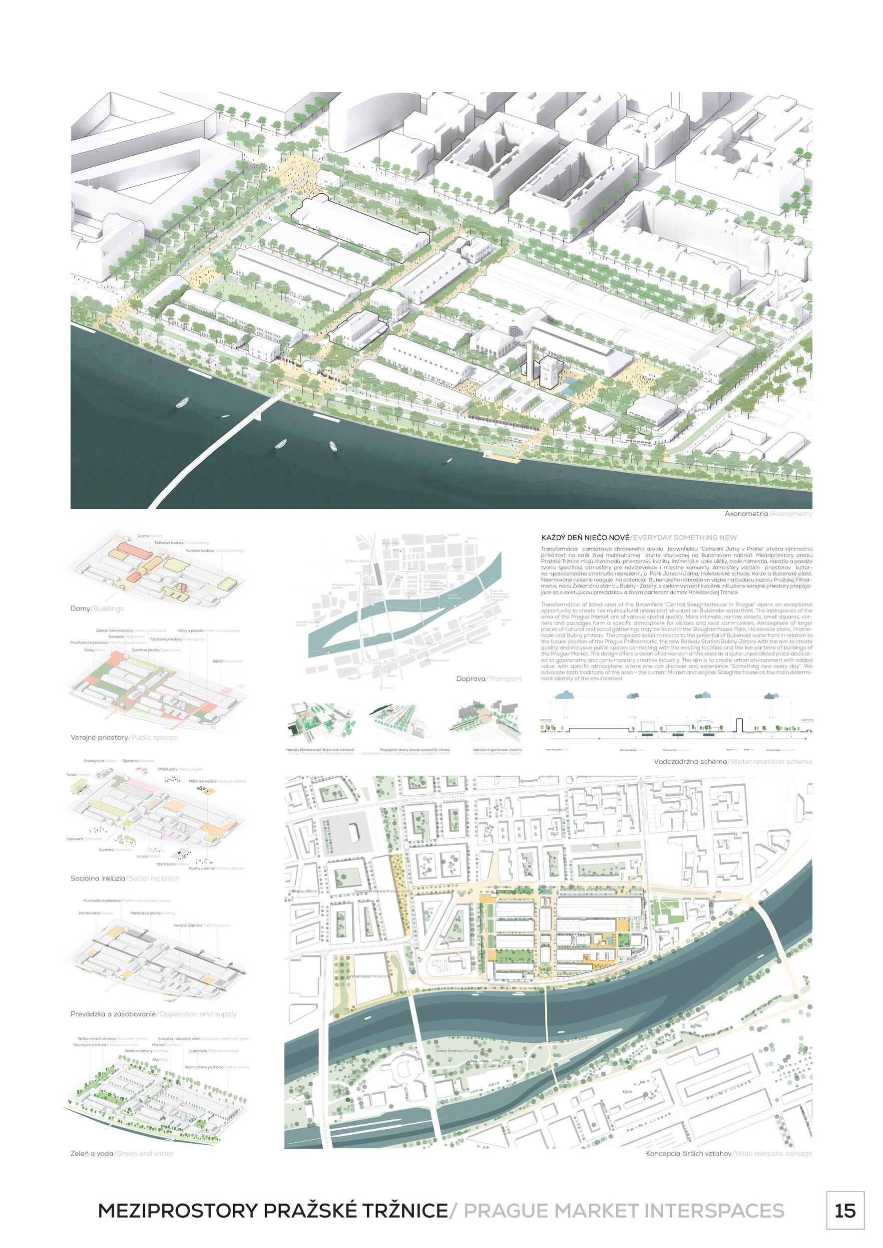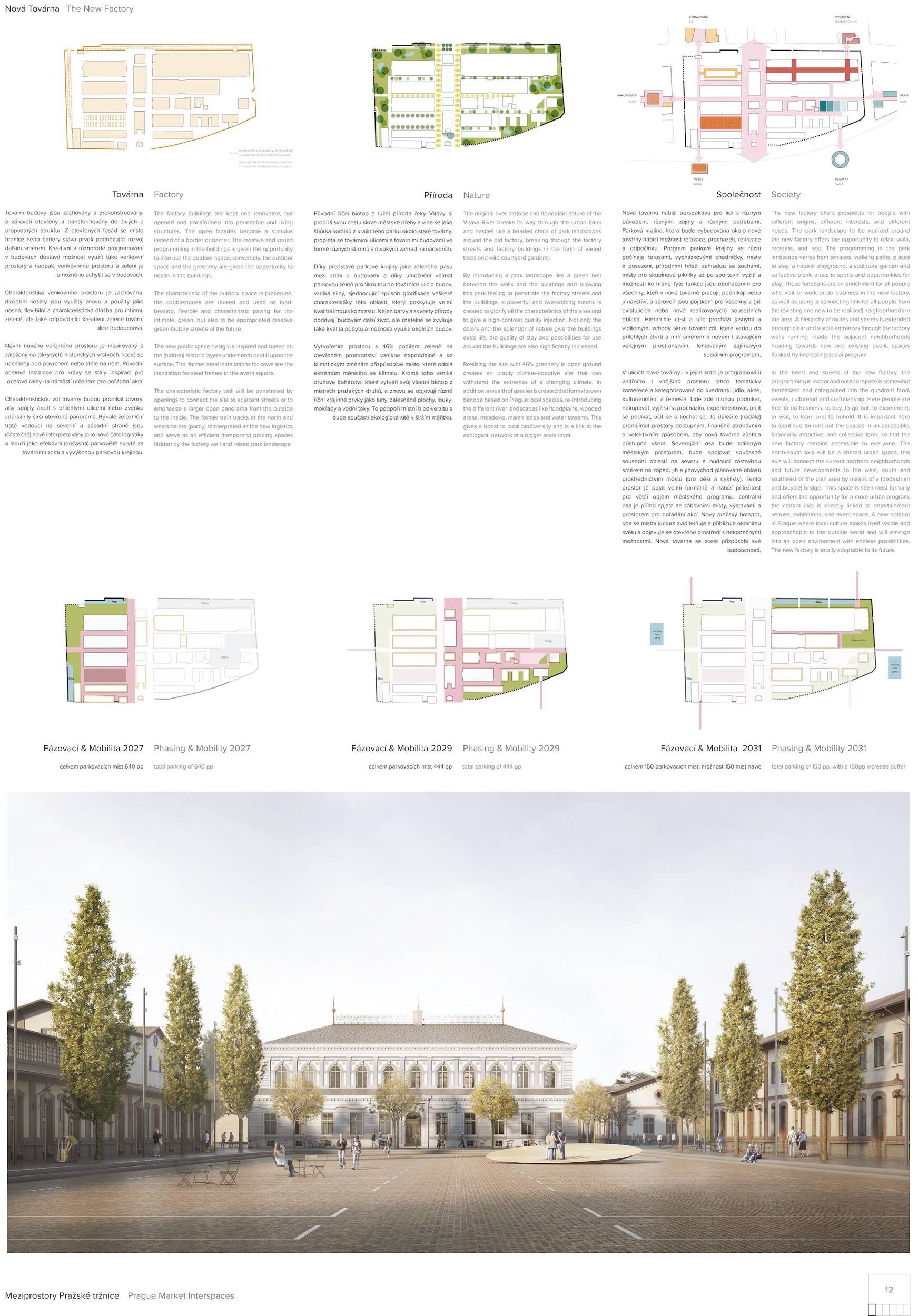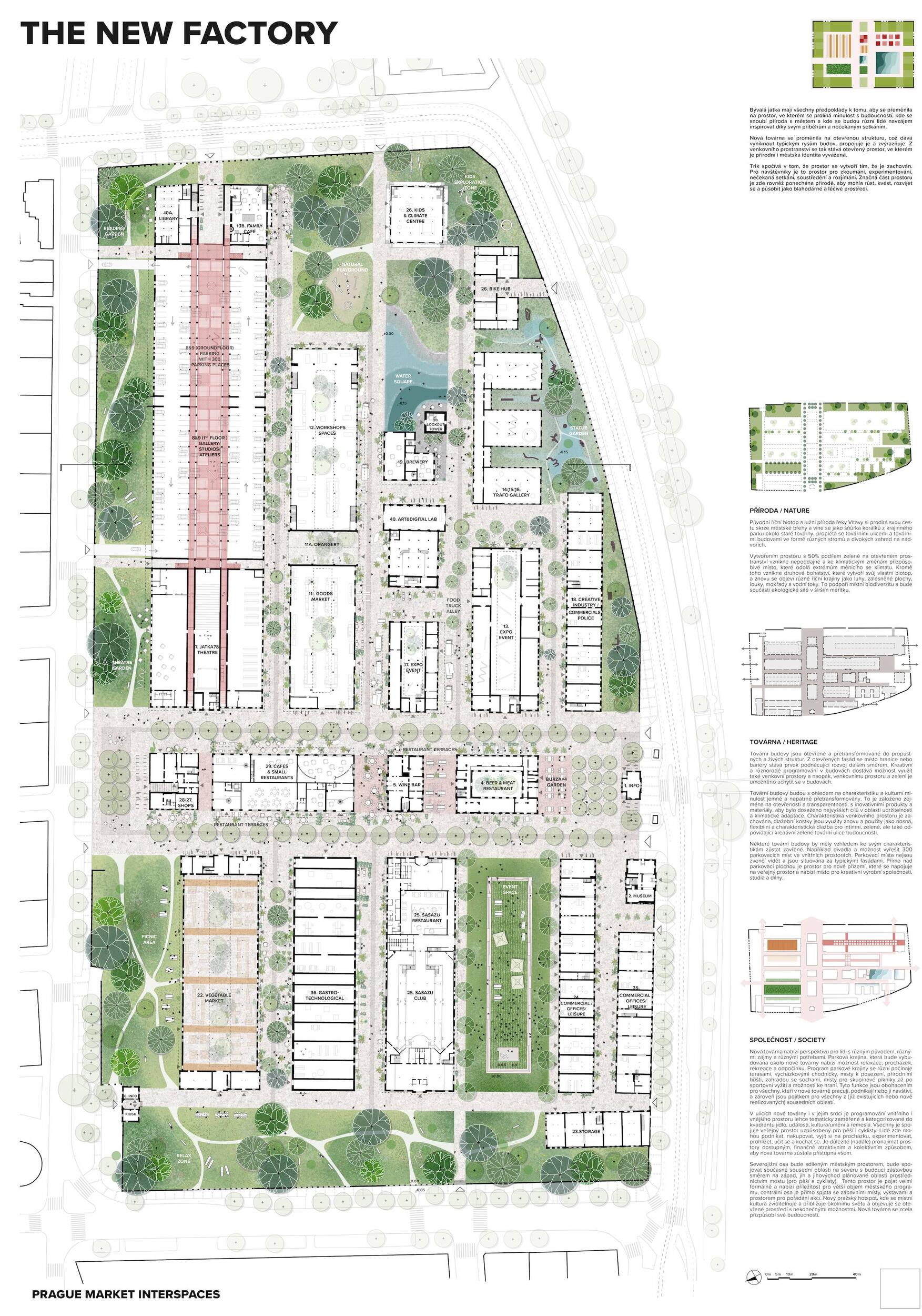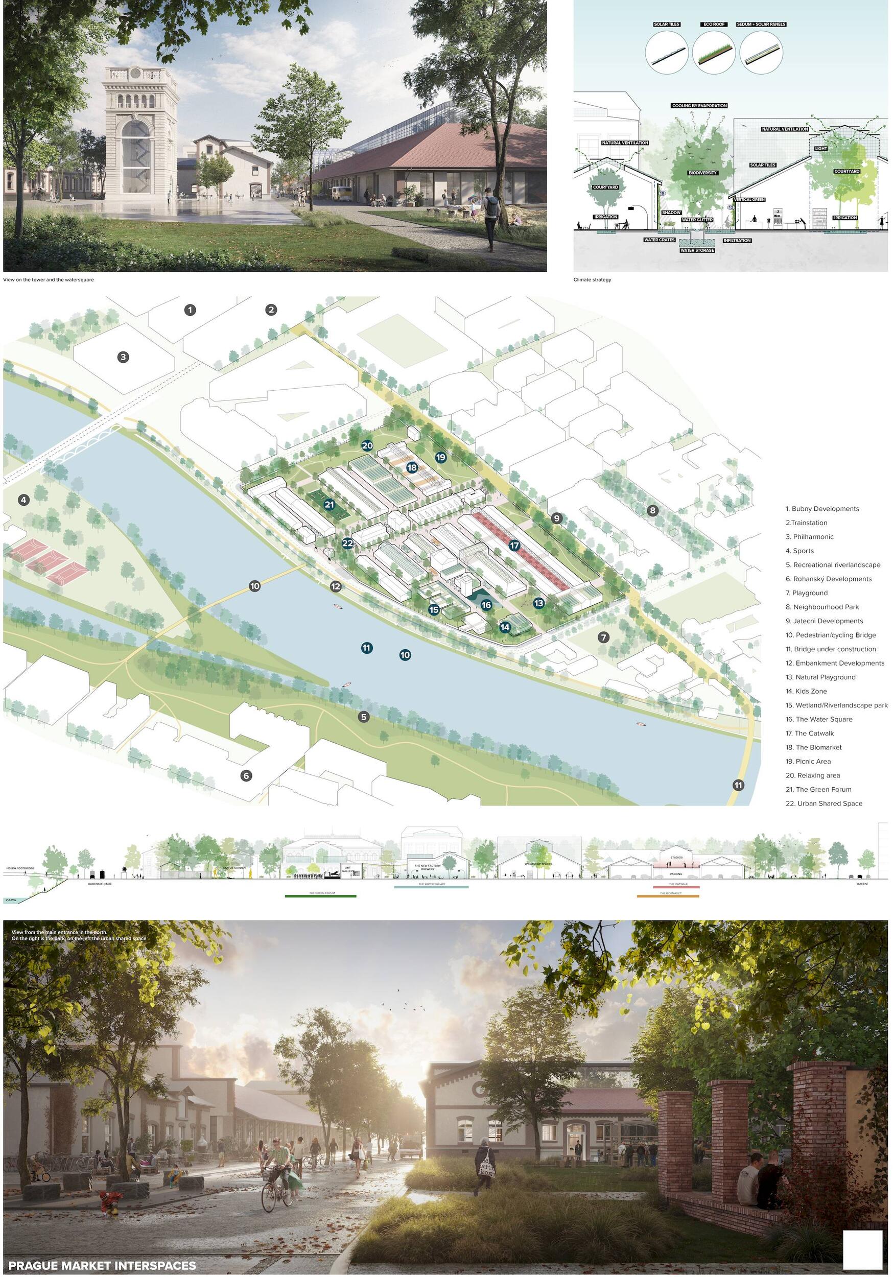 Oceňujeme jasný přístup řešení, který vynikal oproti ostatním projektům, a to nejen v řešení krajinářském a řešení veřejných prostor, ale i prací s tématy, jako je globální oteplování. Dále oceňujeme práci s širokou a zároveň podmínkám přizpůsobenou paletou rostlin, které jsou navržené v značné rozmanitosti a rozumné míře. Porota ocenila dobré zpracování celkového návrhu a vysoce si cení práce na propojení tržnice s okolím, tj. penetrace obvodové zdi a otevření areálu, které se zdá být optimální a vysoce funkční. Porota doporučuje pracovat citlivěji s vodními plochami, zejména s vodní plochou mezi objekty 24 a 25, zároveň porota podporuje vodní plochu mezi věží 39 a objektem 19. Vyhlídková věž je nadbytečná a představuje investici s nejasným významem. Výše investice 353 mil. Kč se jeví věrohodně, včetně údržby navrhovaného řešení, porota ji považuje za promyšlenou a optimální.