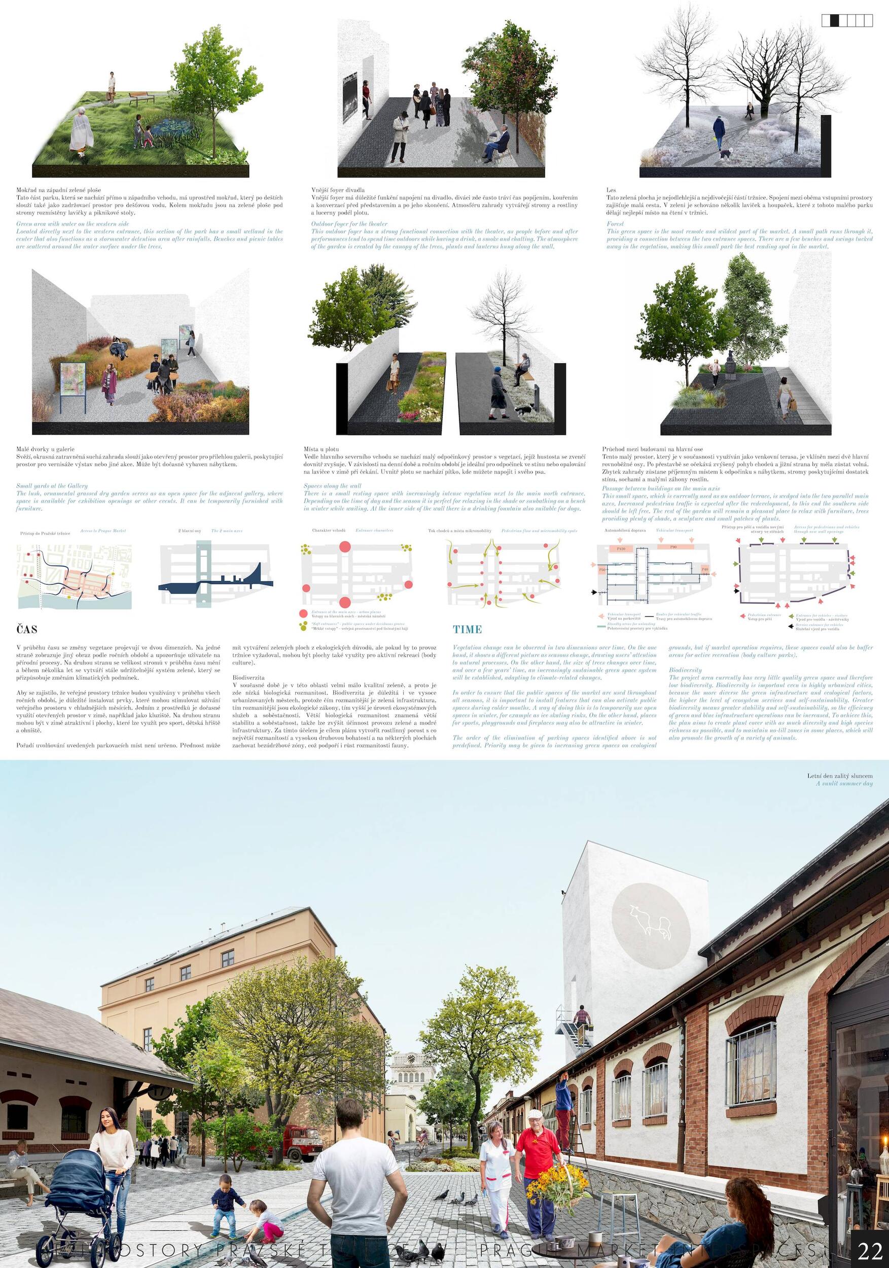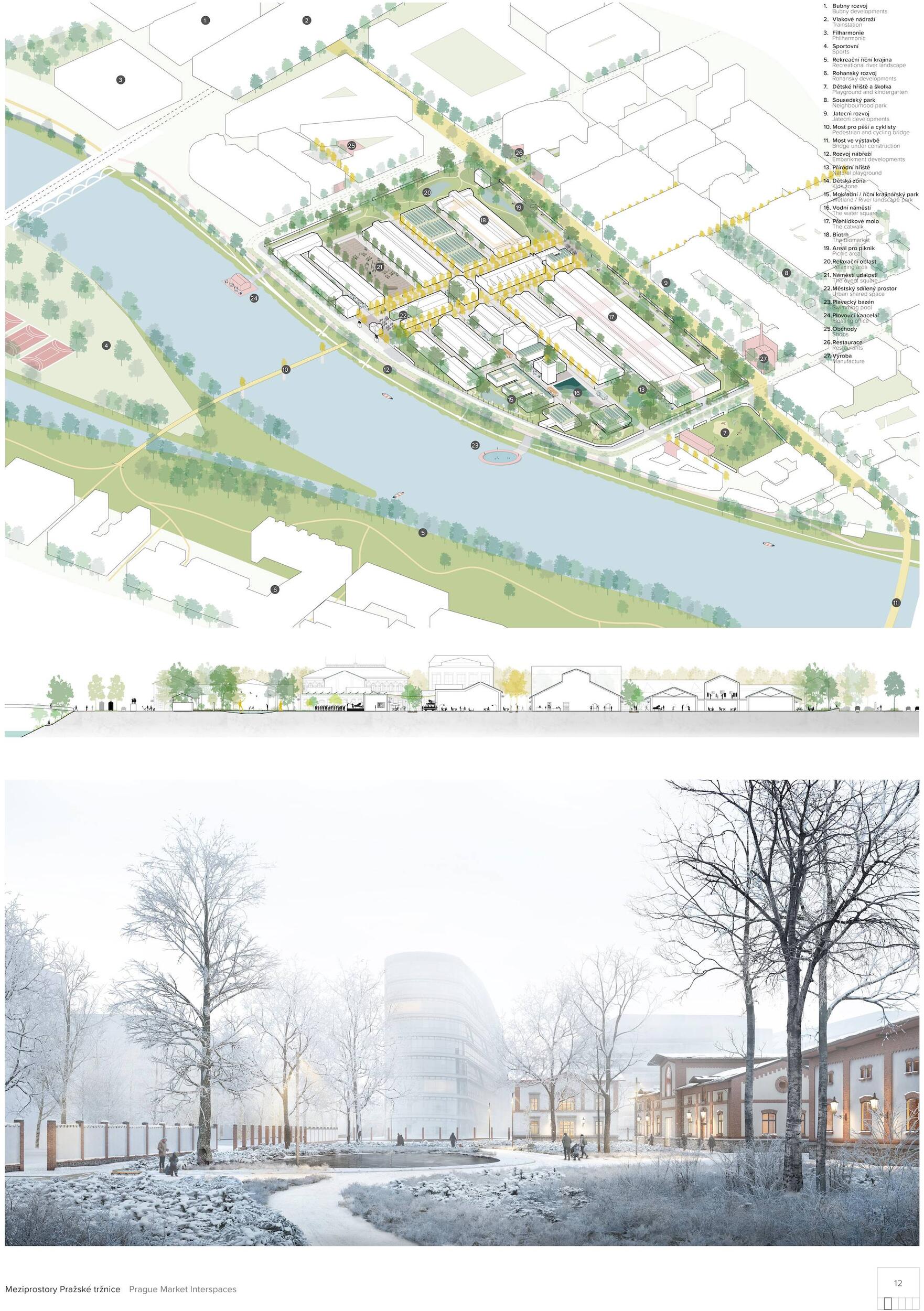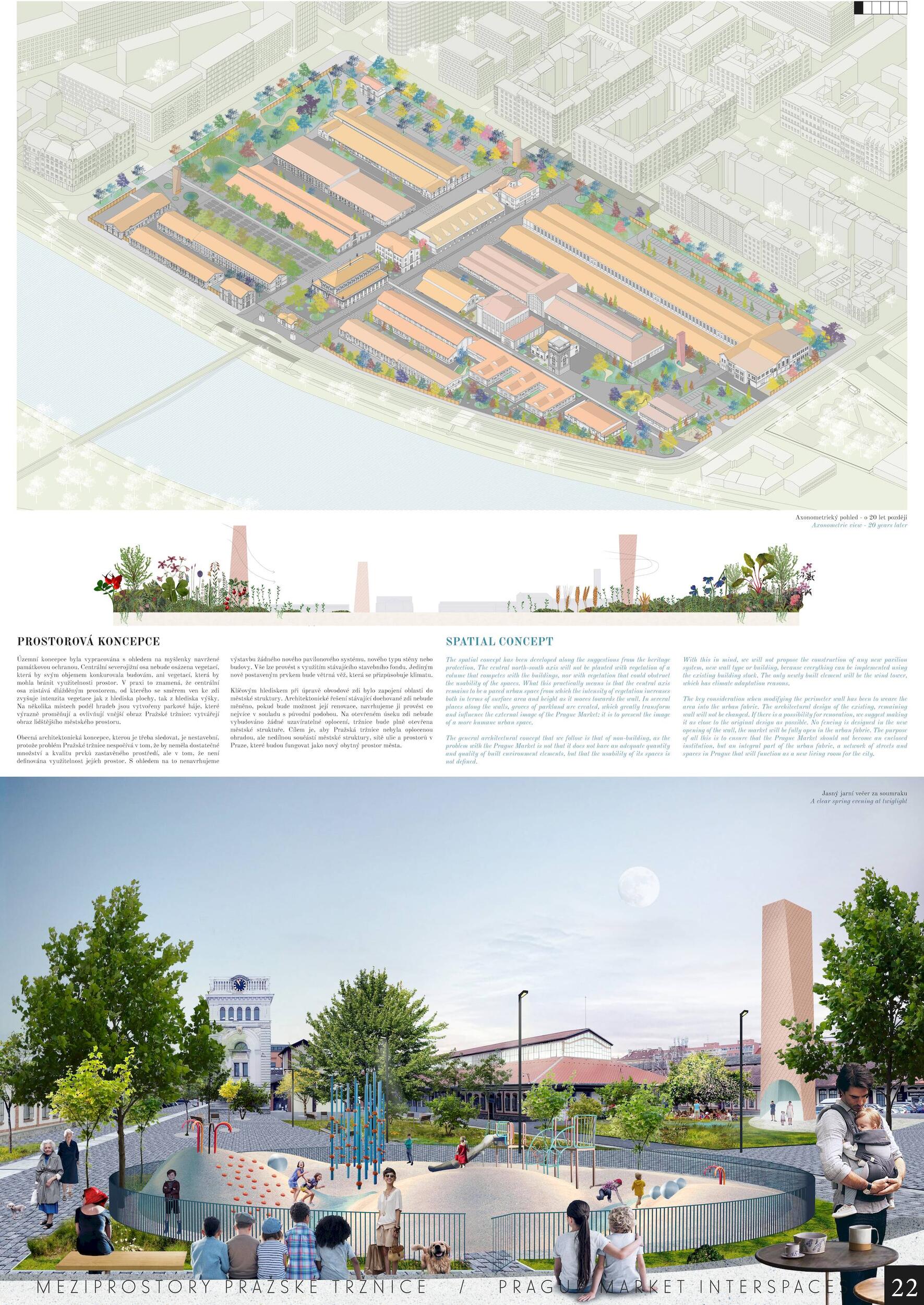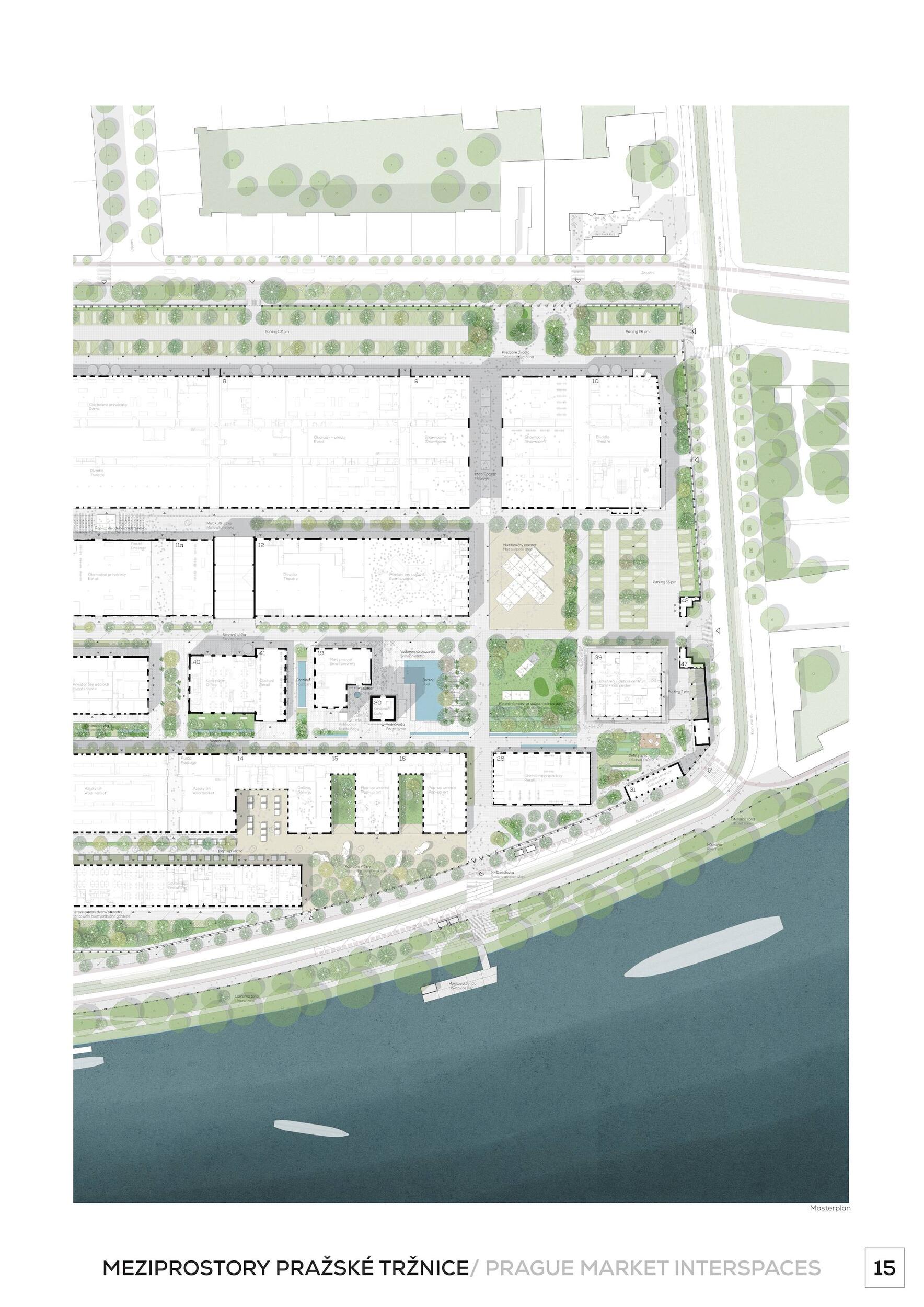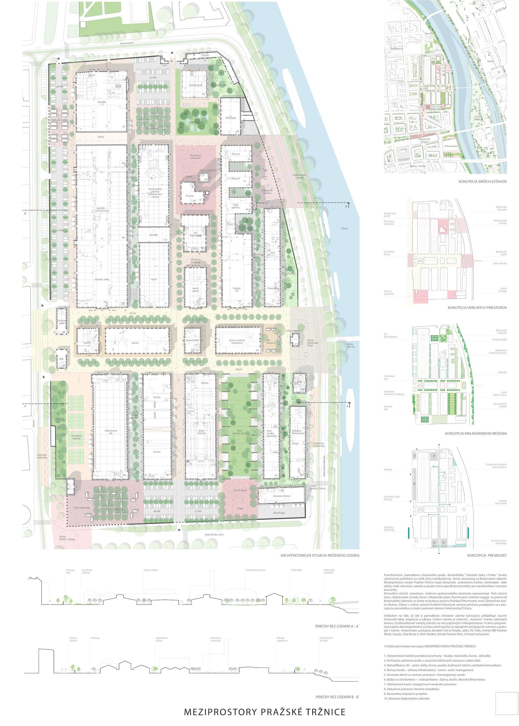 Oceňujeme jasný přístup řešení, který vynikal oproti ostatním projektům, a to nejen v řešení krajinářském a řešení veřejných prostor, ale i prací s tématy, jako je globální oteplování. Dále oceňujeme práci s širokou a zároveň podmínkám přizpůsobenou paletou rostlin, které jsou navržené v značné rozmanitosti a rozumné míře. Porota ocenila dobré zpracování celkového návrhu a vysoce si cení práce na propojení tržnice s okolím, tj. penetrace obvodové zdi a otevření areálu, které se zdá být optimální a vysoce funkční. Porota doporučuje pracovat citlivěji s vodními plochami, zejména s vodní plochou mezi objekty 24 a 25, zároveň porota podporuje vodní plochu mezi věží 39 a objektem 19. Vyhlídková věž je nadbytečná a představuje investici s nejasným významem. Výše investice 353 mil. Kč se jeví věrohodně, včetně údržby navrhovaného řešení, porota ji považuje za promyšlenou a optimální.