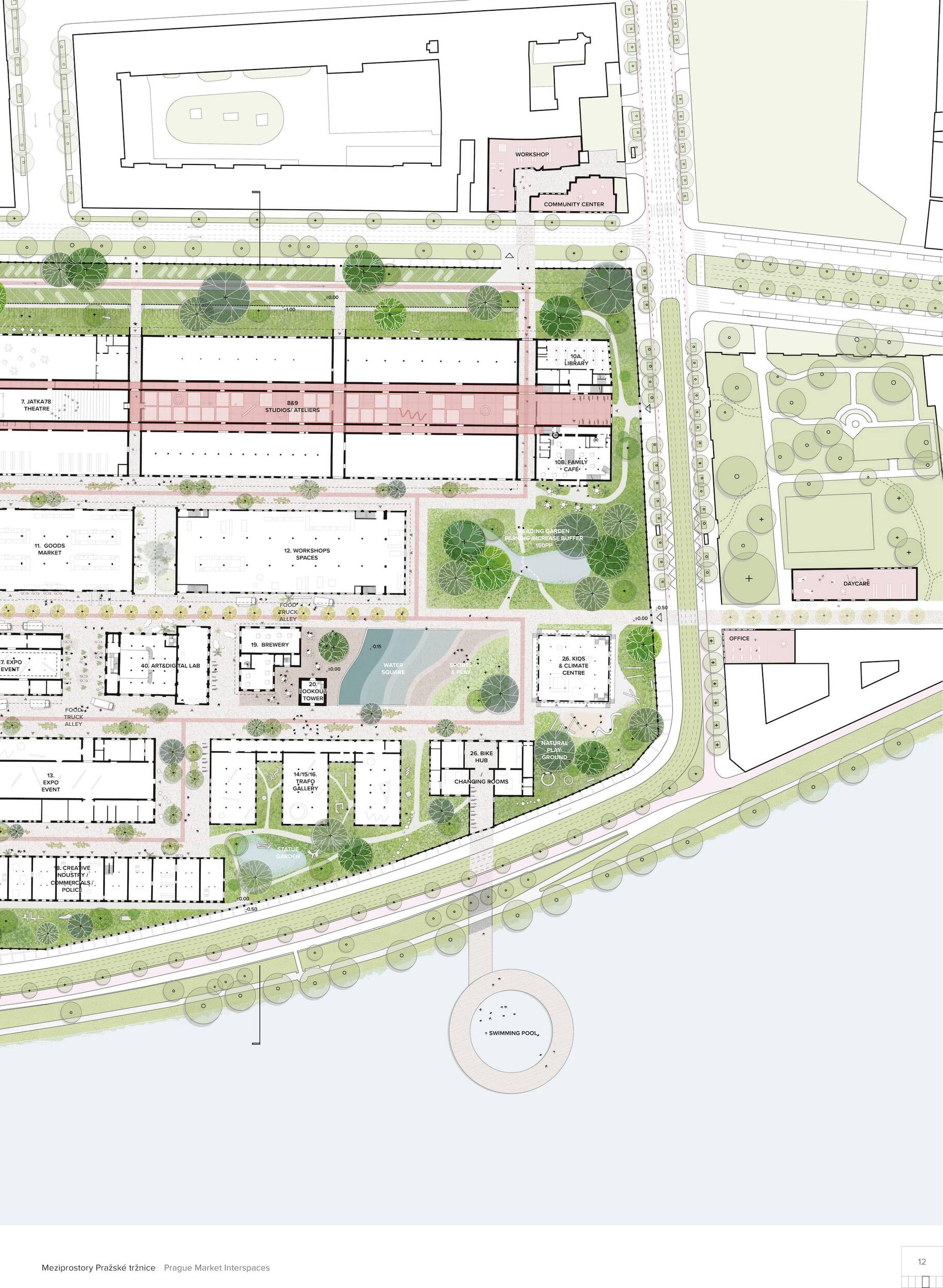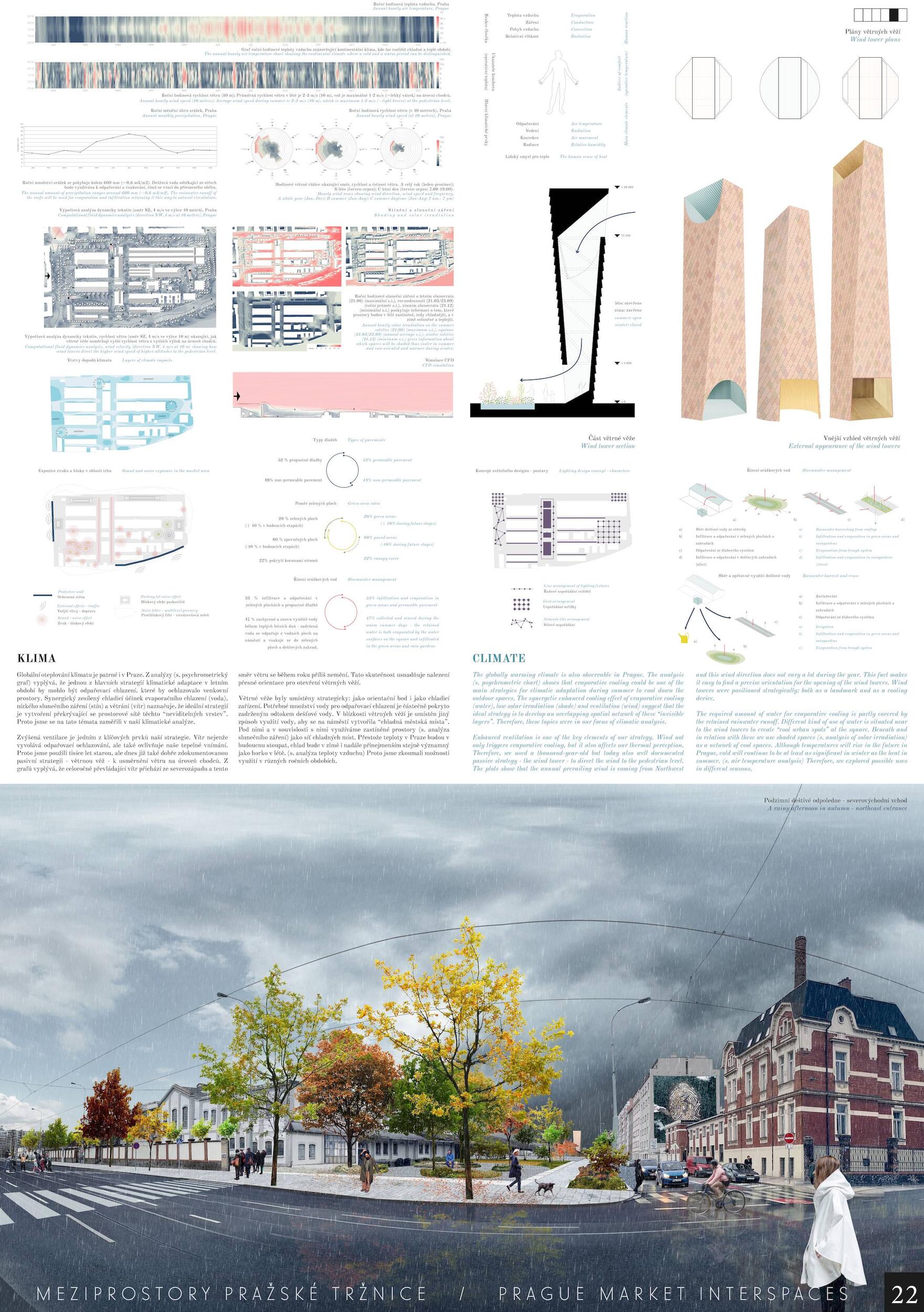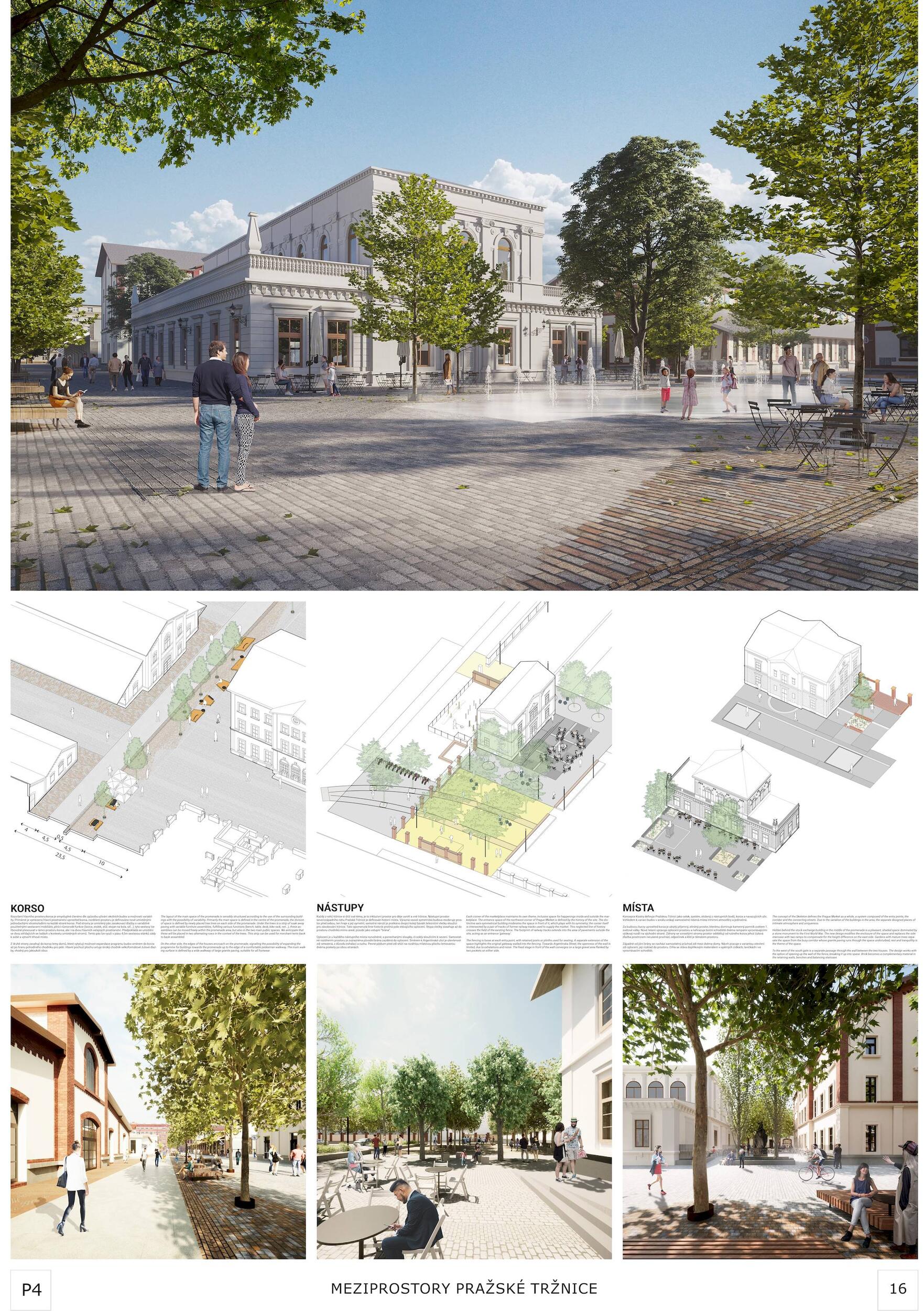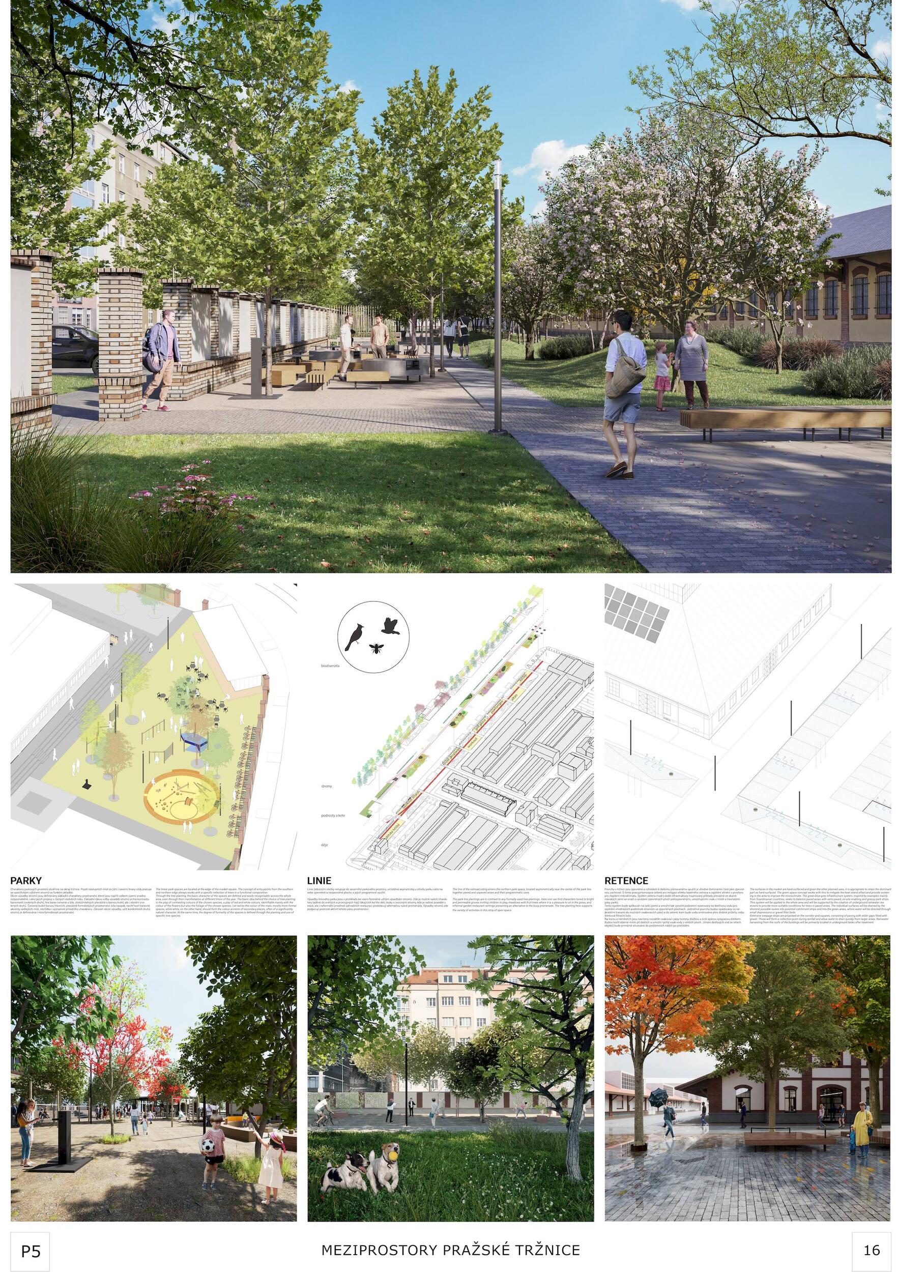 Oceňujeme jasný přístup řešení, který vynikal oproti ostatním projektům, a to nejen v řešení krajinářském a řešení veřejných prostor, ale i prací s tématy, jako je globální oteplování. Dále oceňujeme práci s širokou a zároveň podmínkám přizpůsobenou paletou rostlin, které jsou navržené v značné rozmanitosti a rozumné míře. Porota ocenila dobré zpracování celkového návrhu a vysoce si cení práce na propojení tržnice s okolím, tj. penetrace obvodové zdi a otevření areálu, které se zdá být optimální a vysoce funkční. Porota doporučuje pracovat citlivěji s vodními plochami, zejména s vodní plochou mezi objekty 24 a 25, zároveň porota podporuje vodní plochu mezi věží 39 a objektem 19. Vyhlídková věž je nadbytečná a představuje investici s nejasným významem. Výše investice 353 mil. Kč se jeví věrohodně, včetně údržby navrhovaného řešení, porota ji považuje za promyšlenou a optimální.