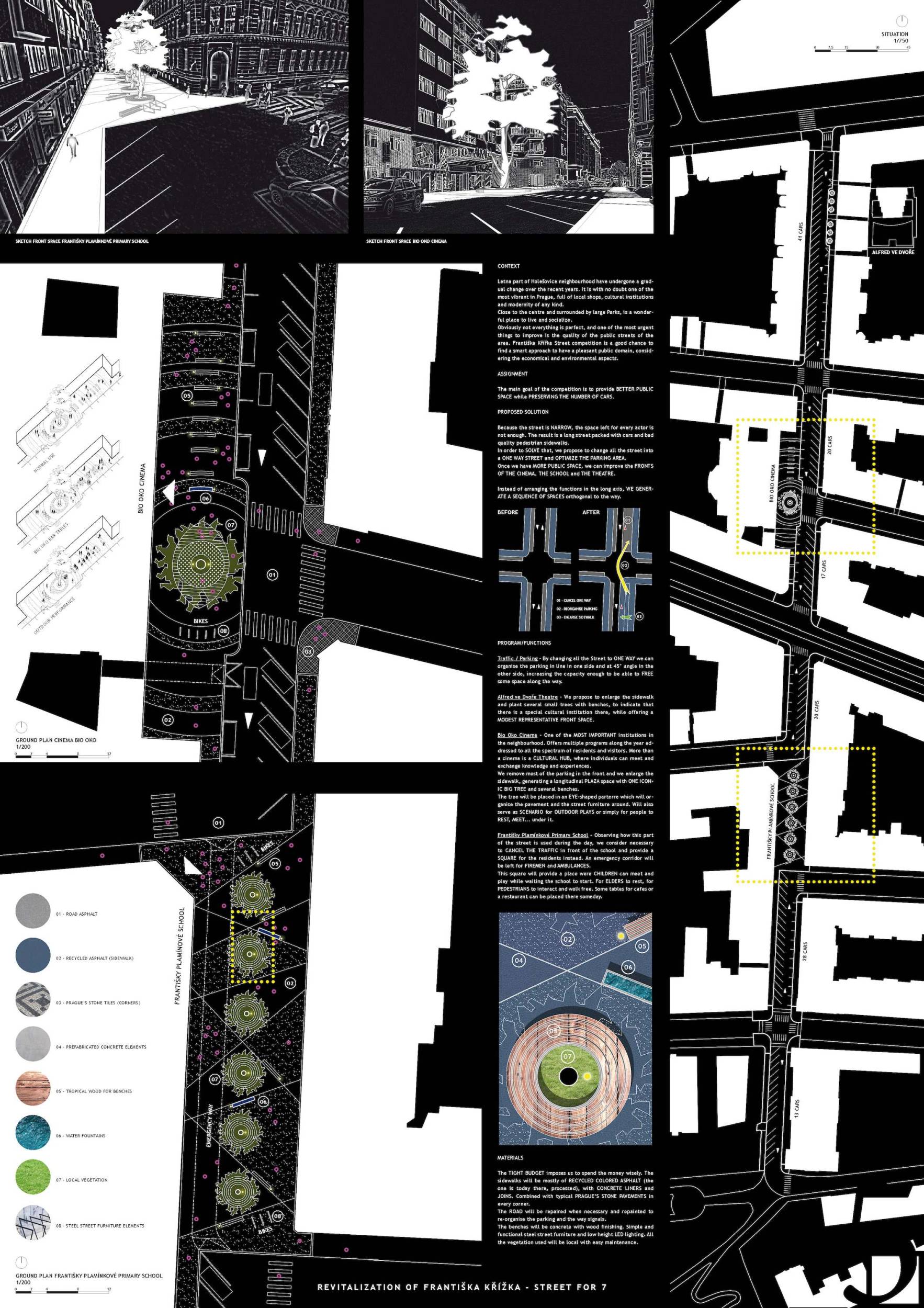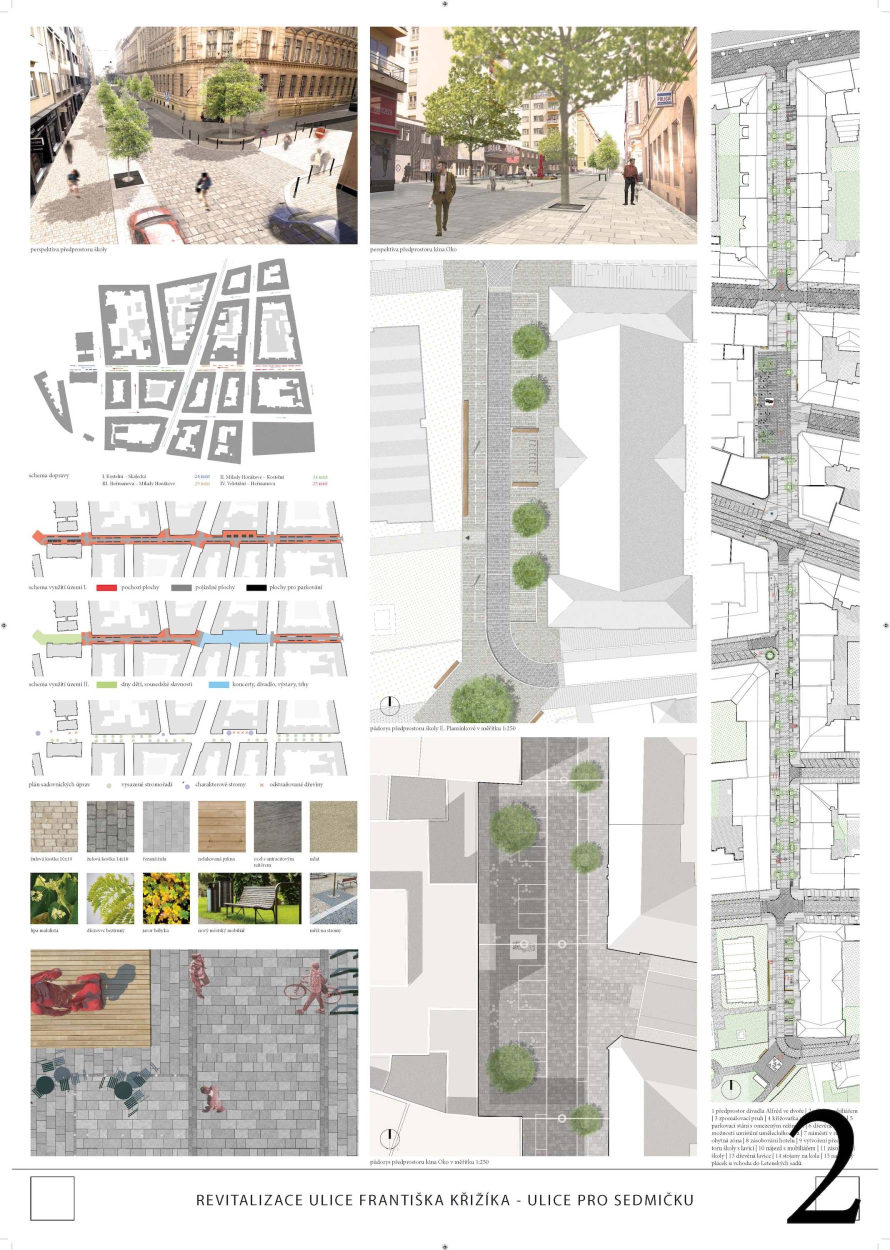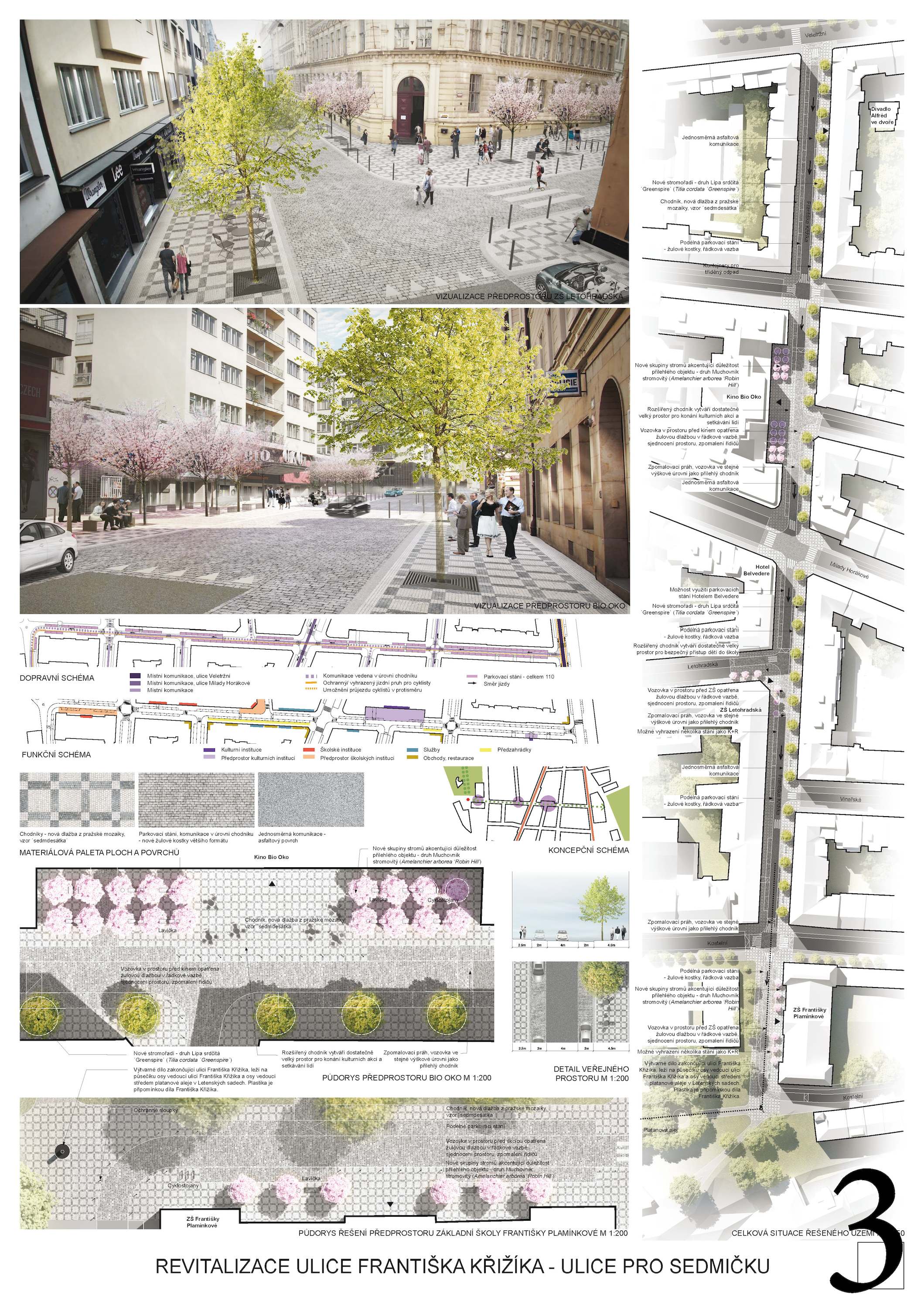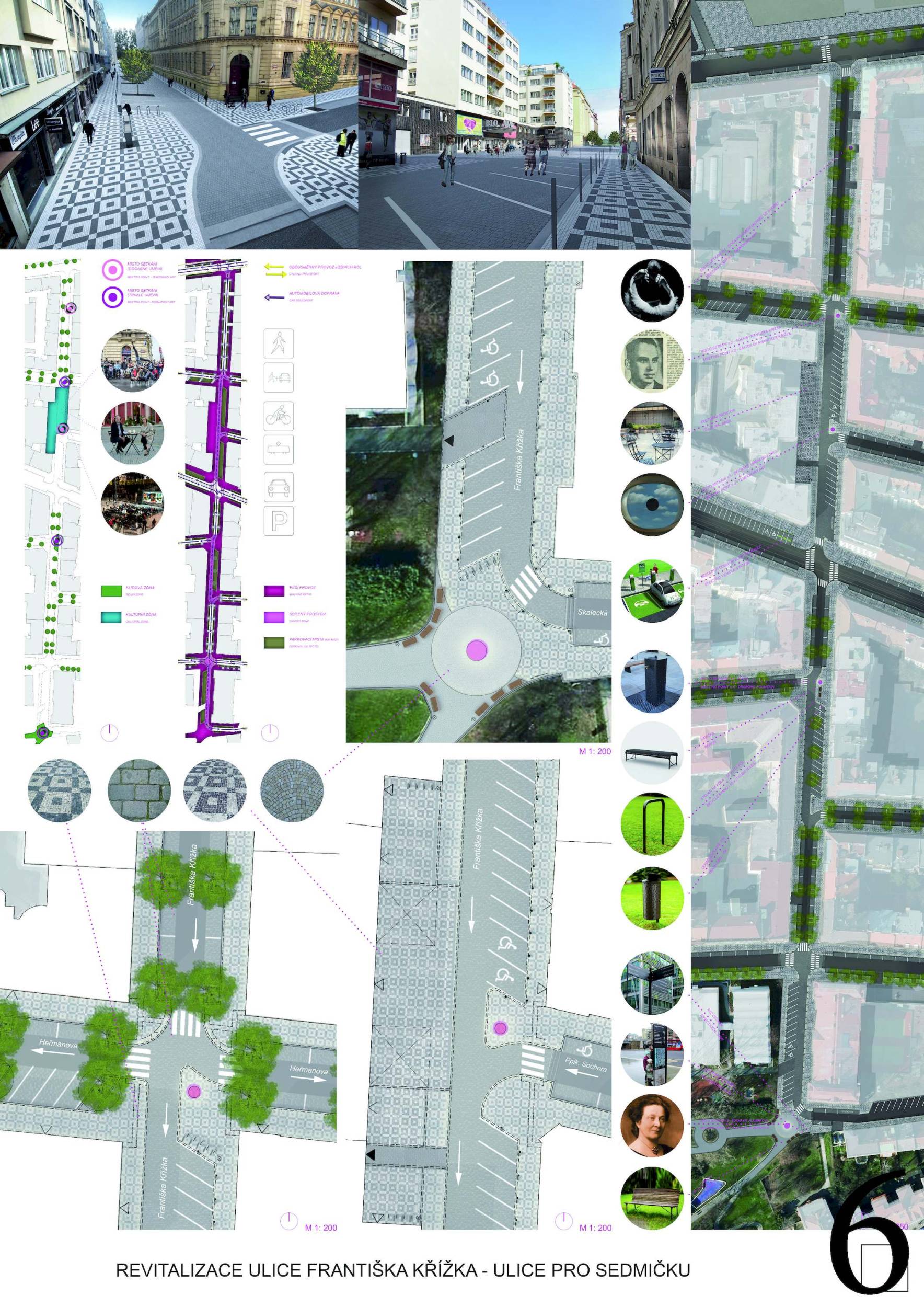 Naším záměrem revitalizace ulice Františka Křížka je vytvoření příjemného funkčního veřejného prostoru, který bude dobře sloužit jak rezidentům, tak ostatním návštěvníkům. Celou ulici vybavujeme pravidelně vysázenými stromy, které poskytnou stín v horkých letních dnech, zútulní řešený prostor a umožní umístění předzahrádek přilehlých restaurací a kaváren. Předprostor tří nejdůležitějších institucí (Bio Oko, ZŠ Františky Plamínkové a ZŠ Letohradská) rozšiřujeme a akcentujeme skupinami stromů odlišného druhu. Tyto předprostory budou vybaveny lavičkami, cyklostojany a odpadkovými koši. Průběh celé ulice je navržen jako jednosměrný. Díky tomu dosáhneme jednotného uličního profilu po celé délce řešené ulice. Po obou stranách jednosměrné komunikace umisťujeme podélná parkovací stání.
