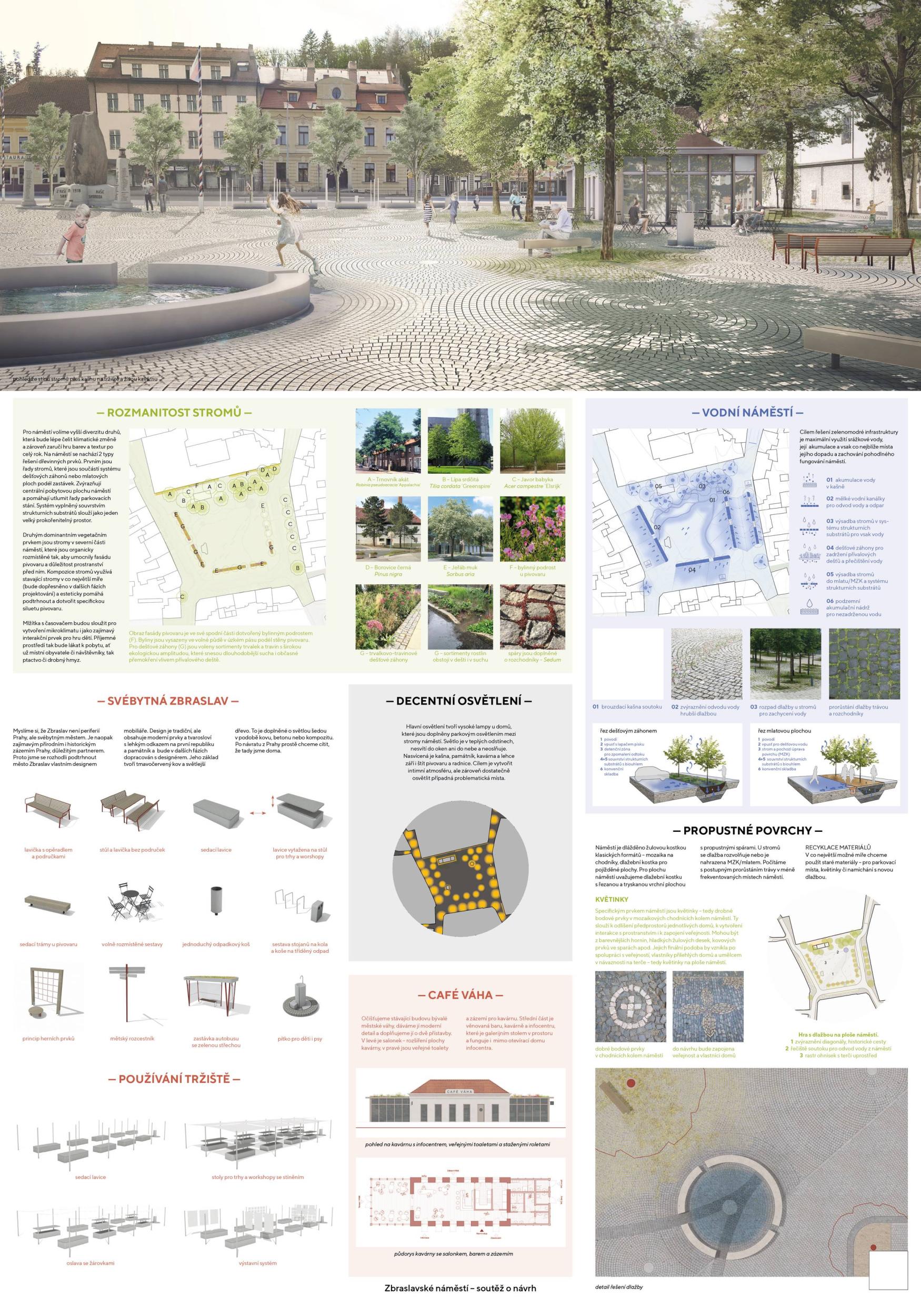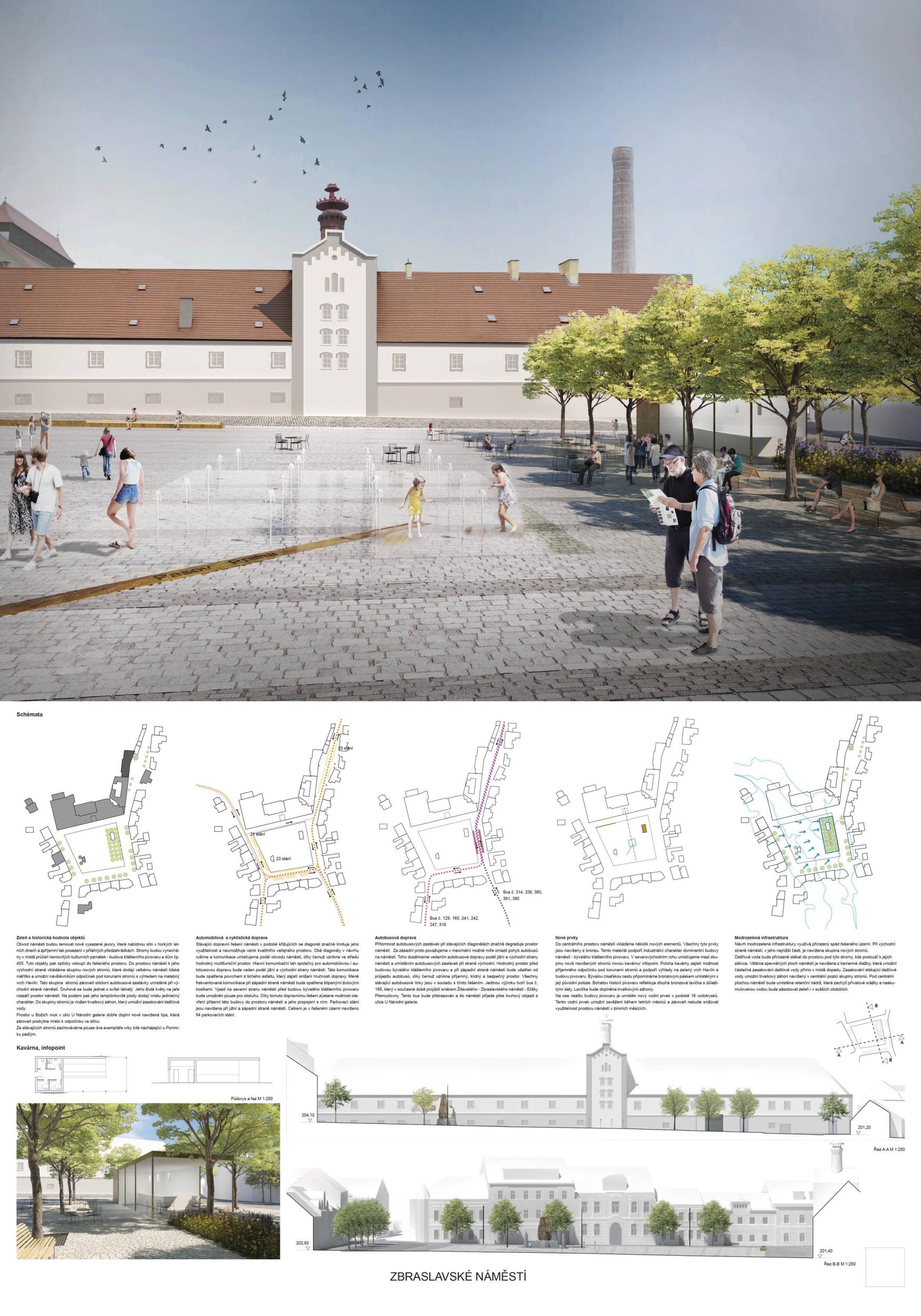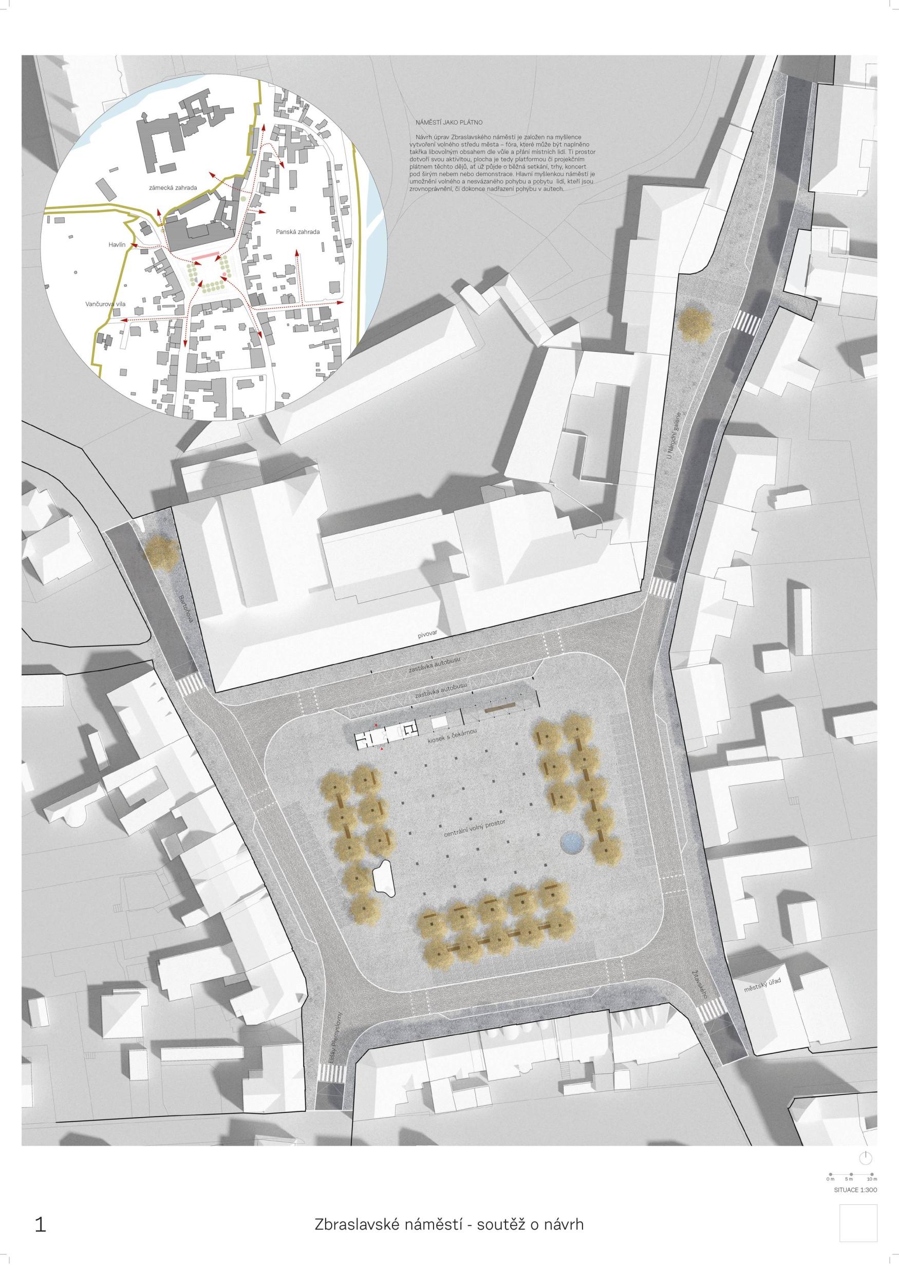 Porota v návrhu oceňuje celkovou vyváženost a čitelnou organizaci prostoru, která umožňuje bohatou nabídku využití. Autoři potvrzují, co je na náměstí neměnné, odklání průjezdnou dopravu od východní strany, propojují ji s hlavní plochou a dávají tak příležitost jejímu rozvoji. Zároveň vhodně nastavují velikost náměstí, pomocí zeleně pracují s měřítkem a proporcí a dle názoru poroty dosahují harmonického dojmu: polovina náměstí pro „pobyt v přírodě“, polovina pro „pobyt ve městě“ nabízí dvojí obytnost. Otevřenější a uzavřenější prostory se vzájemně doplňují a koexistují v dobrém vztahu. Z krajinářského hlediska má návrh jasnou, silnou strukturu, která podporuje charakter náměstí pro jakékoli využití, ať už v běžném denním provozu nebo pro akce s programem. Porota také chválí pietní integraci pomníku do zeleně bez zbytečného patosu. Návrh je ve svém schématu dostatečně flexibilní a jeho další úpravy v rámci dopracování studie nepoškodí autorský koncept.